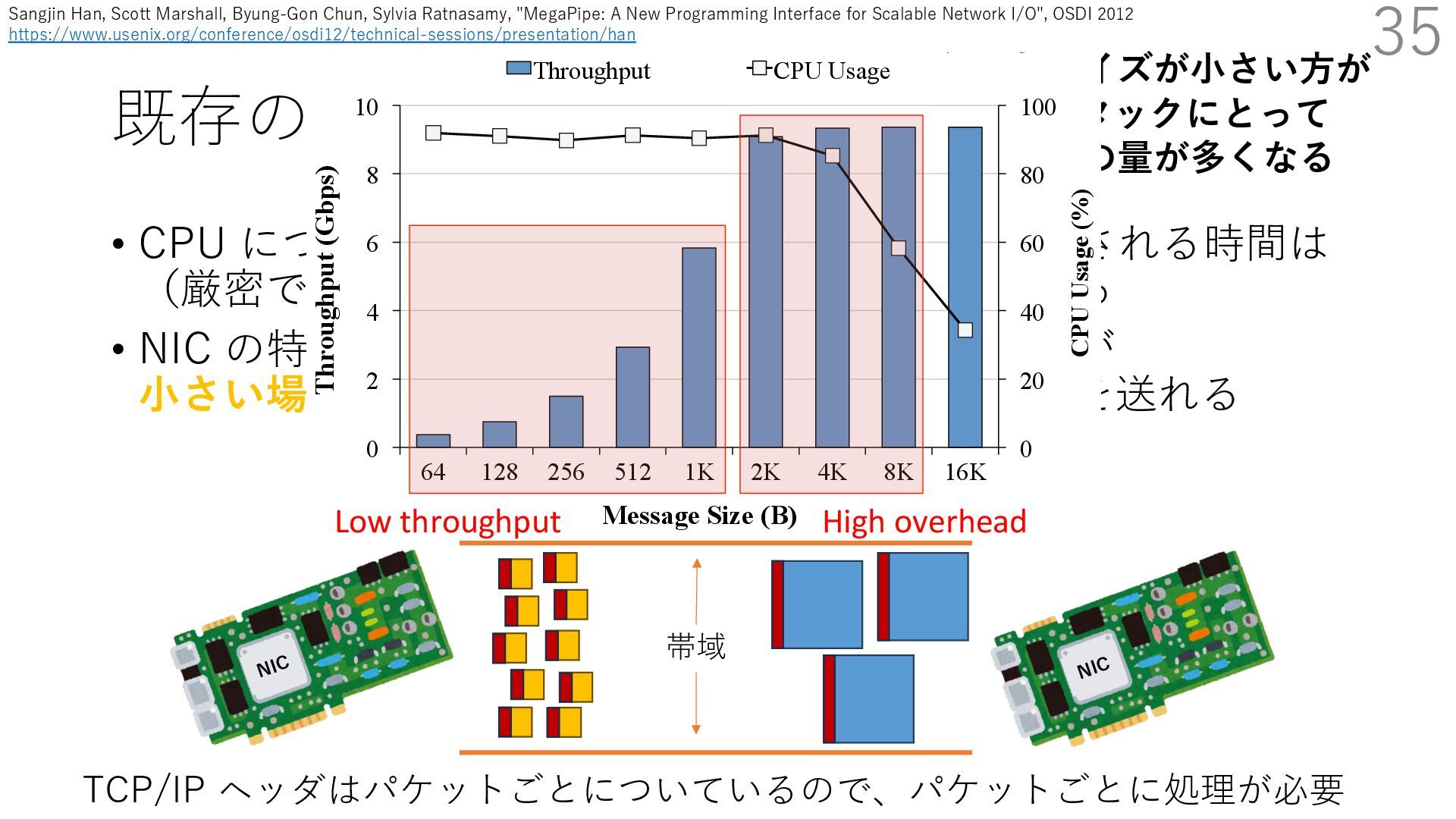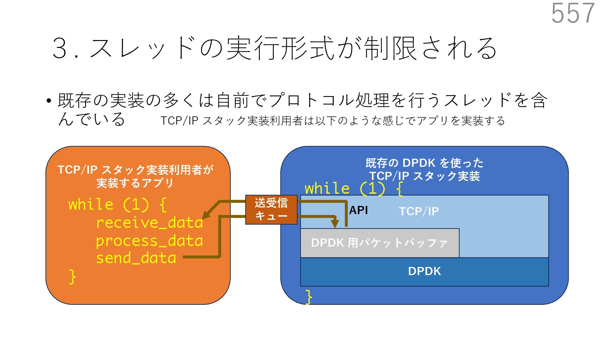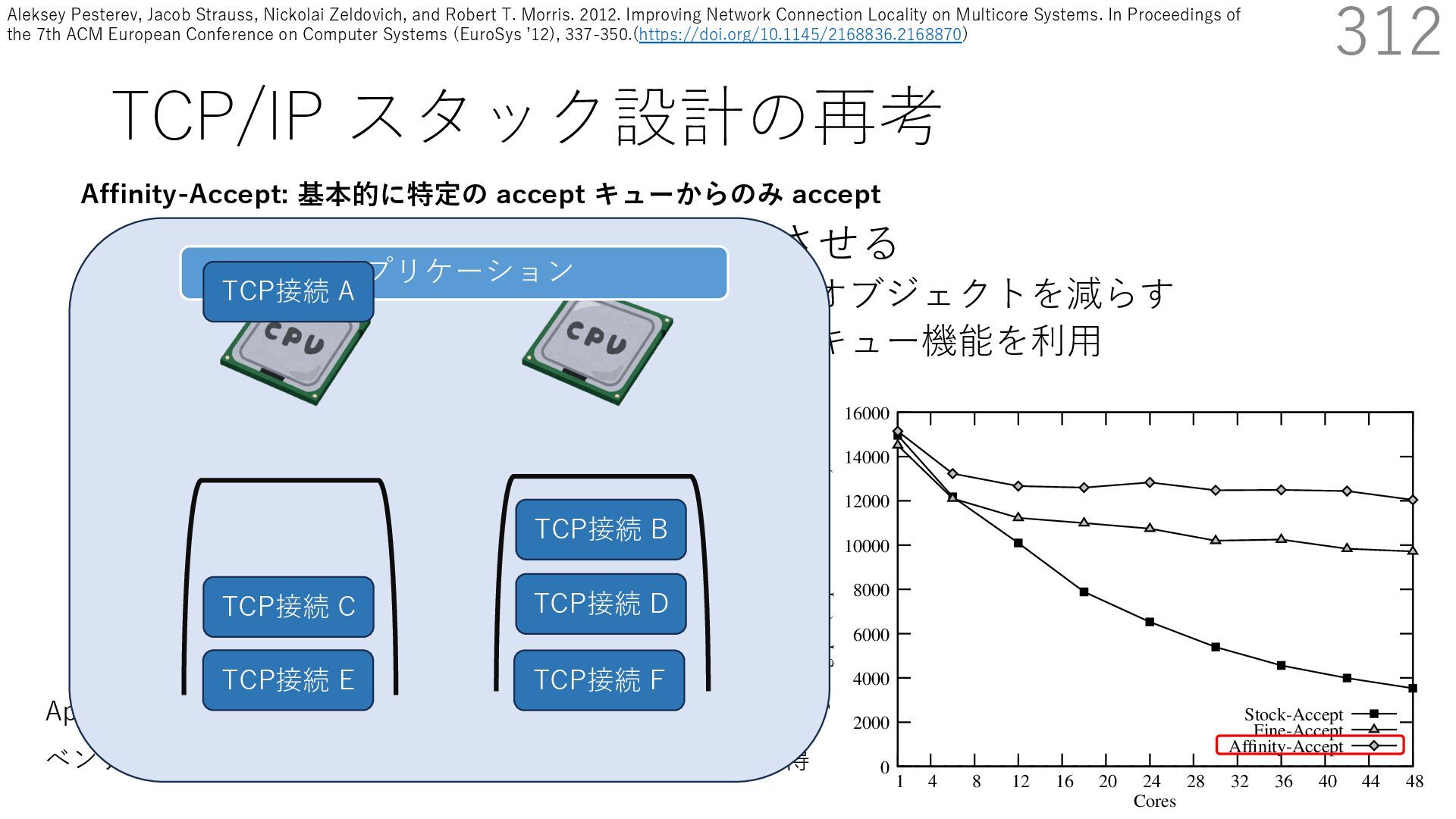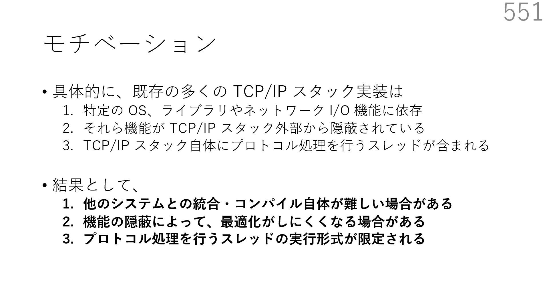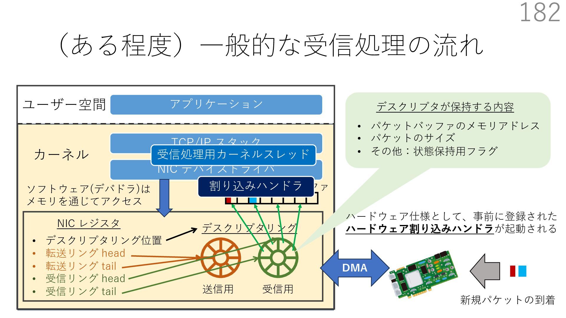 (SIGCOMM 2014) • mTCP (NSDI 2014) • Arrakis (OSDI 2014) • IX (OSDI 2014) • StackMap (USENIX ATC 2016) • Atlas (SIGCOMM 2017) • ZygOS (SOSP 2017) • Shenango (NSDI 2019) • Shinjuku (NSDI 2019) • TAS (EuroSys 2019) • Caladan (OSDI 2020) • Demikernel (SOSP 2021) 427 into a single library for both devices (e.g., RDMAxSPDK). We implemented the bulk of our library OS code in Rust. We initially prototyped several libOSes in C++; however, we found that Rust performs competitively with C++ and achieves ns-scale latencies while offering additional benefits. First, Rust enforces memory safety through language fea- tures and its compiler. Though our libOSes use unsafe code to bind to C/C++ kernel-bypass libraries and applications, User-space Software Kernel-space Software I/O Hardware I/O Device ??? libFuture ??? DPDK User I/O Buf. Mgmt libRDMA RDMA User I/O Buf. Mgmt Net. Trans. OS Kernel Control Path Demikernel Datapath Architecture App libPOSIX libDPDK SPDK User I/O Buf. Mgmt libSPDK Future Demikernel PDPIX Datapath API Figure 3. Demikernel kernel-bypass architecture. Demikernel ac- commodates heterogenous kernel-bypass devices, including poten- tial future hardware, with a flexible library OS-based datapath ar- chitecture.We include a libOS that goes through the OS kernel for 提案:異なるタイプのデバイスへ 共通のインターフェースからアクセス可能にする Irene Zhang, Amanda Raybuck, Pratyush Patel, Kirk Olynyk, Jacob Nelson, Omar S. Navarro Leija, Ashlie Martinez, Jing Liu, Anna Kornfeld Simpson, Sujay Jayakar, Pedro Henrique Penna, Max Demoulin, Piali Choudhury, and Anirudh Badam. 2021. The Demikernel Datapath OS Architecture for Microsecond-Scale Datacenter Systems. In Proceedings of the ACM Sigops 28th Symposium on Operating Systems Principles (SOSP ʼ21), 195-211.(https://doi.org/10.1145/3477132.3483569)