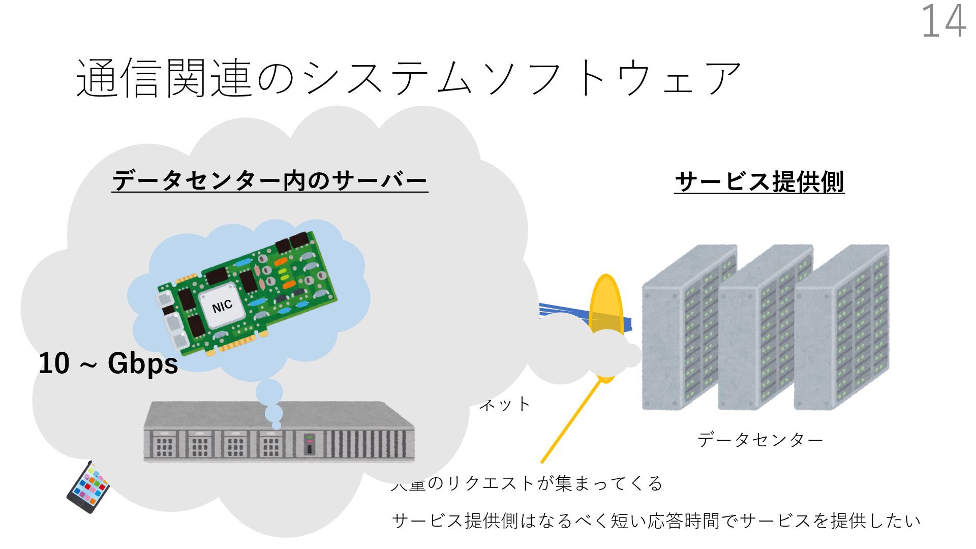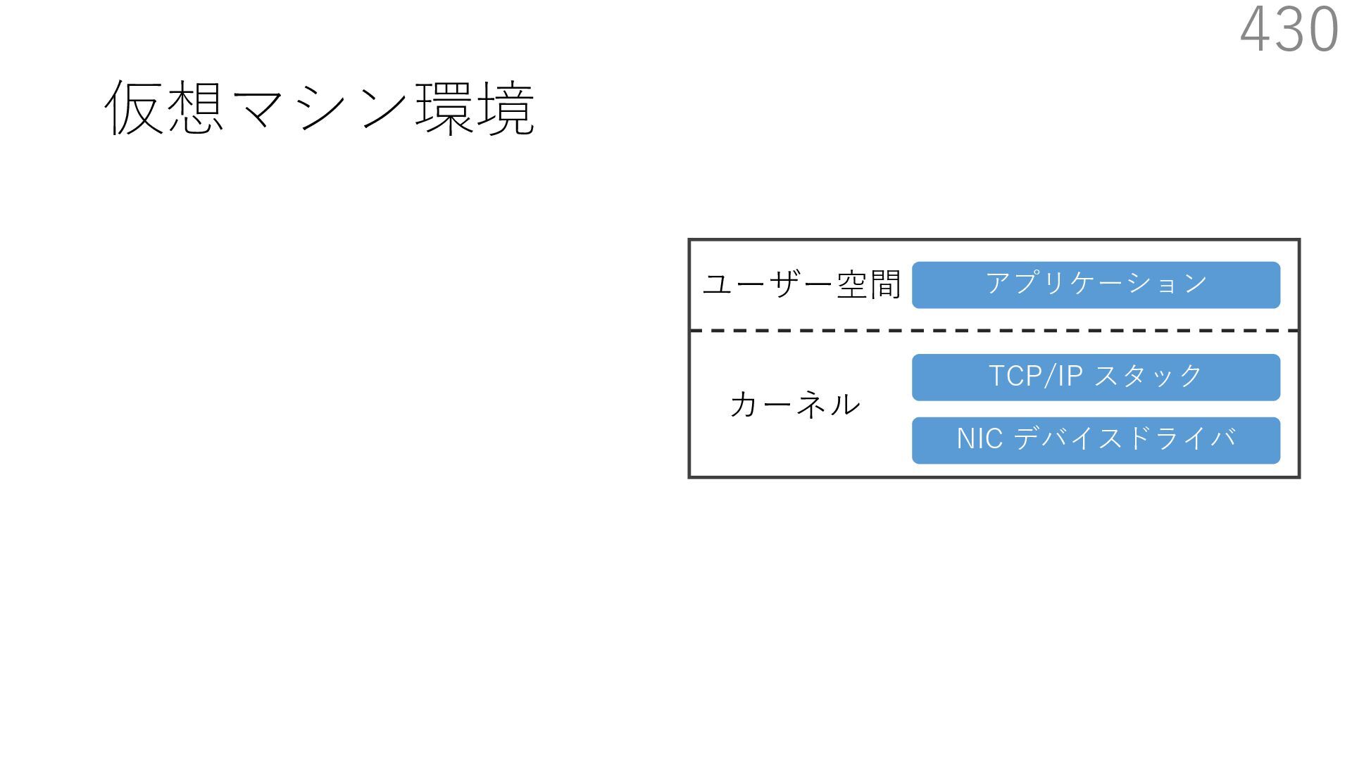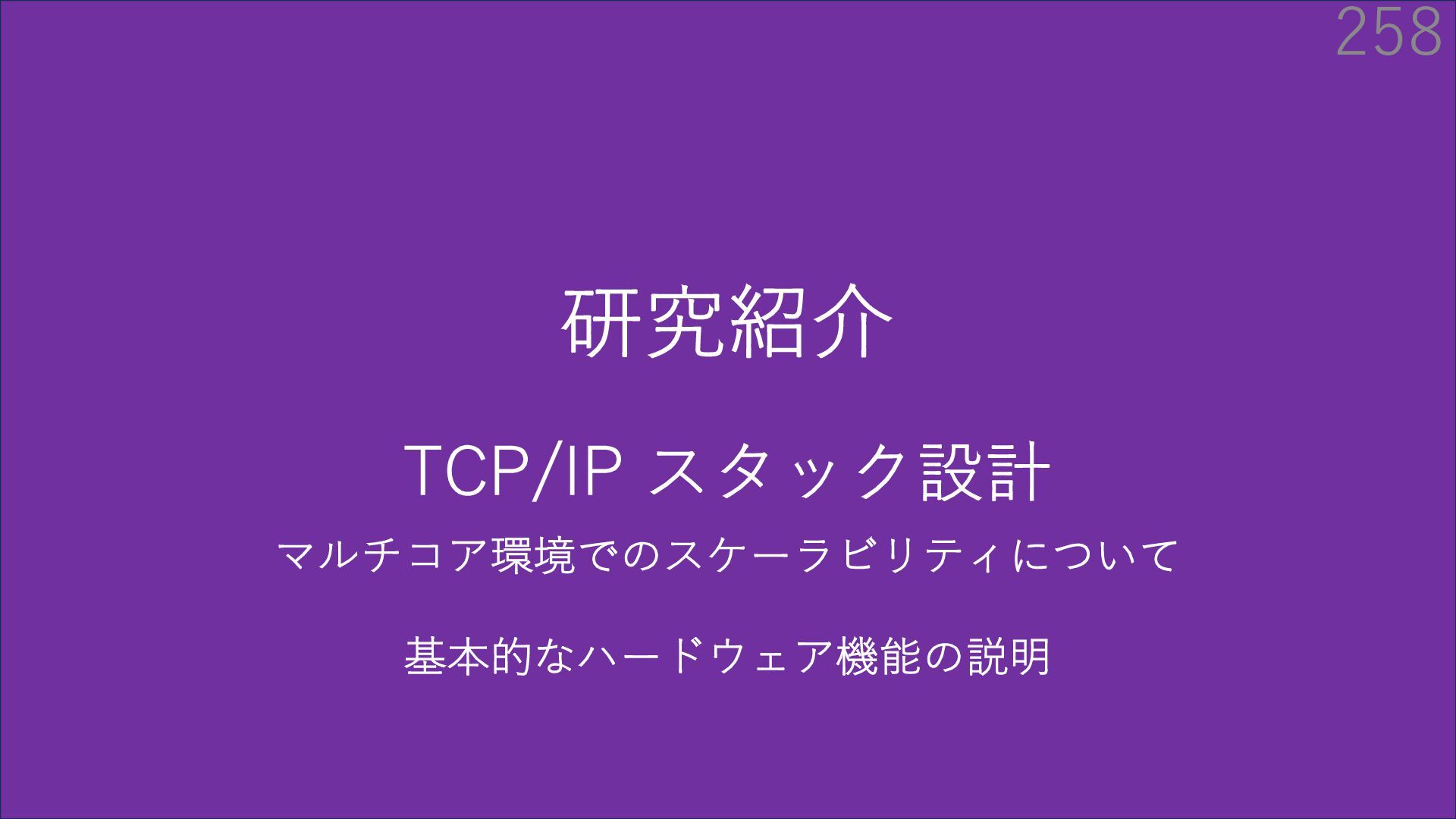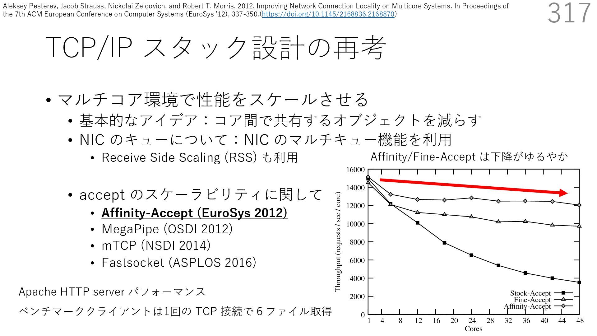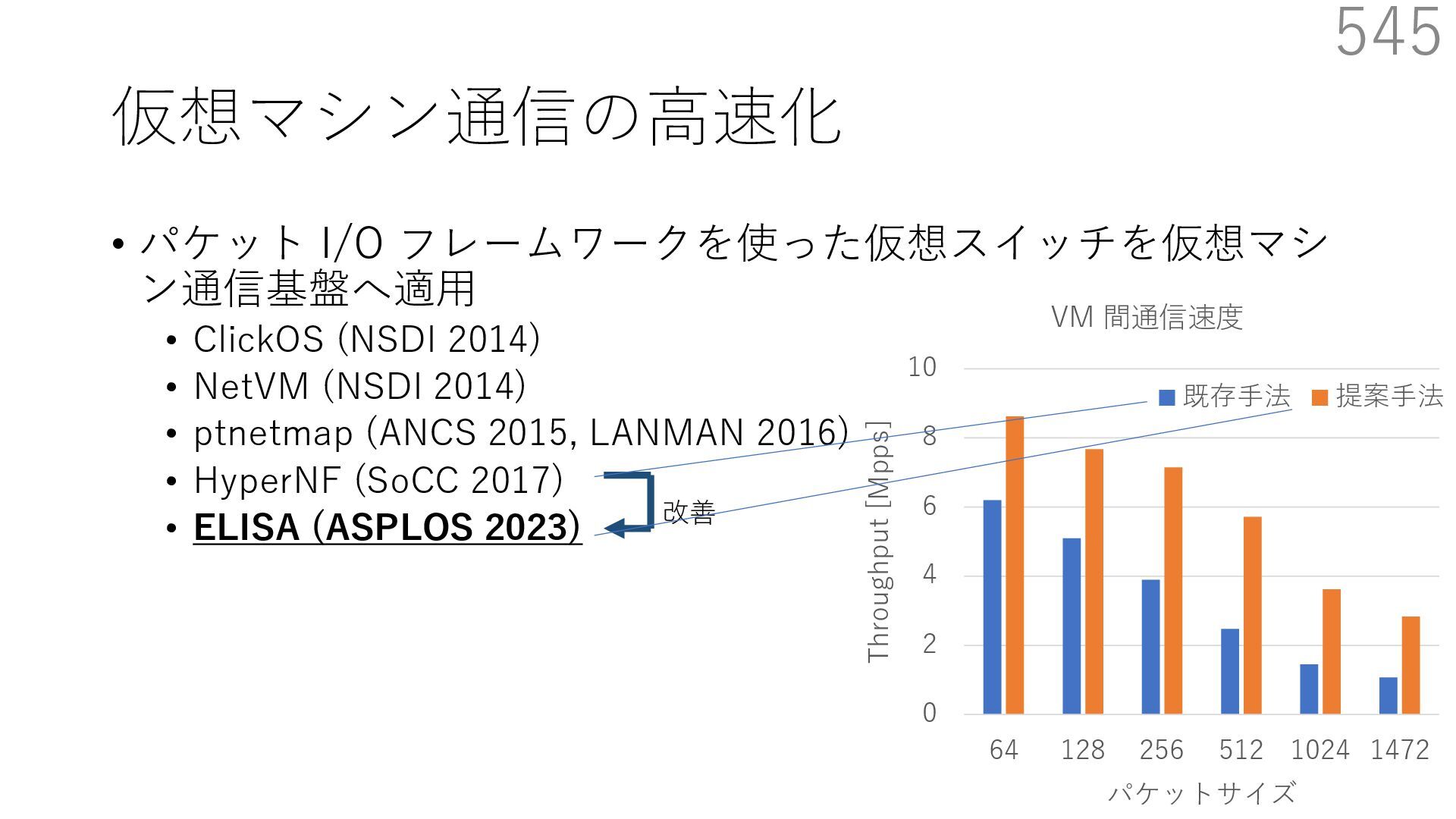 (SIGCOMM 2014) • mTCP (NSDI 2014) • Arrakis (OSDI 2014) • IX (OSDI 2014) • StackMap (USENIX ATC 2016) • Atlas (SIGCOMM 2017) • ZygOS (SOSP 2017) • Shenango (NSDI 2019) • Shinjuku (NSDI 2019) • TAS (EuroSys 2019) • Caladan (OSDI 2020) • Demikernel (SOSP 2021) 427 into a single library for both devices (e.g., RDMAxSPDK). We implemented the bulk of our library OS code in Rust. We initially prototyped several libOSes in C++; however, we found that Rust performs competitively with C++ and achieves ns-scale latencies while offering additional benefits. First, Rust enforces memory safety through language fea- tures and its compiler. Though our libOSes use unsafe code to bind to C/C++ kernel-bypass libraries and applications, User-space Software Kernel-space Software I/O Hardware I/O Device ??? libFuture ??? DPDK User I/O Buf. Mgmt libRDMA RDMA User I/O Buf. Mgmt Net. Trans. OS Kernel Control Path Demikernel Datapath Architecture App libPOSIX libDPDK SPDK User I/O Buf. Mgmt libSPDK Future Demikernel PDPIX Datapath API Figure 3. Demikernel kernel-bypass architecture. Demikernel ac- commodates heterogenous kernel-bypass devices, including poten- tial future hardware, with a flexible library OS-based datapath ar- chitecture.We include a libOS that goes through the OS kernel for 提案:異なるタイプのデバイスへ 共通のインターフェースからアクセス可能にする Irene Zhang, Amanda Raybuck, Pratyush Patel, Kirk Olynyk, Jacob Nelson, Omar S. Navarro Leija, Ashlie Martinez, Jing Liu, Anna Kornfeld Simpson, Sujay Jayakar, Pedro Henrique Penna, Max Demoulin, Piali Choudhury, and Anirudh Badam. 2021. The Demikernel Datapath OS Architecture for Microsecond-Scale Datacenter Systems. In Proceedings of the ACM Sigops 28th Symposium on Operating Systems Principles (SOSP ʼ21), 195-211.(https://doi.org/10.1145/3477132.3483569)