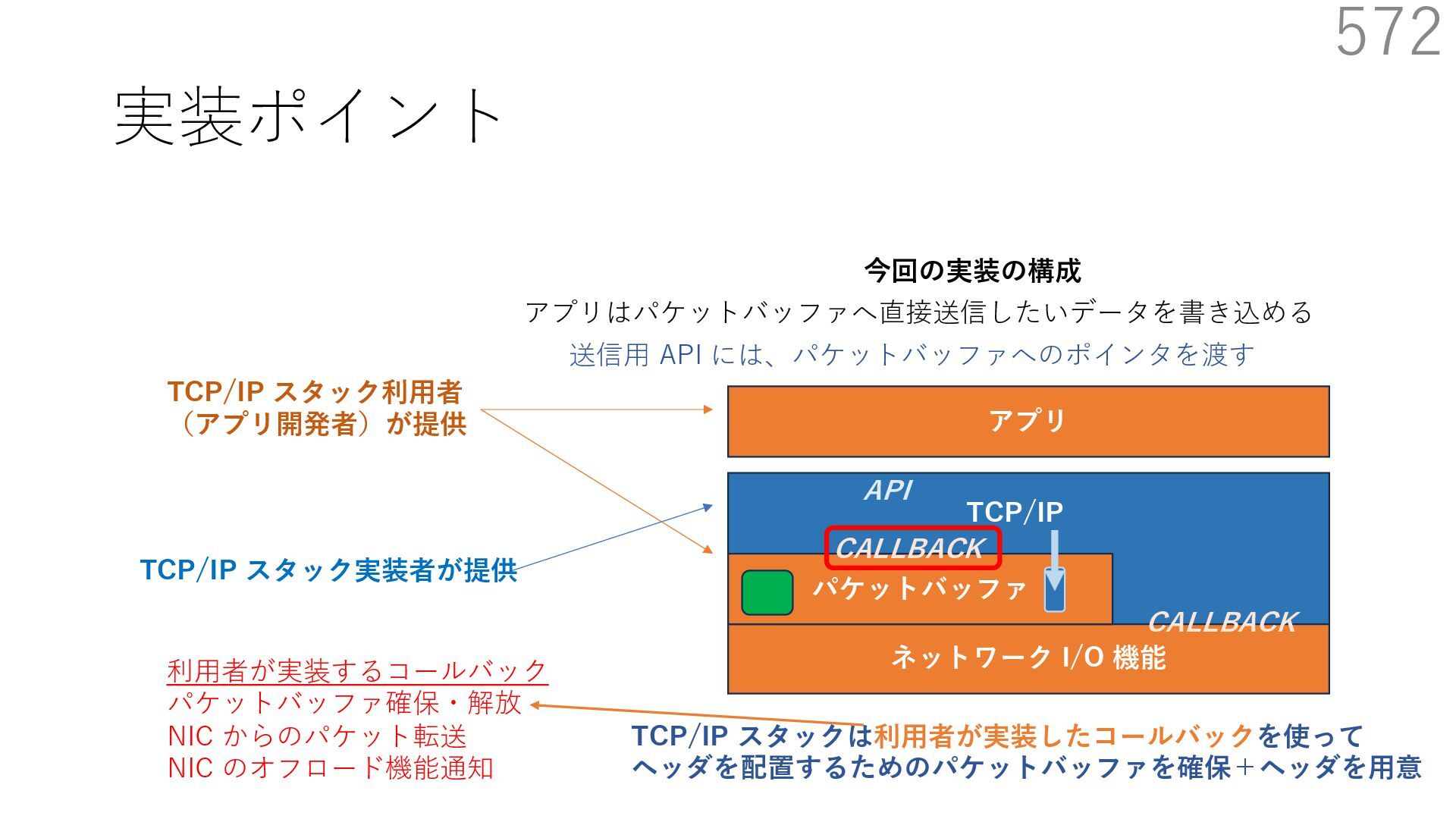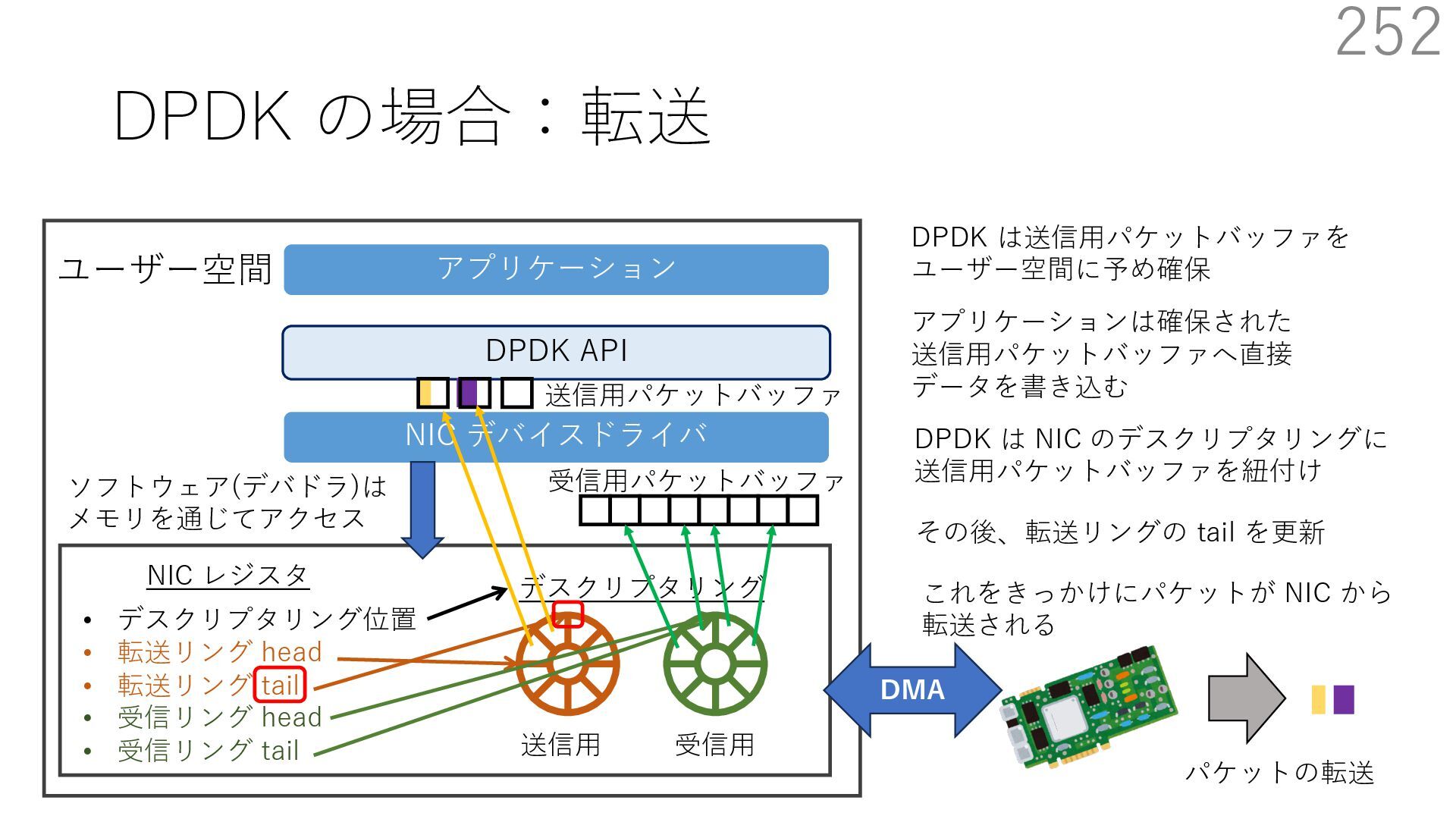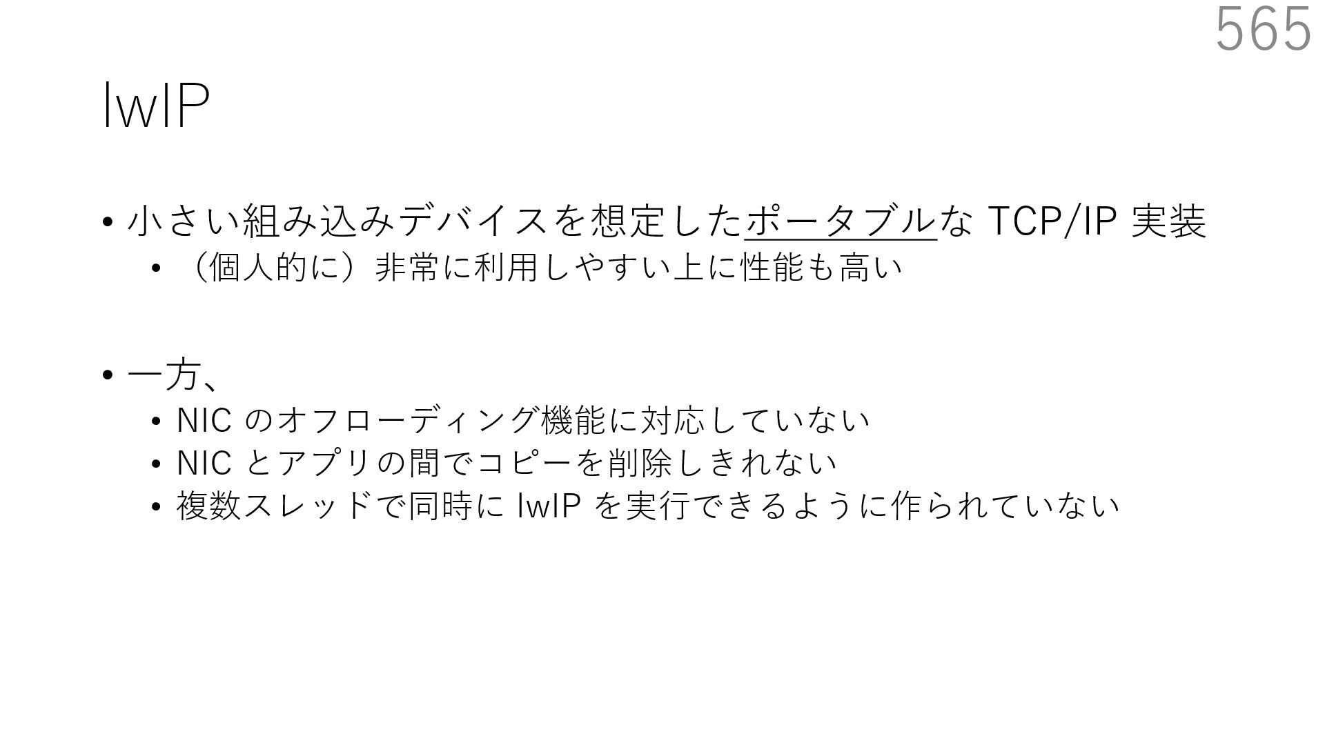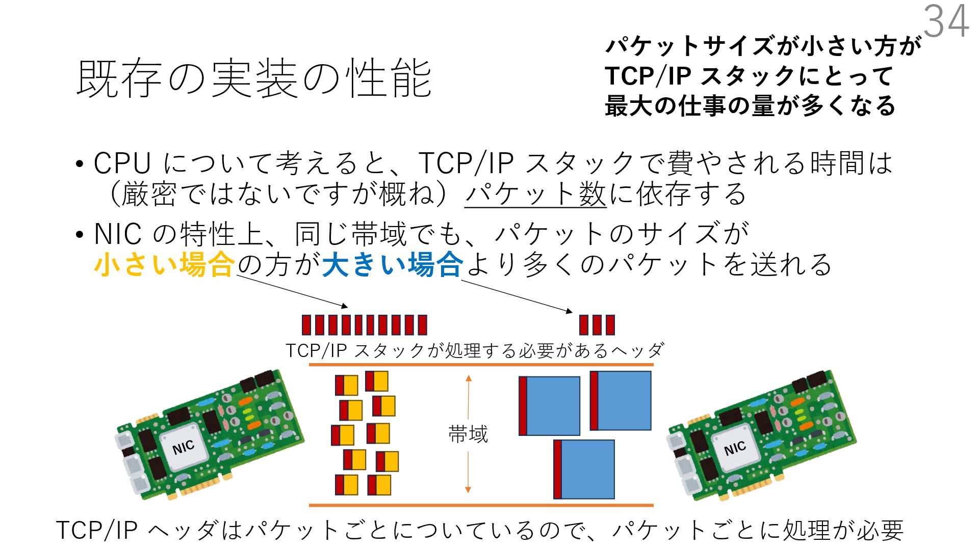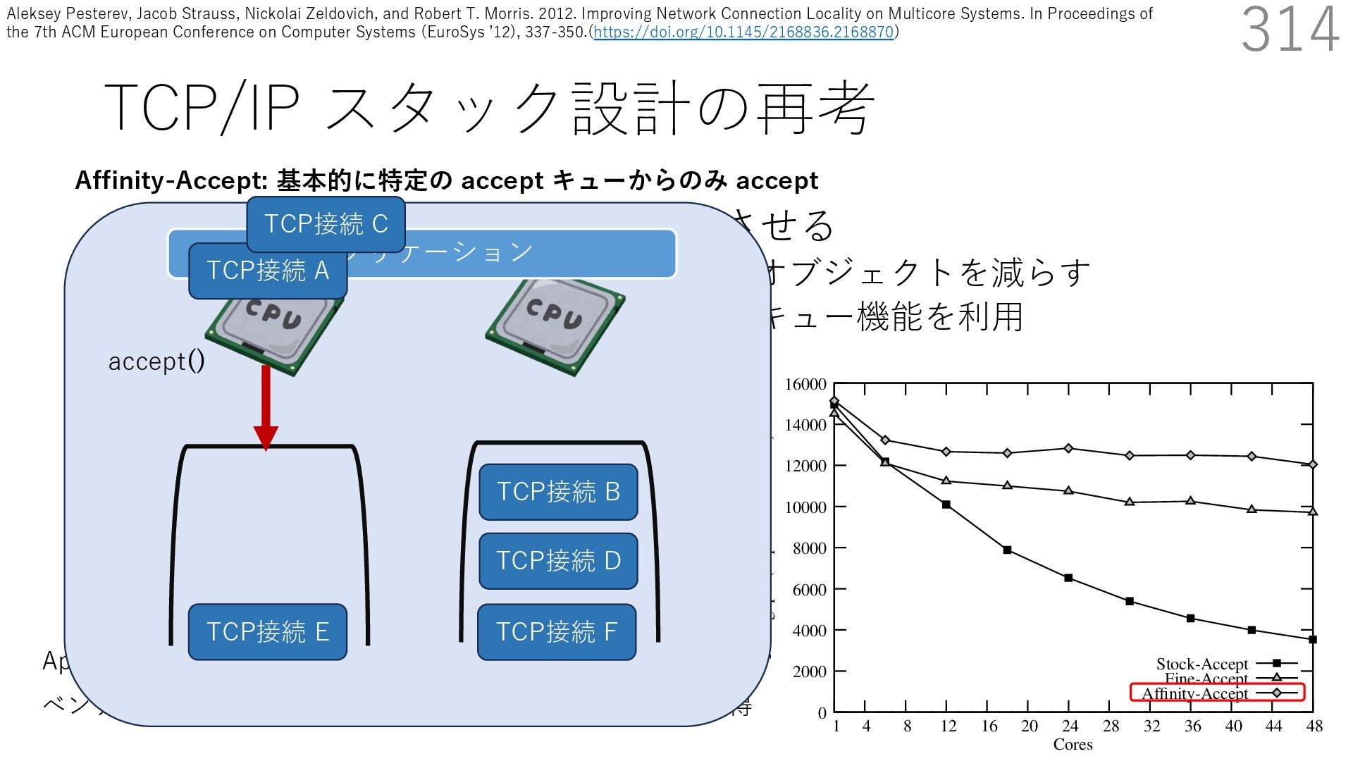 (SIGCOMM 2014) • mTCP (NSDI 2014) • Arrakis (OSDI 2014) • IX (OSDI 2014) • StackMap (USENIX ATC 2016) • Atlas (SIGCOMM 2017) • ZygOS (SOSP 2017) • Shenango (NSDI 2019) • Shinjuku (NSDI 2019) • TAS (EuroSys 2019) • Caladan (OSDI 2020) • Demikernel (SOSP 2021) 427 into a single library for both devices (e.g., RDMAxSPDK). We implemented the bulk of our library OS code in Rust. We initially prototyped several libOSes in C++; however, we found that Rust performs competitively with C++ and achieves ns-scale latencies while offering additional benefits. First, Rust enforces memory safety through language fea- tures and its compiler. Though our libOSes use unsafe code to bind to C/C++ kernel-bypass libraries and applications, User-space Software Kernel-space Software I/O Hardware I/O Device ??? libFuture ??? DPDK User I/O Buf. Mgmt libRDMA RDMA User I/O Buf. Mgmt Net. Trans. OS Kernel Control Path Demikernel Datapath Architecture App libPOSIX libDPDK SPDK User I/O Buf. Mgmt libSPDK Future Demikernel PDPIX Datapath API Figure 3. Demikernel kernel-bypass architecture. Demikernel ac- commodates heterogenous kernel-bypass devices, including poten- tial future hardware, with a flexible library OS-based datapath ar- chitecture.We include a libOS that goes through the OS kernel for 提案:異なるタイプのデバイスへ 共通のインターフェースからアクセス可能にする Irene Zhang, Amanda Raybuck, Pratyush Patel, Kirk Olynyk, Jacob Nelson, Omar S. Navarro Leija, Ashlie Martinez, Jing Liu, Anna Kornfeld Simpson, Sujay Jayakar, Pedro Henrique Penna, Max Demoulin, Piali Choudhury, and Anirudh Badam. 2021. The Demikernel Datapath OS Architecture for Microsecond-Scale Datacenter Systems. In Proceedings of the ACM Sigops 28th Symposium on Operating Systems Principles (SOSP ʼ21), 195-211.(https://doi.org/10.1145/3477132.3483569)