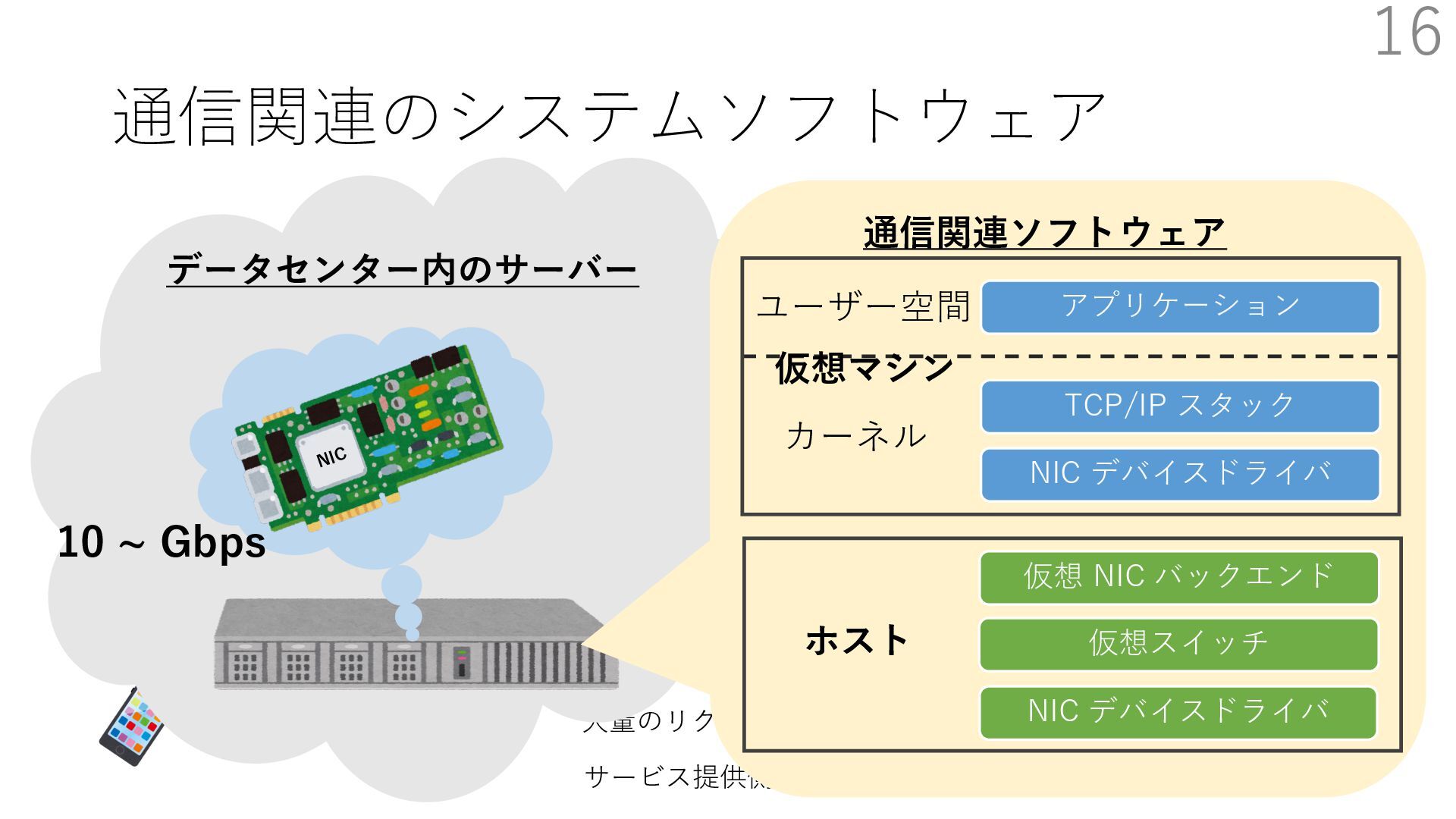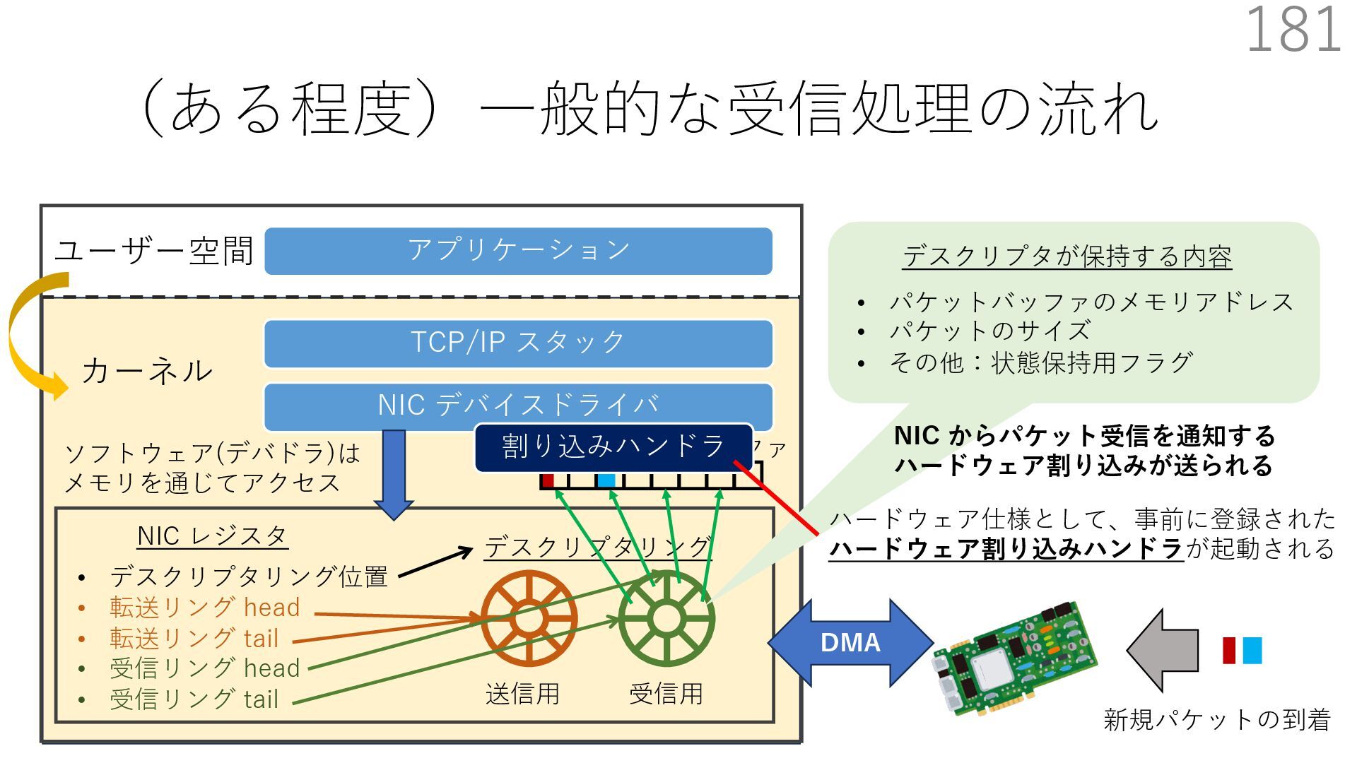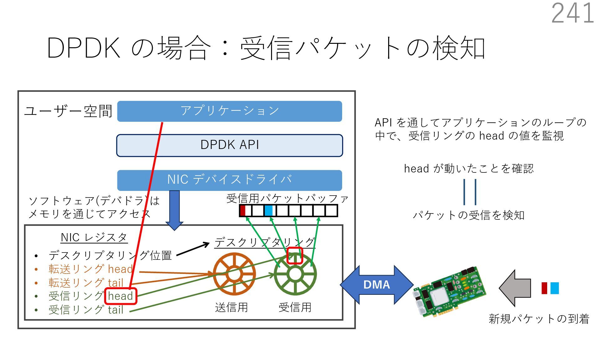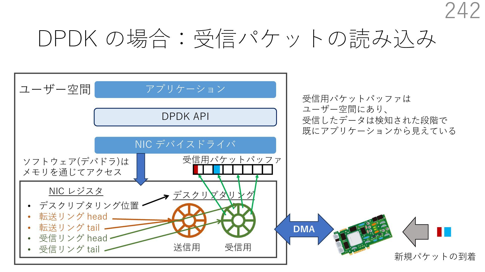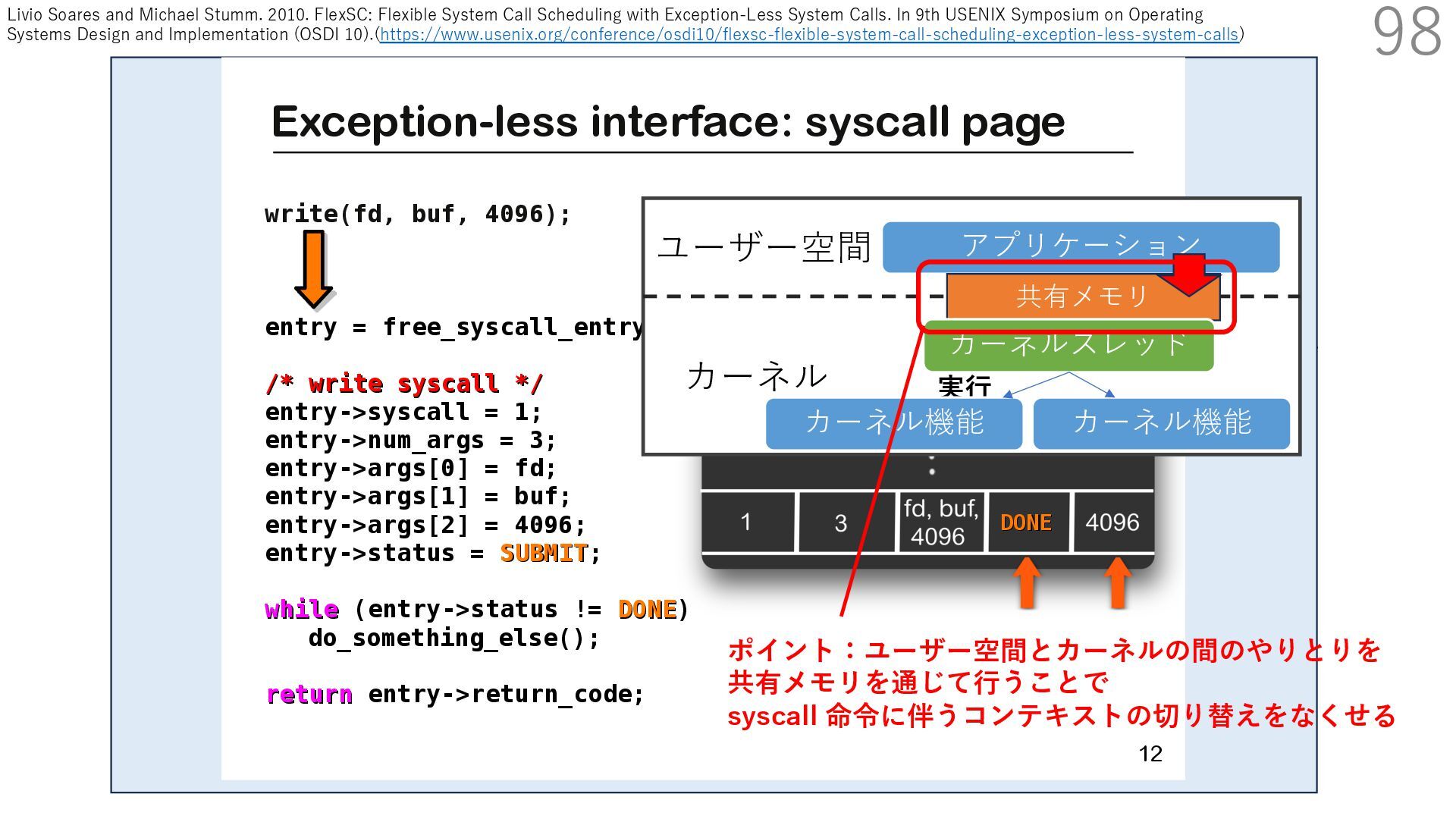 (SIGCOMM 2014) • mTCP (NSDI 2014) • Arrakis (OSDI 2014) • IX (OSDI 2014) • StackMap (USENIX ATC 2016) • Atlas (SIGCOMM 2017) • ZygOS (SOSP 2017) • Shenango (NSDI 2019) • Shinjuku (NSDI 2019) • TAS (EuroSys 2019) • Caladan (OSDI 2020) • Demikernel (SOSP 2021) 427 into a single library for both devices (e.g., RDMAxSPDK). We implemented the bulk of our library OS code in Rust. We initially prototyped several libOSes in C++; however, we found that Rust performs competitively with C++ and achieves ns-scale latencies while offering additional benefits. First, Rust enforces memory safety through language fea- tures and its compiler. Though our libOSes use unsafe code to bind to C/C++ kernel-bypass libraries and applications, User-space Software Kernel-space Software I/O Hardware I/O Device ??? libFuture ??? DPDK User I/O Buf. Mgmt libRDMA RDMA User I/O Buf. Mgmt Net. Trans. OS Kernel Control Path Demikernel Datapath Architecture App libPOSIX libDPDK SPDK User I/O Buf. Mgmt libSPDK Future Demikernel PDPIX Datapath API Figure 3. Demikernel kernel-bypass architecture. Demikernel ac- commodates heterogenous kernel-bypass devices, including poten- tial future hardware, with a flexible library OS-based datapath ar- chitecture.We include a libOS that goes through the OS kernel for 提案:異なるタイプのデバイスへ 共通のインターフェースからアクセス可能にする Irene Zhang, Amanda Raybuck, Pratyush Patel, Kirk Olynyk, Jacob Nelson, Omar S. Navarro Leija, Ashlie Martinez, Jing Liu, Anna Kornfeld Simpson, Sujay Jayakar, Pedro Henrique Penna, Max Demoulin, Piali Choudhury, and Anirudh Badam. 2021. The Demikernel Datapath OS Architecture for Microsecond-Scale Datacenter Systems. In Proceedings of the ACM Sigops 28th Symposium on Operating Systems Principles (SOSP ʼ21), 195-211.(https://doi.org/10.1145/3477132.3483569)
