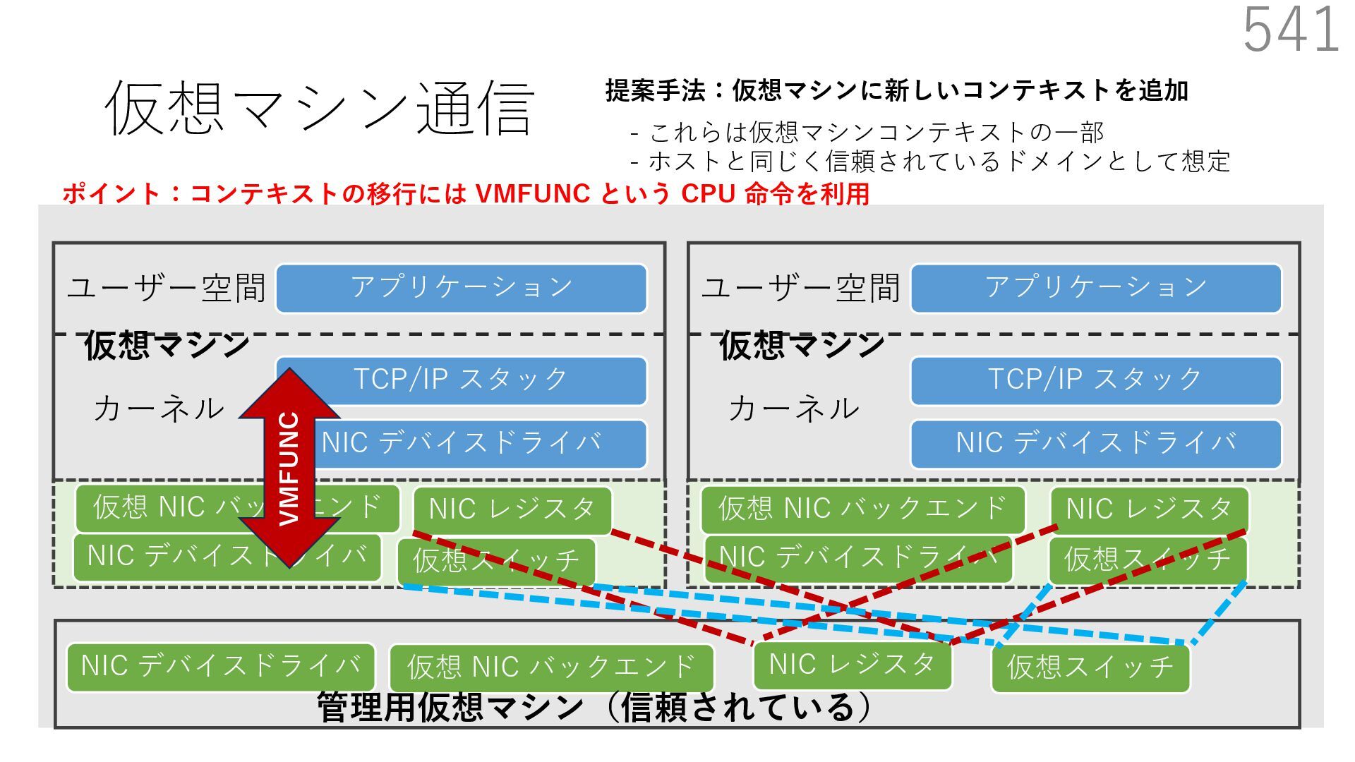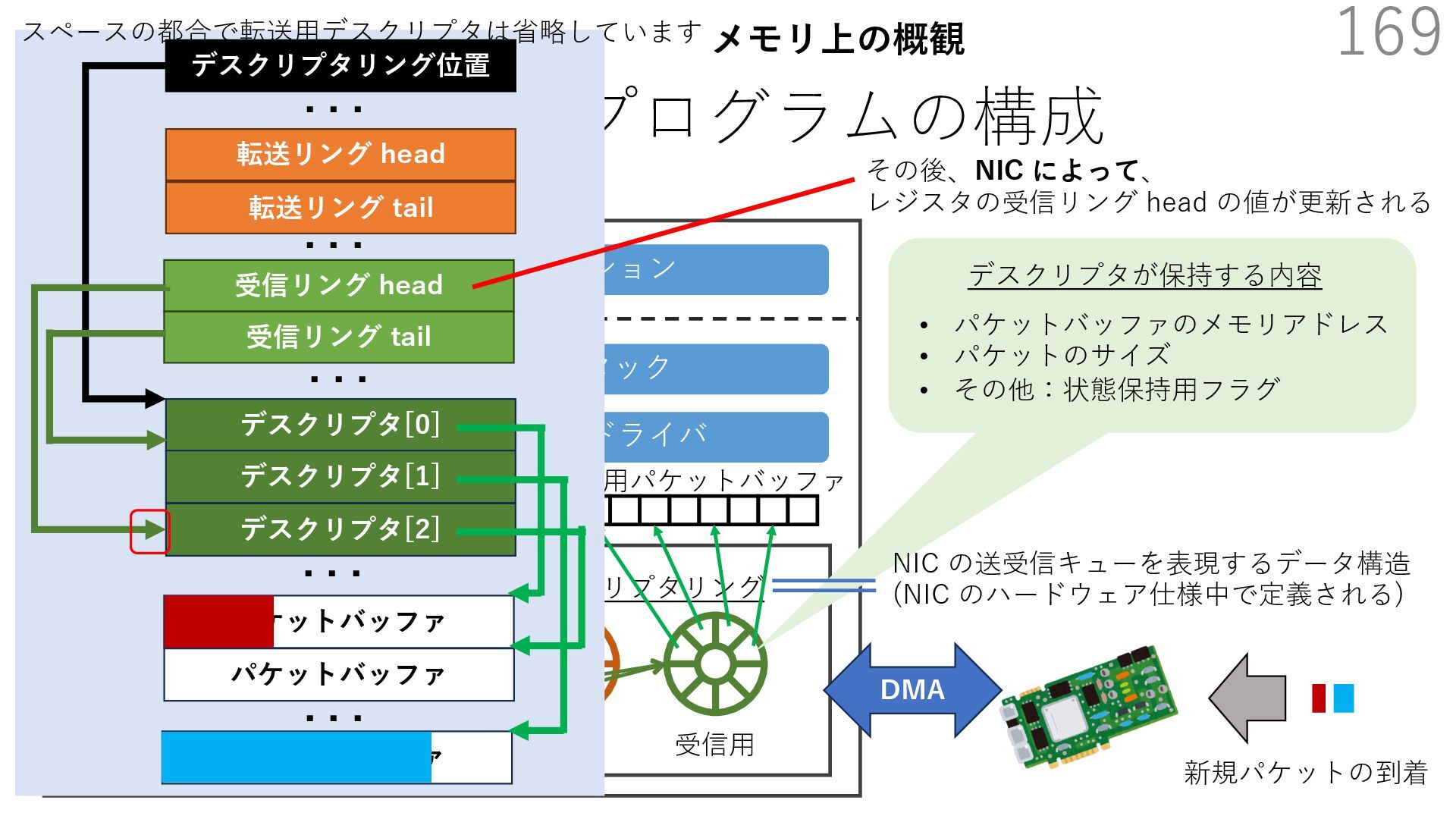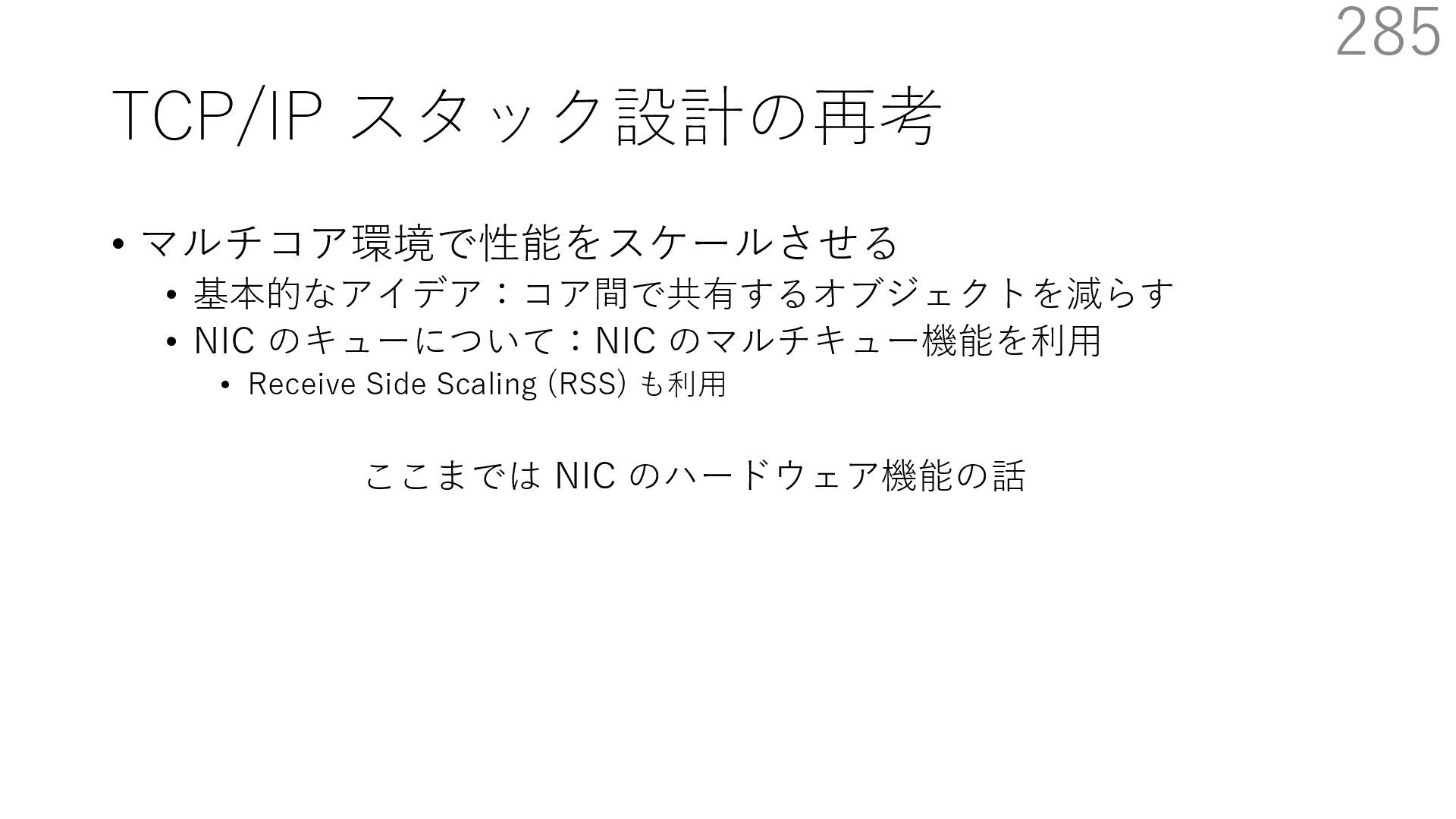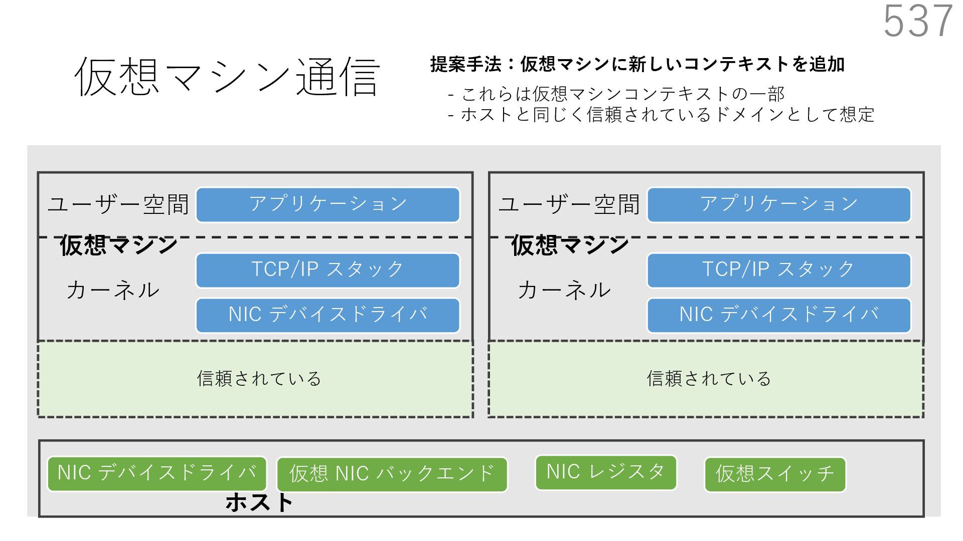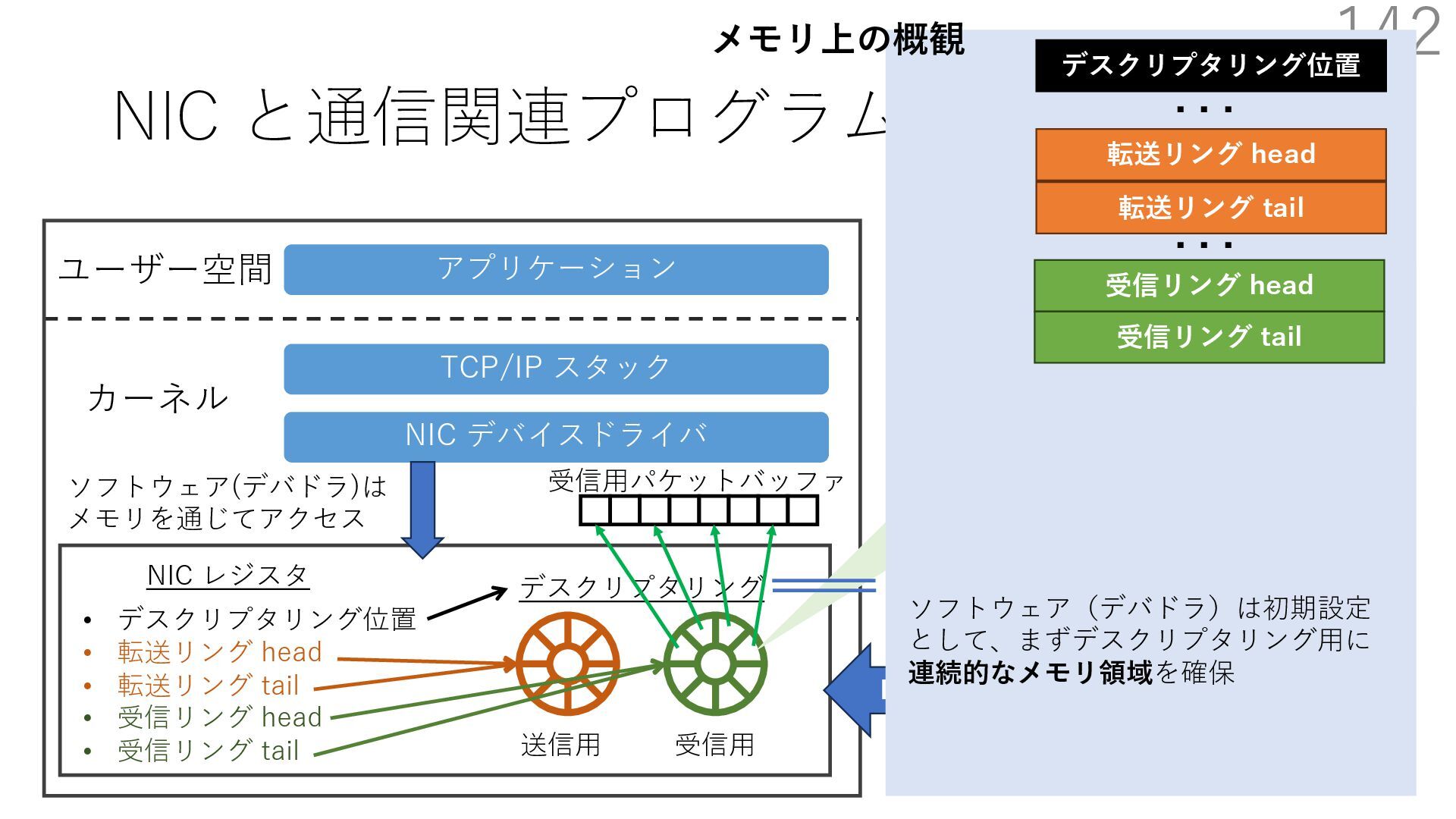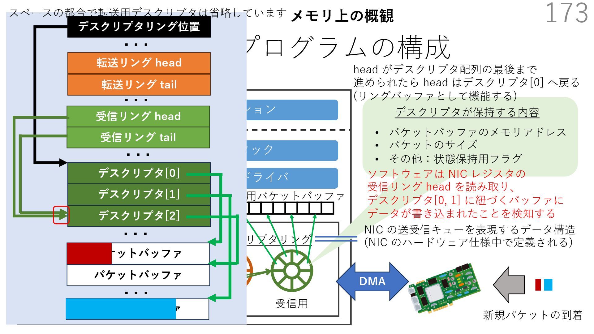 (SIGCOMM 2014) • mTCP (NSDI 2014) • Arrakis (OSDI 2014) • IX (OSDI 2014) • StackMap (USENIX ATC 2016) • Atlas (SIGCOMM 2017) • ZygOS (SOSP 2017) • Shenango (NSDI 2019) • Shinjuku (NSDI 2019) • TAS (EuroSys 2019) • Caladan (OSDI 2020) • Demikernel (SOSP 2021) 427 into a single library for both devices (e.g., RDMAxSPDK). We implemented the bulk of our library OS code in Rust. We initially prototyped several libOSes in C++; however, we found that Rust performs competitively with C++ and achieves ns-scale latencies while offering additional benefits. First, Rust enforces memory safety through language fea- tures and its compiler. Though our libOSes use unsafe code to bind to C/C++ kernel-bypass libraries and applications, User-space Software Kernel-space Software I/O Hardware I/O Device ??? libFuture ??? DPDK User I/O Buf. Mgmt libRDMA RDMA User I/O Buf. Mgmt Net. Trans. OS Kernel Control Path Demikernel Datapath Architecture App libPOSIX libDPDK SPDK User I/O Buf. Mgmt libSPDK Future Demikernel PDPIX Datapath API Figure 3. Demikernel kernel-bypass architecture. Demikernel ac- commodates heterogenous kernel-bypass devices, including poten- tial future hardware, with a flexible library OS-based datapath ar- chitecture.We include a libOS that goes through the OS kernel for 提案:異なるタイプのデバイスへ 共通のインターフェースからアクセス可能にする Irene Zhang, Amanda Raybuck, Pratyush Patel, Kirk Olynyk, Jacob Nelson, Omar S. Navarro Leija, Ashlie Martinez, Jing Liu, Anna Kornfeld Simpson, Sujay Jayakar, Pedro Henrique Penna, Max Demoulin, Piali Choudhury, and Anirudh Badam. 2021. The Demikernel Datapath OS Architecture for Microsecond-Scale Datacenter Systems. In Proceedings of the ACM Sigops 28th Symposium on Operating Systems Principles (SOSP ʼ21), 195-211.(https://doi.org/10.1145/3477132.3483569)