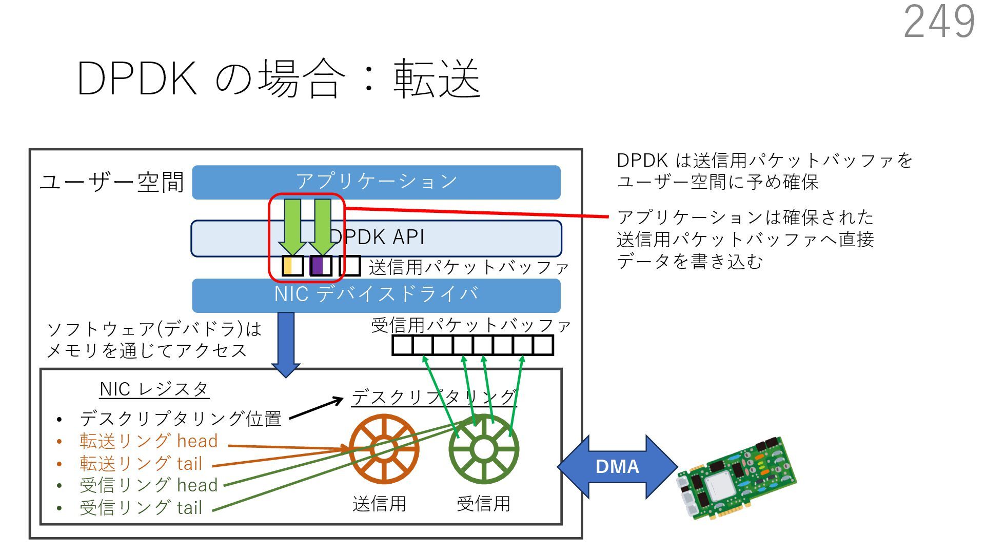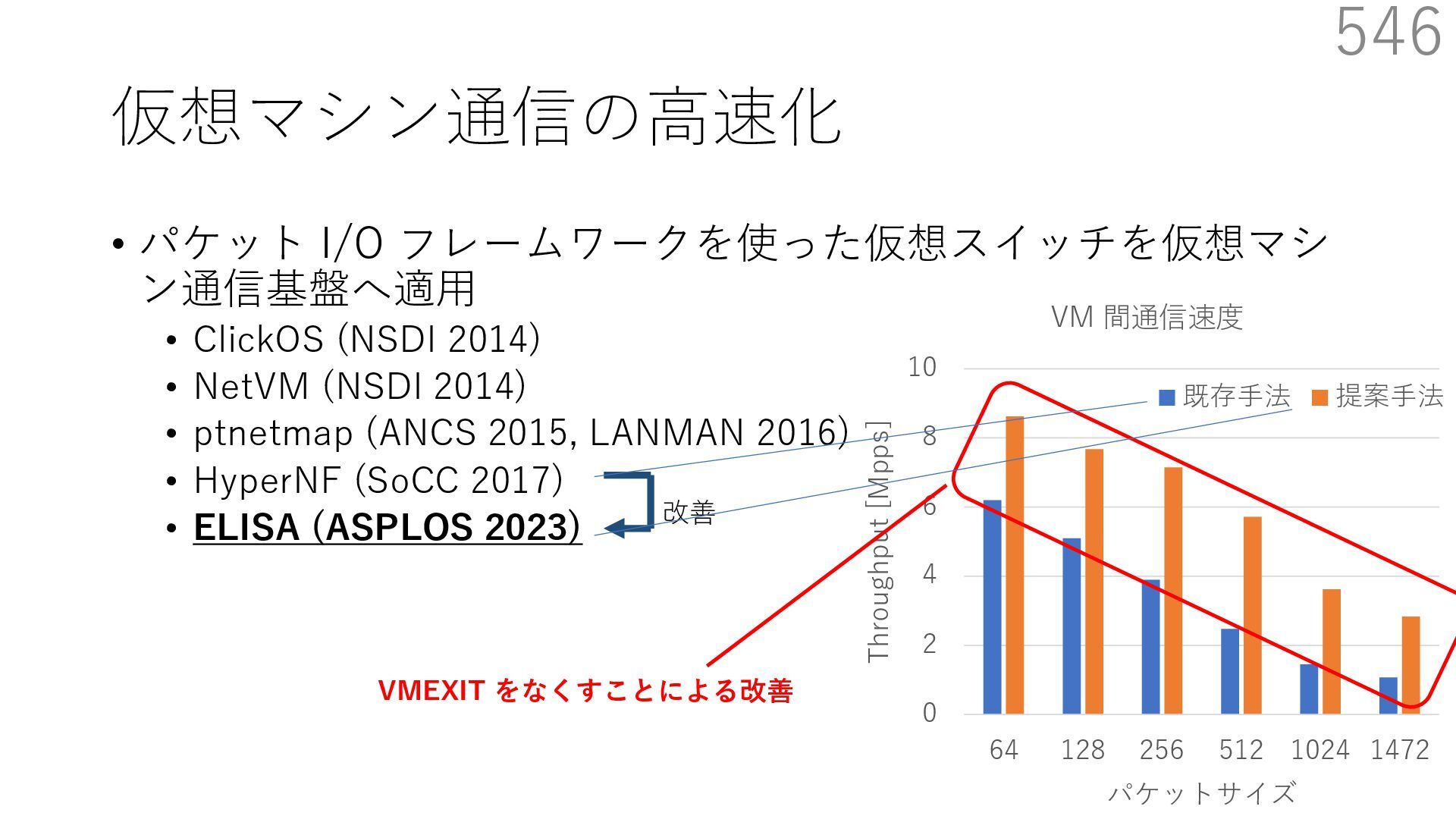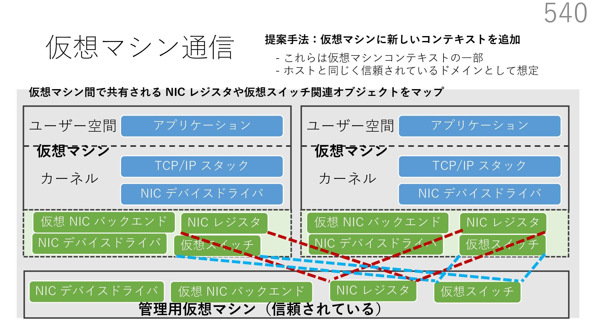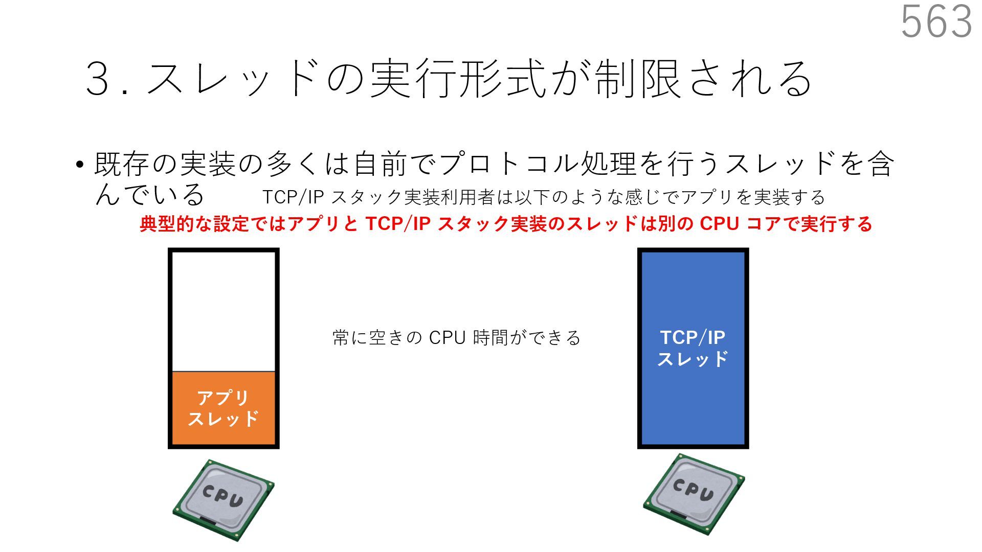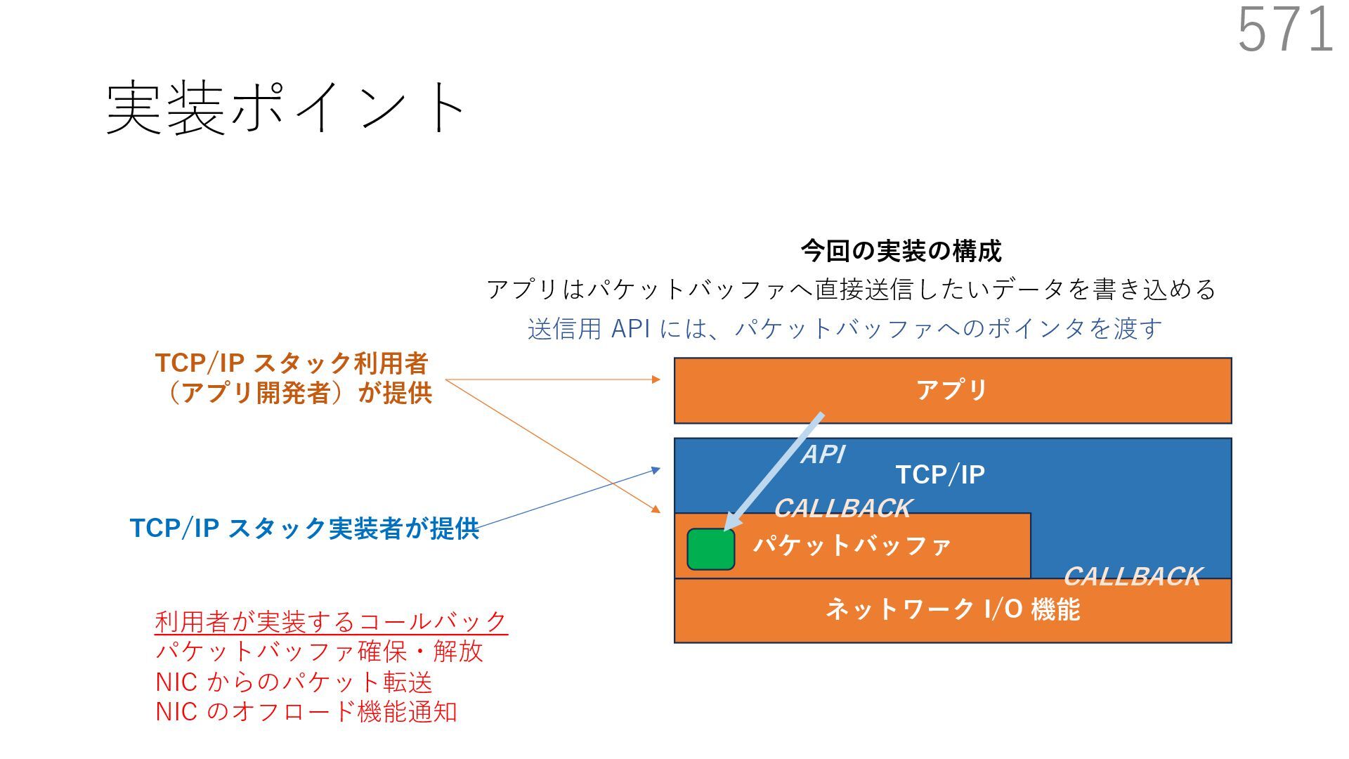 (SIGCOMM 2014) • mTCP (NSDI 2014) • Arrakis (OSDI 2014) • IX (OSDI 2014) • StackMap (USENIX ATC 2016) • Atlas (SIGCOMM 2017) • ZygOS (SOSP 2017) • Shenango (NSDI 2019) • Shinjuku (NSDI 2019) • TAS (EuroSys 2019) • Caladan (OSDI 2020) • Demikernel (SOSP 2021) 427 into a single library for both devices (e.g., RDMAxSPDK). We implemented the bulk of our library OS code in Rust. We initially prototyped several libOSes in C++; however, we found that Rust performs competitively with C++ and achieves ns-scale latencies while offering additional benefits. First, Rust enforces memory safety through language fea- tures and its compiler. Though our libOSes use unsafe code to bind to C/C++ kernel-bypass libraries and applications, User-space Software Kernel-space Software I/O Hardware I/O Device ??? libFuture ??? DPDK User I/O Buf. Mgmt libRDMA RDMA User I/O Buf. Mgmt Net. Trans. OS Kernel Control Path Demikernel Datapath Architecture App libPOSIX libDPDK SPDK User I/O Buf. Mgmt libSPDK Future Demikernel PDPIX Datapath API Figure 3. Demikernel kernel-bypass architecture. Demikernel ac- commodates heterogenous kernel-bypass devices, including poten- tial future hardware, with a flexible library OS-based datapath ar- chitecture.We include a libOS that goes through the OS kernel for 提案:異なるタイプのデバイスへ 共通のインターフェースからアクセス可能にする Irene Zhang, Amanda Raybuck, Pratyush Patel, Kirk Olynyk, Jacob Nelson, Omar S. Navarro Leija, Ashlie Martinez, Jing Liu, Anna Kornfeld Simpson, Sujay Jayakar, Pedro Henrique Penna, Max Demoulin, Piali Choudhury, and Anirudh Badam. 2021. The Demikernel Datapath OS Architecture for Microsecond-Scale Datacenter Systems. In Proceedings of the ACM Sigops 28th Symposium on Operating Systems Principles (SOSP ʼ21), 195-211.(https://doi.org/10.1145/3477132.3483569)