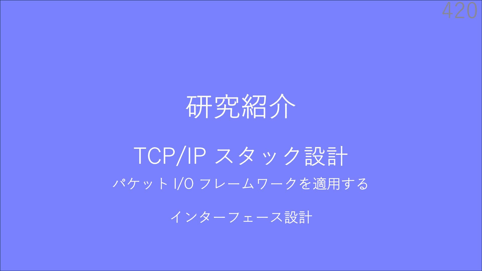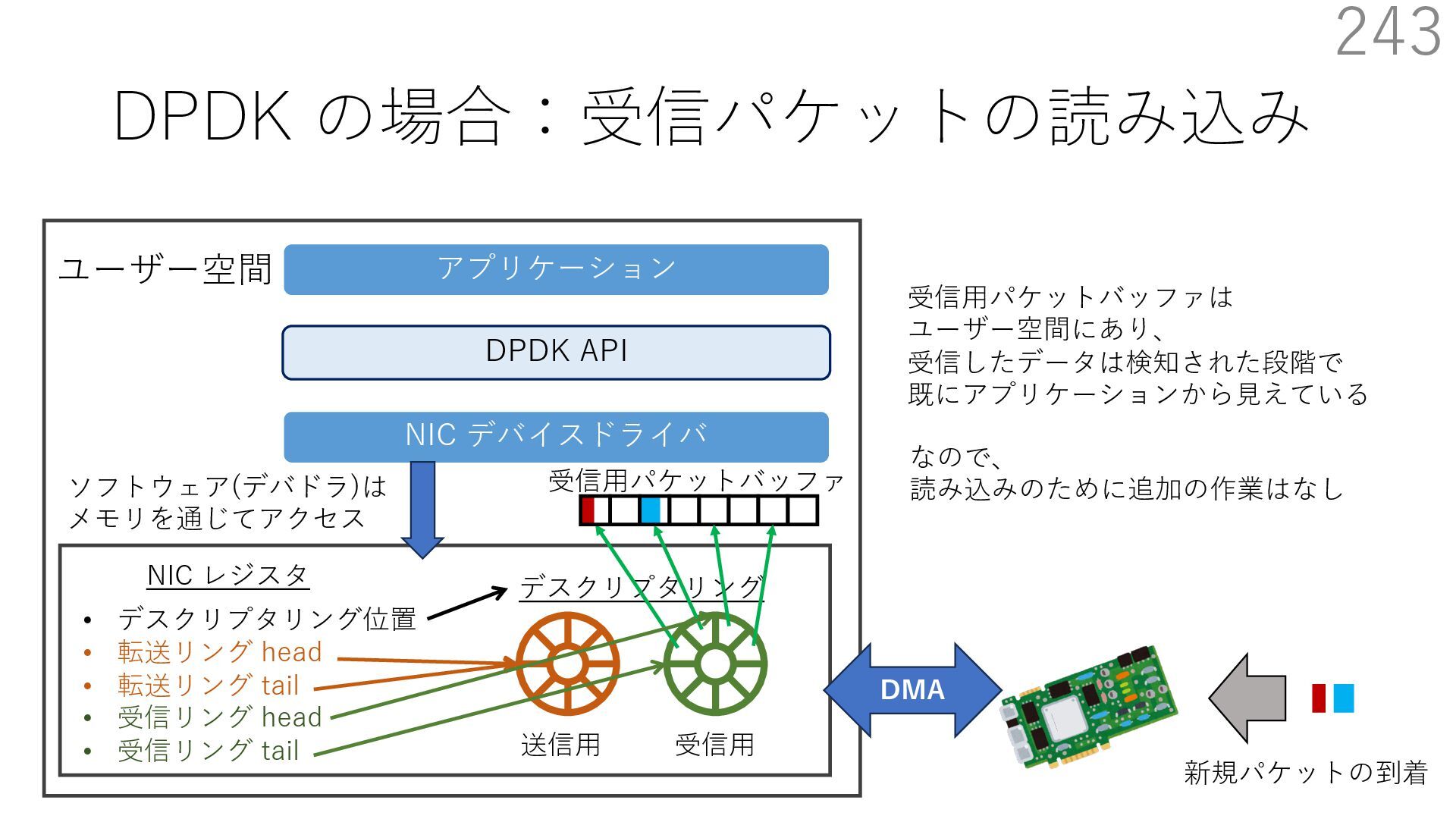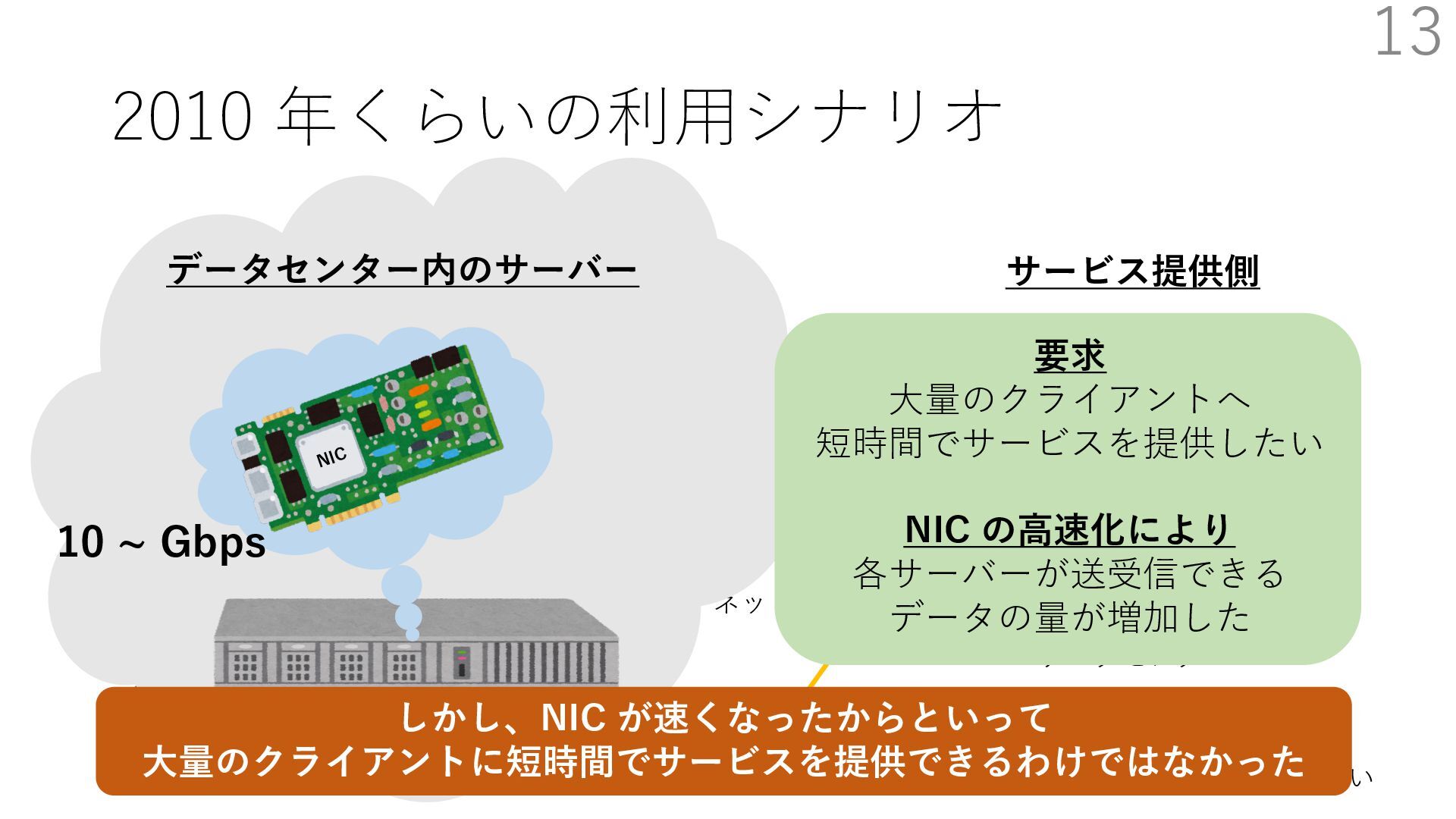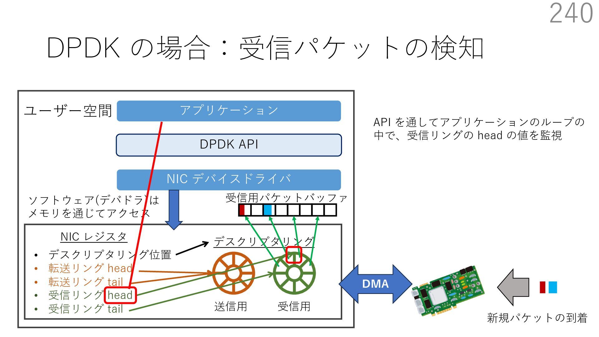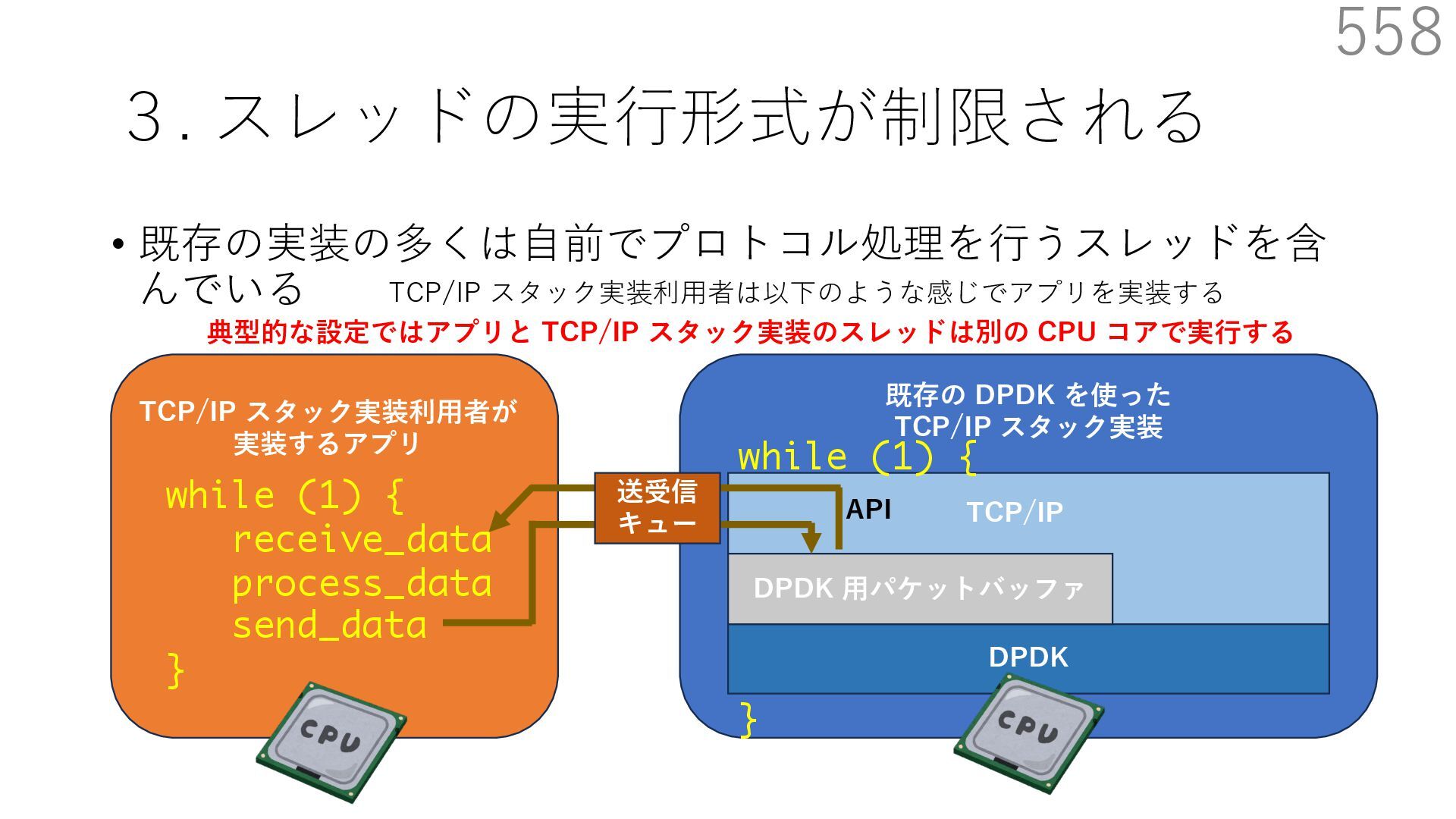 (SIGCOMM 2014) • mTCP (NSDI 2014) • Arrakis (OSDI 2014) • IX (OSDI 2014) • StackMap (USENIX ATC 2016) • Atlas (SIGCOMM 2017) • ZygOS (SOSP 2017) • Shenango (NSDI 2019) • Shinjuku (NSDI 2019) • TAS (EuroSys 2019) • Caladan (OSDI 2020) • Demikernel (SOSP 2021) 427 into a single library for both devices (e.g., RDMAxSPDK). We implemented the bulk of our library OS code in Rust. We initially prototyped several libOSes in C++; however, we found that Rust performs competitively with C++ and achieves ns-scale latencies while offering additional benefits. First, Rust enforces memory safety through language fea- tures and its compiler. Though our libOSes use unsafe code to bind to C/C++ kernel-bypass libraries and applications, User-space Software Kernel-space Software I/O Hardware I/O Device ??? libFuture ??? DPDK User I/O Buf. Mgmt libRDMA RDMA User I/O Buf. Mgmt Net. Trans. OS Kernel Control Path Demikernel Datapath Architecture App libPOSIX libDPDK SPDK User I/O Buf. Mgmt libSPDK Future Demikernel PDPIX Datapath API Figure 3. Demikernel kernel-bypass architecture. Demikernel ac- commodates heterogenous kernel-bypass devices, including poten- tial future hardware, with a flexible library OS-based datapath ar- chitecture.We include a libOS that goes through the OS kernel for 提案:異なるタイプのデバイスへ 共通のインターフェースからアクセス可能にする Irene Zhang, Amanda Raybuck, Pratyush Patel, Kirk Olynyk, Jacob Nelson, Omar S. Navarro Leija, Ashlie Martinez, Jing Liu, Anna Kornfeld Simpson, Sujay Jayakar, Pedro Henrique Penna, Max Demoulin, Piali Choudhury, and Anirudh Badam. 2021. The Demikernel Datapath OS Architecture for Microsecond-Scale Datacenter Systems. In Proceedings of the ACM Sigops 28th Symposium on Operating Systems Principles (SOSP ʼ21), 195-211.(https://doi.org/10.1145/3477132.3483569)