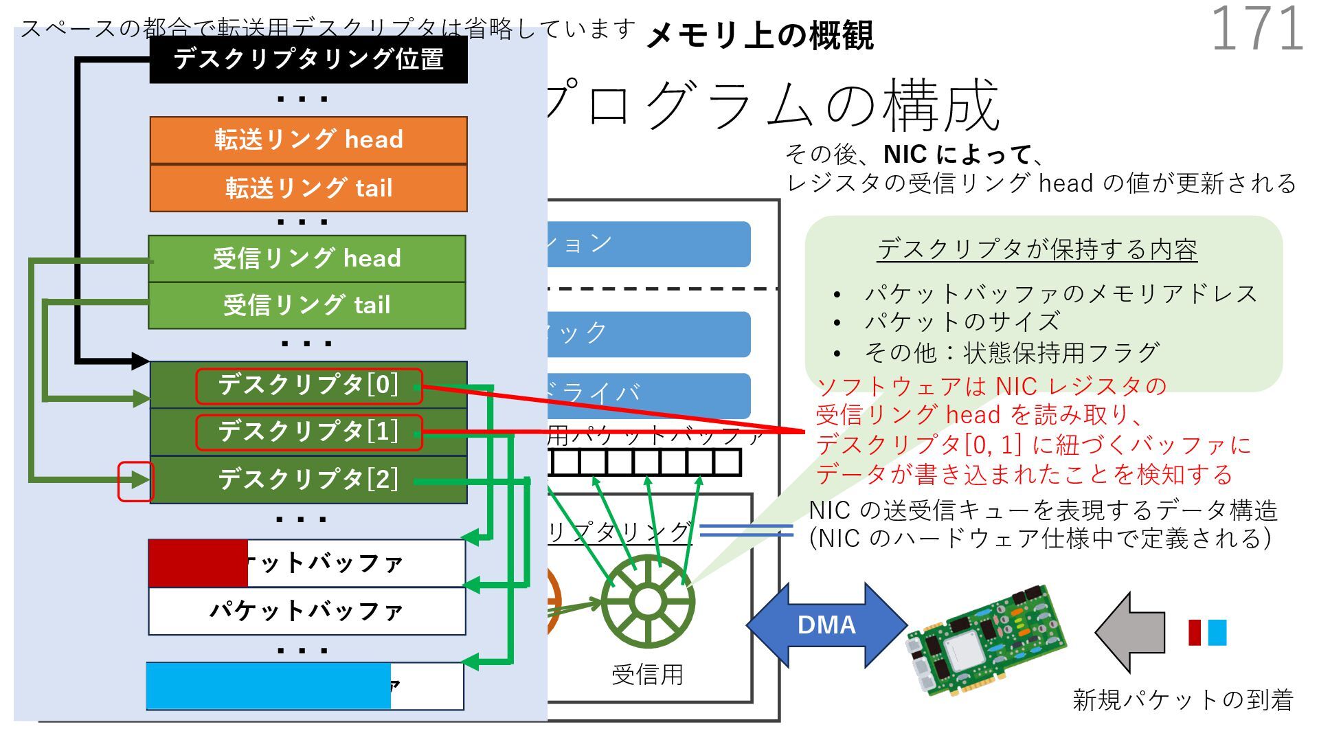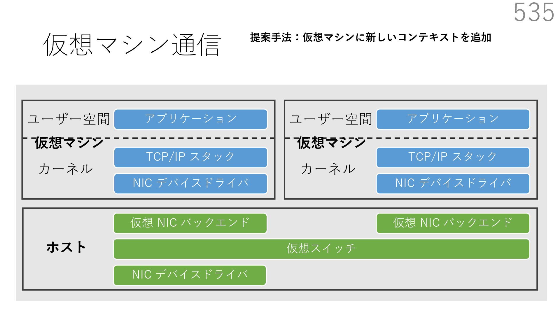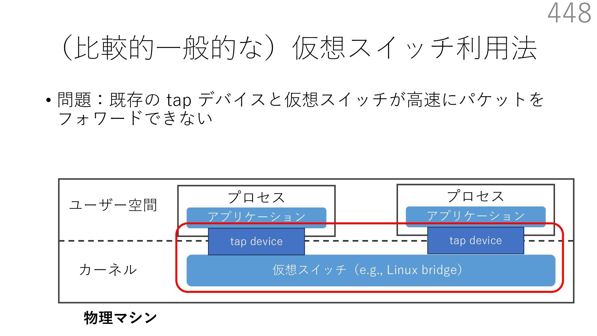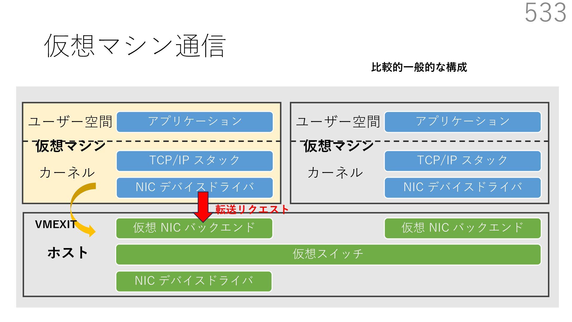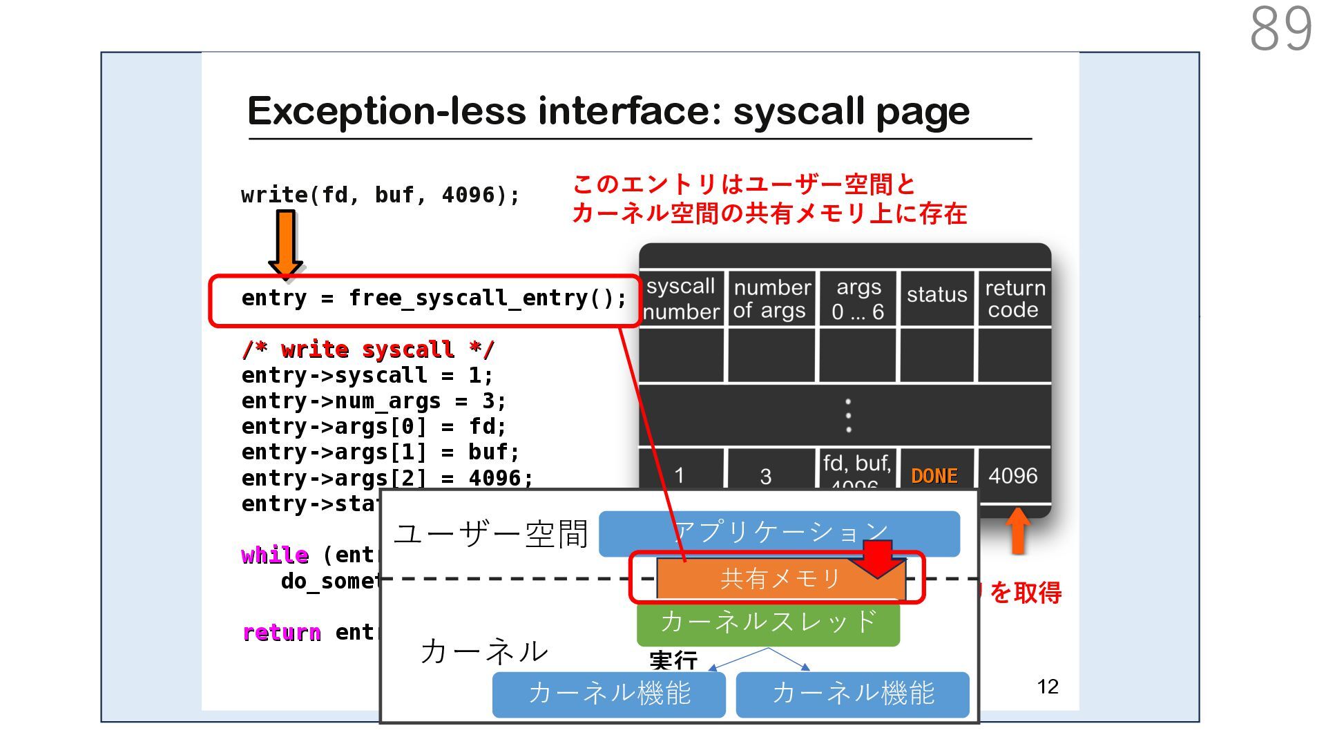 (SIGCOMM 2014) • mTCP (NSDI 2014) • Arrakis (OSDI 2014) • IX (OSDI 2014) • StackMap (USENIX ATC 2016) • Atlas (SIGCOMM 2017) • ZygOS (SOSP 2017) • Shenango (NSDI 2019) • Shinjuku (NSDI 2019) • TAS (EuroSys 2019) • Caladan (OSDI 2020) • Demikernel (SOSP 2021) 427 into a single library for both devices (e.g., RDMAxSPDK). We implemented the bulk of our library OS code in Rust. We initially prototyped several libOSes in C++; however, we found that Rust performs competitively with C++ and achieves ns-scale latencies while offering additional benefits. First, Rust enforces memory safety through language fea- tures and its compiler. Though our libOSes use unsafe code to bind to C/C++ kernel-bypass libraries and applications, User-space Software Kernel-space Software I/O Hardware I/O Device ??? libFuture ??? DPDK User I/O Buf. Mgmt libRDMA RDMA User I/O Buf. Mgmt Net. Trans. OS Kernel Control Path Demikernel Datapath Architecture App libPOSIX libDPDK SPDK User I/O Buf. Mgmt libSPDK Future Demikernel PDPIX Datapath API Figure 3. Demikernel kernel-bypass architecture. Demikernel ac- commodates heterogenous kernel-bypass devices, including poten- tial future hardware, with a flexible library OS-based datapath ar- chitecture.We include a libOS that goes through the OS kernel for 提案:異なるタイプのデバイスへ 共通のインターフェースからアクセス可能にする Irene Zhang, Amanda Raybuck, Pratyush Patel, Kirk Olynyk, Jacob Nelson, Omar S. Navarro Leija, Ashlie Martinez, Jing Liu, Anna Kornfeld Simpson, Sujay Jayakar, Pedro Henrique Penna, Max Demoulin, Piali Choudhury, and Anirudh Badam. 2021. The Demikernel Datapath OS Architecture for Microsecond-Scale Datacenter Systems. In Proceedings of the ACM Sigops 28th Symposium on Operating Systems Principles (SOSP ʼ21), 195-211.(https://doi.org/10.1145/3477132.3483569)