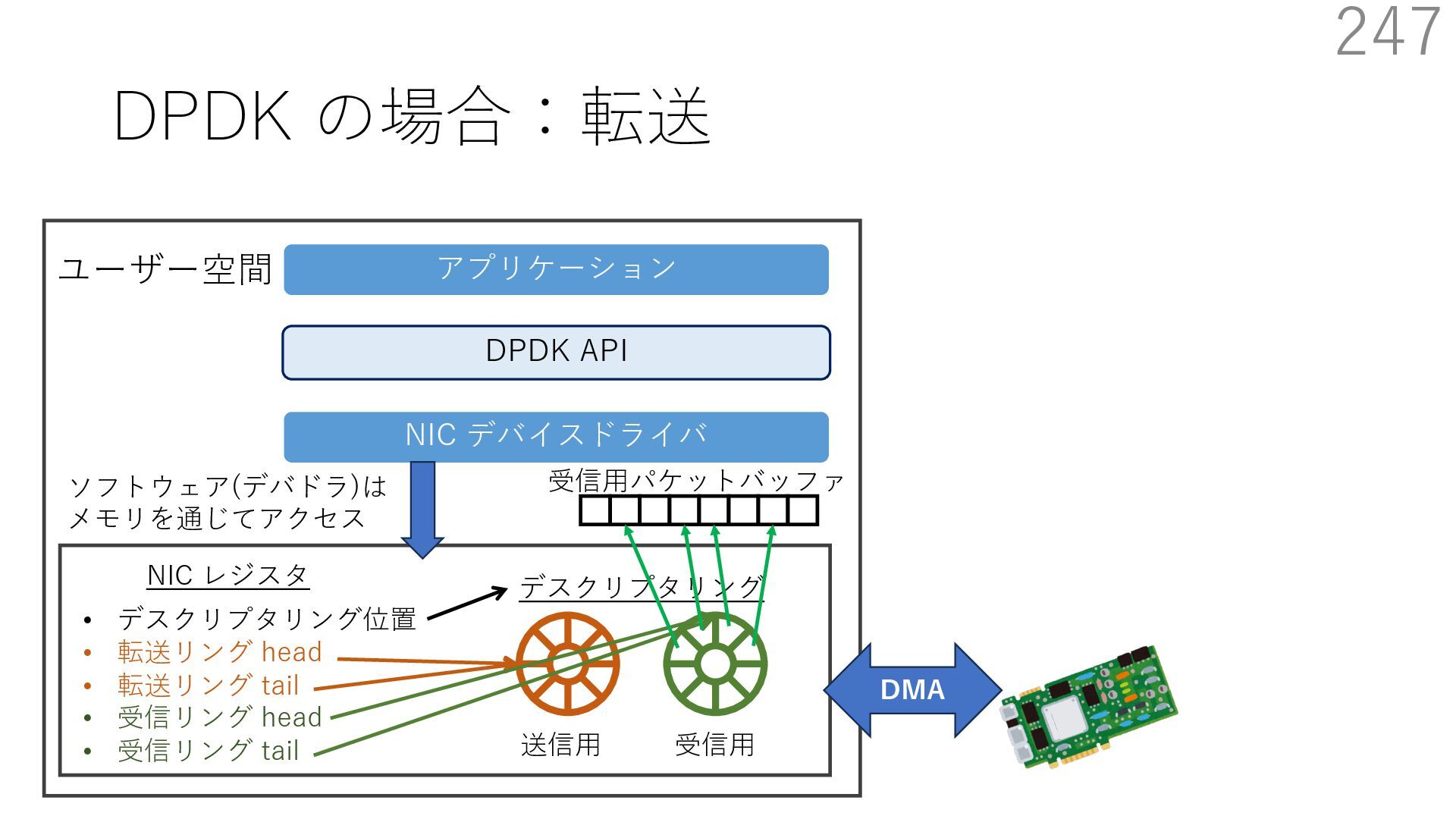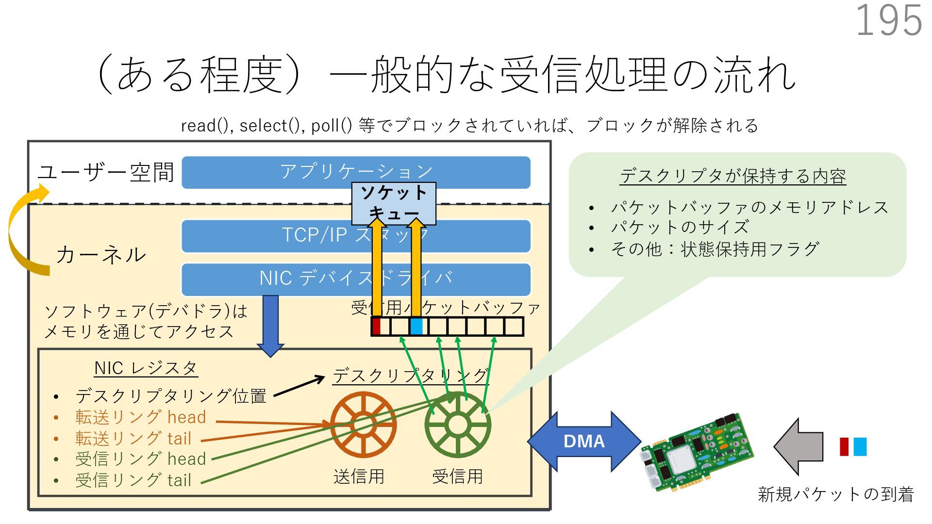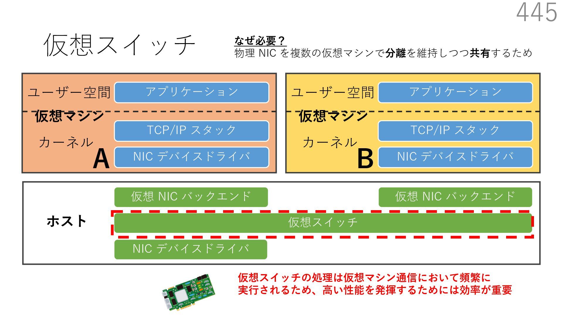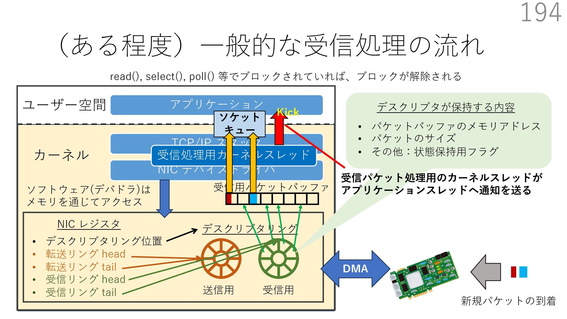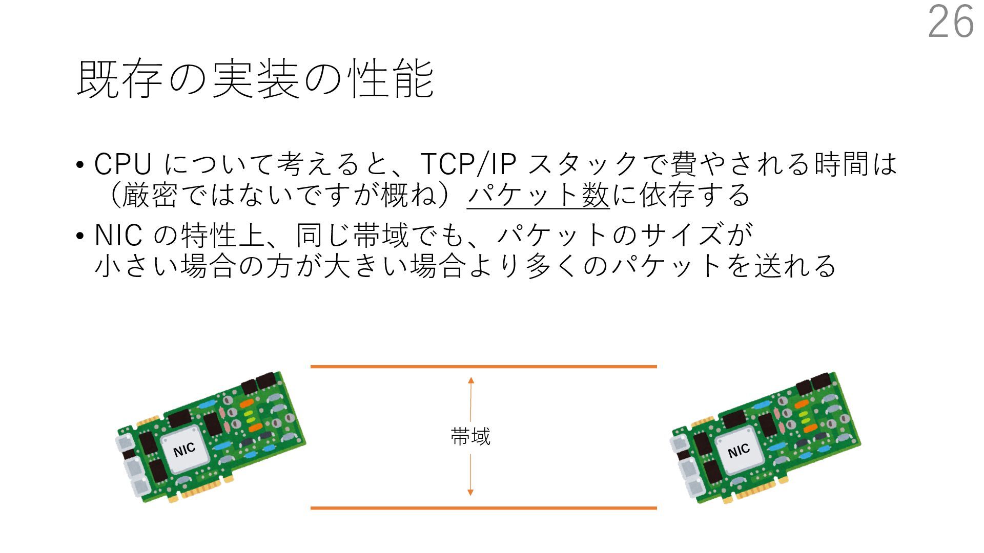 (SIGCOMM 2014) • mTCP (NSDI 2014) • Arrakis (OSDI 2014) • IX (OSDI 2014) • StackMap (USENIX ATC 2016) • Atlas (SIGCOMM 2017) • ZygOS (SOSP 2017) • Shenango (NSDI 2019) • Shinjuku (NSDI 2019) • TAS (EuroSys 2019) • Caladan (OSDI 2020) • Demikernel (SOSP 2021) 427 into a single library for both devices (e.g., RDMAxSPDK). We implemented the bulk of our library OS code in Rust. We initially prototyped several libOSes in C++; however, we found that Rust performs competitively with C++ and achieves ns-scale latencies while offering additional benefits. First, Rust enforces memory safety through language fea- tures and its compiler. Though our libOSes use unsafe code to bind to C/C++ kernel-bypass libraries and applications, User-space Software Kernel-space Software I/O Hardware I/O Device ??? libFuture ??? DPDK User I/O Buf. Mgmt libRDMA RDMA User I/O Buf. Mgmt Net. Trans. OS Kernel Control Path Demikernel Datapath Architecture App libPOSIX libDPDK SPDK User I/O Buf. Mgmt libSPDK Future Demikernel PDPIX Datapath API Figure 3. Demikernel kernel-bypass architecture. Demikernel ac- commodates heterogenous kernel-bypass devices, including poten- tial future hardware, with a flexible library OS-based datapath ar- chitecture.We include a libOS that goes through the OS kernel for 提案:異なるタイプのデバイスへ 共通のインターフェースからアクセス可能にする Irene Zhang, Amanda Raybuck, Pratyush Patel, Kirk Olynyk, Jacob Nelson, Omar S. Navarro Leija, Ashlie Martinez, Jing Liu, Anna Kornfeld Simpson, Sujay Jayakar, Pedro Henrique Penna, Max Demoulin, Piali Choudhury, and Anirudh Badam. 2021. The Demikernel Datapath OS Architecture for Microsecond-Scale Datacenter Systems. In Proceedings of the ACM Sigops 28th Symposium on Operating Systems Principles (SOSP ʼ21), 195-211.(https://doi.org/10.1145/3477132.3483569)