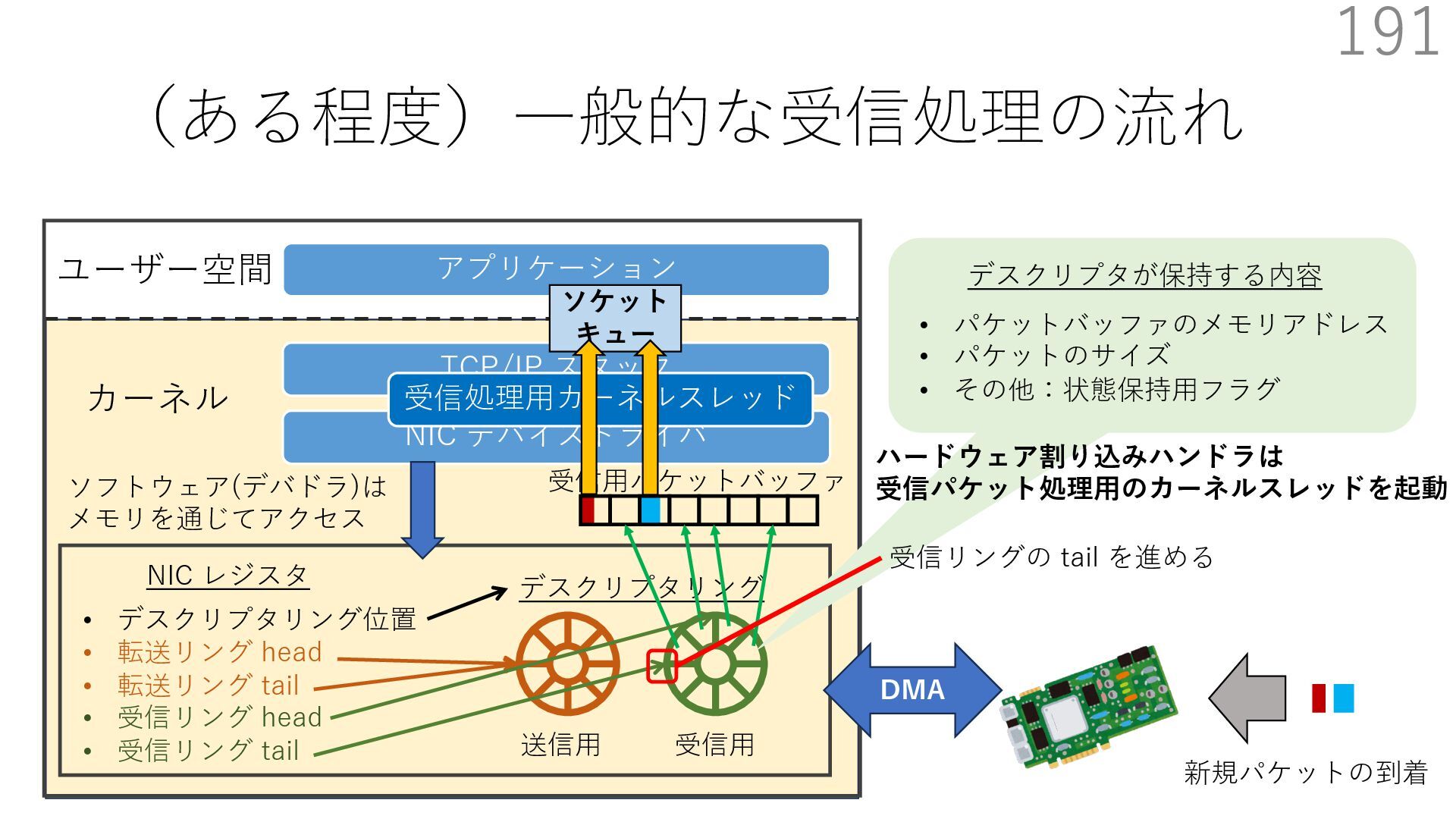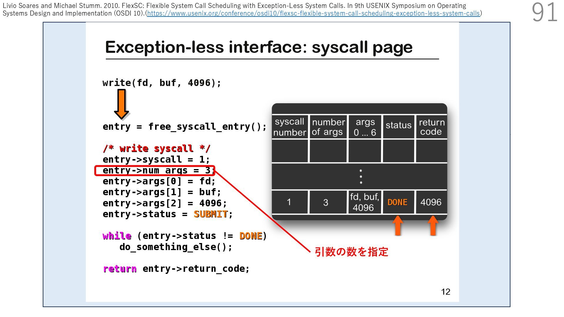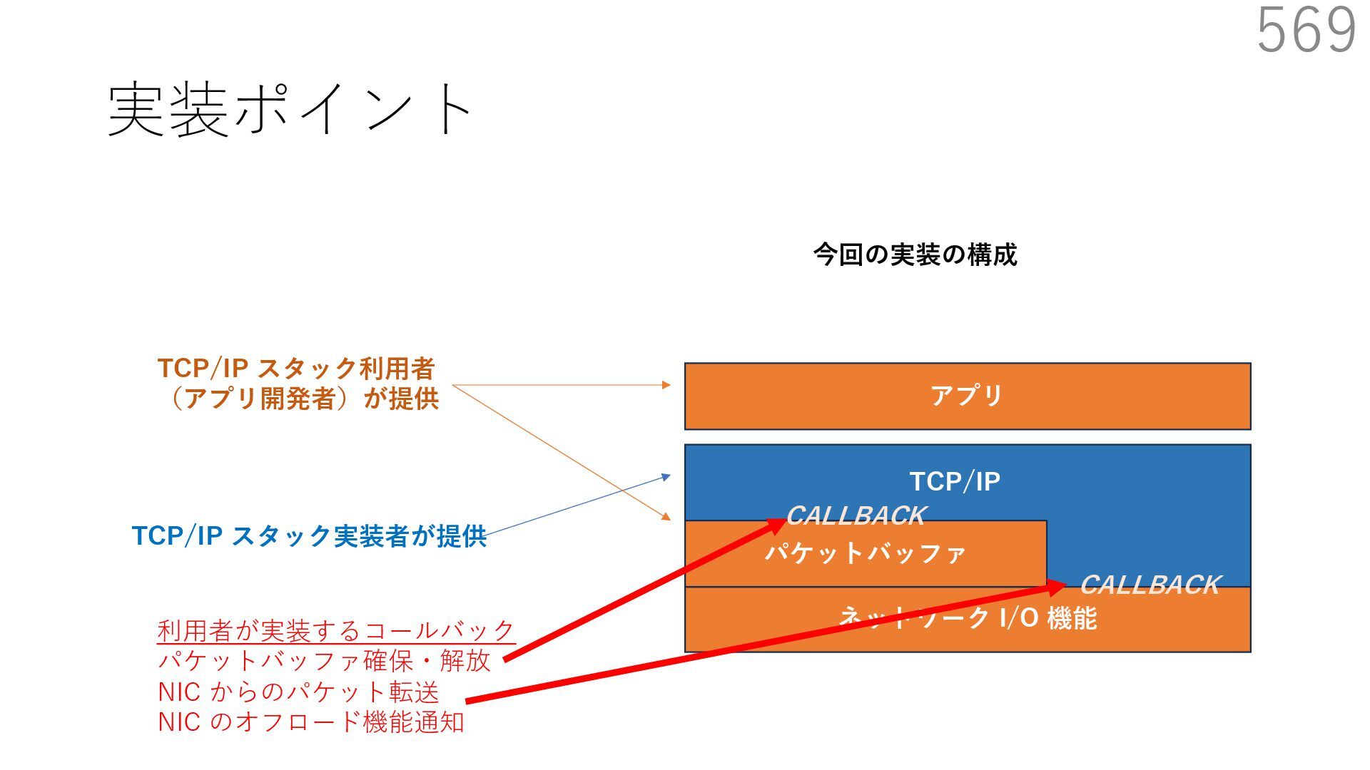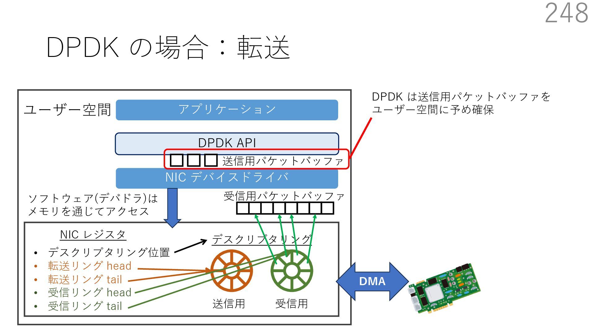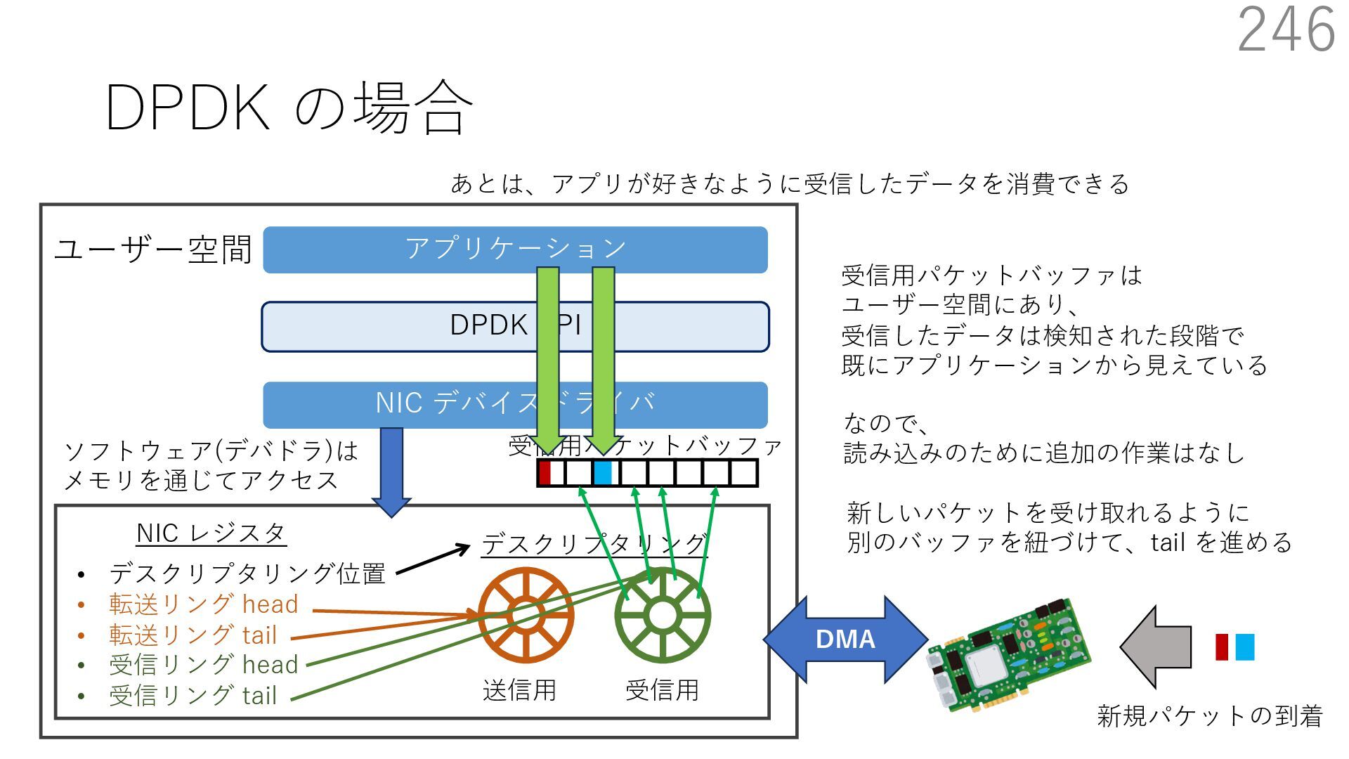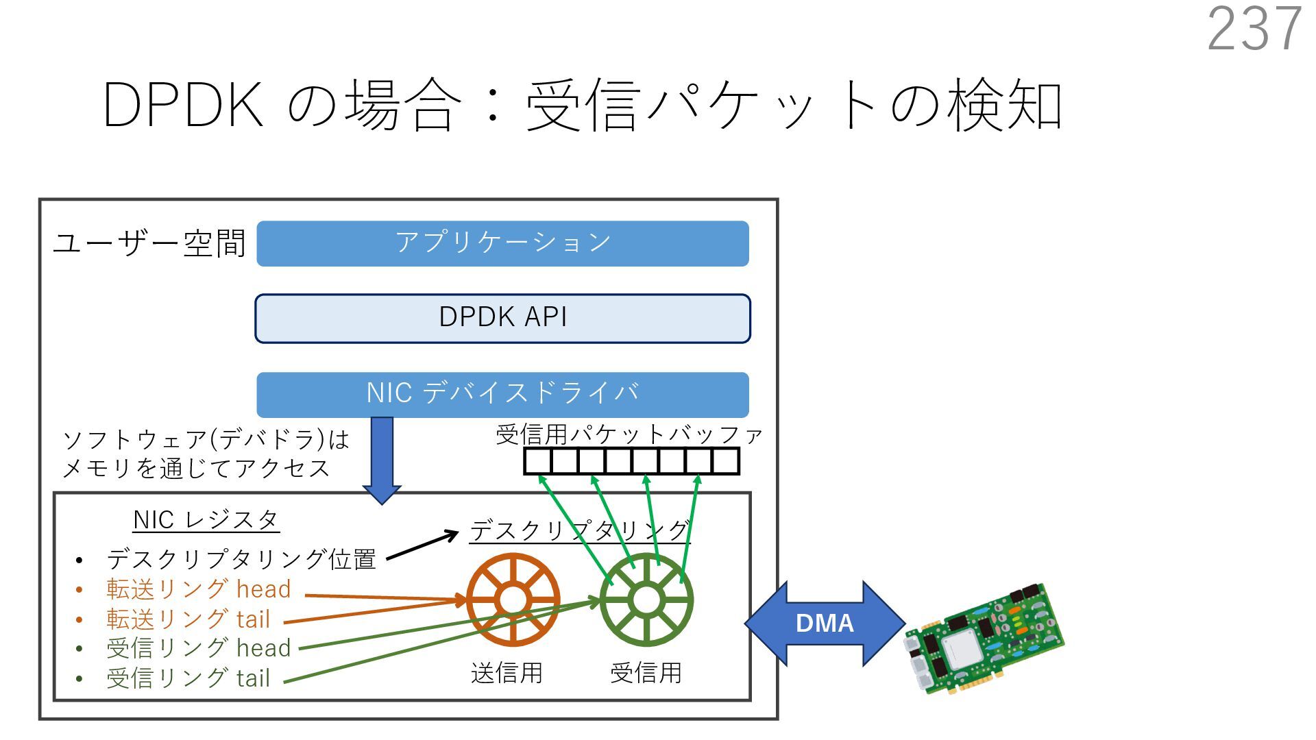 (SIGCOMM 2014) • mTCP (NSDI 2014) • Arrakis (OSDI 2014) • IX (OSDI 2014) • StackMap (USENIX ATC 2016) • Atlas (SIGCOMM 2017) • ZygOS (SOSP 2017) • Shenango (NSDI 2019) • Shinjuku (NSDI 2019) • TAS (EuroSys 2019) • Caladan (OSDI 2020) • Demikernel (SOSP 2021) 427 into a single library for both devices (e.g., RDMAxSPDK). We implemented the bulk of our library OS code in Rust. We initially prototyped several libOSes in C++; however, we found that Rust performs competitively with C++ and achieves ns-scale latencies while offering additional benefits. First, Rust enforces memory safety through language fea- tures and its compiler. Though our libOSes use unsafe code to bind to C/C++ kernel-bypass libraries and applications, User-space Software Kernel-space Software I/O Hardware I/O Device ??? libFuture ??? DPDK User I/O Buf. Mgmt libRDMA RDMA User I/O Buf. Mgmt Net. Trans. OS Kernel Control Path Demikernel Datapath Architecture App libPOSIX libDPDK SPDK User I/O Buf. Mgmt libSPDK Future Demikernel PDPIX Datapath API Figure 3. Demikernel kernel-bypass architecture. Demikernel ac- commodates heterogenous kernel-bypass devices, including poten- tial future hardware, with a flexible library OS-based datapath ar- chitecture.We include a libOS that goes through the OS kernel for 提案:異なるタイプのデバイスへ 共通のインターフェースからアクセス可能にする Irene Zhang, Amanda Raybuck, Pratyush Patel, Kirk Olynyk, Jacob Nelson, Omar S. Navarro Leija, Ashlie Martinez, Jing Liu, Anna Kornfeld Simpson, Sujay Jayakar, Pedro Henrique Penna, Max Demoulin, Piali Choudhury, and Anirudh Badam. 2021. The Demikernel Datapath OS Architecture for Microsecond-Scale Datacenter Systems. In Proceedings of the ACM Sigops 28th Symposium on Operating Systems Principles (SOSP ʼ21), 195-211.(https://doi.org/10.1145/3477132.3483569)