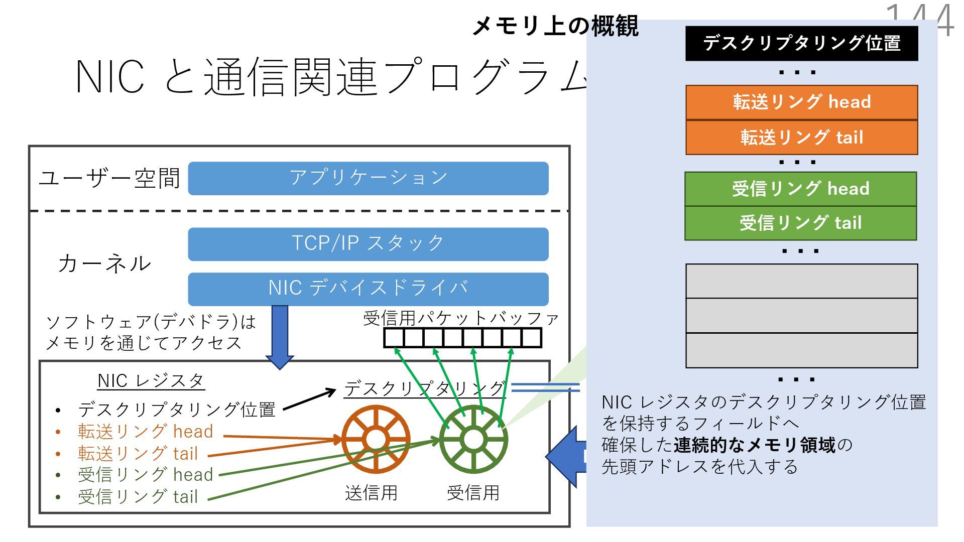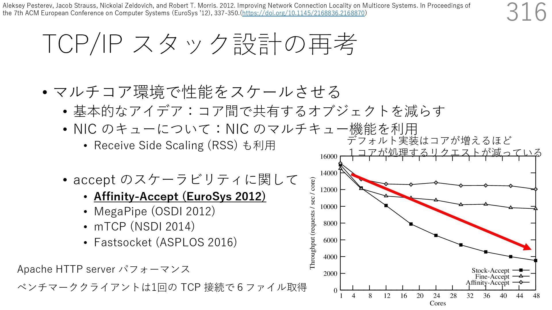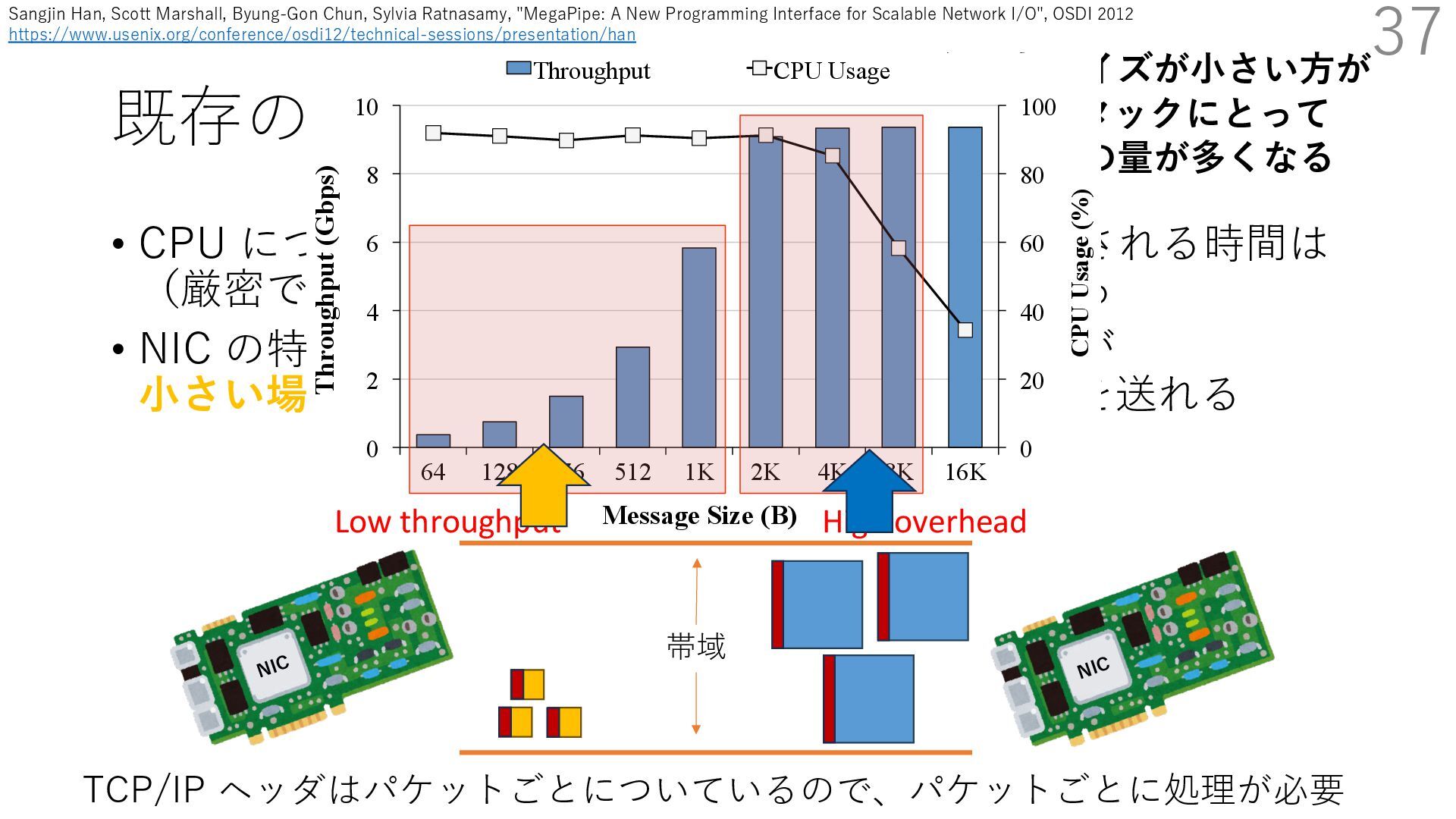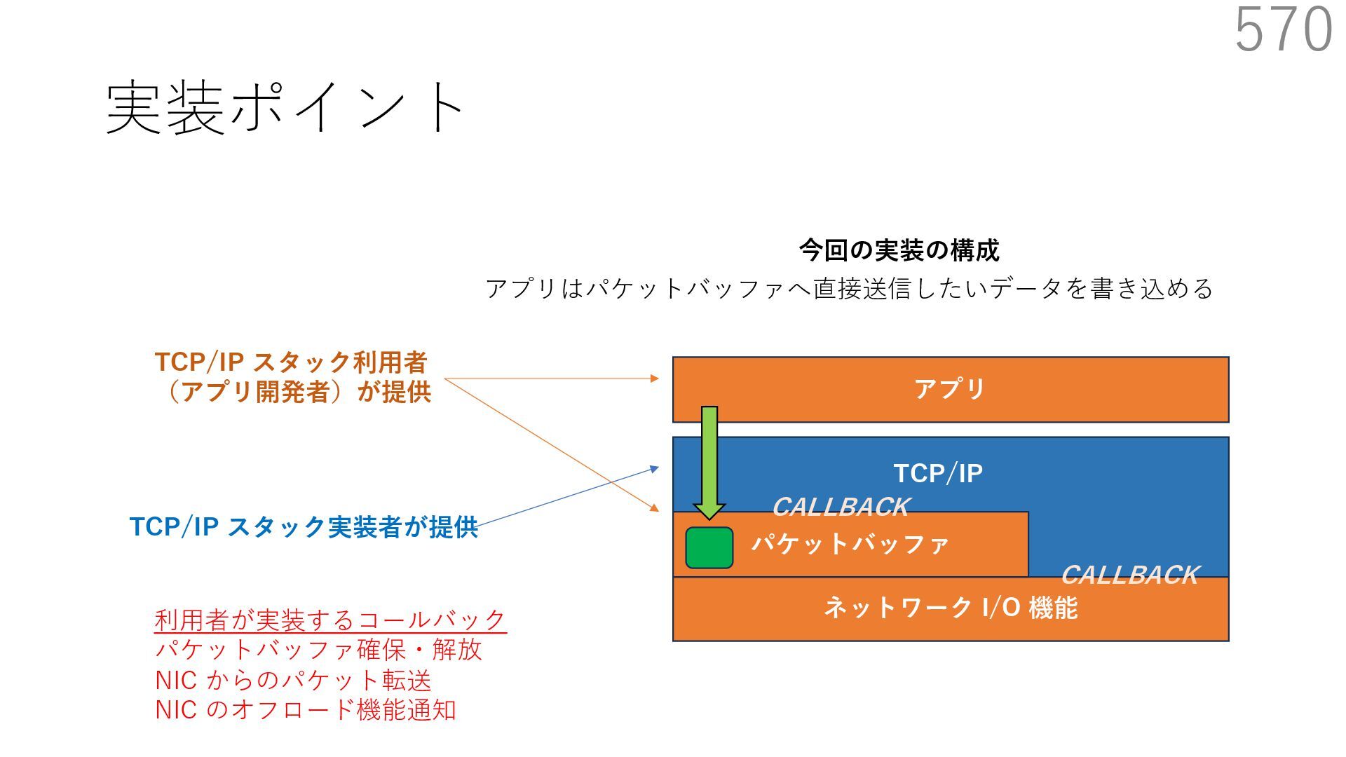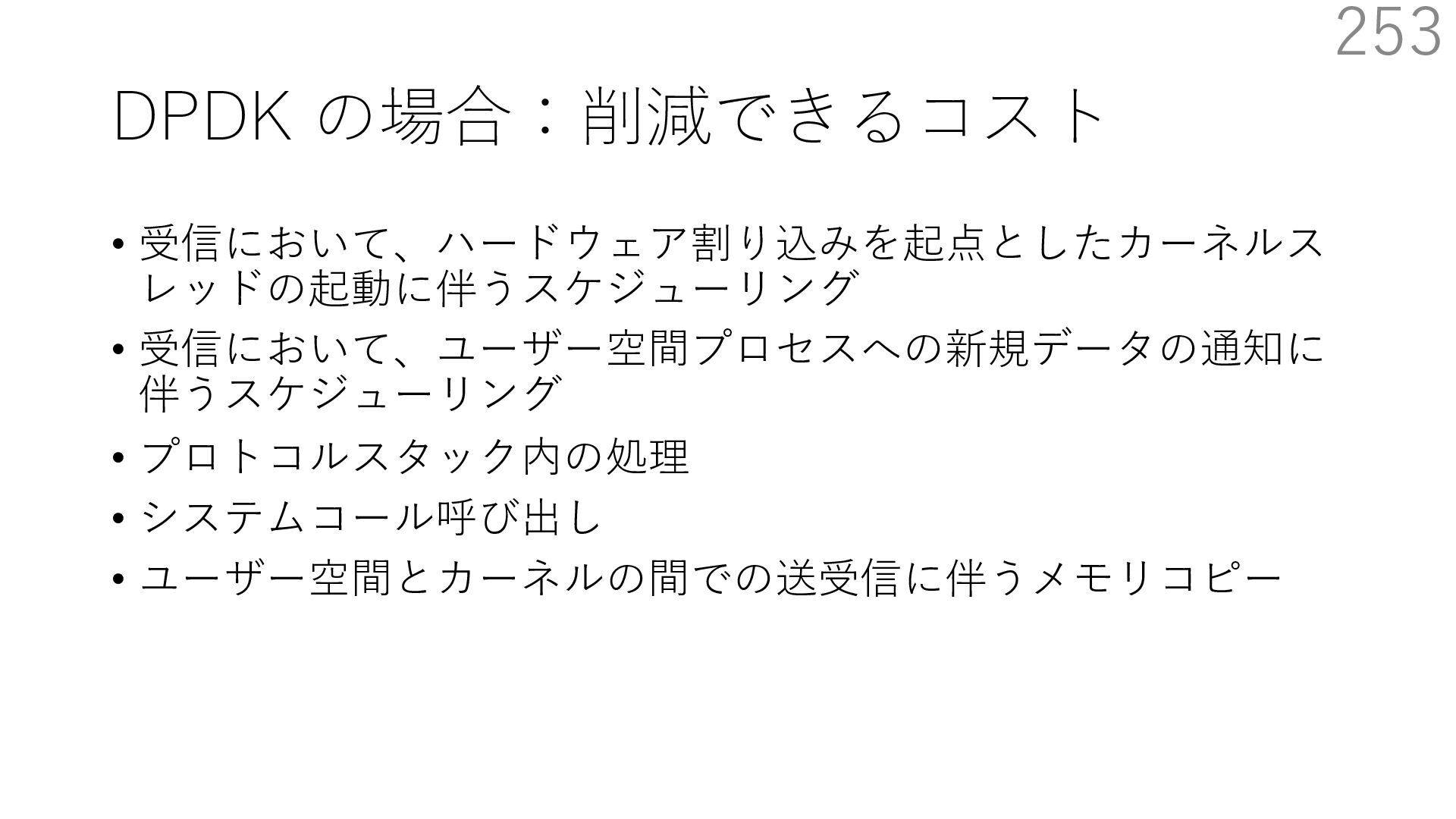 (SIGCOMM 2014) • mTCP (NSDI 2014) • Arrakis (OSDI 2014) • IX (OSDI 2014) • StackMap (USENIX ATC 2016) • Atlas (SIGCOMM 2017) • ZygOS (SOSP 2017) • Shenango (NSDI 2019) • Shinjuku (NSDI 2019) • TAS (EuroSys 2019) • Caladan (OSDI 2020) • Demikernel (SOSP 2021) 427 into a single library for both devices (e.g., RDMAxSPDK). We implemented the bulk of our library OS code in Rust. We initially prototyped several libOSes in C++; however, we found that Rust performs competitively with C++ and achieves ns-scale latencies while offering additional benefits. First, Rust enforces memory safety through language fea- tures and its compiler. Though our libOSes use unsafe code to bind to C/C++ kernel-bypass libraries and applications, User-space Software Kernel-space Software I/O Hardware I/O Device ??? libFuture ??? DPDK User I/O Buf. Mgmt libRDMA RDMA User I/O Buf. Mgmt Net. Trans. OS Kernel Control Path Demikernel Datapath Architecture App libPOSIX libDPDK SPDK User I/O Buf. Mgmt libSPDK Future Demikernel PDPIX Datapath API Figure 3. Demikernel kernel-bypass architecture. Demikernel ac- commodates heterogenous kernel-bypass devices, including poten- tial future hardware, with a flexible library OS-based datapath ar- chitecture.We include a libOS that goes through the OS kernel for 提案:異なるタイプのデバイスへ 共通のインターフェースからアクセス可能にする Irene Zhang, Amanda Raybuck, Pratyush Patel, Kirk Olynyk, Jacob Nelson, Omar S. Navarro Leija, Ashlie Martinez, Jing Liu, Anna Kornfeld Simpson, Sujay Jayakar, Pedro Henrique Penna, Max Demoulin, Piali Choudhury, and Anirudh Badam. 2021. The Demikernel Datapath OS Architecture for Microsecond-Scale Datacenter Systems. In Proceedings of the ACM Sigops 28th Symposium on Operating Systems Principles (SOSP ʼ21), 195-211.(https://doi.org/10.1145/3477132.3483569)