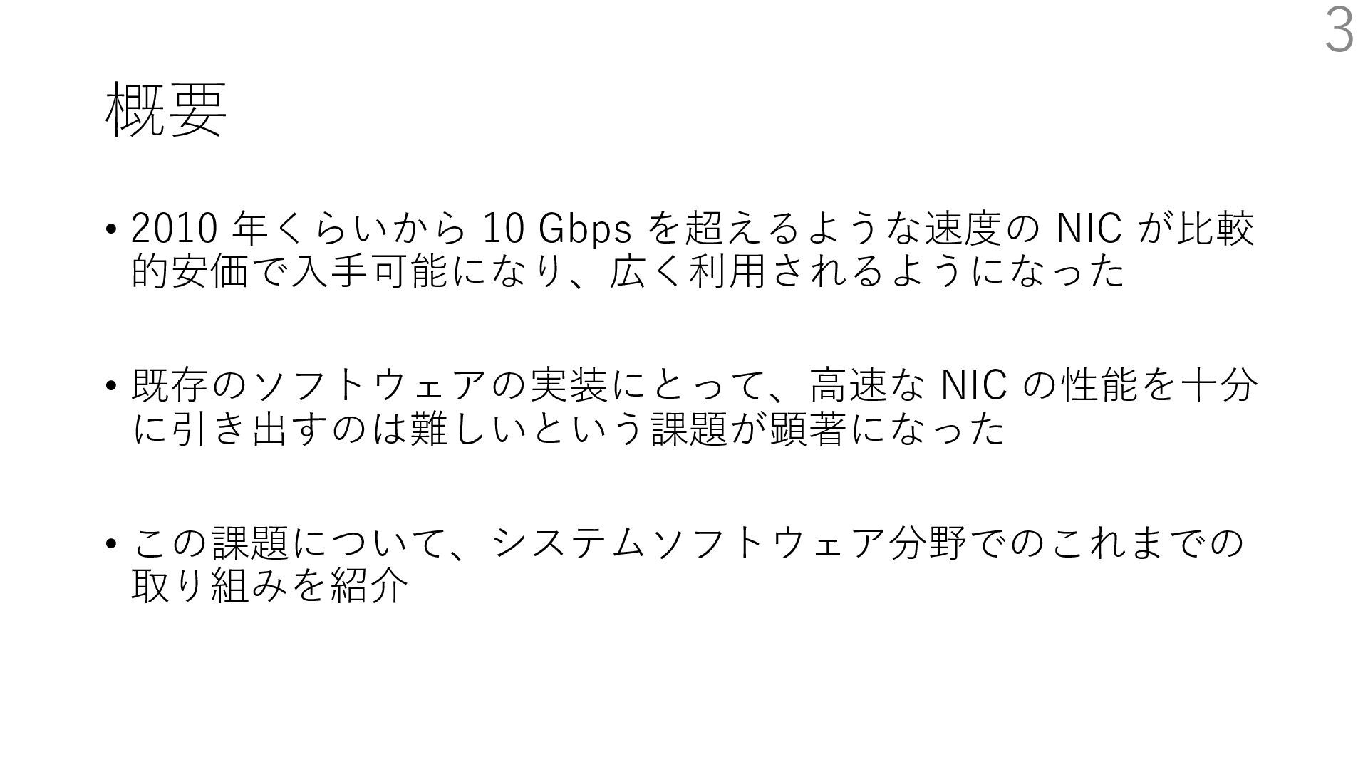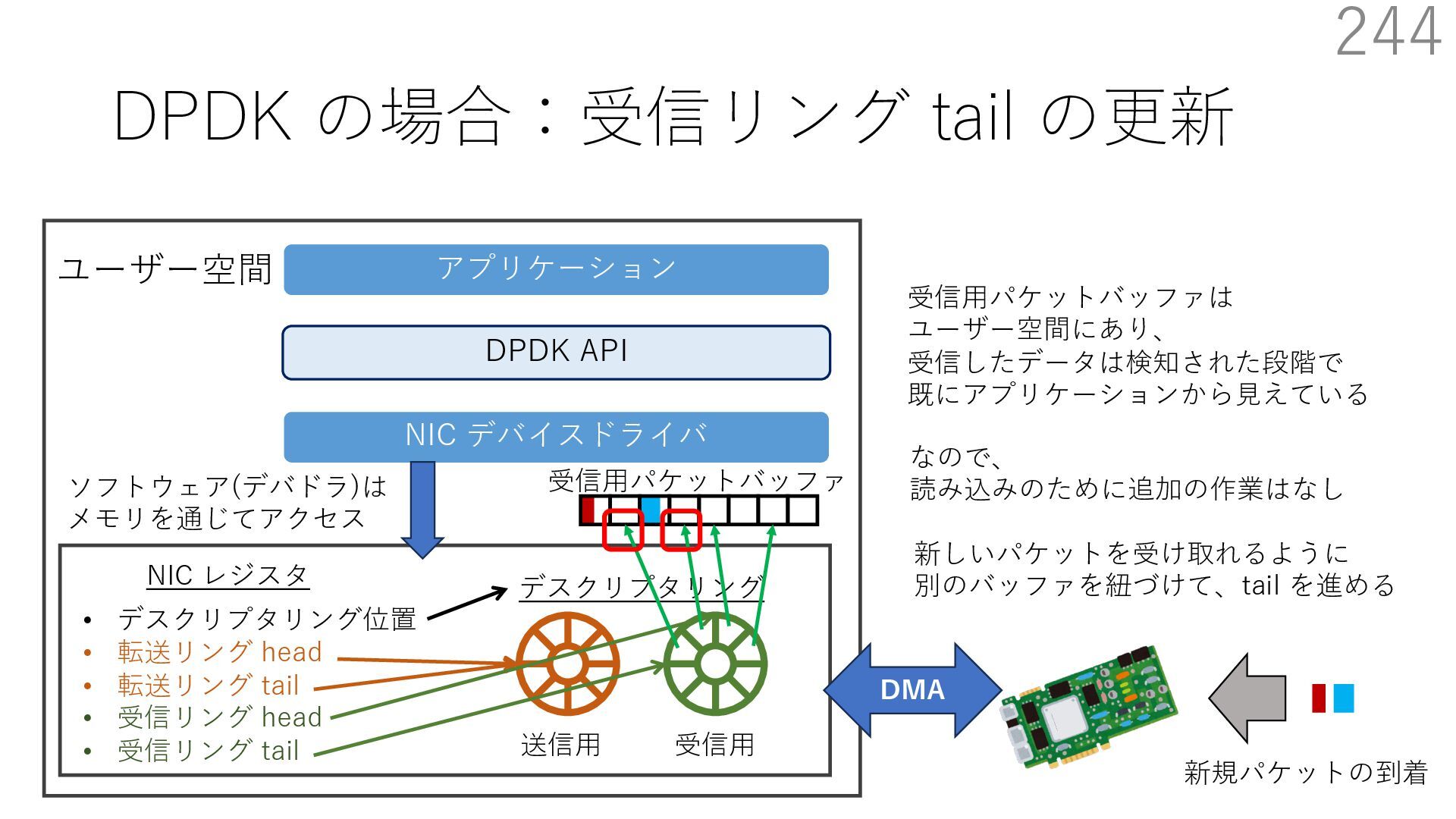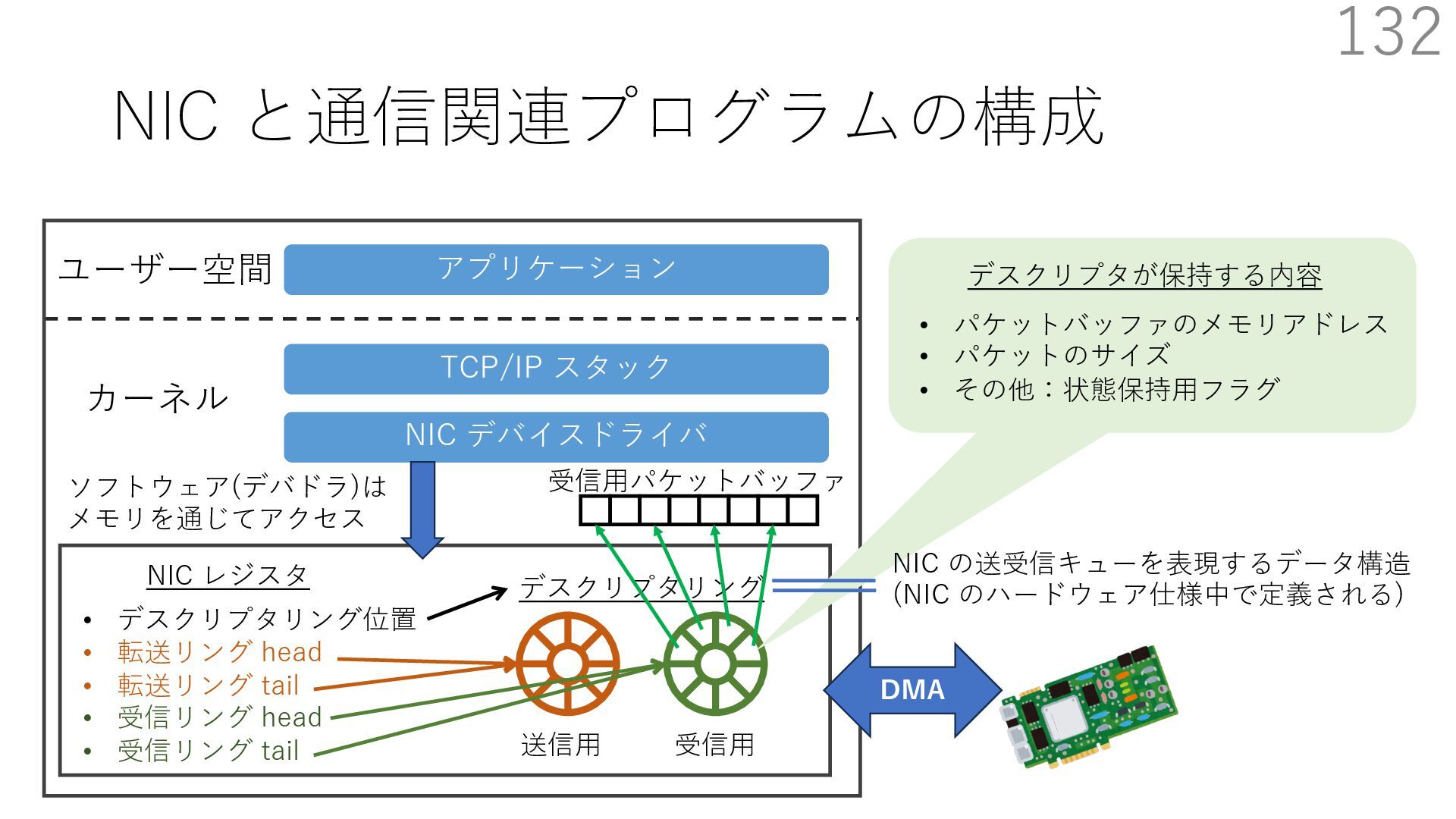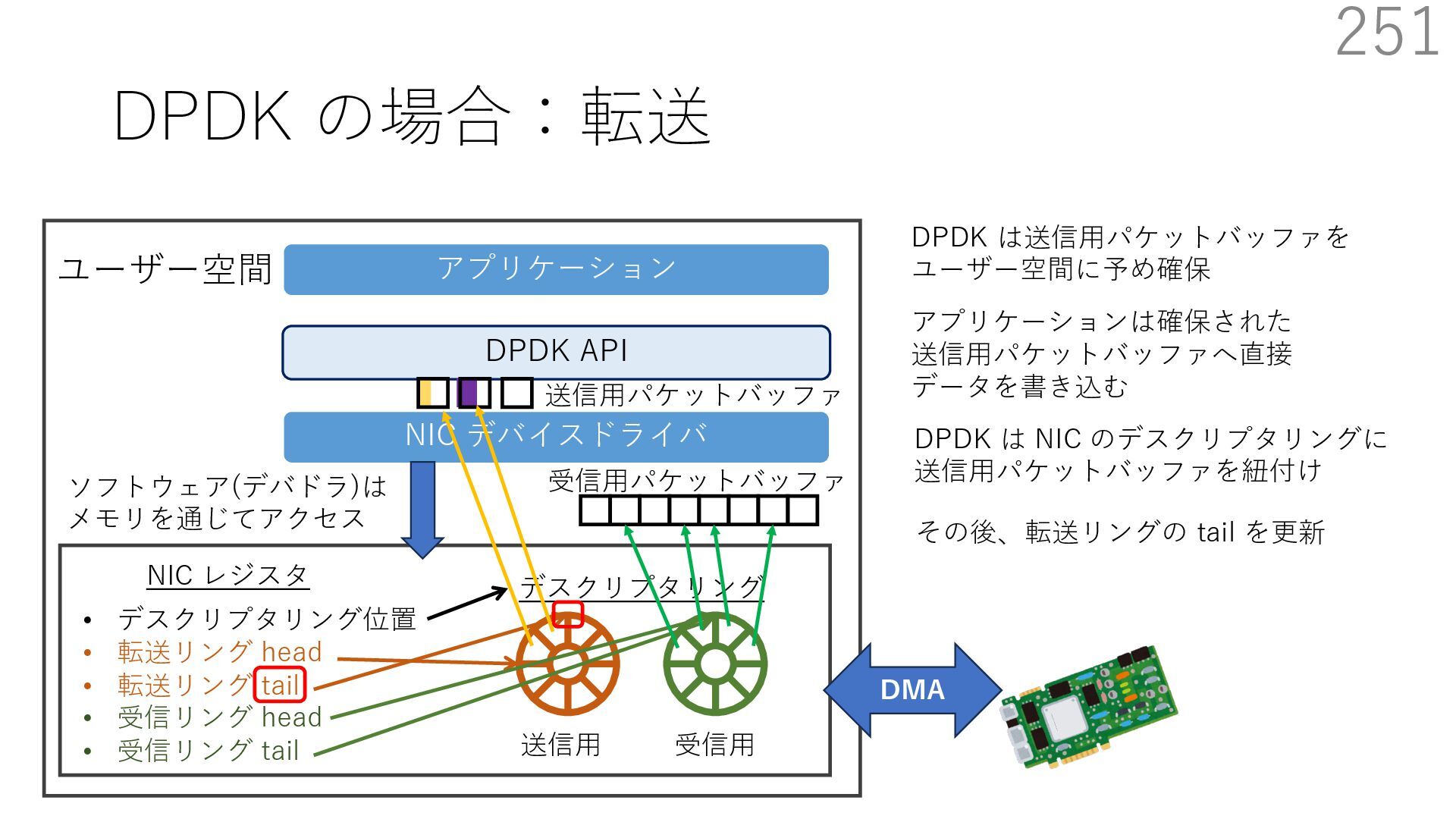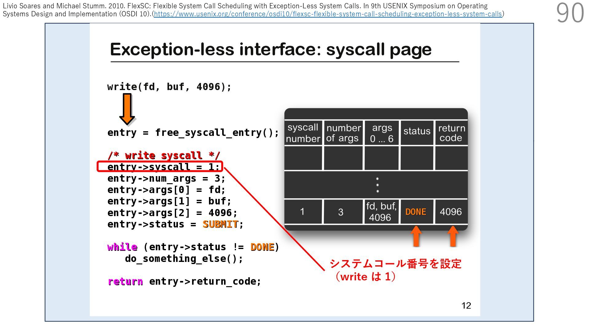 (SIGCOMM 2014) • mTCP (NSDI 2014) • Arrakis (OSDI 2014) • IX (OSDI 2014) • StackMap (USENIX ATC 2016) • Atlas (SIGCOMM 2017) • ZygOS (SOSP 2017) • Shenango (NSDI 2019) • Shinjuku (NSDI 2019) • TAS (EuroSys 2019) • Caladan (OSDI 2020) • Demikernel (SOSP 2021) 427 into a single library for both devices (e.g., RDMAxSPDK). We implemented the bulk of our library OS code in Rust. We initially prototyped several libOSes in C++; however, we found that Rust performs competitively with C++ and achieves ns-scale latencies while offering additional benefits. First, Rust enforces memory safety through language fea- tures and its compiler. Though our libOSes use unsafe code to bind to C/C++ kernel-bypass libraries and applications, User-space Software Kernel-space Software I/O Hardware I/O Device ??? libFuture ??? DPDK User I/O Buf. Mgmt libRDMA RDMA User I/O Buf. Mgmt Net. Trans. OS Kernel Control Path Demikernel Datapath Architecture App libPOSIX libDPDK SPDK User I/O Buf. Mgmt libSPDK Future Demikernel PDPIX Datapath API Figure 3. Demikernel kernel-bypass architecture. Demikernel ac- commodates heterogenous kernel-bypass devices, including poten- tial future hardware, with a flexible library OS-based datapath ar- chitecture.We include a libOS that goes through the OS kernel for 提案:異なるタイプのデバイスへ 共通のインターフェースからアクセス可能にする Irene Zhang, Amanda Raybuck, Pratyush Patel, Kirk Olynyk, Jacob Nelson, Omar S. Navarro Leija, Ashlie Martinez, Jing Liu, Anna Kornfeld Simpson, Sujay Jayakar, Pedro Henrique Penna, Max Demoulin, Piali Choudhury, and Anirudh Badam. 2021. The Demikernel Datapath OS Architecture for Microsecond-Scale Datacenter Systems. In Proceedings of the ACM Sigops 28th Symposium on Operating Systems Principles (SOSP ʼ21), 195-211.(https://doi.org/10.1145/3477132.3483569)