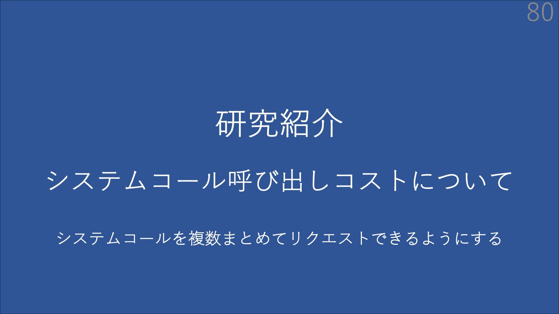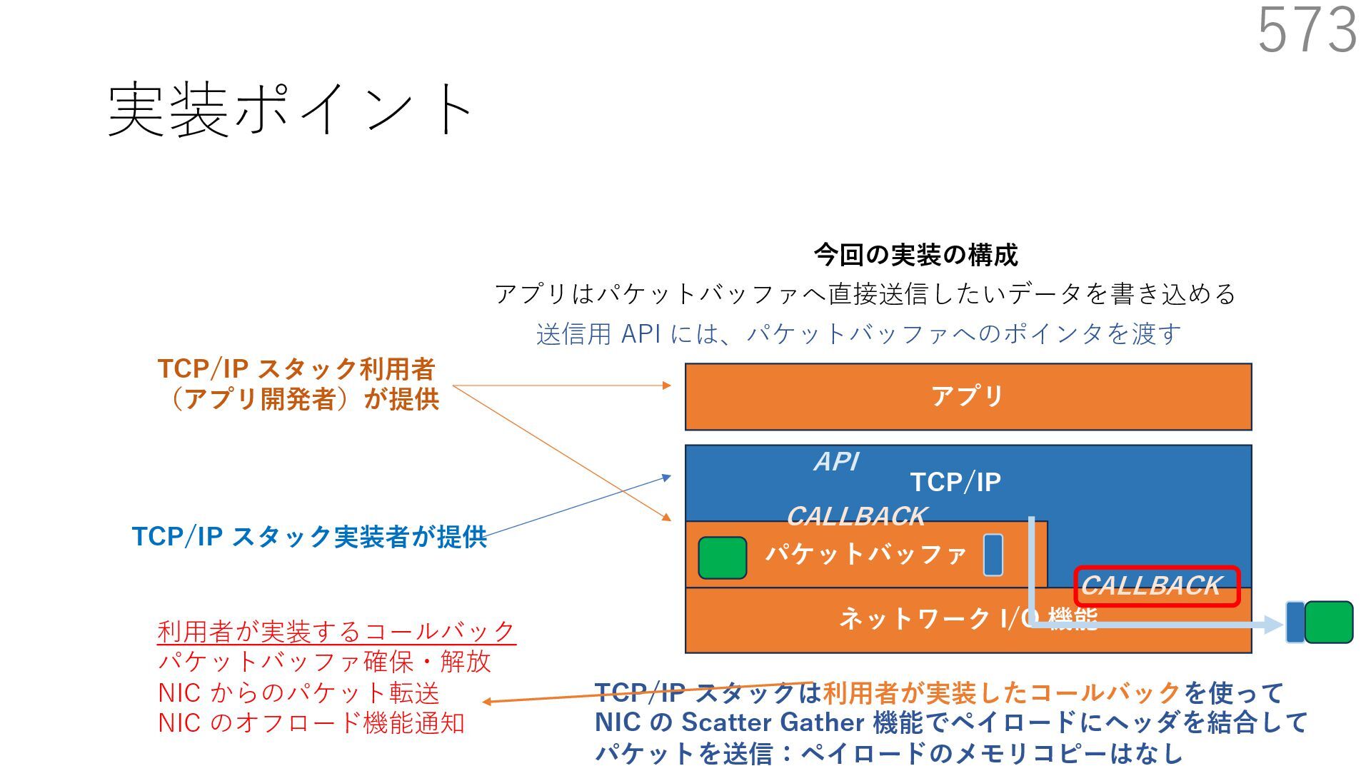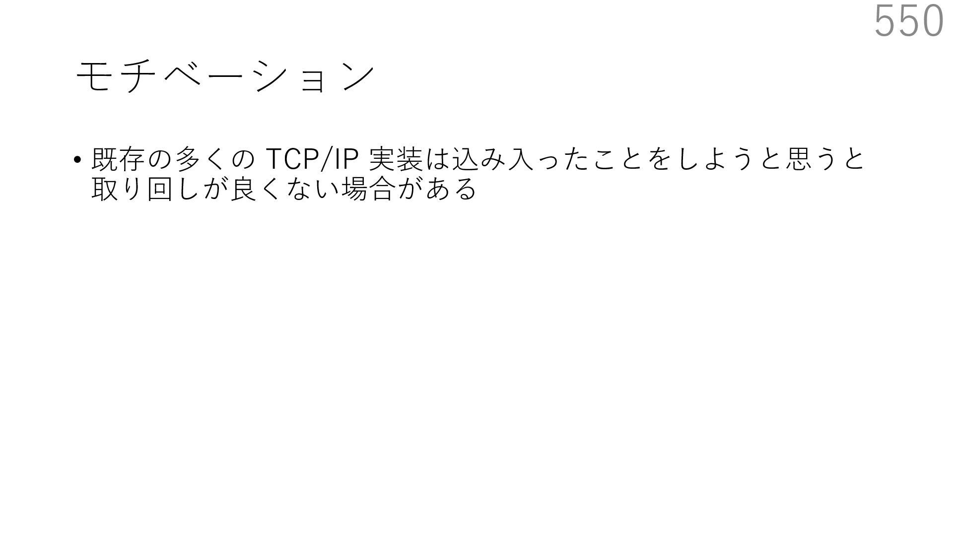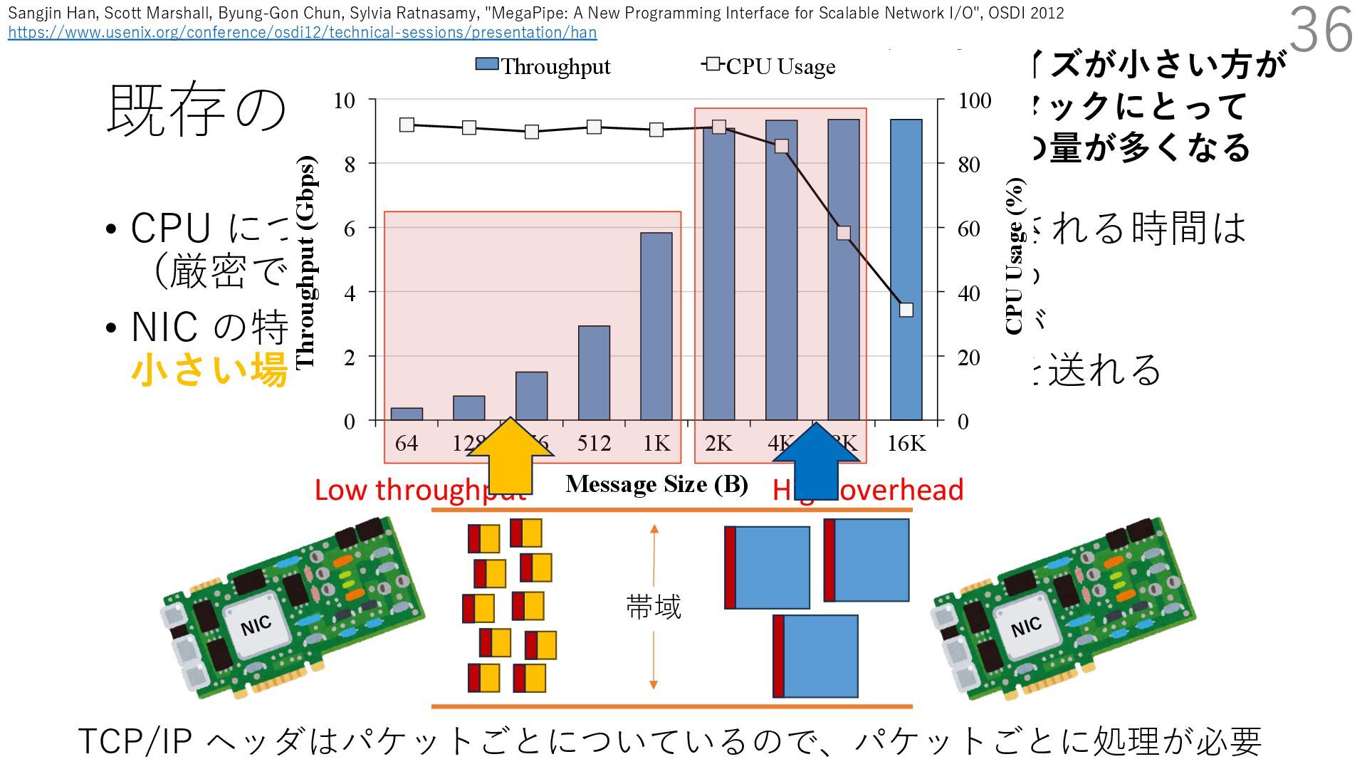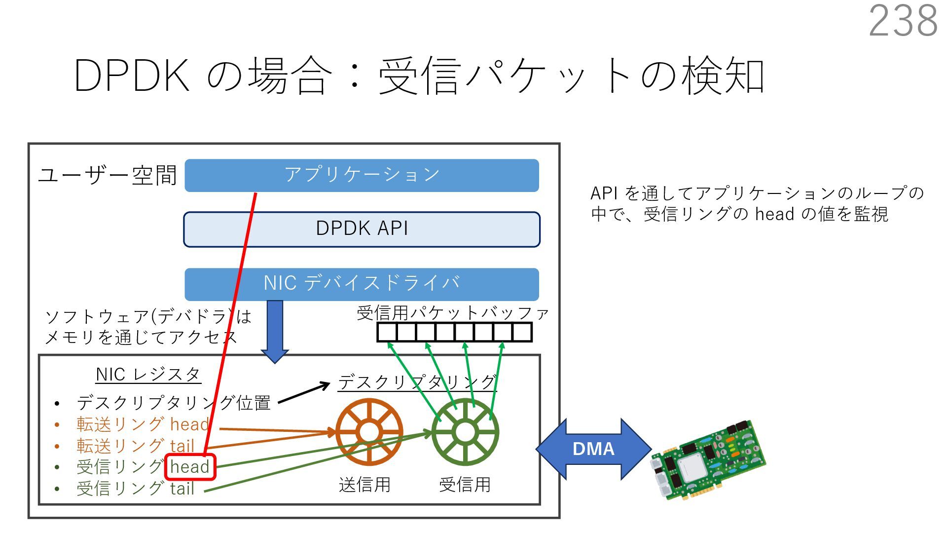 (SIGCOMM 2014) • mTCP (NSDI 2014) • Arrakis (OSDI 2014) • IX (OSDI 2014) • StackMap (USENIX ATC 2016) • Atlas (SIGCOMM 2017) • ZygOS (SOSP 2017) • Shenango (NSDI 2019) • Shinjuku (NSDI 2019) • TAS (EuroSys 2019) • Caladan (OSDI 2020) • Demikernel (SOSP 2021) 427 into a single library for both devices (e.g., RDMAxSPDK). We implemented the bulk of our library OS code in Rust. We initially prototyped several libOSes in C++; however, we found that Rust performs competitively with C++ and achieves ns-scale latencies while offering additional benefits. First, Rust enforces memory safety through language fea- tures and its compiler. Though our libOSes use unsafe code to bind to C/C++ kernel-bypass libraries and applications, User-space Software Kernel-space Software I/O Hardware I/O Device ??? libFuture ??? DPDK User I/O Buf. Mgmt libRDMA RDMA User I/O Buf. Mgmt Net. Trans. OS Kernel Control Path Demikernel Datapath Architecture App libPOSIX libDPDK SPDK User I/O Buf. Mgmt libSPDK Future Demikernel PDPIX Datapath API Figure 3. Demikernel kernel-bypass architecture. Demikernel ac- commodates heterogenous kernel-bypass devices, including poten- tial future hardware, with a flexible library OS-based datapath ar- chitecture.We include a libOS that goes through the OS kernel for 提案:異なるタイプのデバイスへ 共通のインターフェースからアクセス可能にする Irene Zhang, Amanda Raybuck, Pratyush Patel, Kirk Olynyk, Jacob Nelson, Omar S. Navarro Leija, Ashlie Martinez, Jing Liu, Anna Kornfeld Simpson, Sujay Jayakar, Pedro Henrique Penna, Max Demoulin, Piali Choudhury, and Anirudh Badam. 2021. The Demikernel Datapath OS Architecture for Microsecond-Scale Datacenter Systems. In Proceedings of the ACM Sigops 28th Symposium on Operating Systems Principles (SOSP ʼ21), 195-211.(https://doi.org/10.1145/3477132.3483569)