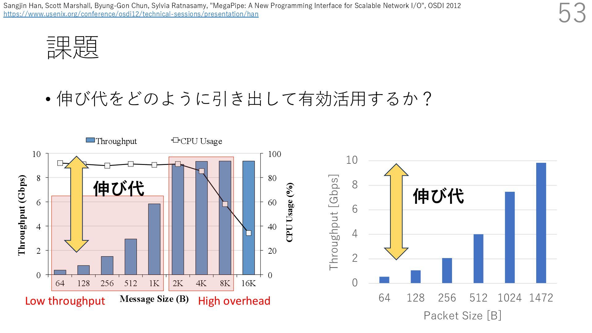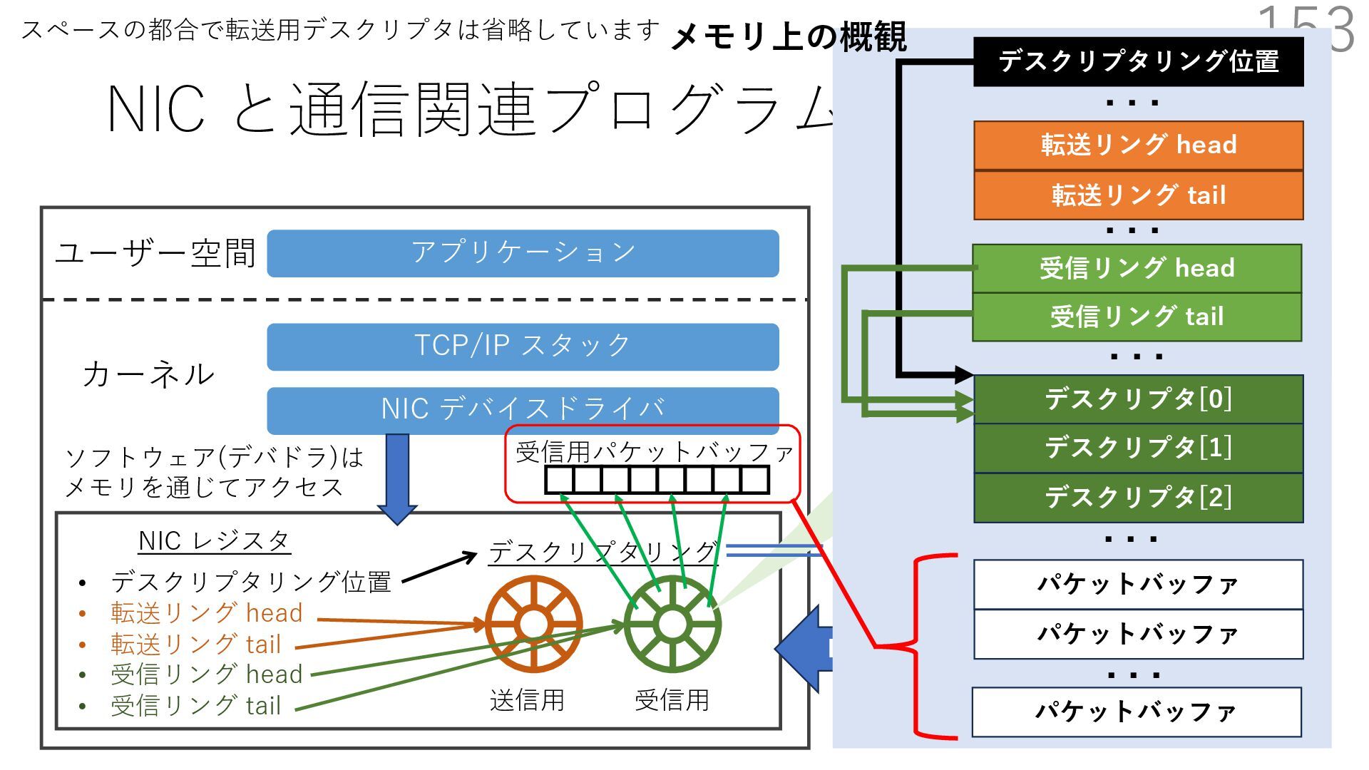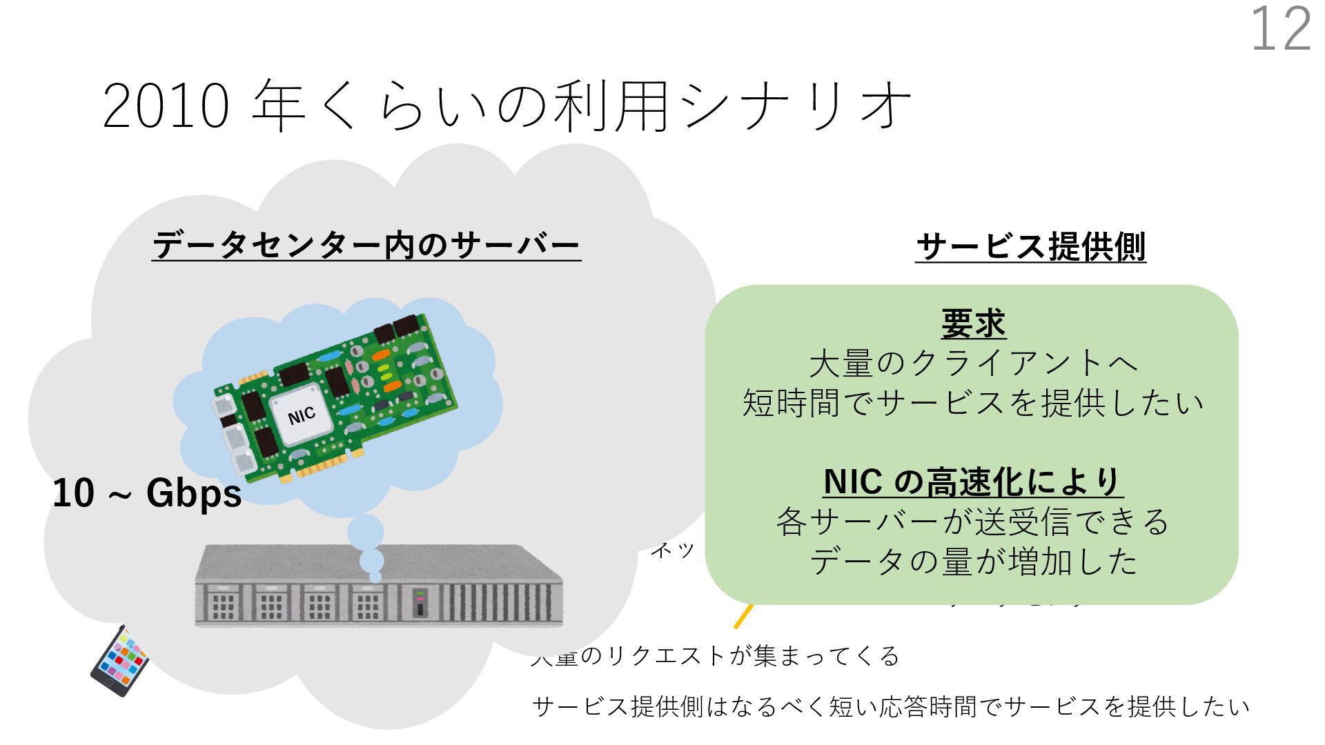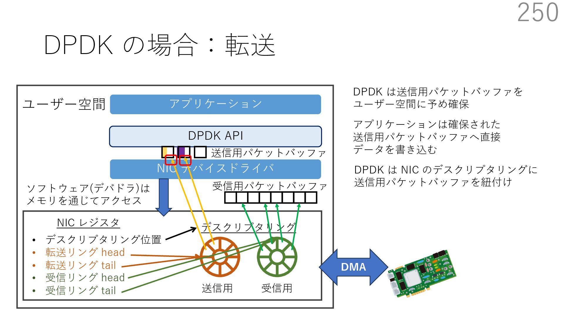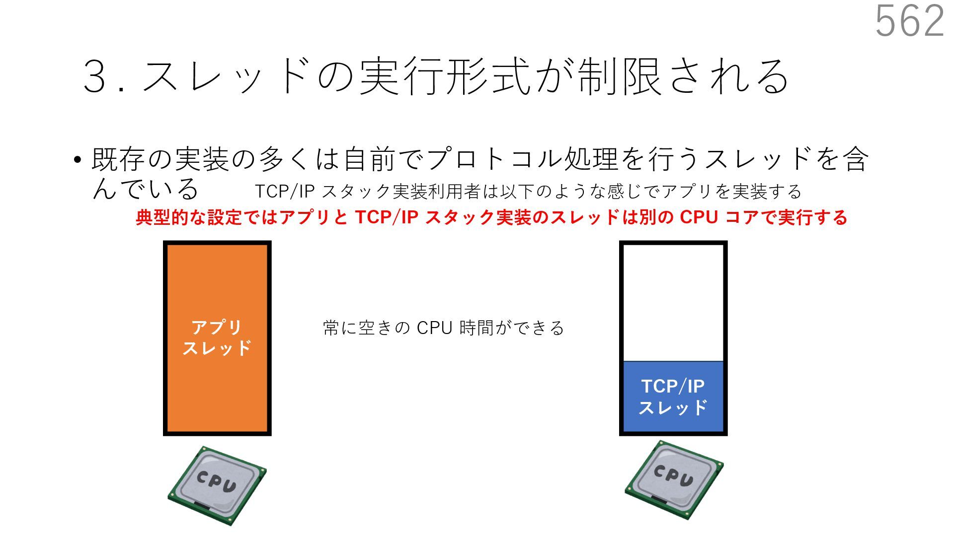 (SIGCOMM 2014) • mTCP (NSDI 2014) • Arrakis (OSDI 2014) • IX (OSDI 2014) • StackMap (USENIX ATC 2016) • Atlas (SIGCOMM 2017) • ZygOS (SOSP 2017) • Shenango (NSDI 2019) • Shinjuku (NSDI 2019) • TAS (EuroSys 2019) • Caladan (OSDI 2020) • Demikernel (SOSP 2021) 427 into a single library for both devices (e.g., RDMAxSPDK). We implemented the bulk of our library OS code in Rust. We initially prototyped several libOSes in C++; however, we found that Rust performs competitively with C++ and achieves ns-scale latencies while offering additional benefits. First, Rust enforces memory safety through language fea- tures and its compiler. Though our libOSes use unsafe code to bind to C/C++ kernel-bypass libraries and applications, User-space Software Kernel-space Software I/O Hardware I/O Device ??? libFuture ??? DPDK User I/O Buf. Mgmt libRDMA RDMA User I/O Buf. Mgmt Net. Trans. OS Kernel Control Path Demikernel Datapath Architecture App libPOSIX libDPDK SPDK User I/O Buf. Mgmt libSPDK Future Demikernel PDPIX Datapath API Figure 3. Demikernel kernel-bypass architecture. Demikernel ac- commodates heterogenous kernel-bypass devices, including poten- tial future hardware, with a flexible library OS-based datapath ar- chitecture.We include a libOS that goes through the OS kernel for 提案:異なるタイプのデバイスへ 共通のインターフェースからアクセス可能にする Irene Zhang, Amanda Raybuck, Pratyush Patel, Kirk Olynyk, Jacob Nelson, Omar S. Navarro Leija, Ashlie Martinez, Jing Liu, Anna Kornfeld Simpson, Sujay Jayakar, Pedro Henrique Penna, Max Demoulin, Piali Choudhury, and Anirudh Badam. 2021. The Demikernel Datapath OS Architecture for Microsecond-Scale Datacenter Systems. In Proceedings of the ACM Sigops 28th Symposium on Operating Systems Principles (SOSP ʼ21), 195-211.(https://doi.org/10.1145/3477132.3483569)