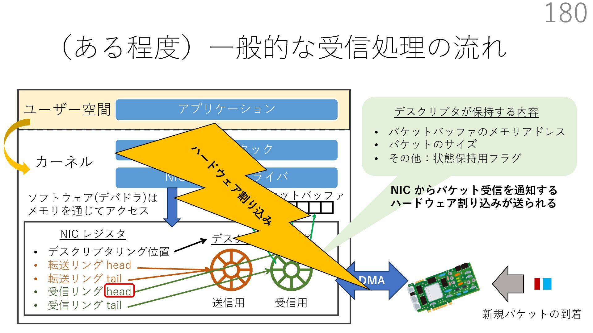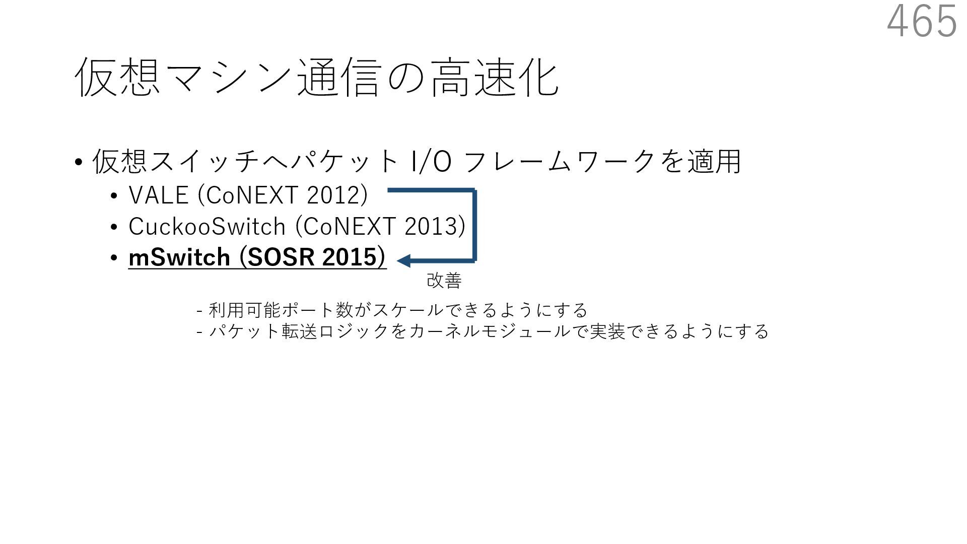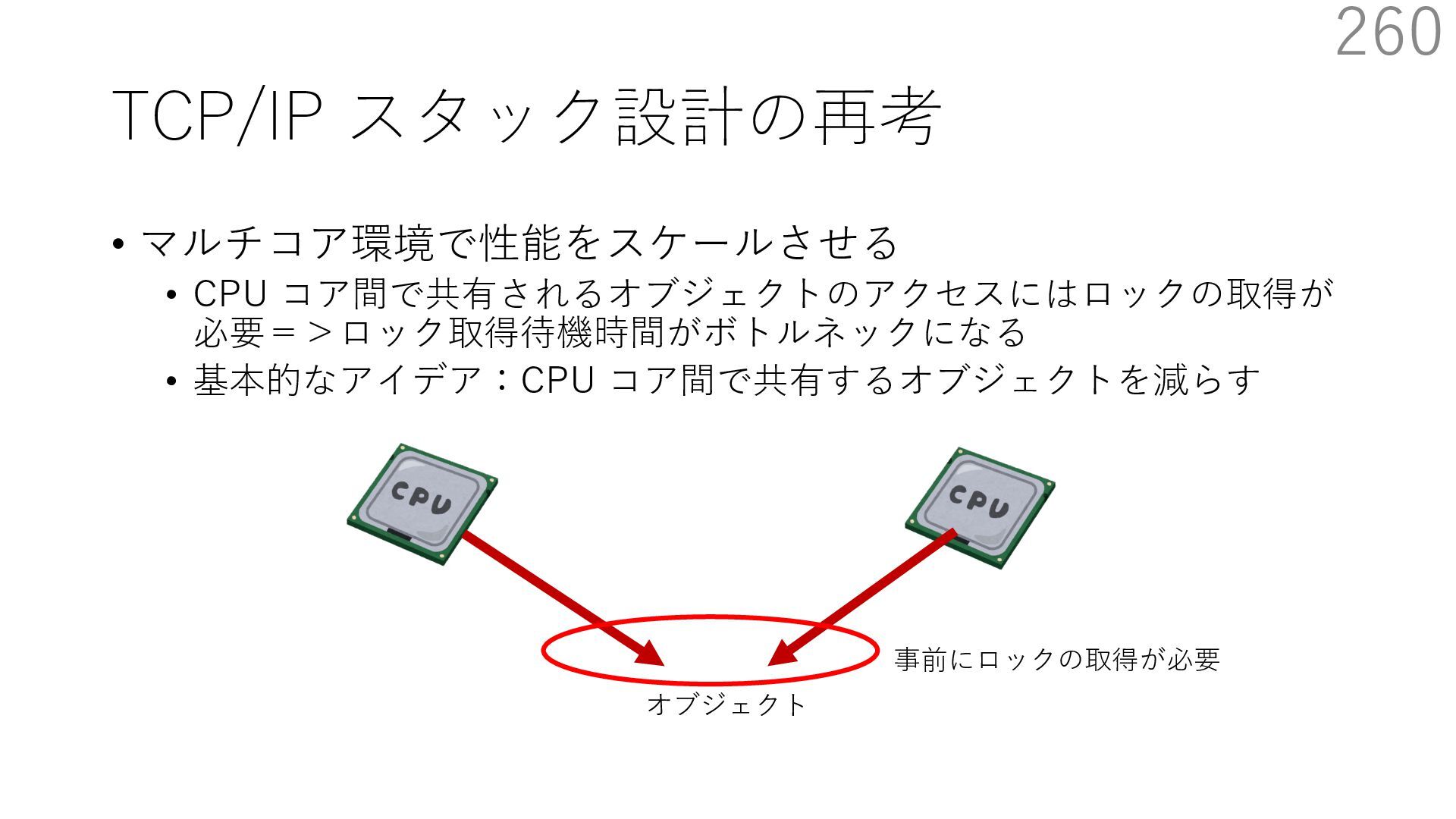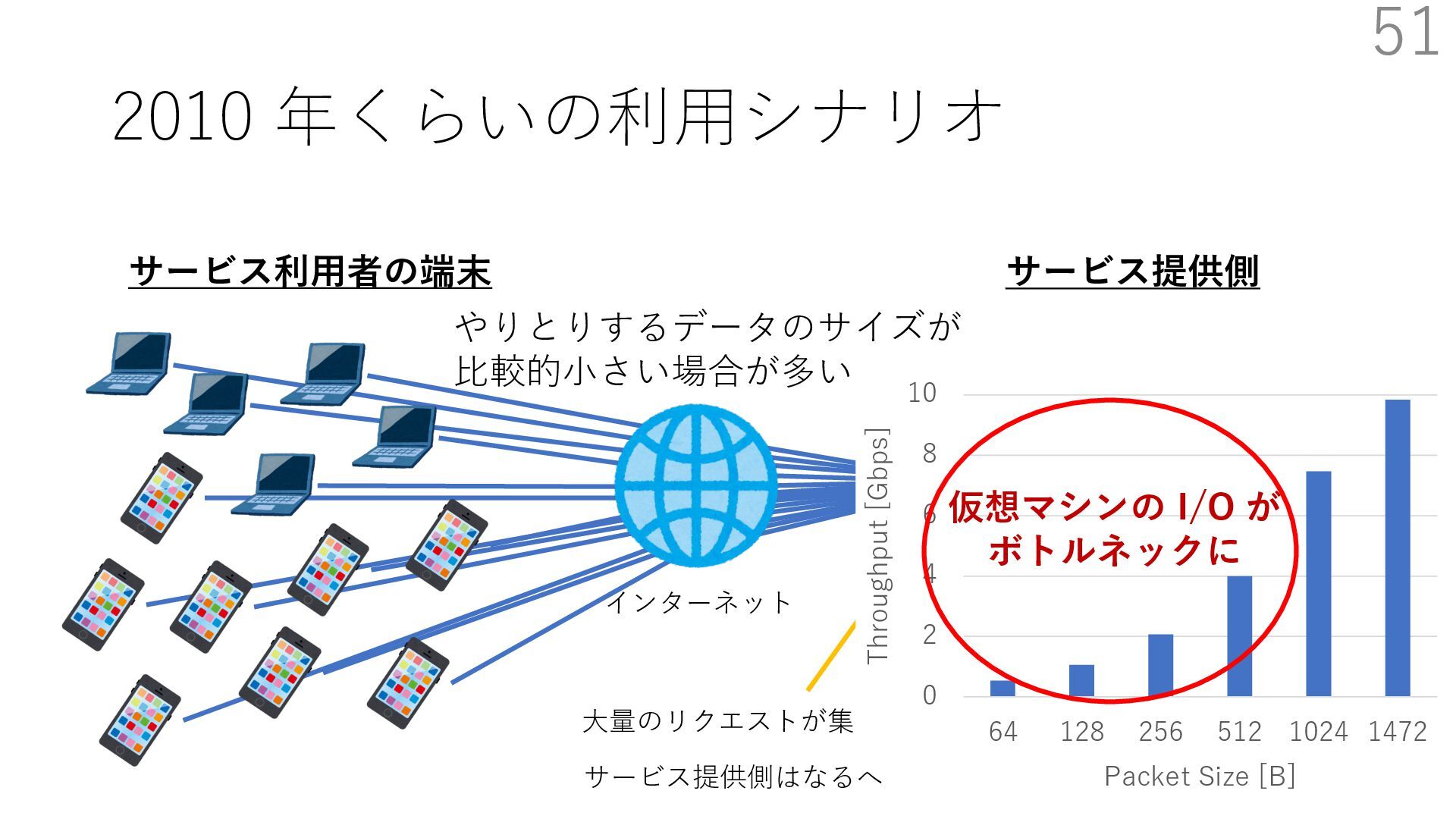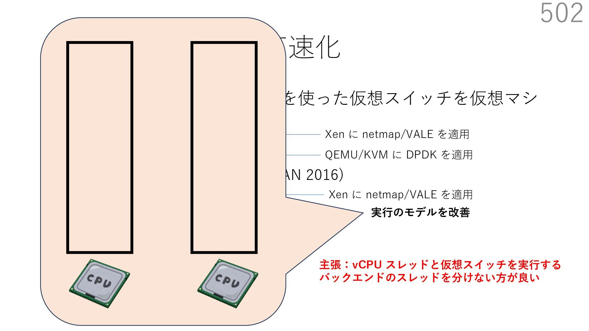 (SIGCOMM 2014) • mTCP (NSDI 2014) • Arrakis (OSDI 2014) • IX (OSDI 2014) • StackMap (USENIX ATC 2016) • Atlas (SIGCOMM 2017) • ZygOS (SOSP 2017) • Shenango (NSDI 2019) • Shinjuku (NSDI 2019) • TAS (EuroSys 2019) • Caladan (OSDI 2020) • Demikernel (SOSP 2021) 427 into a single library for both devices (e.g., RDMAxSPDK). We implemented the bulk of our library OS code in Rust. We initially prototyped several libOSes in C++; however, we found that Rust performs competitively with C++ and achieves ns-scale latencies while offering additional benefits. First, Rust enforces memory safety through language fea- tures and its compiler. Though our libOSes use unsafe code to bind to C/C++ kernel-bypass libraries and applications, User-space Software Kernel-space Software I/O Hardware I/O Device ??? libFuture ??? DPDK User I/O Buf. Mgmt libRDMA RDMA User I/O Buf. Mgmt Net. Trans. OS Kernel Control Path Demikernel Datapath Architecture App libPOSIX libDPDK SPDK User I/O Buf. Mgmt libSPDK Future Demikernel PDPIX Datapath API Figure 3. Demikernel kernel-bypass architecture. Demikernel ac- commodates heterogenous kernel-bypass devices, including poten- tial future hardware, with a flexible library OS-based datapath ar- chitecture.We include a libOS that goes through the OS kernel for 提案:異なるタイプのデバイスへ 共通のインターフェースからアクセス可能にする Irene Zhang, Amanda Raybuck, Pratyush Patel, Kirk Olynyk, Jacob Nelson, Omar S. Navarro Leija, Ashlie Martinez, Jing Liu, Anna Kornfeld Simpson, Sujay Jayakar, Pedro Henrique Penna, Max Demoulin, Piali Choudhury, and Anirudh Badam. 2021. The Demikernel Datapath OS Architecture for Microsecond-Scale Datacenter Systems. In Proceedings of the ACM Sigops 28th Symposium on Operating Systems Principles (SOSP ʼ21), 195-211.(https://doi.org/10.1145/3477132.3483569)