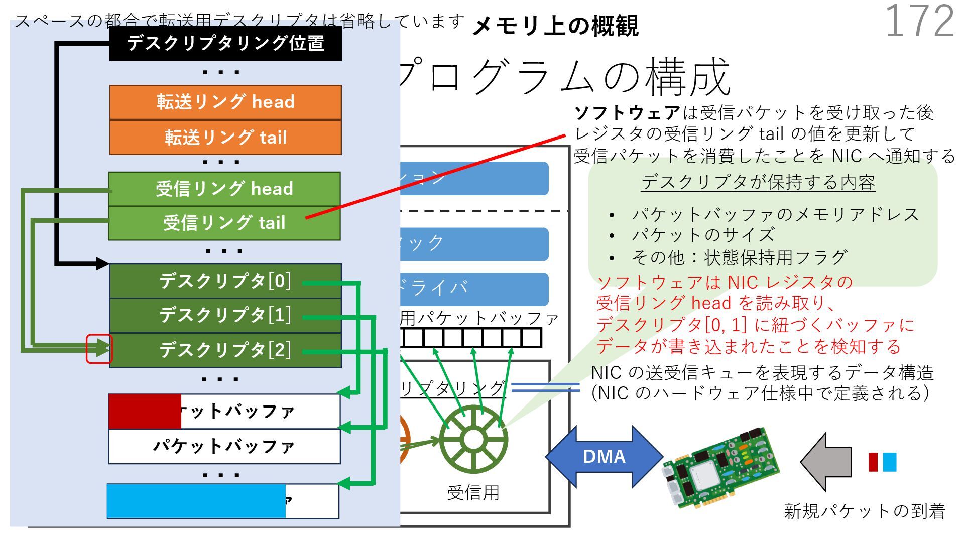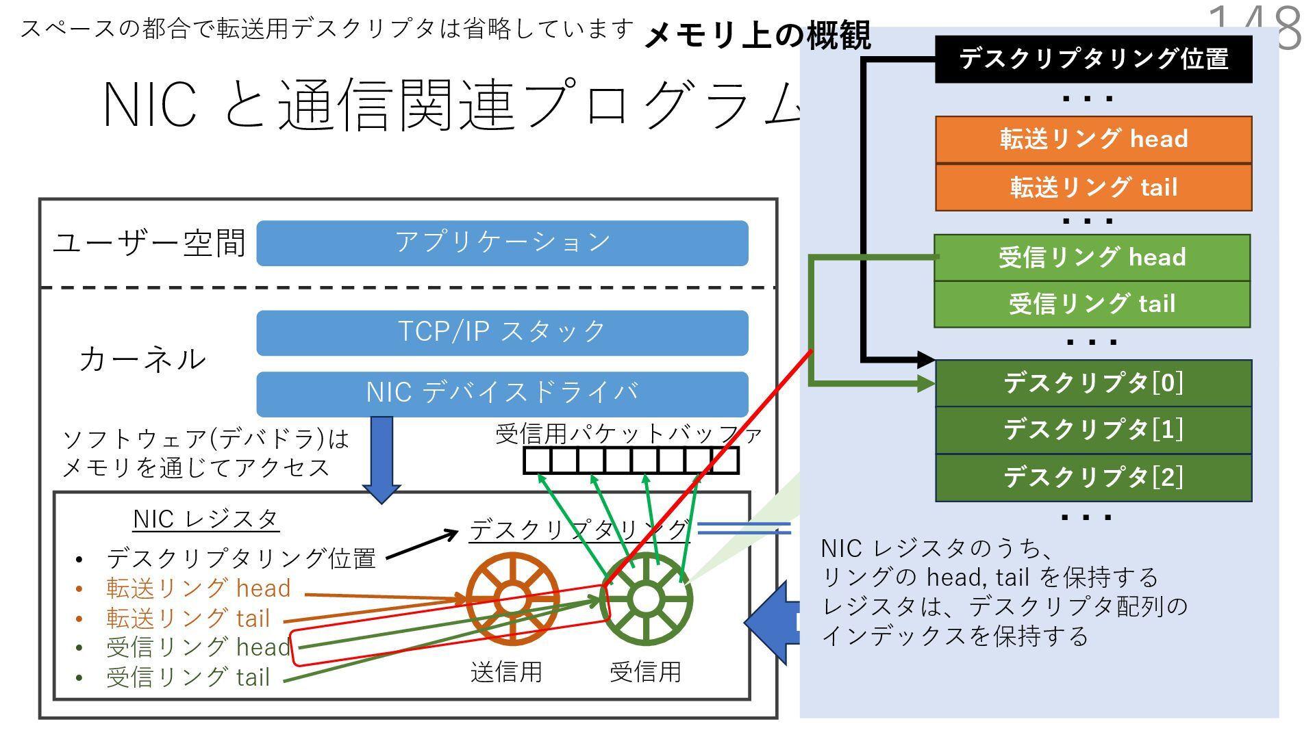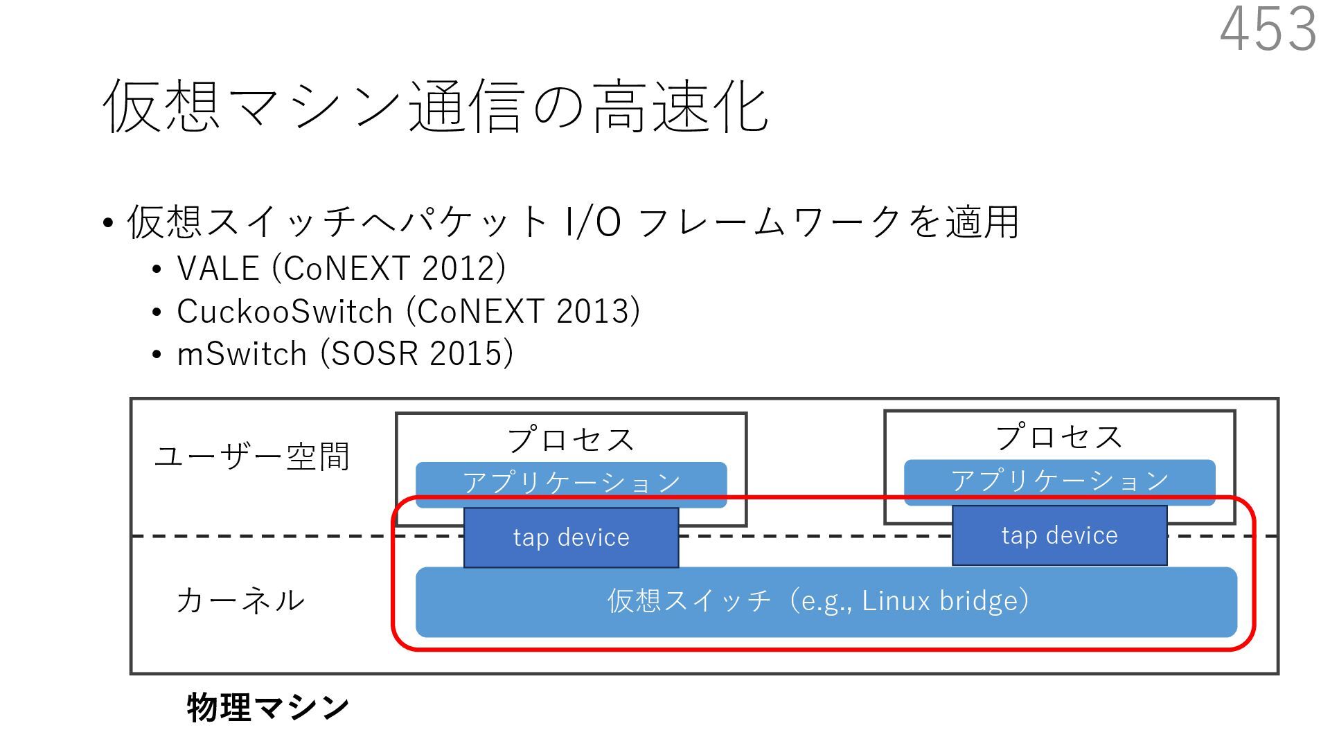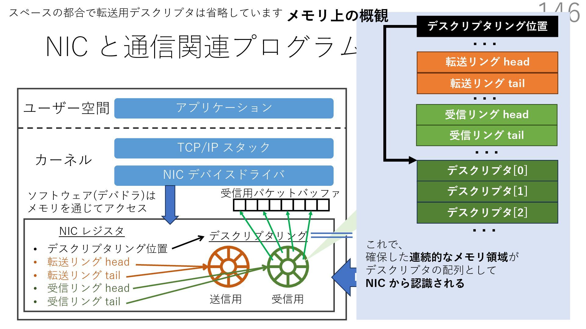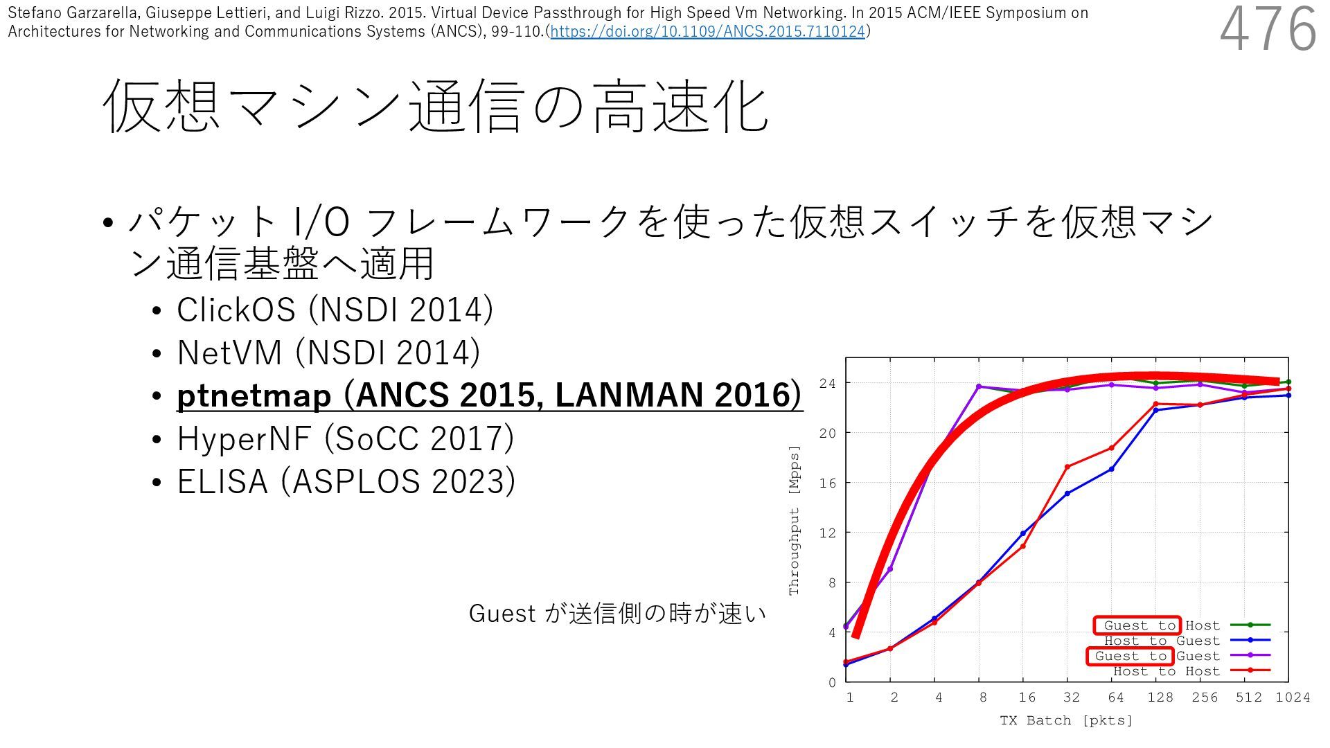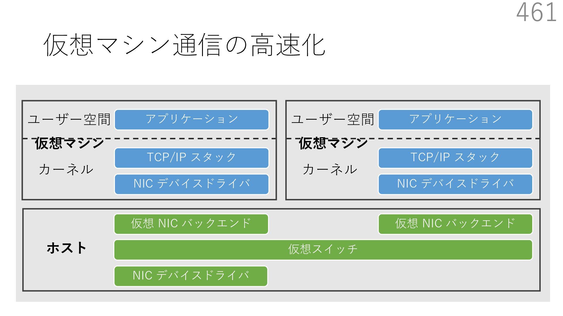 (SIGCOMM 2014) • mTCP (NSDI 2014) • Arrakis (OSDI 2014) • IX (OSDI 2014) • StackMap (USENIX ATC 2016) • Atlas (SIGCOMM 2017) • ZygOS (SOSP 2017) • Shenango (NSDI 2019) • Shinjuku (NSDI 2019) • TAS (EuroSys 2019) • Caladan (OSDI 2020) • Demikernel (SOSP 2021) 427 into a single library for both devices (e.g., RDMAxSPDK). We implemented the bulk of our library OS code in Rust. We initially prototyped several libOSes in C++; however, we found that Rust performs competitively with C++ and achieves ns-scale latencies while offering additional benefits. First, Rust enforces memory safety through language fea- tures and its compiler. Though our libOSes use unsafe code to bind to C/C++ kernel-bypass libraries and applications, User-space Software Kernel-space Software I/O Hardware I/O Device ??? libFuture ??? DPDK User I/O Buf. Mgmt libRDMA RDMA User I/O Buf. Mgmt Net. Trans. OS Kernel Control Path Demikernel Datapath Architecture App libPOSIX libDPDK SPDK User I/O Buf. Mgmt libSPDK Future Demikernel PDPIX Datapath API Figure 3. Demikernel kernel-bypass architecture. Demikernel ac- commodates heterogenous kernel-bypass devices, including poten- tial future hardware, with a flexible library OS-based datapath ar- chitecture.We include a libOS that goes through the OS kernel for 提案:異なるタイプのデバイスへ 共通のインターフェースからアクセス可能にする Irene Zhang, Amanda Raybuck, Pratyush Patel, Kirk Olynyk, Jacob Nelson, Omar S. Navarro Leija, Ashlie Martinez, Jing Liu, Anna Kornfeld Simpson, Sujay Jayakar, Pedro Henrique Penna, Max Demoulin, Piali Choudhury, and Anirudh Badam. 2021. The Demikernel Datapath OS Architecture for Microsecond-Scale Datacenter Systems. In Proceedings of the ACM Sigops 28th Symposium on Operating Systems Principles (SOSP ʼ21), 195-211.(https://doi.org/10.1145/3477132.3483569)