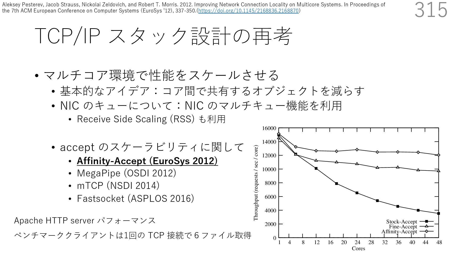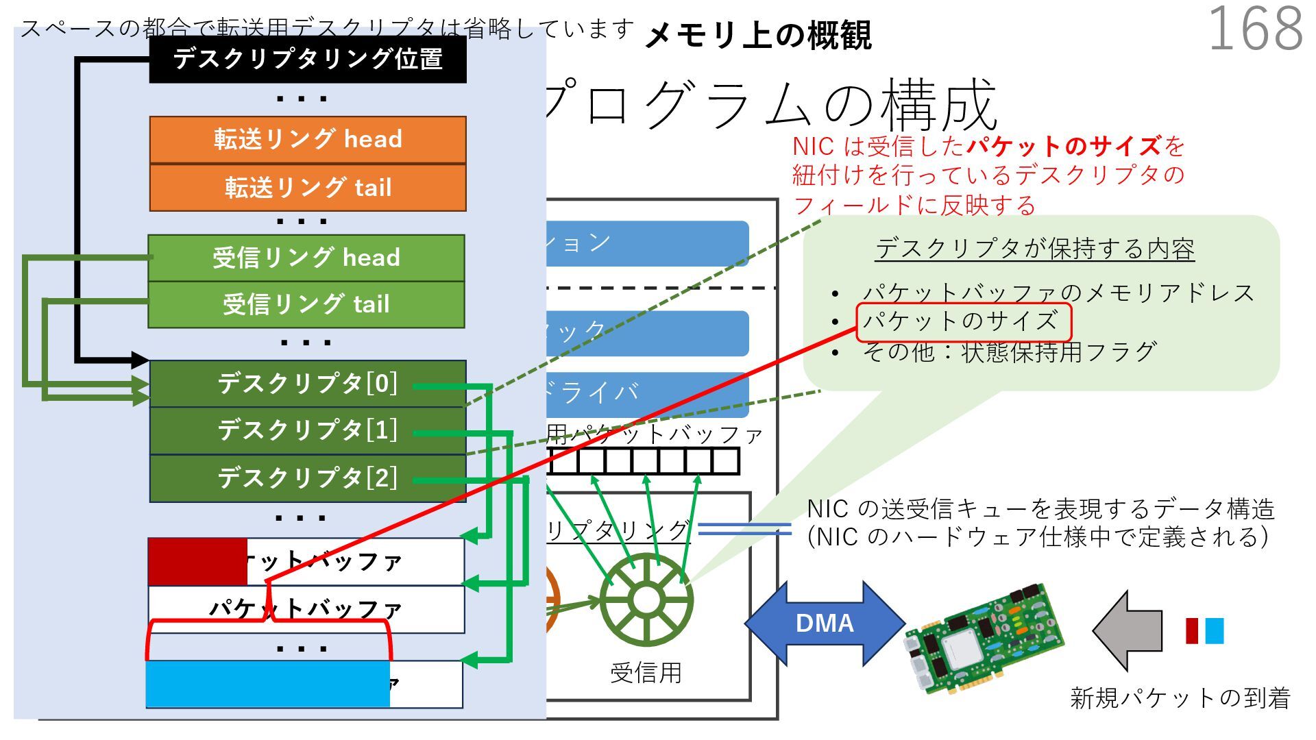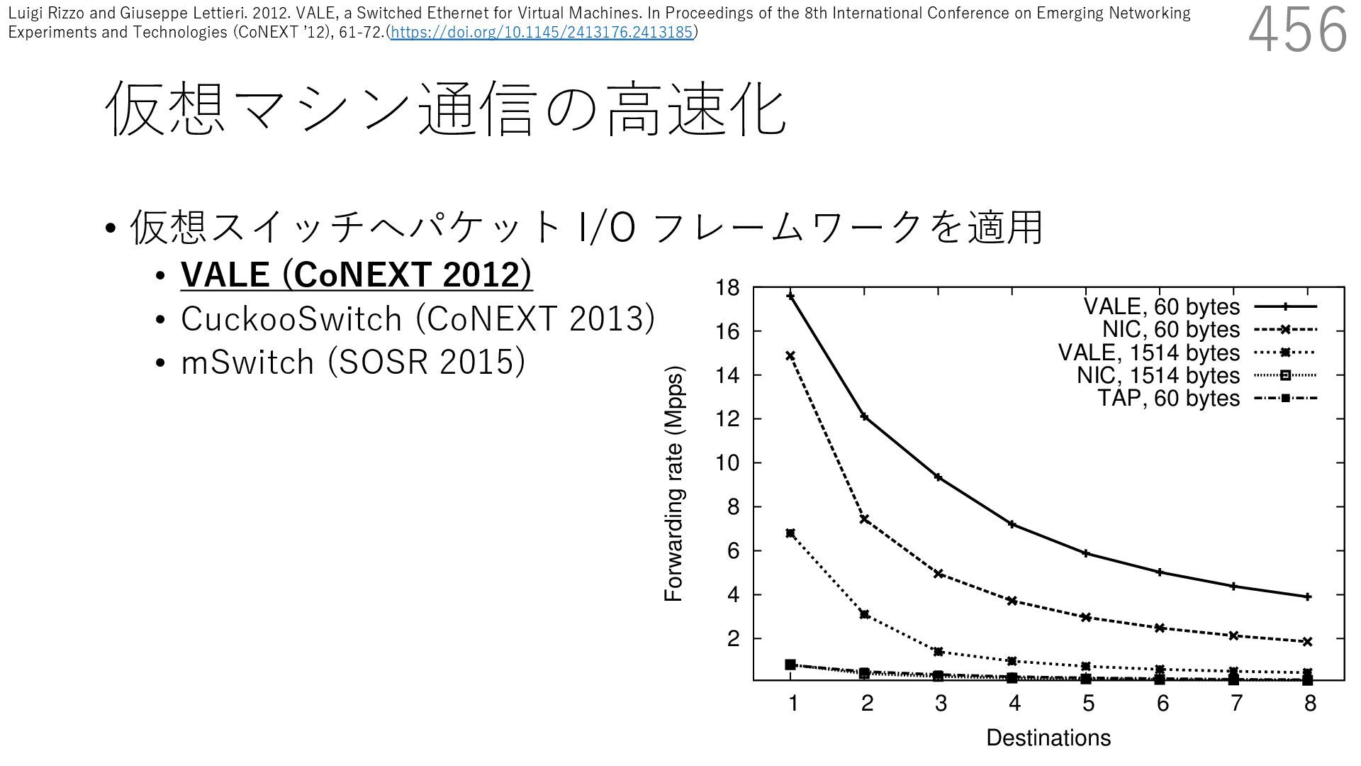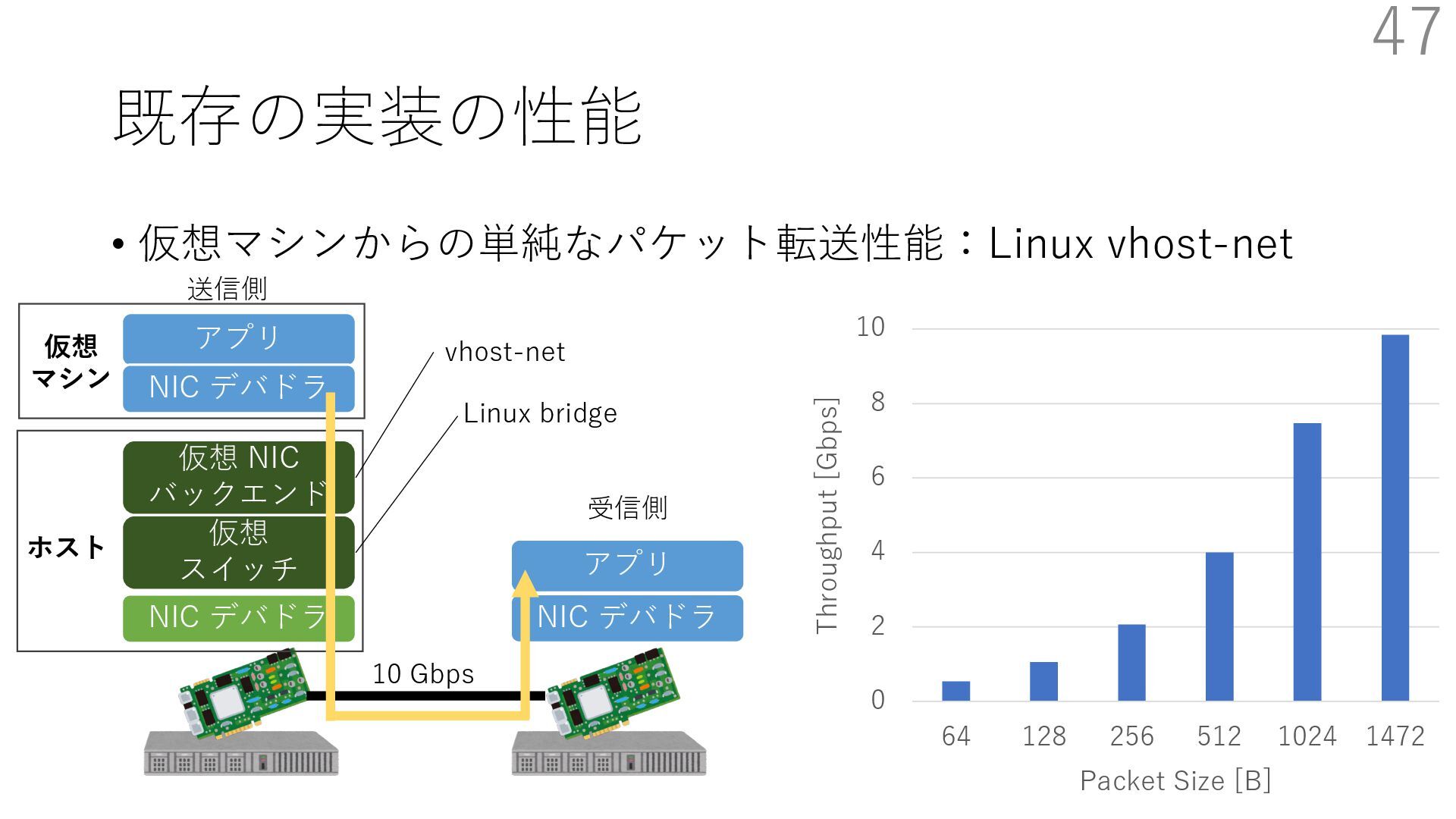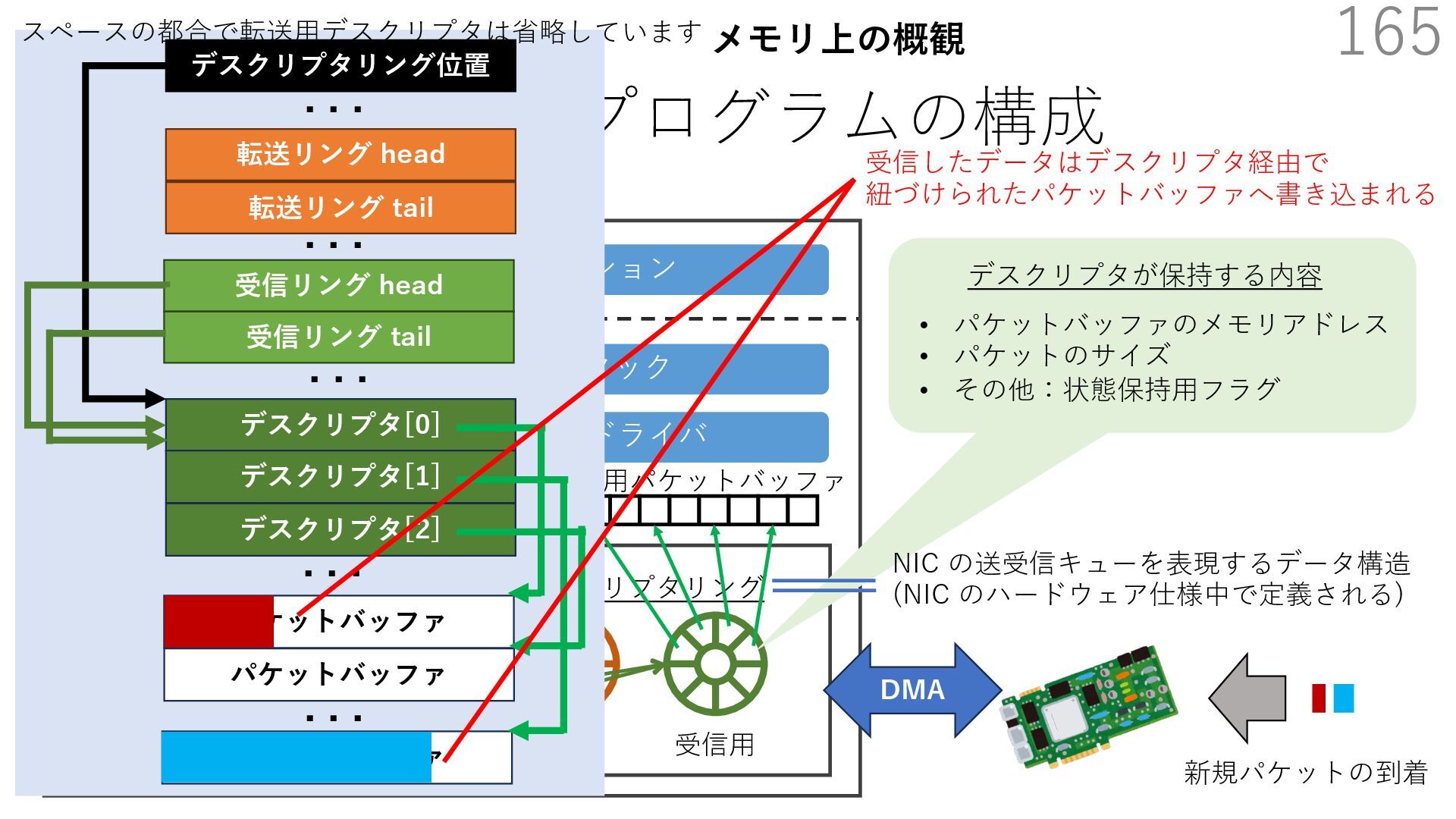 (SIGCOMM 2014) • mTCP (NSDI 2014) • Arrakis (OSDI 2014) • IX (OSDI 2014) • StackMap (USENIX ATC 2016) • Atlas (SIGCOMM 2017) • ZygOS (SOSP 2017) • Shenango (NSDI 2019) • Shinjuku (NSDI 2019) • TAS (EuroSys 2019) • Caladan (OSDI 2020) • Demikernel (SOSP 2021) 427 into a single library for both devices (e.g., RDMAxSPDK). We implemented the bulk of our library OS code in Rust. We initially prototyped several libOSes in C++; however, we found that Rust performs competitively with C++ and achieves ns-scale latencies while offering additional benefits. First, Rust enforces memory safety through language fea- tures and its compiler. Though our libOSes use unsafe code to bind to C/C++ kernel-bypass libraries and applications, User-space Software Kernel-space Software I/O Hardware I/O Device ??? libFuture ??? DPDK User I/O Buf. Mgmt libRDMA RDMA User I/O Buf. Mgmt Net. Trans. OS Kernel Control Path Demikernel Datapath Architecture App libPOSIX libDPDK SPDK User I/O Buf. Mgmt libSPDK Future Demikernel PDPIX Datapath API Figure 3. Demikernel kernel-bypass architecture. Demikernel ac- commodates heterogenous kernel-bypass devices, including poten- tial future hardware, with a flexible library OS-based datapath ar- chitecture.We include a libOS that goes through the OS kernel for 提案:異なるタイプのデバイスへ 共通のインターフェースからアクセス可能にする Irene Zhang, Amanda Raybuck, Pratyush Patel, Kirk Olynyk, Jacob Nelson, Omar S. Navarro Leija, Ashlie Martinez, Jing Liu, Anna Kornfeld Simpson, Sujay Jayakar, Pedro Henrique Penna, Max Demoulin, Piali Choudhury, and Anirudh Badam. 2021. The Demikernel Datapath OS Architecture for Microsecond-Scale Datacenter Systems. In Proceedings of the ACM Sigops 28th Symposium on Operating Systems Principles (SOSP ʼ21), 195-211.(https://doi.org/10.1145/3477132.3483569)