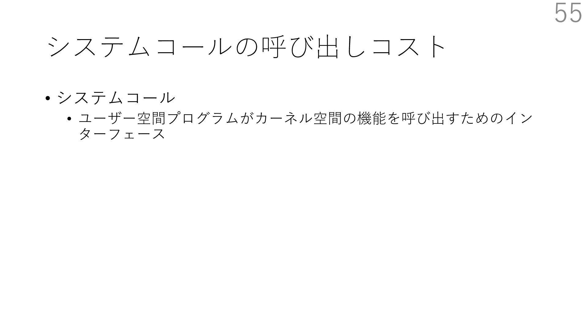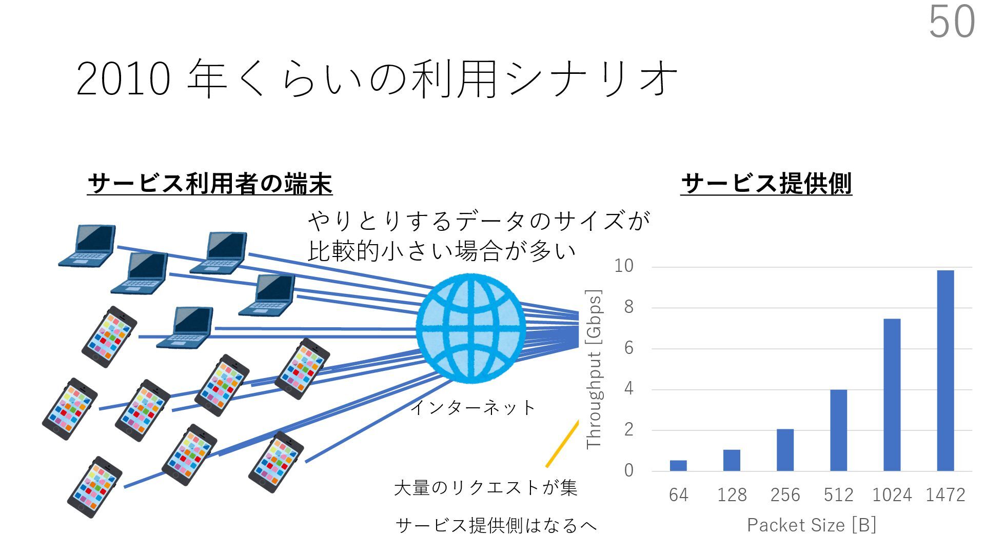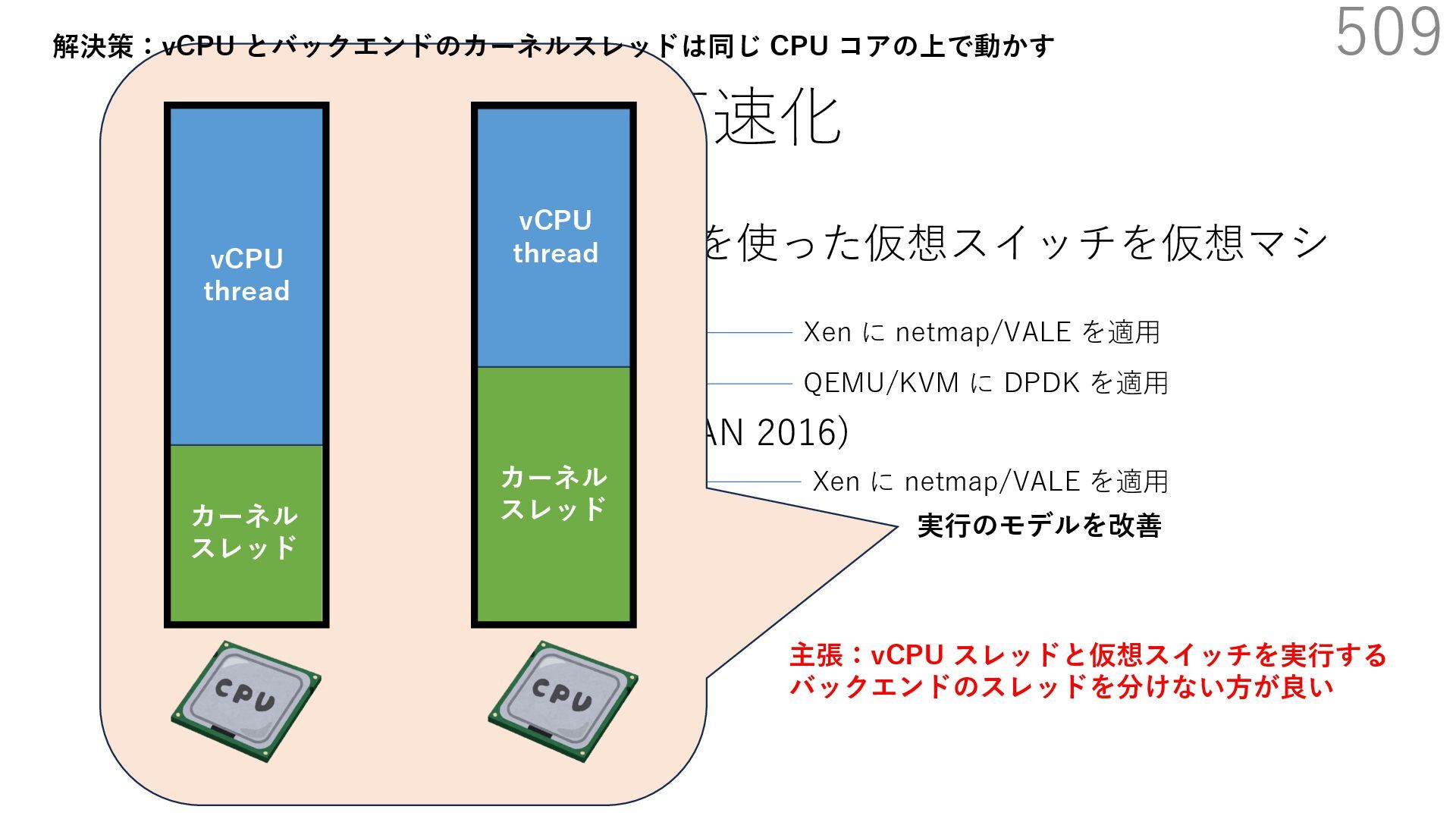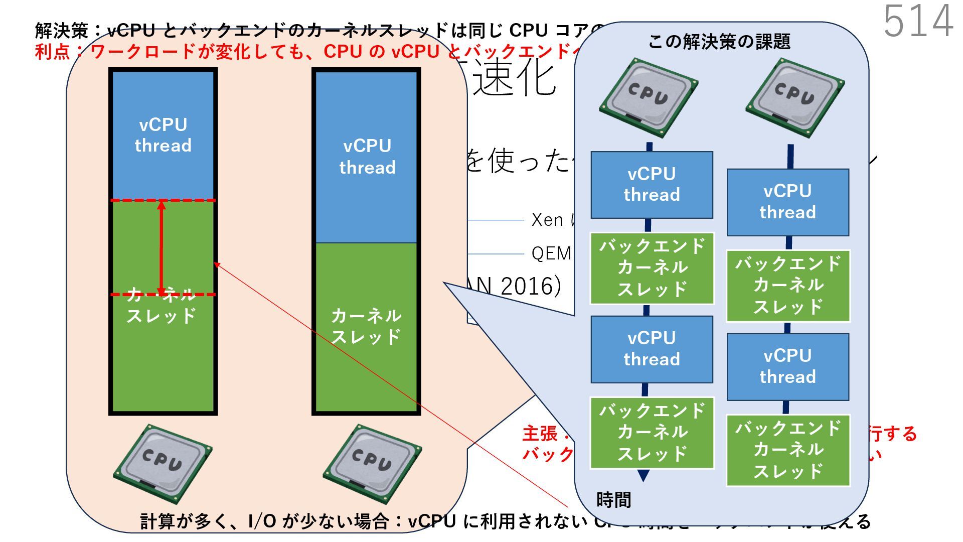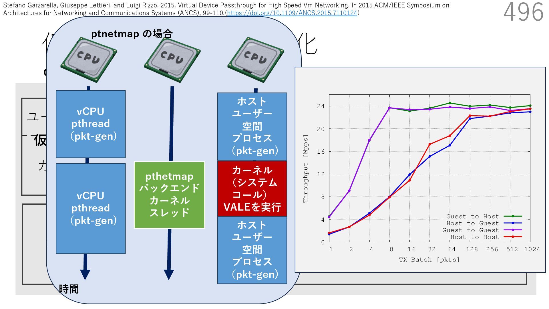 (SIGCOMM 2014) • mTCP (NSDI 2014) • Arrakis (OSDI 2014) • IX (OSDI 2014) • StackMap (USENIX ATC 2016) • Atlas (SIGCOMM 2017) • ZygOS (SOSP 2017) • Shenango (NSDI 2019) • Shinjuku (NSDI 2019) • TAS (EuroSys 2019) • Caladan (OSDI 2020) • Demikernel (SOSP 2021) 427 into a single library for both devices (e.g., RDMAxSPDK). We implemented the bulk of our library OS code in Rust. We initially prototyped several libOSes in C++; however, we found that Rust performs competitively with C++ and achieves ns-scale latencies while offering additional benefits. First, Rust enforces memory safety through language fea- tures and its compiler. Though our libOSes use unsafe code to bind to C/C++ kernel-bypass libraries and applications, User-space Software Kernel-space Software I/O Hardware I/O Device ??? libFuture ??? DPDK User I/O Buf. Mgmt libRDMA RDMA User I/O Buf. Mgmt Net. Trans. OS Kernel Control Path Demikernel Datapath Architecture App libPOSIX libDPDK SPDK User I/O Buf. Mgmt libSPDK Future Demikernel PDPIX Datapath API Figure 3. Demikernel kernel-bypass architecture. Demikernel ac- commodates heterogenous kernel-bypass devices, including poten- tial future hardware, with a flexible library OS-based datapath ar- chitecture.We include a libOS that goes through the OS kernel for 提案:異なるタイプのデバイスへ 共通のインターフェースからアクセス可能にする Irene Zhang, Amanda Raybuck, Pratyush Patel, Kirk Olynyk, Jacob Nelson, Omar S. Navarro Leija, Ashlie Martinez, Jing Liu, Anna Kornfeld Simpson, Sujay Jayakar, Pedro Henrique Penna, Max Demoulin, Piali Choudhury, and Anirudh Badam. 2021. The Demikernel Datapath OS Architecture for Microsecond-Scale Datacenter Systems. In Proceedings of the ACM Sigops 28th Symposium on Operating Systems Principles (SOSP ʼ21), 195-211.(https://doi.org/10.1145/3477132.3483569)