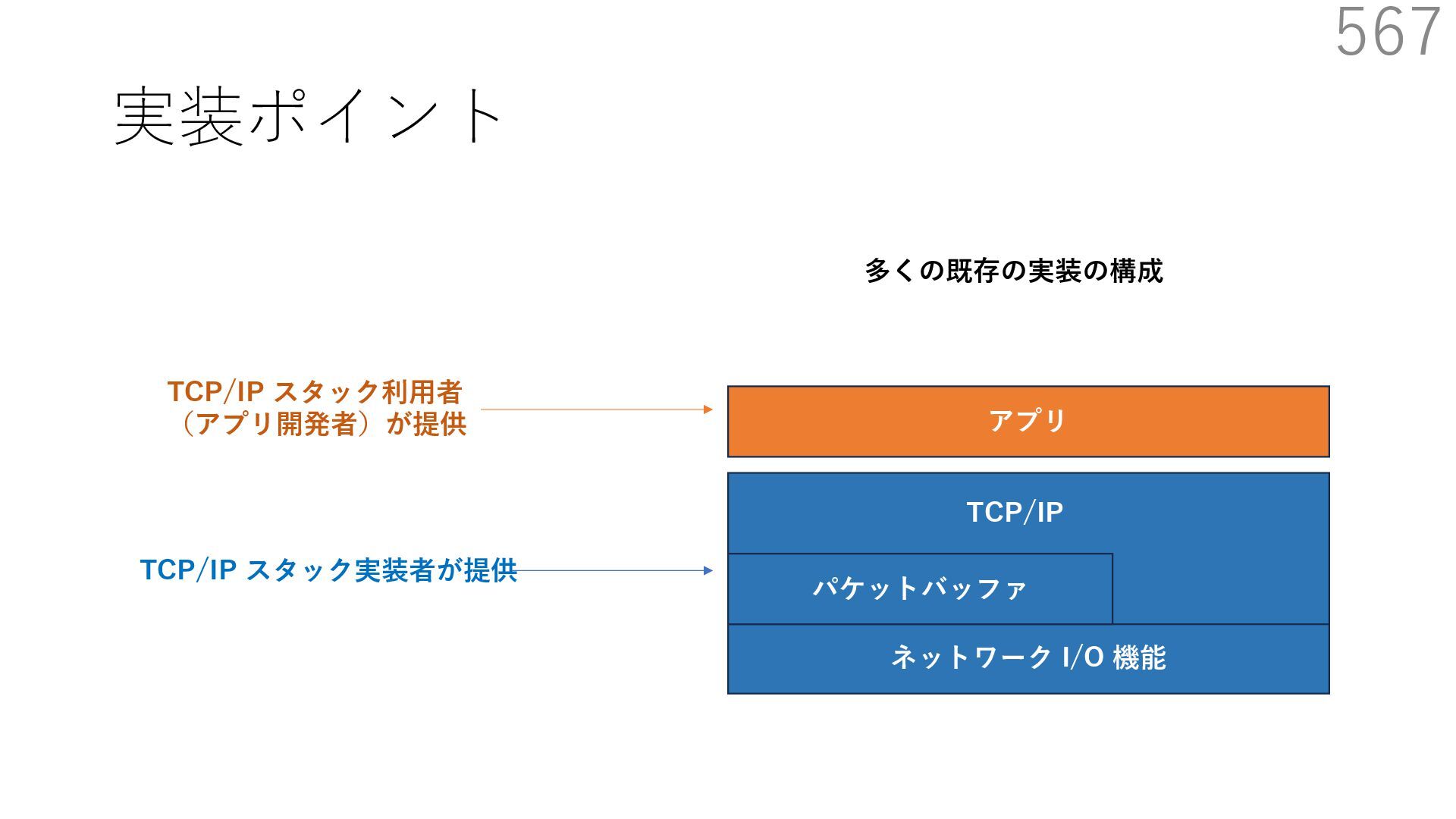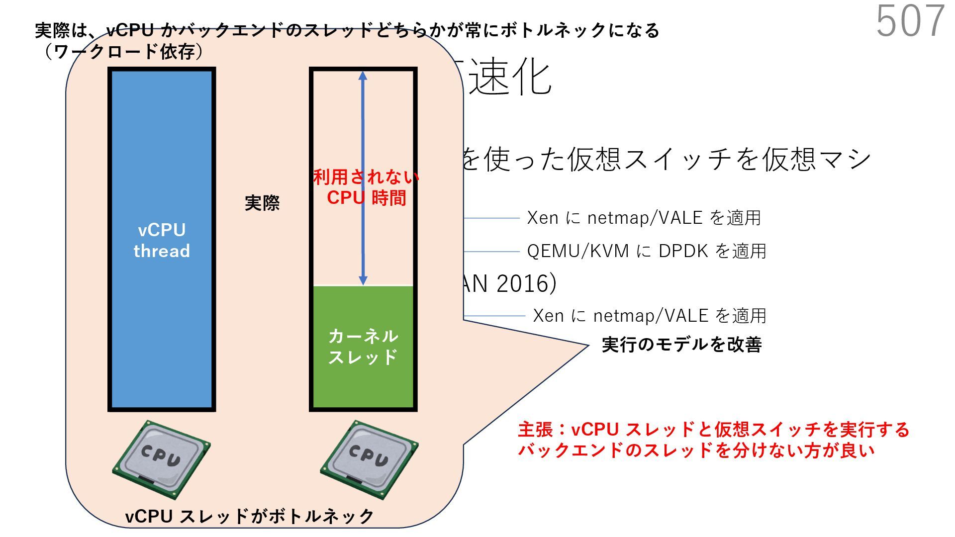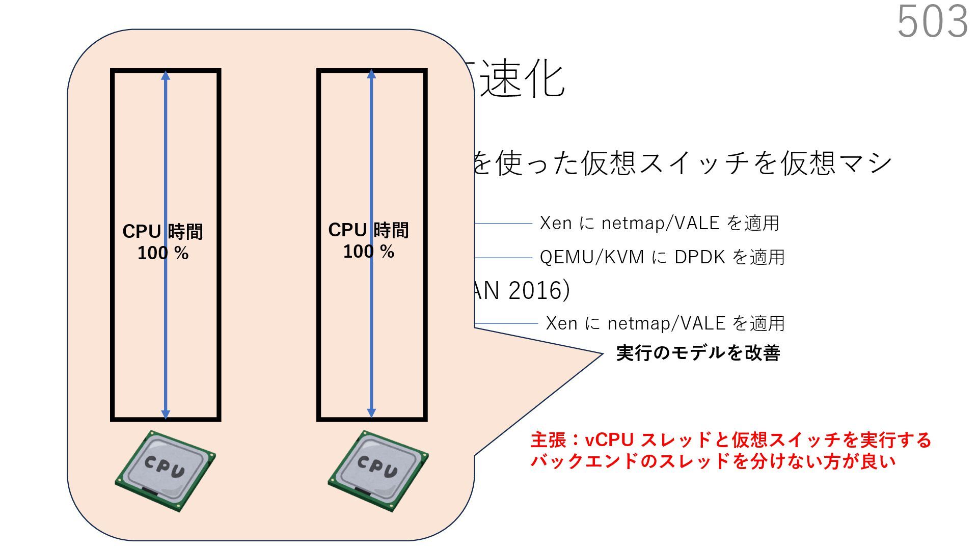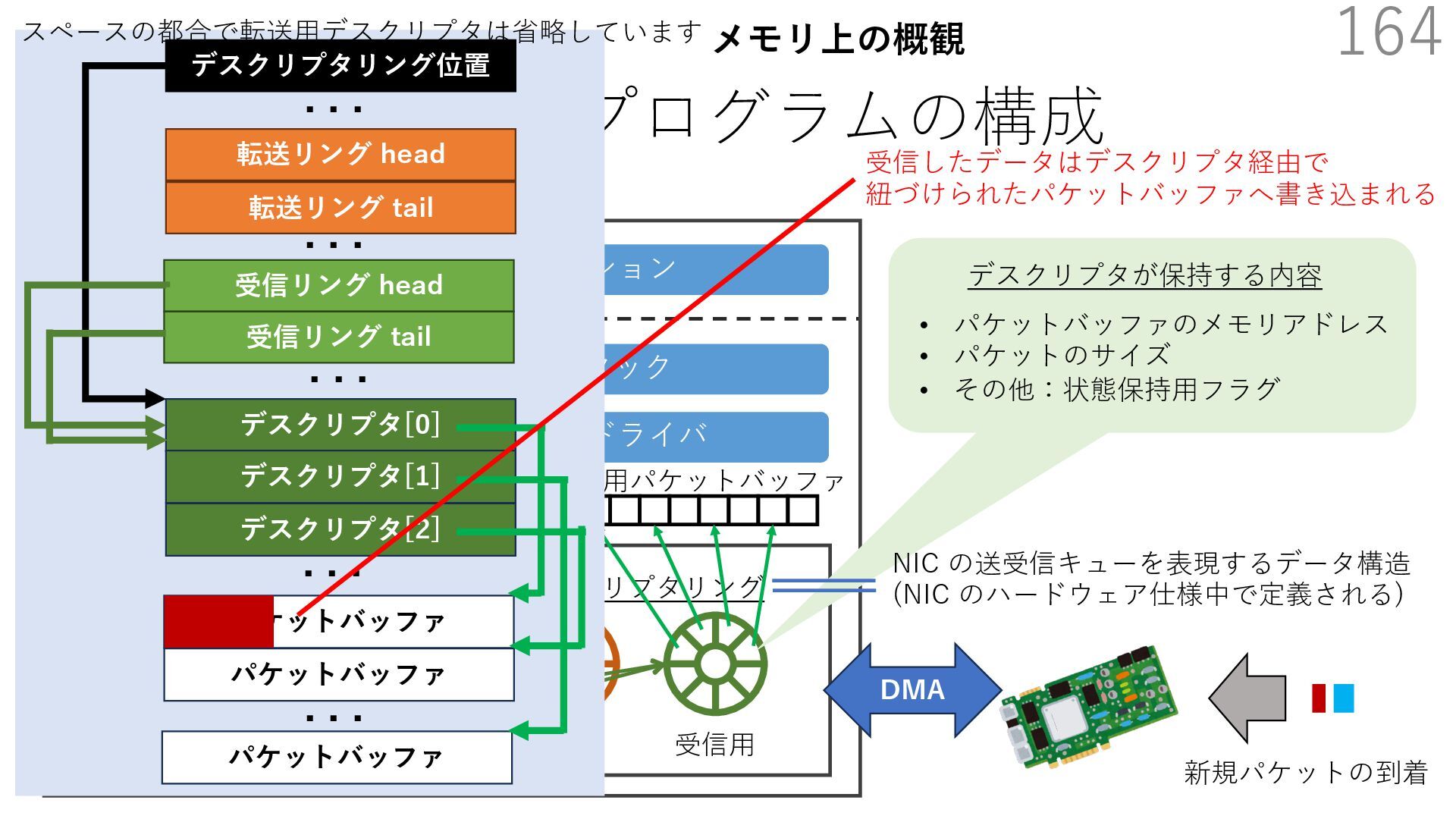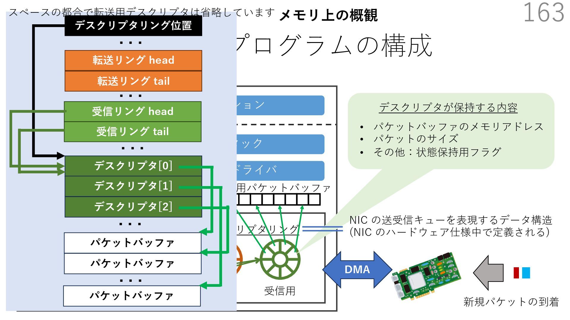 (SIGCOMM 2014) • mTCP (NSDI 2014) • Arrakis (OSDI 2014) • IX (OSDI 2014) • StackMap (USENIX ATC 2016) • Atlas (SIGCOMM 2017) • ZygOS (SOSP 2017) • Shenango (NSDI 2019) • Shinjuku (NSDI 2019) • TAS (EuroSys 2019) • Caladan (OSDI 2020) • Demikernel (SOSP 2021) 427 into a single library for both devices (e.g., RDMAxSPDK). We implemented the bulk of our library OS code in Rust. We initially prototyped several libOSes in C++; however, we found that Rust performs competitively with C++ and achieves ns-scale latencies while offering additional benefits. First, Rust enforces memory safety through language fea- tures and its compiler. Though our libOSes use unsafe code to bind to C/C++ kernel-bypass libraries and applications, User-space Software Kernel-space Software I/O Hardware I/O Device ??? libFuture ??? DPDK User I/O Buf. Mgmt libRDMA RDMA User I/O Buf. Mgmt Net. Trans. OS Kernel Control Path Demikernel Datapath Architecture App libPOSIX libDPDK SPDK User I/O Buf. Mgmt libSPDK Future Demikernel PDPIX Datapath API Figure 3. Demikernel kernel-bypass architecture. Demikernel ac- commodates heterogenous kernel-bypass devices, including poten- tial future hardware, with a flexible library OS-based datapath ar- chitecture.We include a libOS that goes through the OS kernel for 提案:異なるタイプのデバイスへ 共通のインターフェースからアクセス可能にする Irene Zhang, Amanda Raybuck, Pratyush Patel, Kirk Olynyk, Jacob Nelson, Omar S. Navarro Leija, Ashlie Martinez, Jing Liu, Anna Kornfeld Simpson, Sujay Jayakar, Pedro Henrique Penna, Max Demoulin, Piali Choudhury, and Anirudh Badam. 2021. The Demikernel Datapath OS Architecture for Microsecond-Scale Datacenter Systems. In Proceedings of the ACM Sigops 28th Symposium on Operating Systems Principles (SOSP ʼ21), 195-211.(https://doi.org/10.1145/3477132.3483569)