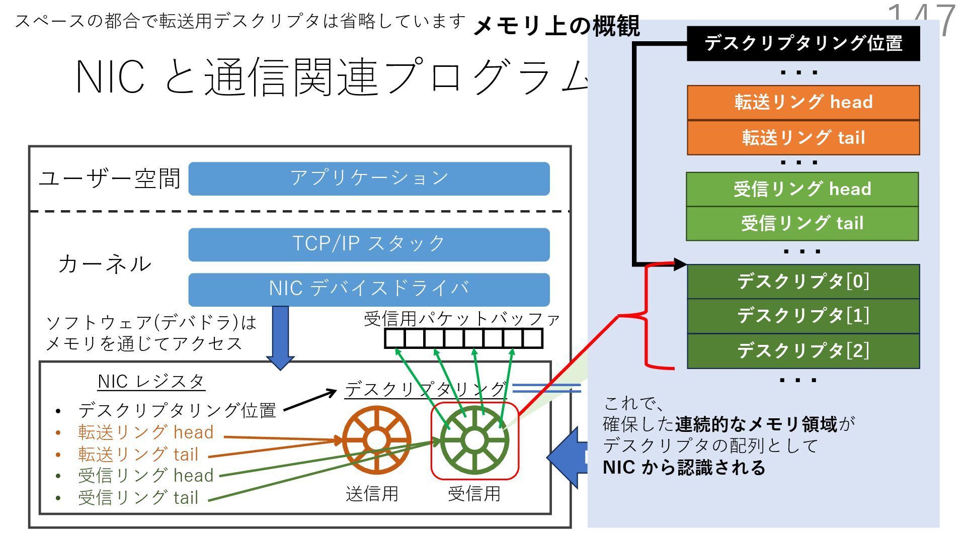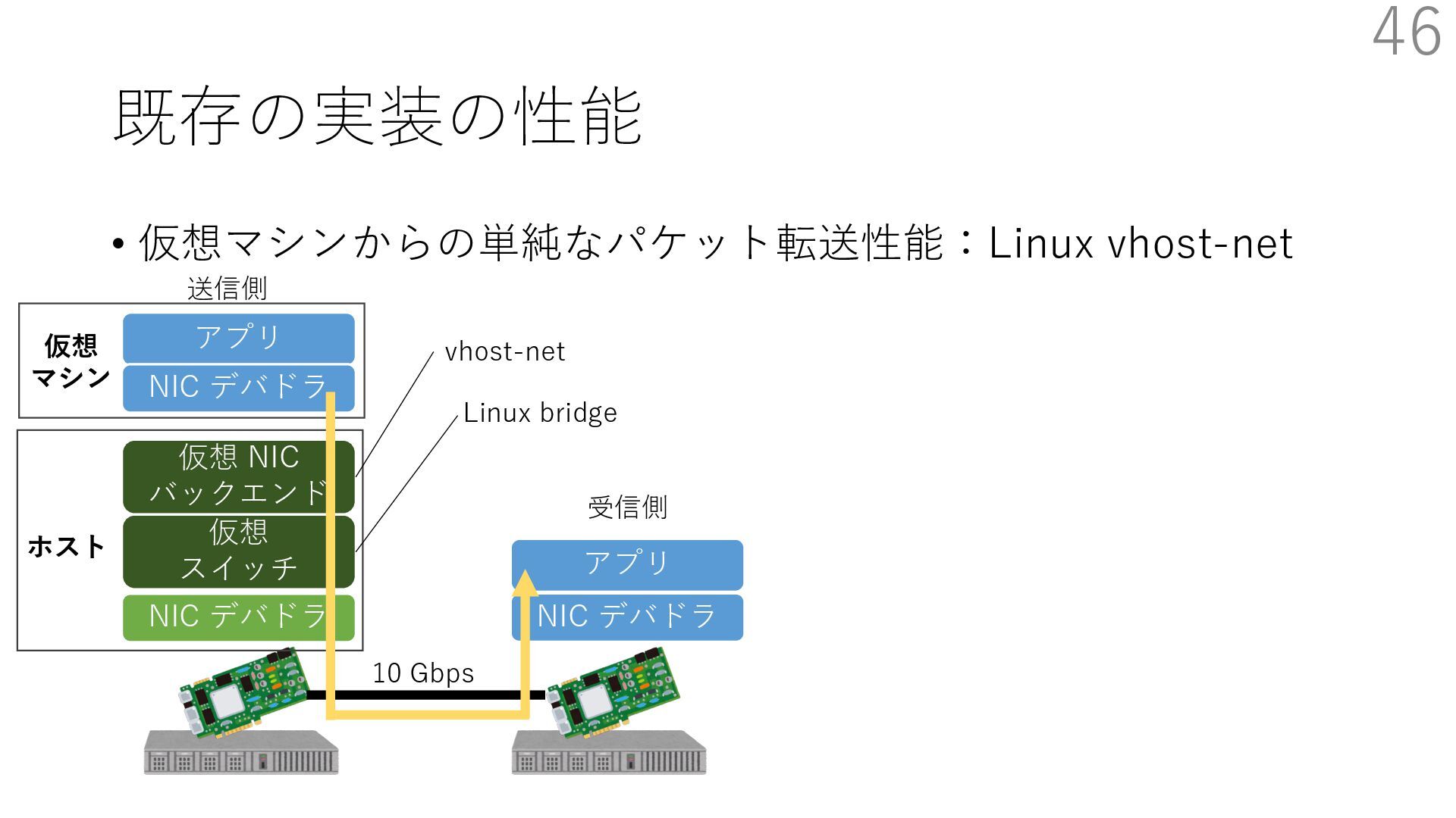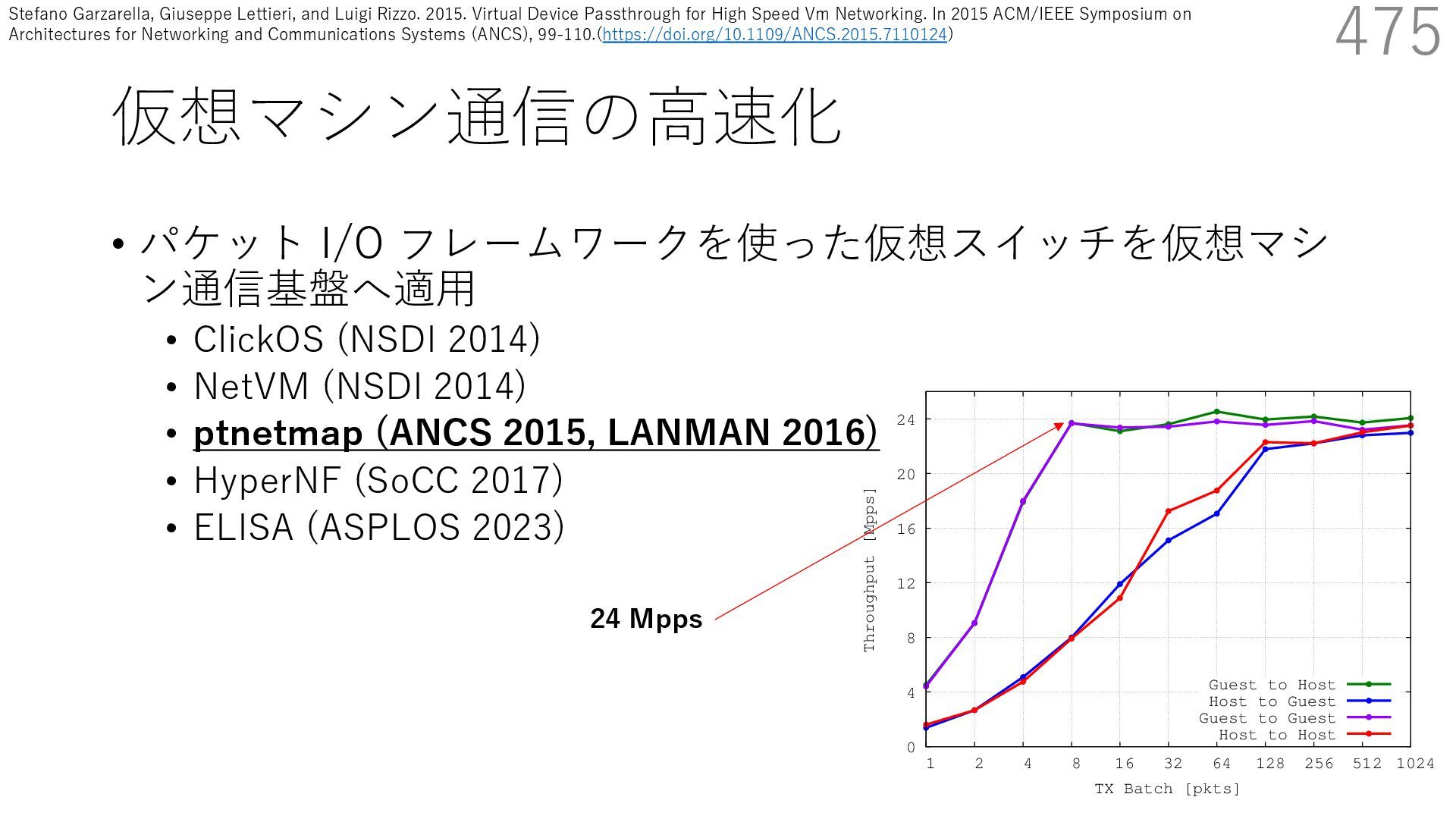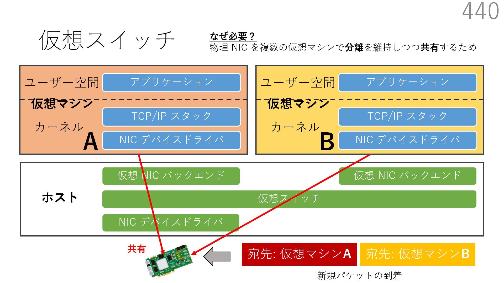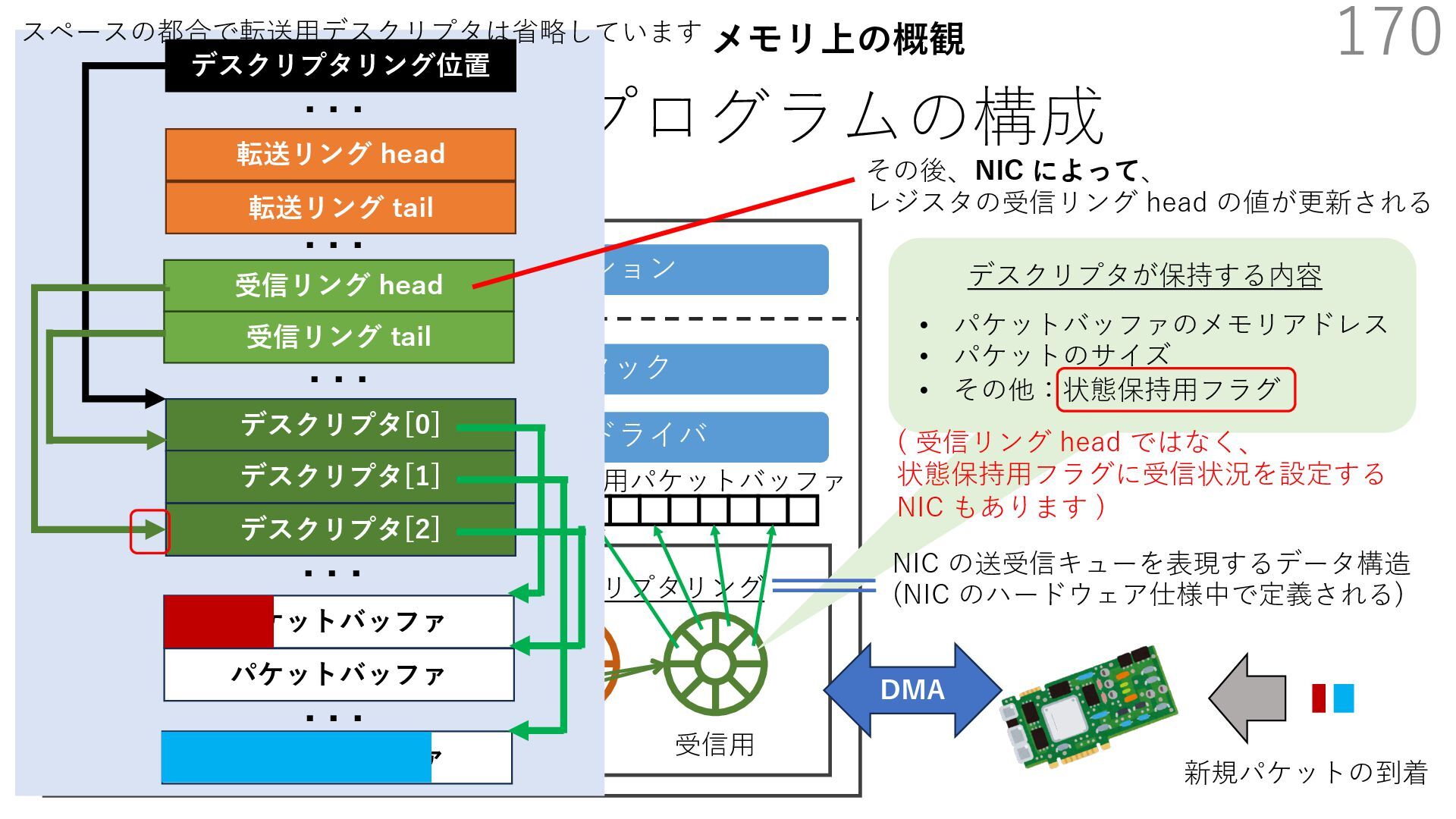 (SIGCOMM 2014) • mTCP (NSDI 2014) • Arrakis (OSDI 2014) • IX (OSDI 2014) • StackMap (USENIX ATC 2016) • Atlas (SIGCOMM 2017) • ZygOS (SOSP 2017) • Shenango (NSDI 2019) • Shinjuku (NSDI 2019) • TAS (EuroSys 2019) • Caladan (OSDI 2020) • Demikernel (SOSP 2021) 427 into a single library for both devices (e.g., RDMAxSPDK). We implemented the bulk of our library OS code in Rust. We initially prototyped several libOSes in C++; however, we found that Rust performs competitively with C++ and achieves ns-scale latencies while offering additional benefits. First, Rust enforces memory safety through language fea- tures and its compiler. Though our libOSes use unsafe code to bind to C/C++ kernel-bypass libraries and applications, User-space Software Kernel-space Software I/O Hardware I/O Device ??? libFuture ??? DPDK User I/O Buf. Mgmt libRDMA RDMA User I/O Buf. Mgmt Net. Trans. OS Kernel Control Path Demikernel Datapath Architecture App libPOSIX libDPDK SPDK User I/O Buf. Mgmt libSPDK Future Demikernel PDPIX Datapath API Figure 3. Demikernel kernel-bypass architecture. Demikernel ac- commodates heterogenous kernel-bypass devices, including poten- tial future hardware, with a flexible library OS-based datapath ar- chitecture.We include a libOS that goes through the OS kernel for 提案:異なるタイプのデバイスへ 共通のインターフェースからアクセス可能にする Irene Zhang, Amanda Raybuck, Pratyush Patel, Kirk Olynyk, Jacob Nelson, Omar S. Navarro Leija, Ashlie Martinez, Jing Liu, Anna Kornfeld Simpson, Sujay Jayakar, Pedro Henrique Penna, Max Demoulin, Piali Choudhury, and Anirudh Badam. 2021. The Demikernel Datapath OS Architecture for Microsecond-Scale Datacenter Systems. In Proceedings of the ACM Sigops 28th Symposium on Operating Systems Principles (SOSP ʼ21), 195-211.(https://doi.org/10.1145/3477132.3483569)