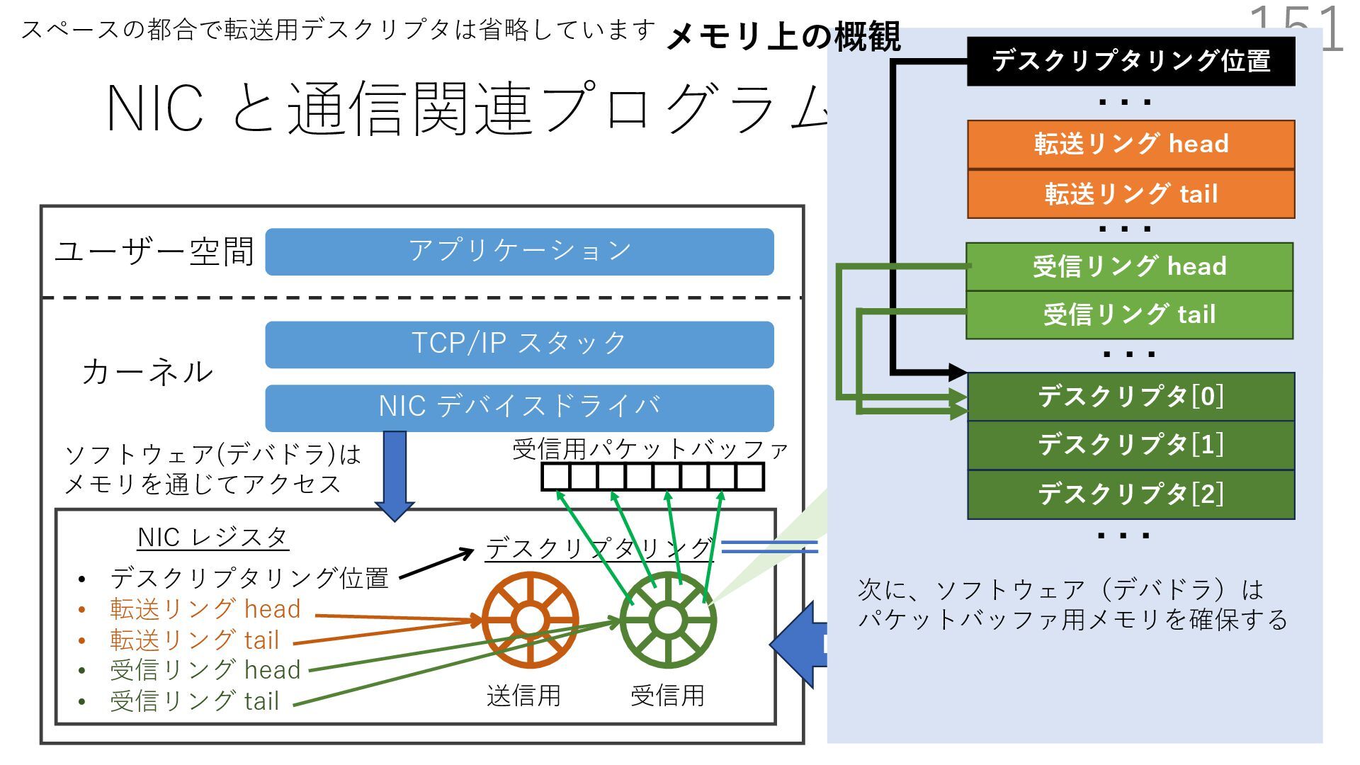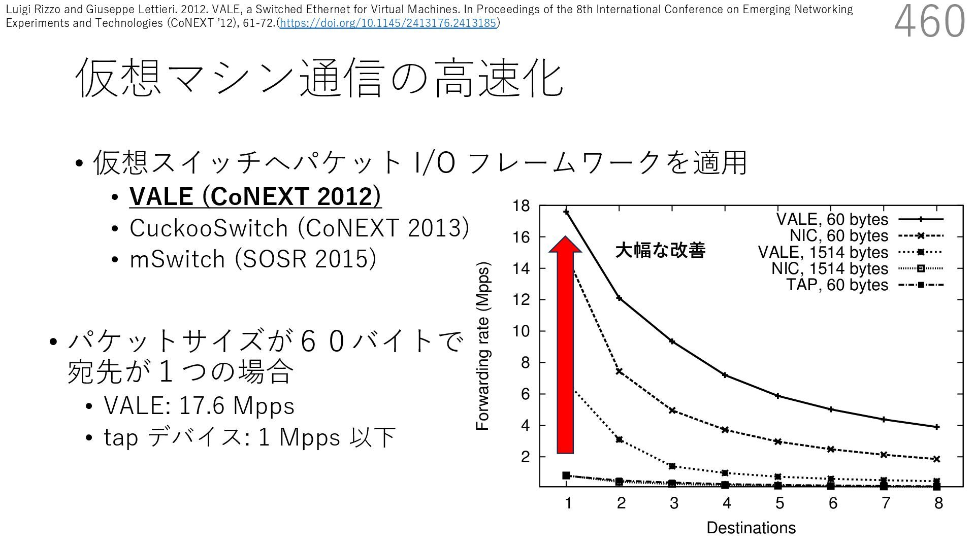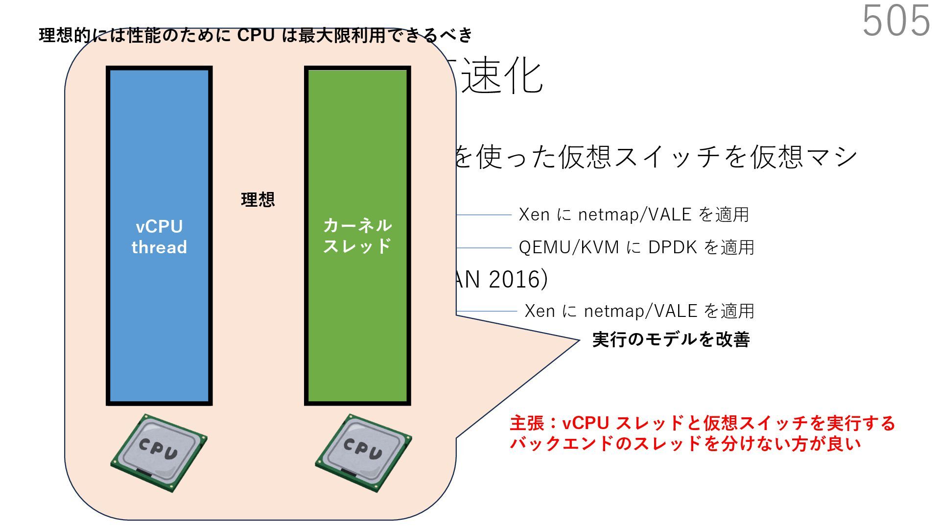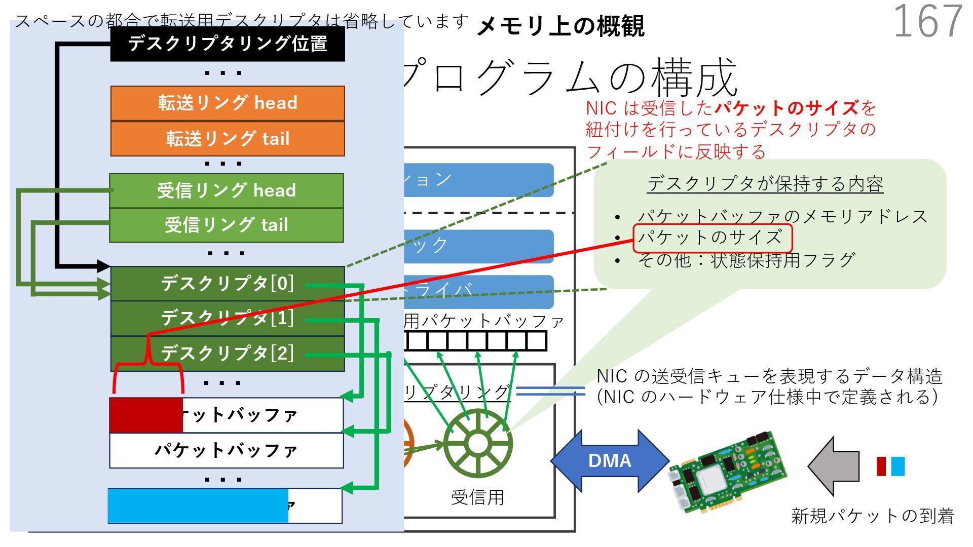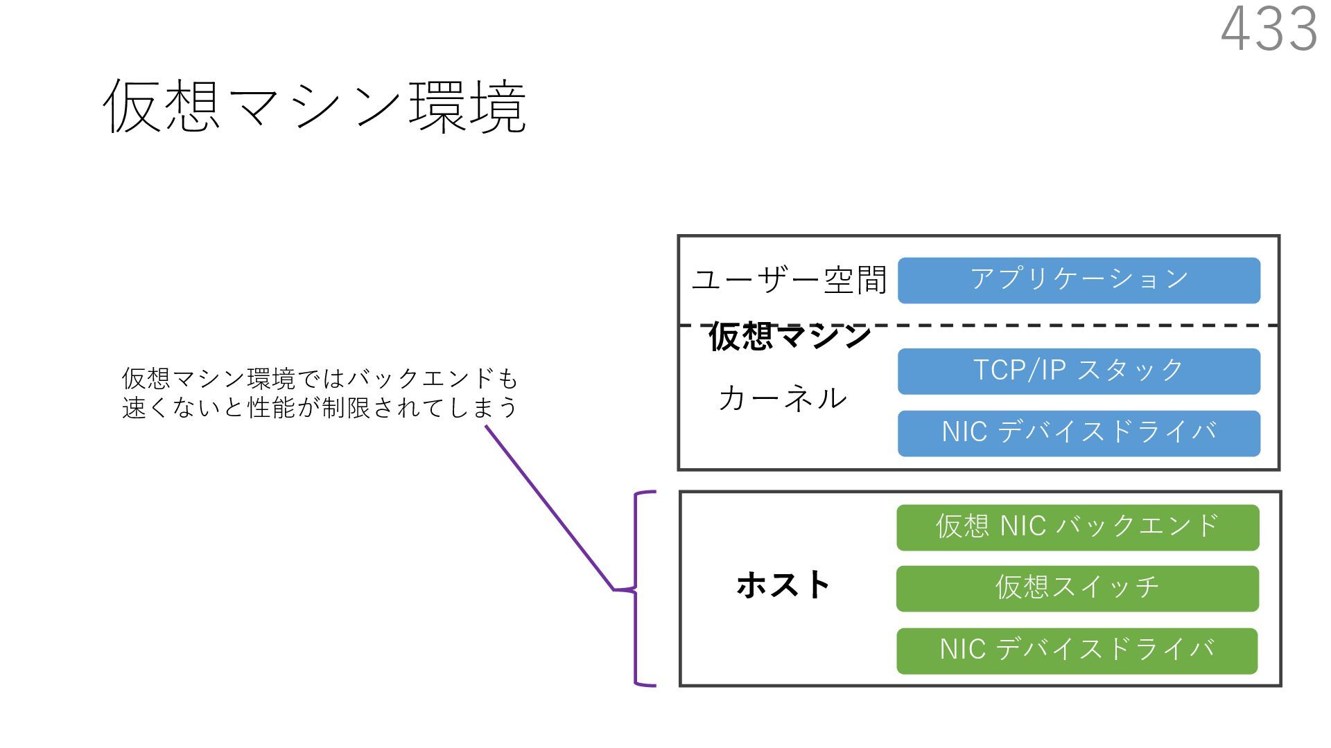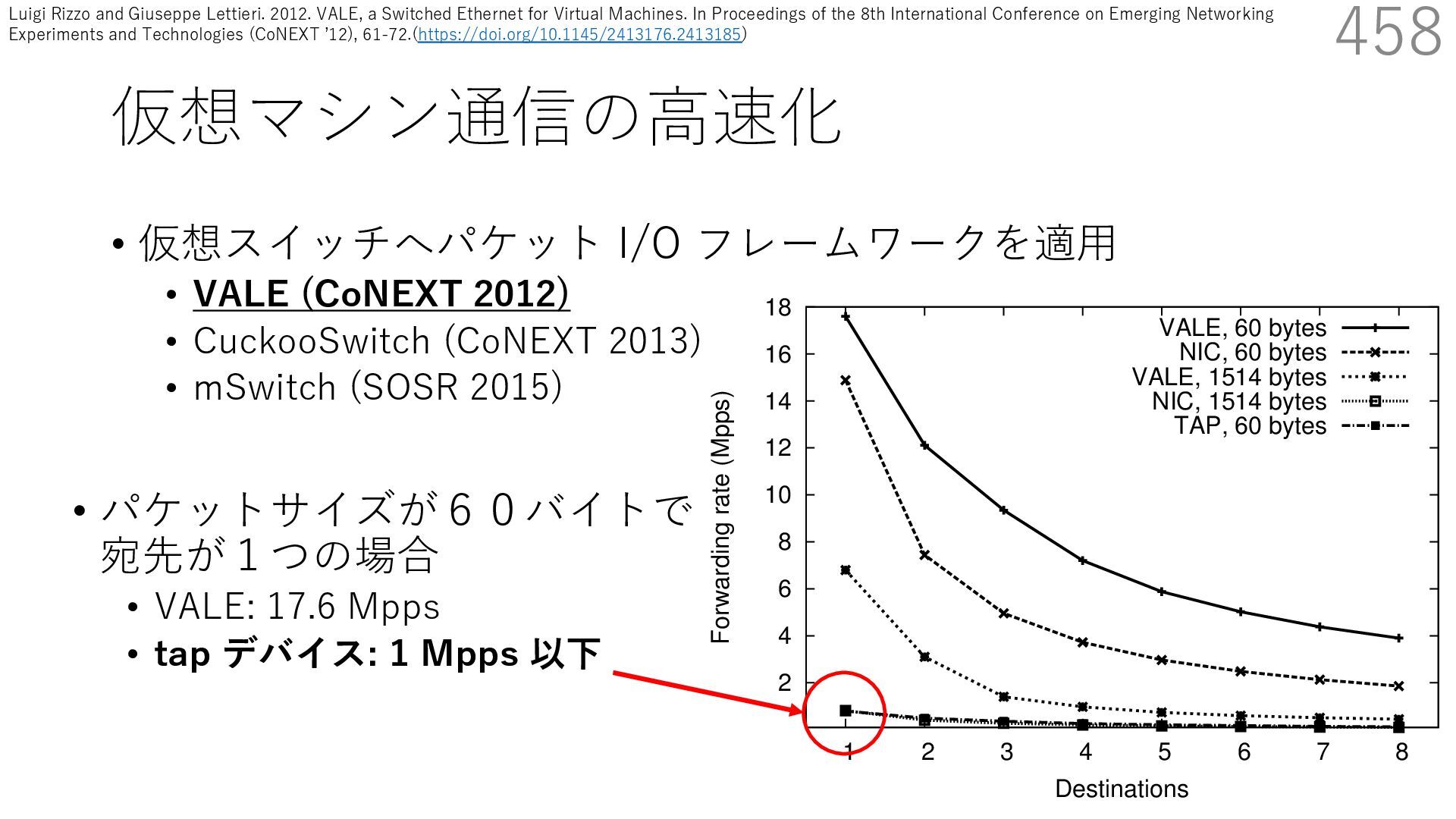 (SIGCOMM 2014) • mTCP (NSDI 2014) • Arrakis (OSDI 2014) • IX (OSDI 2014) • StackMap (USENIX ATC 2016) • Atlas (SIGCOMM 2017) • ZygOS (SOSP 2017) • Shenango (NSDI 2019) • Shinjuku (NSDI 2019) • TAS (EuroSys 2019) • Caladan (OSDI 2020) • Demikernel (SOSP 2021) 427 into a single library for both devices (e.g., RDMAxSPDK). We implemented the bulk of our library OS code in Rust. We initially prototyped several libOSes in C++; however, we found that Rust performs competitively with C++ and achieves ns-scale latencies while offering additional benefits. First, Rust enforces memory safety through language fea- tures and its compiler. Though our libOSes use unsafe code to bind to C/C++ kernel-bypass libraries and applications, User-space Software Kernel-space Software I/O Hardware I/O Device ??? libFuture ??? DPDK User I/O Buf. Mgmt libRDMA RDMA User I/O Buf. Mgmt Net. Trans. OS Kernel Control Path Demikernel Datapath Architecture App libPOSIX libDPDK SPDK User I/O Buf. Mgmt libSPDK Future Demikernel PDPIX Datapath API Figure 3. Demikernel kernel-bypass architecture. Demikernel ac- commodates heterogenous kernel-bypass devices, including poten- tial future hardware, with a flexible library OS-based datapath ar- chitecture.We include a libOS that goes through the OS kernel for 提案:異なるタイプのデバイスへ 共通のインターフェースからアクセス可能にする Irene Zhang, Amanda Raybuck, Pratyush Patel, Kirk Olynyk, Jacob Nelson, Omar S. Navarro Leija, Ashlie Martinez, Jing Liu, Anna Kornfeld Simpson, Sujay Jayakar, Pedro Henrique Penna, Max Demoulin, Piali Choudhury, and Anirudh Badam. 2021. The Demikernel Datapath OS Architecture for Microsecond-Scale Datacenter Systems. In Proceedings of the ACM Sigops 28th Symposium on Operating Systems Principles (SOSP ʼ21), 195-211.(https://doi.org/10.1145/3477132.3483569)
