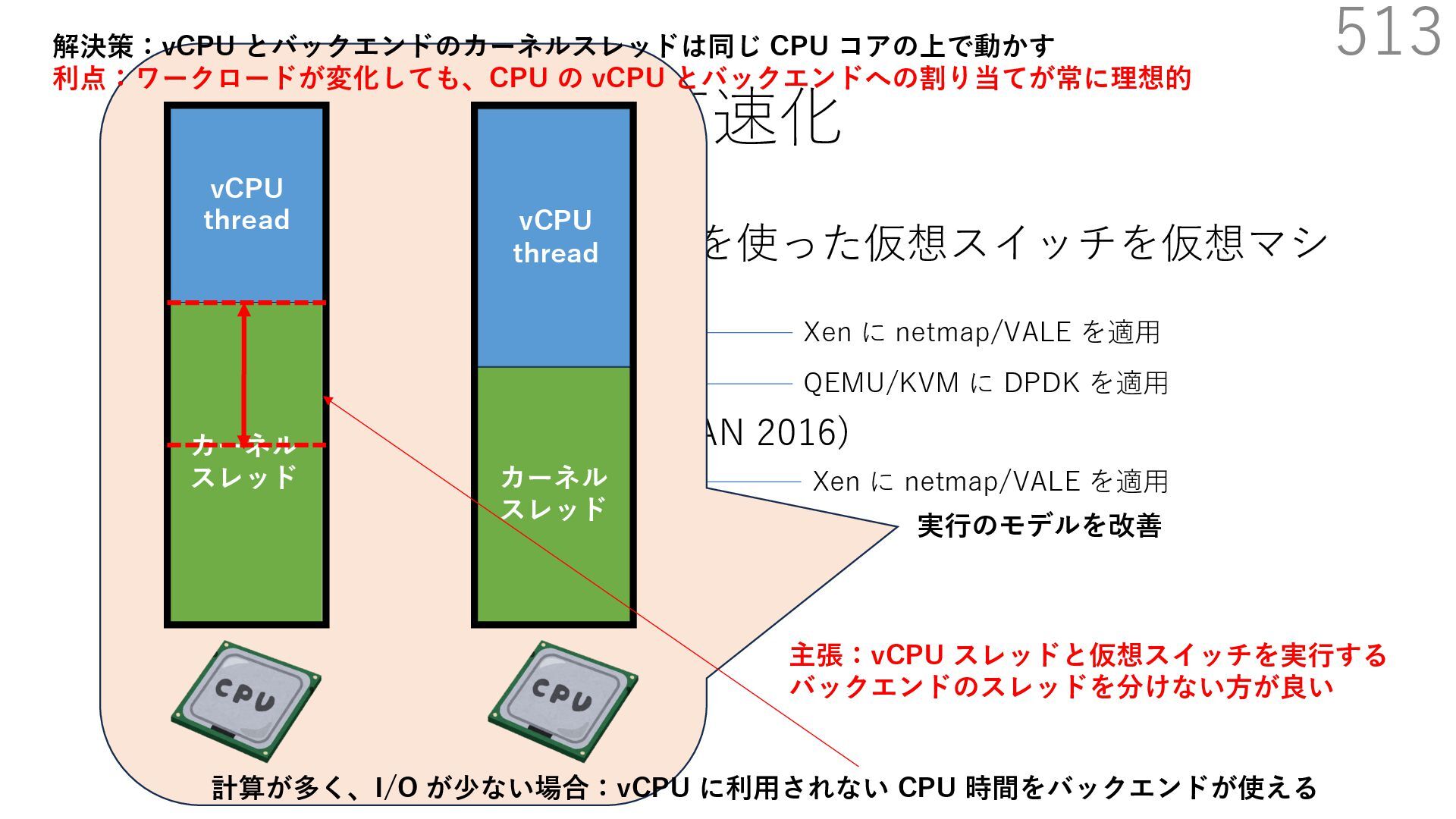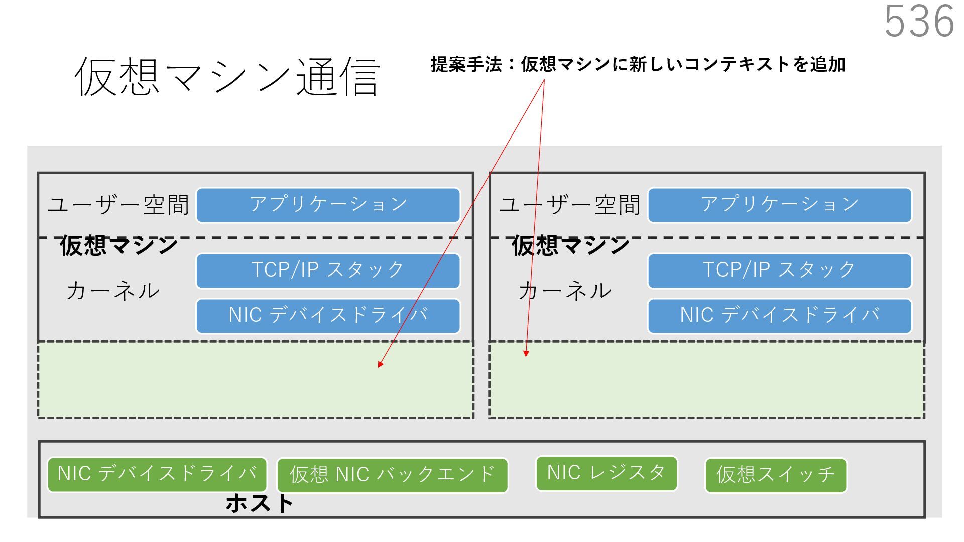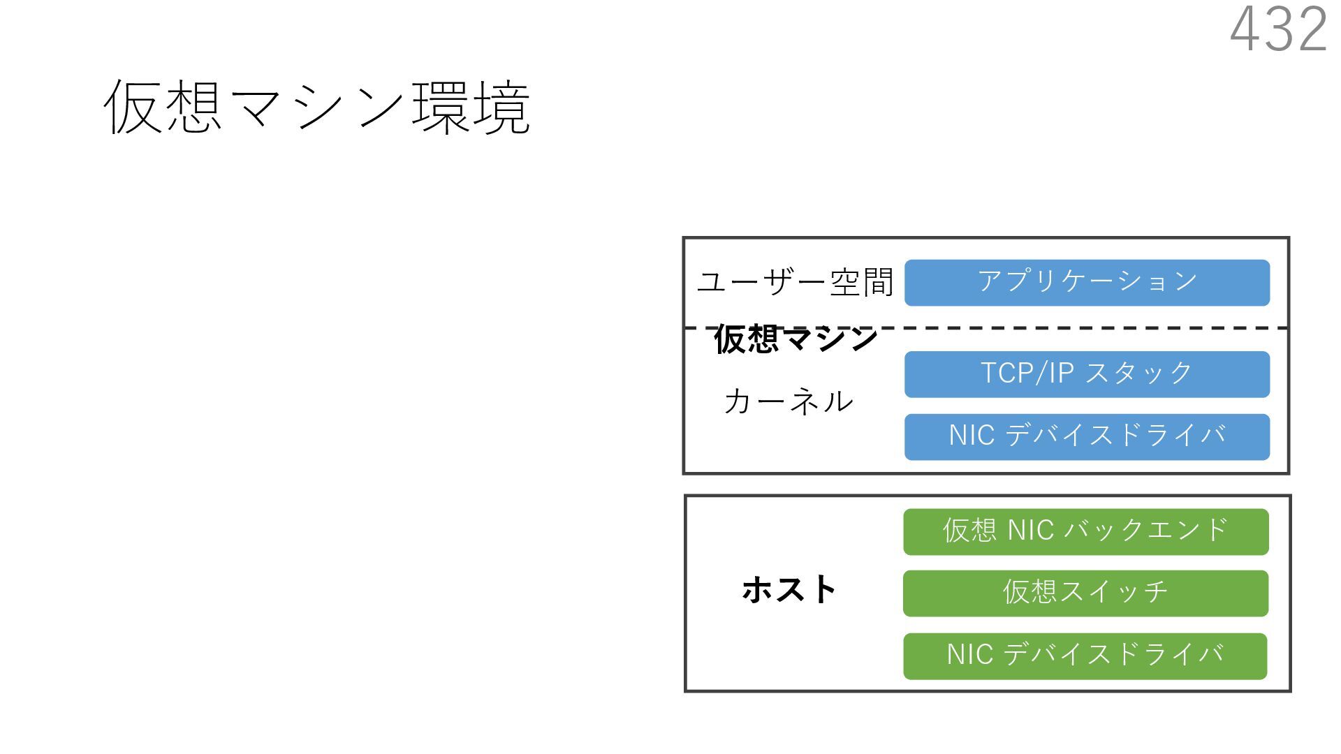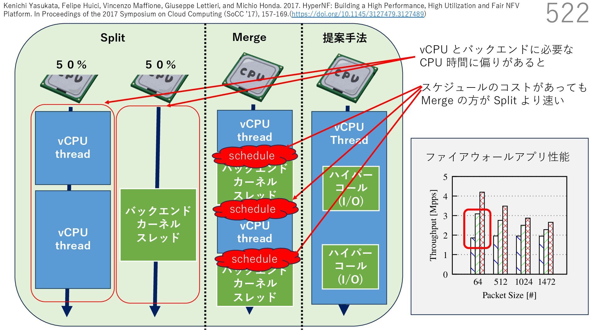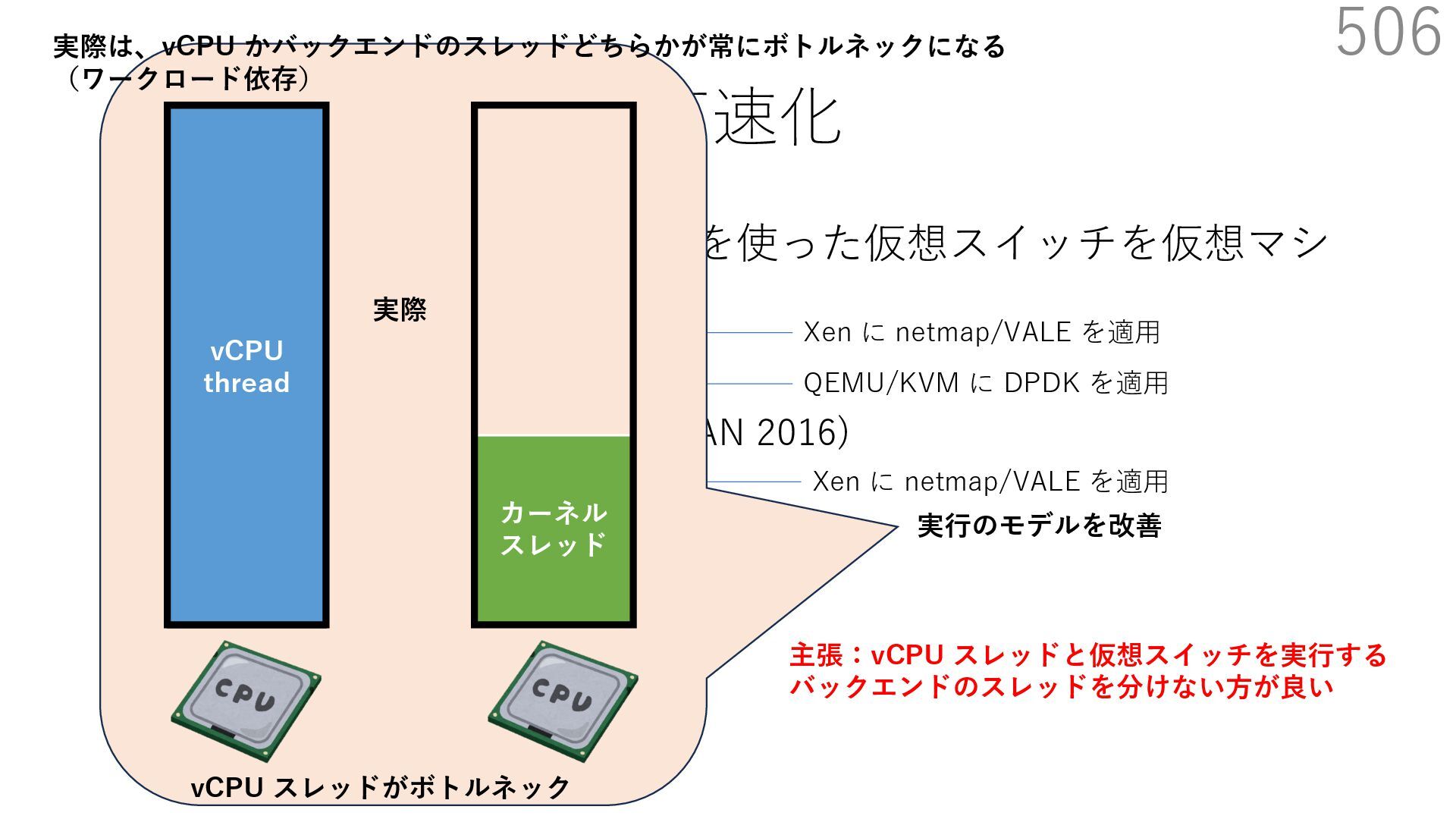 (SIGCOMM 2014) • mTCP (NSDI 2014) • Arrakis (OSDI 2014) • IX (OSDI 2014) • StackMap (USENIX ATC 2016) • Atlas (SIGCOMM 2017) • ZygOS (SOSP 2017) • Shenango (NSDI 2019) • Shinjuku (NSDI 2019) • TAS (EuroSys 2019) • Caladan (OSDI 2020) • Demikernel (SOSP 2021) 427 into a single library for both devices (e.g., RDMAxSPDK). We implemented the bulk of our library OS code in Rust. We initially prototyped several libOSes in C++; however, we found that Rust performs competitively with C++ and achieves ns-scale latencies while offering additional benefits. First, Rust enforces memory safety through language fea- tures and its compiler. Though our libOSes use unsafe code to bind to C/C++ kernel-bypass libraries and applications, User-space Software Kernel-space Software I/O Hardware I/O Device ??? libFuture ??? DPDK User I/O Buf. Mgmt libRDMA RDMA User I/O Buf. Mgmt Net. Trans. OS Kernel Control Path Demikernel Datapath Architecture App libPOSIX libDPDK SPDK User I/O Buf. Mgmt libSPDK Future Demikernel PDPIX Datapath API Figure 3. Demikernel kernel-bypass architecture. Demikernel ac- commodates heterogenous kernel-bypass devices, including poten- tial future hardware, with a flexible library OS-based datapath ar- chitecture.We include a libOS that goes through the OS kernel for 提案:異なるタイプのデバイスへ 共通のインターフェースからアクセス可能にする Irene Zhang, Amanda Raybuck, Pratyush Patel, Kirk Olynyk, Jacob Nelson, Omar S. Navarro Leija, Ashlie Martinez, Jing Liu, Anna Kornfeld Simpson, Sujay Jayakar, Pedro Henrique Penna, Max Demoulin, Piali Choudhury, and Anirudh Badam. 2021. The Demikernel Datapath OS Architecture for Microsecond-Scale Datacenter Systems. In Proceedings of the ACM Sigops 28th Symposium on Operating Systems Principles (SOSP ʼ21), 195-211.(https://doi.org/10.1145/3477132.3483569)