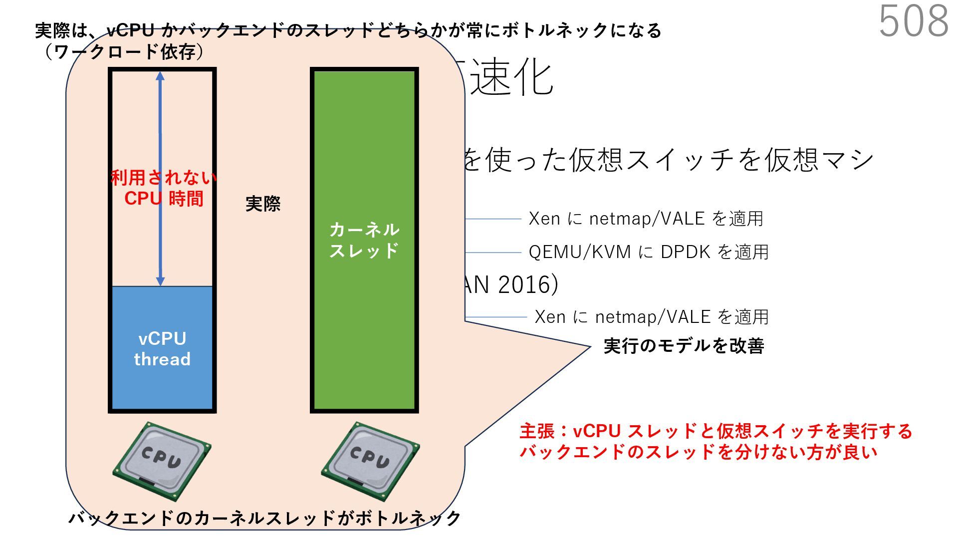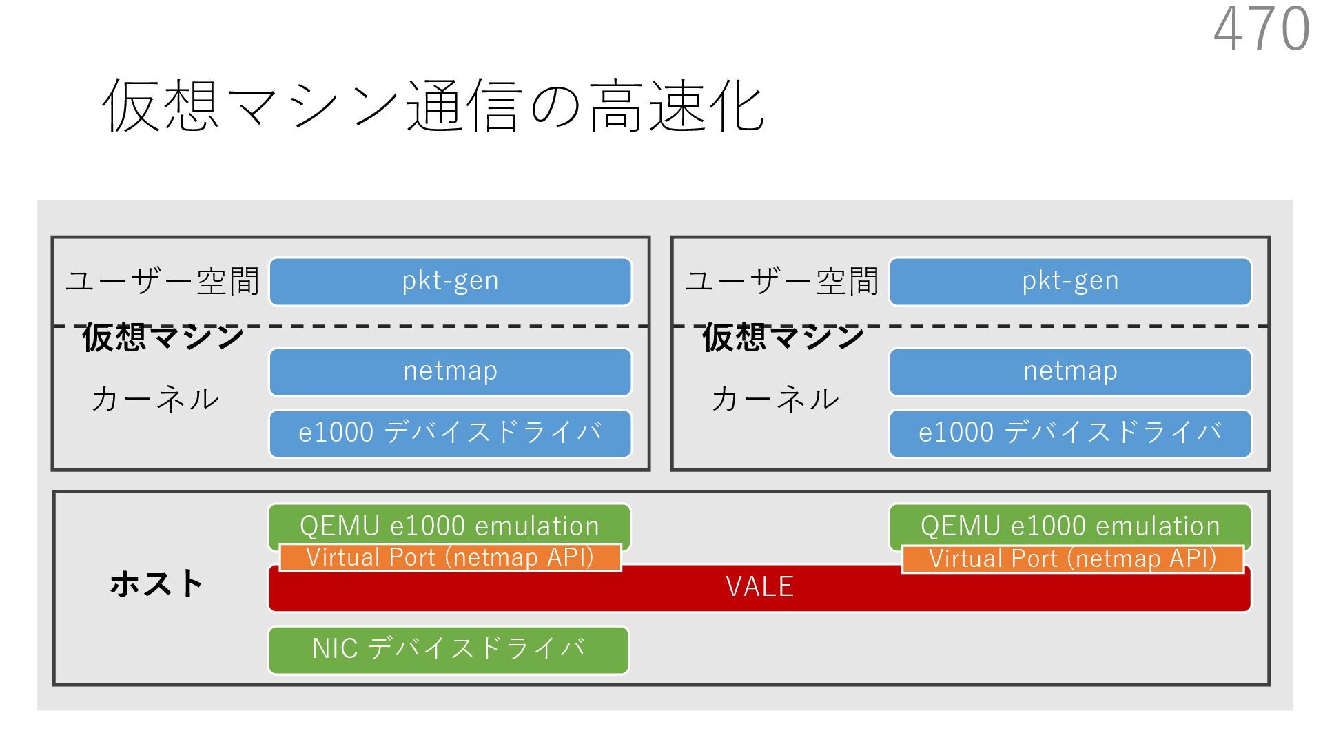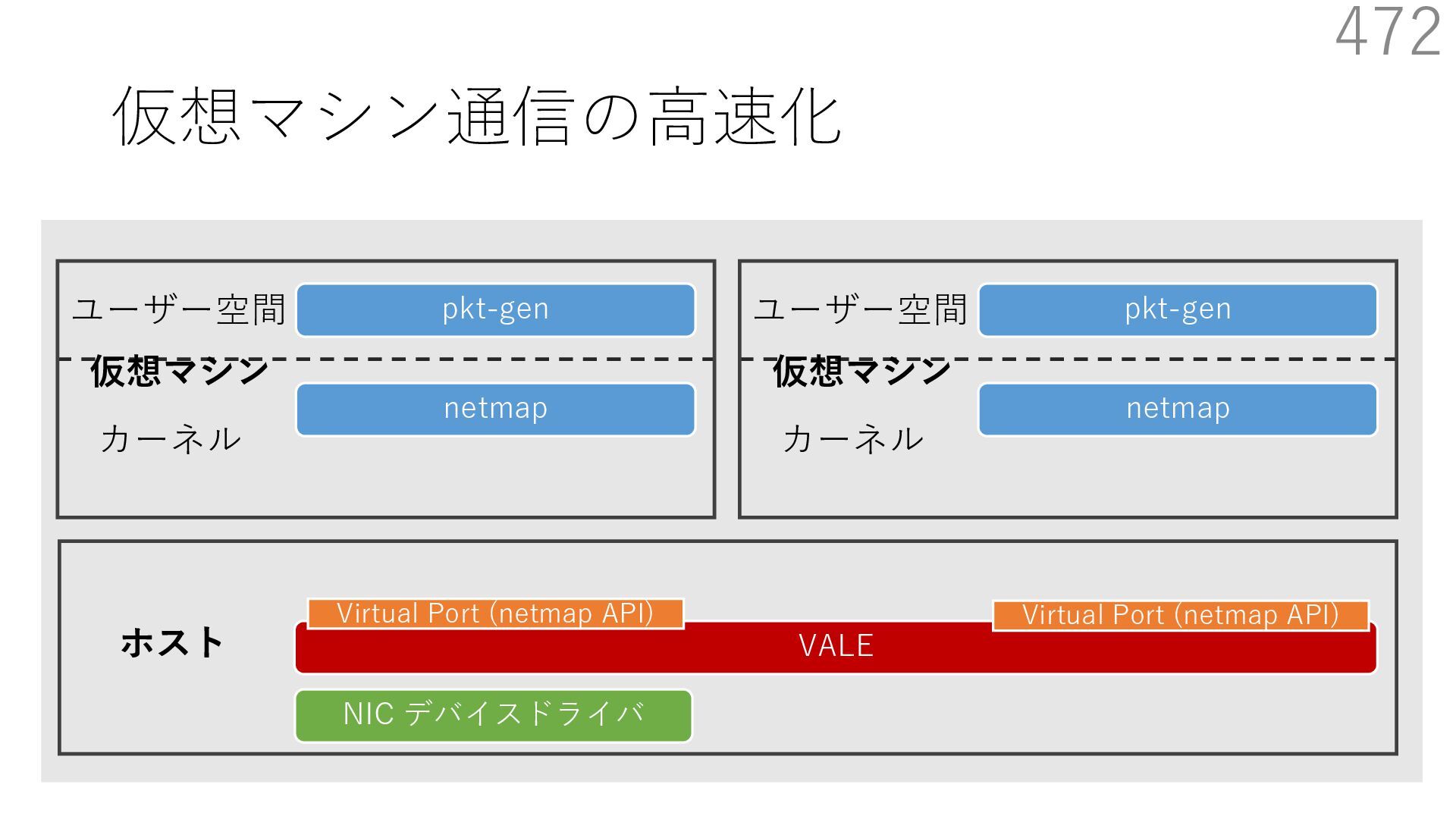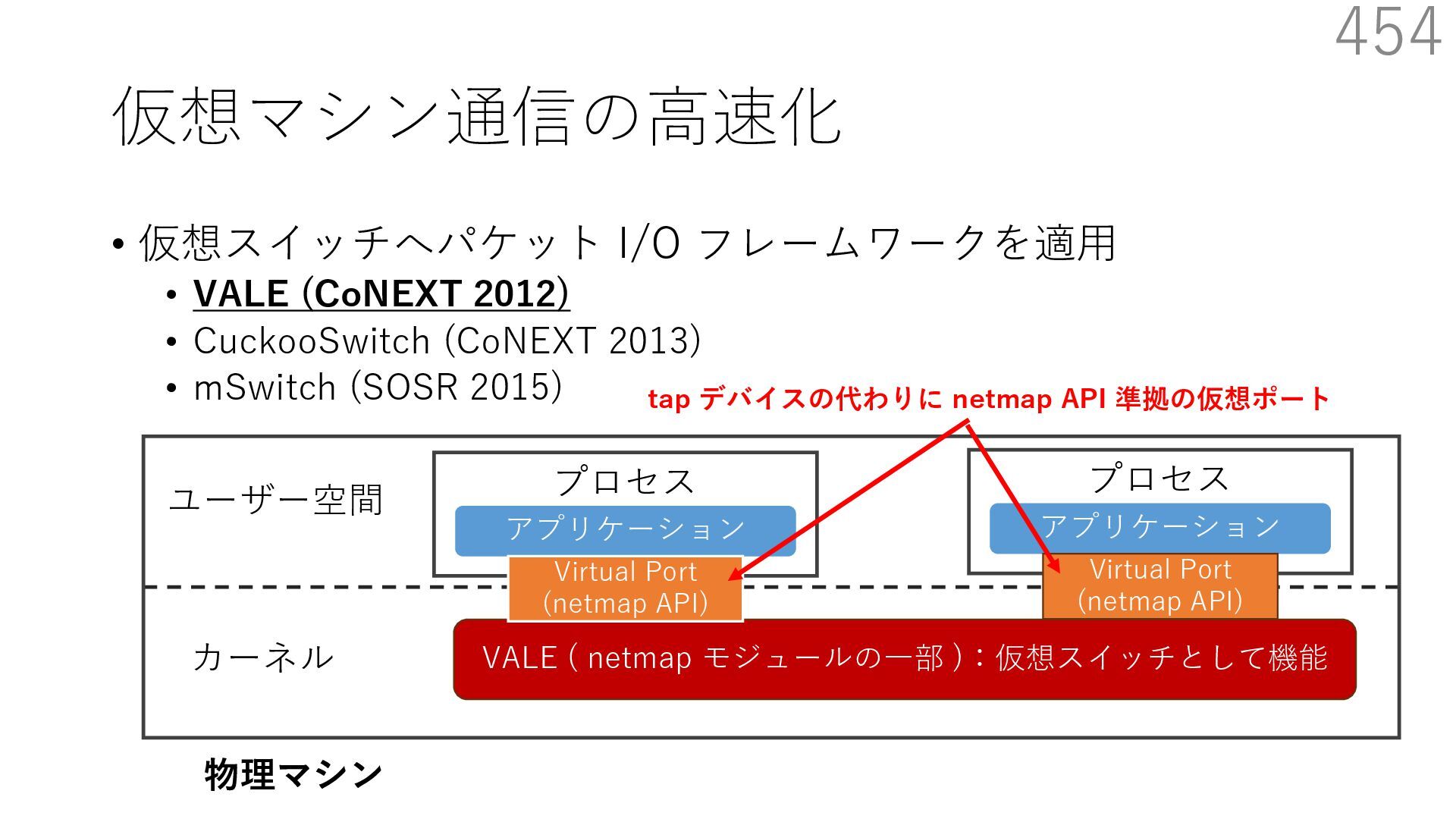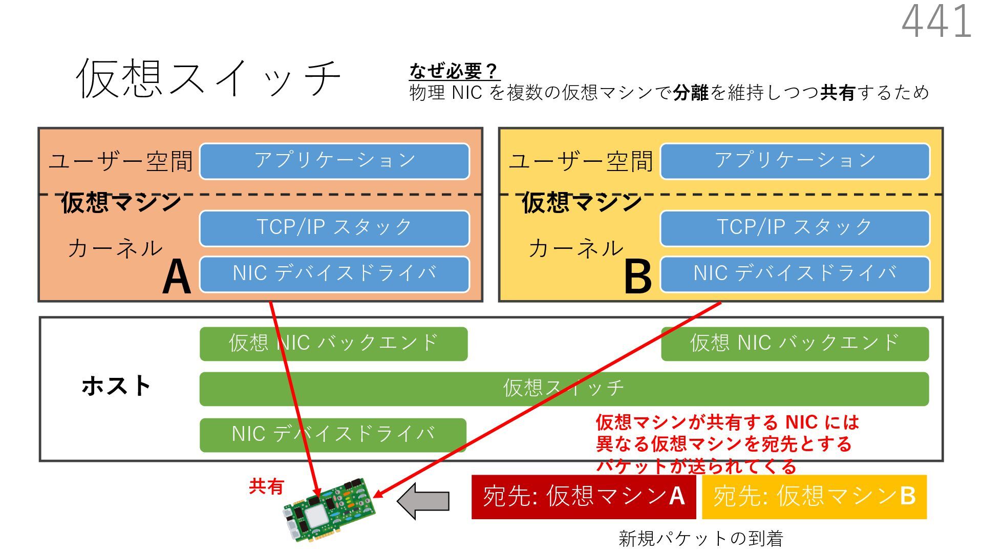(SIGCOMM 2014) • mTCP (NSDI 2014) • Arrakis (OSDI 2014) • IX (OSDI 2014) • StackMap (USENIX ATC 2016) • Atlas (SIGCOMM 2017) • ZygOS (SOSP 2017) • Shenango (NSDI 2019) • Shinjuku (NSDI 2019) • TAS (EuroSys 2019) • Caladan (OSDI 2020) • Demikernel (SOSP 2021) 427 into a single library for both devices (e.g., RDMAxSPDK). We implemented the bulk of our library OS code in Rust. We initially prototyped several libOSes in C++; however, we found that Rust performs competitively with C++ and achieves ns-scale latencies while offering additional benefits. First, Rust enforces memory safety through language fea- tures and its compiler. Though our libOSes use unsafe code to bind to C/C++ kernel-bypass libraries and applications, User-space Software Kernel-space Software I/O Hardware I/O Device ??? libFuture ??? DPDK User I/O Buf. Mgmt libRDMA RDMA User I/O Buf. Mgmt Net. Trans. OS Kernel Control Path Demikernel Datapath Architecture App libPOSIX libDPDK SPDK User I/O Buf. Mgmt libSPDK Future Demikernel PDPIX Datapath API Figure 3. Demikernel kernel-bypass architecture. Demikernel ac- commodates heterogenous kernel-bypass devices, including poten- tial future hardware, with a flexible library OS-based datapath ar- chitecture.We include a libOS that goes through the OS kernel for 提案:異なるタイプのデバイスへ 共通のインターフェースからアクセス可能にする Irene Zhang, Amanda Raybuck, Pratyush Patel, Kirk Olynyk, Jacob Nelson, Omar S. Navarro Leija, Ashlie Martinez, Jing Liu, Anna Kornfeld Simpson, Sujay Jayakar, Pedro Henrique Penna, Max Demoulin, Piali Choudhury, and Anirudh Badam. 2021. The Demikernel Datapath OS Architecture for Microsecond-Scale Datacenter Systems. In Proceedings of the ACM Sigops 28th Symposium on Operating Systems Principles (SOSP ʼ21), 195-211.(https://doi.org/10.1145/3477132.3483569)