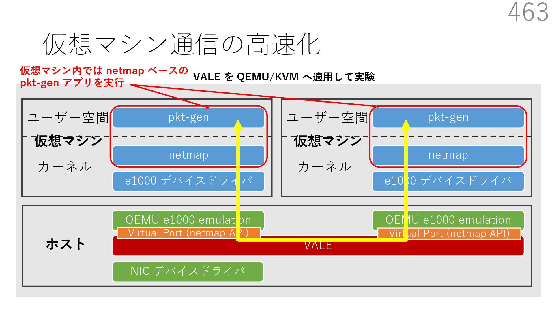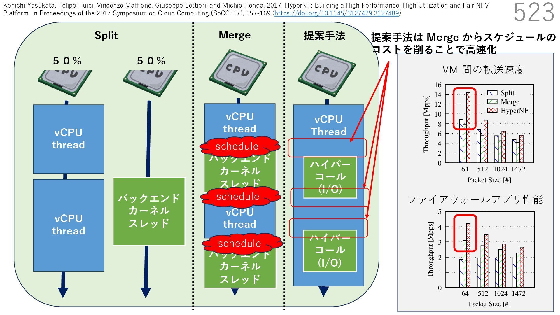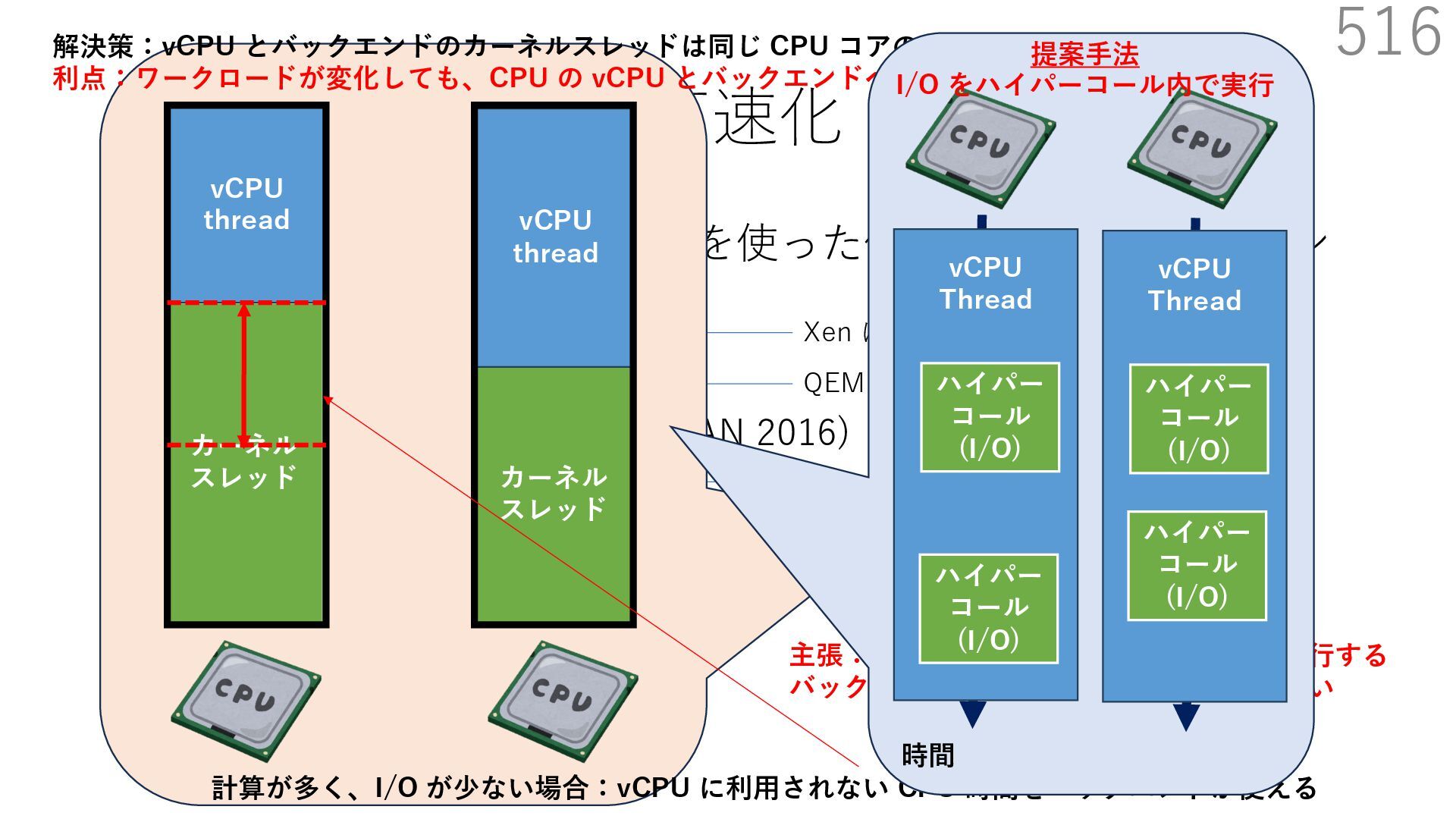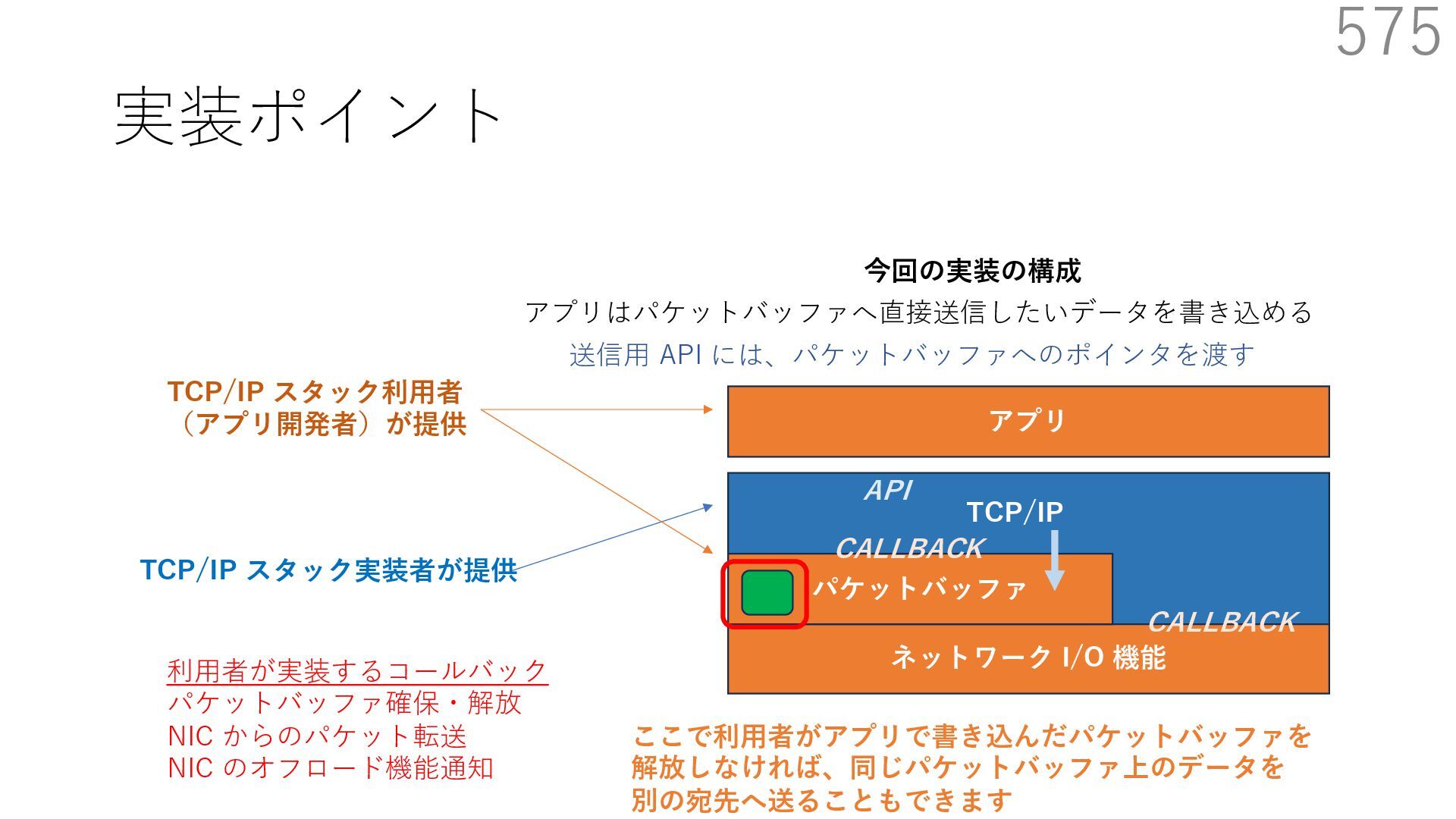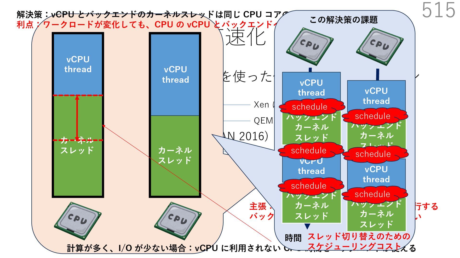 (SIGCOMM 2014) • mTCP (NSDI 2014) • Arrakis (OSDI 2014) • IX (OSDI 2014) • StackMap (USENIX ATC 2016) • Atlas (SIGCOMM 2017) • ZygOS (SOSP 2017) • Shenango (NSDI 2019) • Shinjuku (NSDI 2019) • TAS (EuroSys 2019) • Caladan (OSDI 2020) • Demikernel (SOSP 2021) 427 into a single library for both devices (e.g., RDMAxSPDK). We implemented the bulk of our library OS code in Rust. We initially prototyped several libOSes in C++; however, we found that Rust performs competitively with C++ and achieves ns-scale latencies while offering additional benefits. First, Rust enforces memory safety through language fea- tures and its compiler. Though our libOSes use unsafe code to bind to C/C++ kernel-bypass libraries and applications, User-space Software Kernel-space Software I/O Hardware I/O Device ??? libFuture ??? DPDK User I/O Buf. Mgmt libRDMA RDMA User I/O Buf. Mgmt Net. Trans. OS Kernel Control Path Demikernel Datapath Architecture App libPOSIX libDPDK SPDK User I/O Buf. Mgmt libSPDK Future Demikernel PDPIX Datapath API Figure 3. Demikernel kernel-bypass architecture. Demikernel ac- commodates heterogenous kernel-bypass devices, including poten- tial future hardware, with a flexible library OS-based datapath ar- chitecture.We include a libOS that goes through the OS kernel for 提案:異なるタイプのデバイスへ 共通のインターフェースからアクセス可能にする Irene Zhang, Amanda Raybuck, Pratyush Patel, Kirk Olynyk, Jacob Nelson, Omar S. Navarro Leija, Ashlie Martinez, Jing Liu, Anna Kornfeld Simpson, Sujay Jayakar, Pedro Henrique Penna, Max Demoulin, Piali Choudhury, and Anirudh Badam. 2021. The Demikernel Datapath OS Architecture for Microsecond-Scale Datacenter Systems. In Proceedings of the ACM Sigops 28th Symposium on Operating Systems Principles (SOSP ʼ21), 195-211.(https://doi.org/10.1145/3477132.3483569)