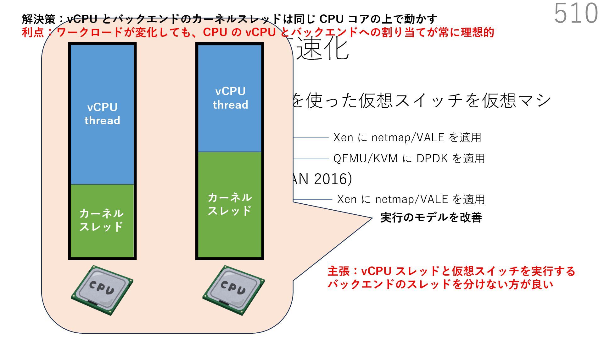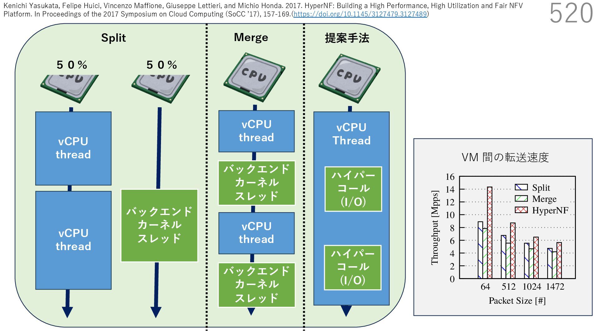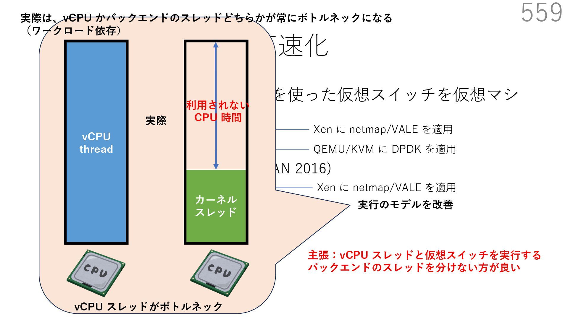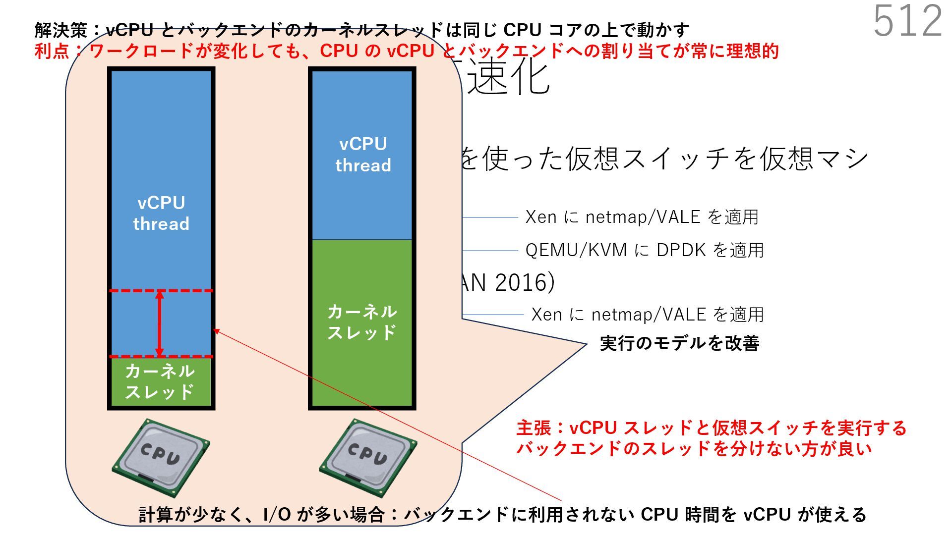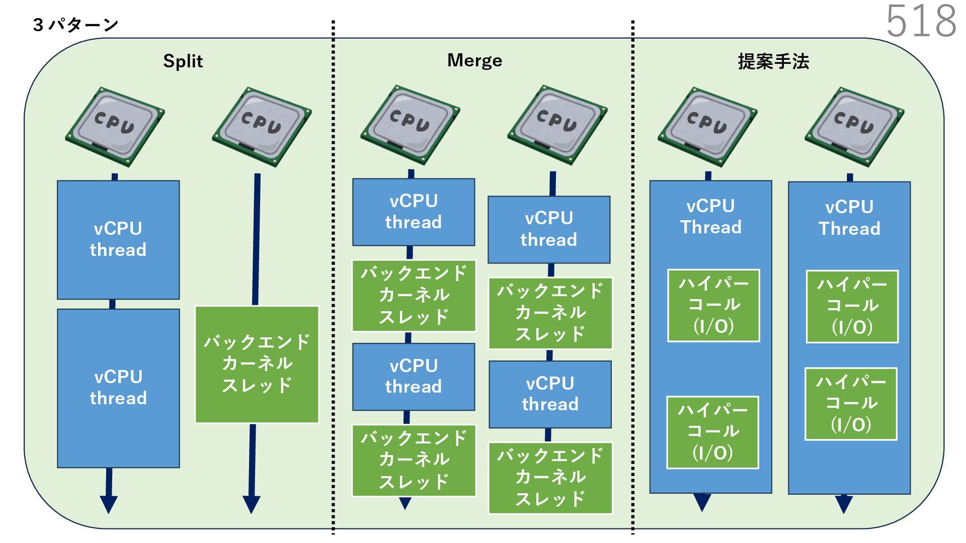 (SIGCOMM 2014) • mTCP (NSDI 2014) • Arrakis (OSDI 2014) • IX (OSDI 2014) • StackMap (USENIX ATC 2016) • Atlas (SIGCOMM 2017) • ZygOS (SOSP 2017) • Shenango (NSDI 2019) • Shinjuku (NSDI 2019) • TAS (EuroSys 2019) • Caladan (OSDI 2020) • Demikernel (SOSP 2021) 427 into a single library for both devices (e.g., RDMAxSPDK). We implemented the bulk of our library OS code in Rust. We initially prototyped several libOSes in C++; however, we found that Rust performs competitively with C++ and achieves ns-scale latencies while offering additional benefits. First, Rust enforces memory safety through language fea- tures and its compiler. Though our libOSes use unsafe code to bind to C/C++ kernel-bypass libraries and applications, User-space Software Kernel-space Software I/O Hardware I/O Device ??? libFuture ??? DPDK User I/O Buf. Mgmt libRDMA RDMA User I/O Buf. Mgmt Net. Trans. OS Kernel Control Path Demikernel Datapath Architecture App libPOSIX libDPDK SPDK User I/O Buf. Mgmt libSPDK Future Demikernel PDPIX Datapath API Figure 3. Demikernel kernel-bypass architecture. Demikernel ac- commodates heterogenous kernel-bypass devices, including poten- tial future hardware, with a flexible library OS-based datapath ar- chitecture.We include a libOS that goes through the OS kernel for 提案:異なるタイプのデバイスへ 共通のインターフェースからアクセス可能にする Irene Zhang, Amanda Raybuck, Pratyush Patel, Kirk Olynyk, Jacob Nelson, Omar S. Navarro Leija, Ashlie Martinez, Jing Liu, Anna Kornfeld Simpson, Sujay Jayakar, Pedro Henrique Penna, Max Demoulin, Piali Choudhury, and Anirudh Badam. 2021. The Demikernel Datapath OS Architecture for Microsecond-Scale Datacenter Systems. In Proceedings of the ACM Sigops 28th Symposium on Operating Systems Principles (SOSP ʼ21), 195-211.(https://doi.org/10.1145/3477132.3483569)