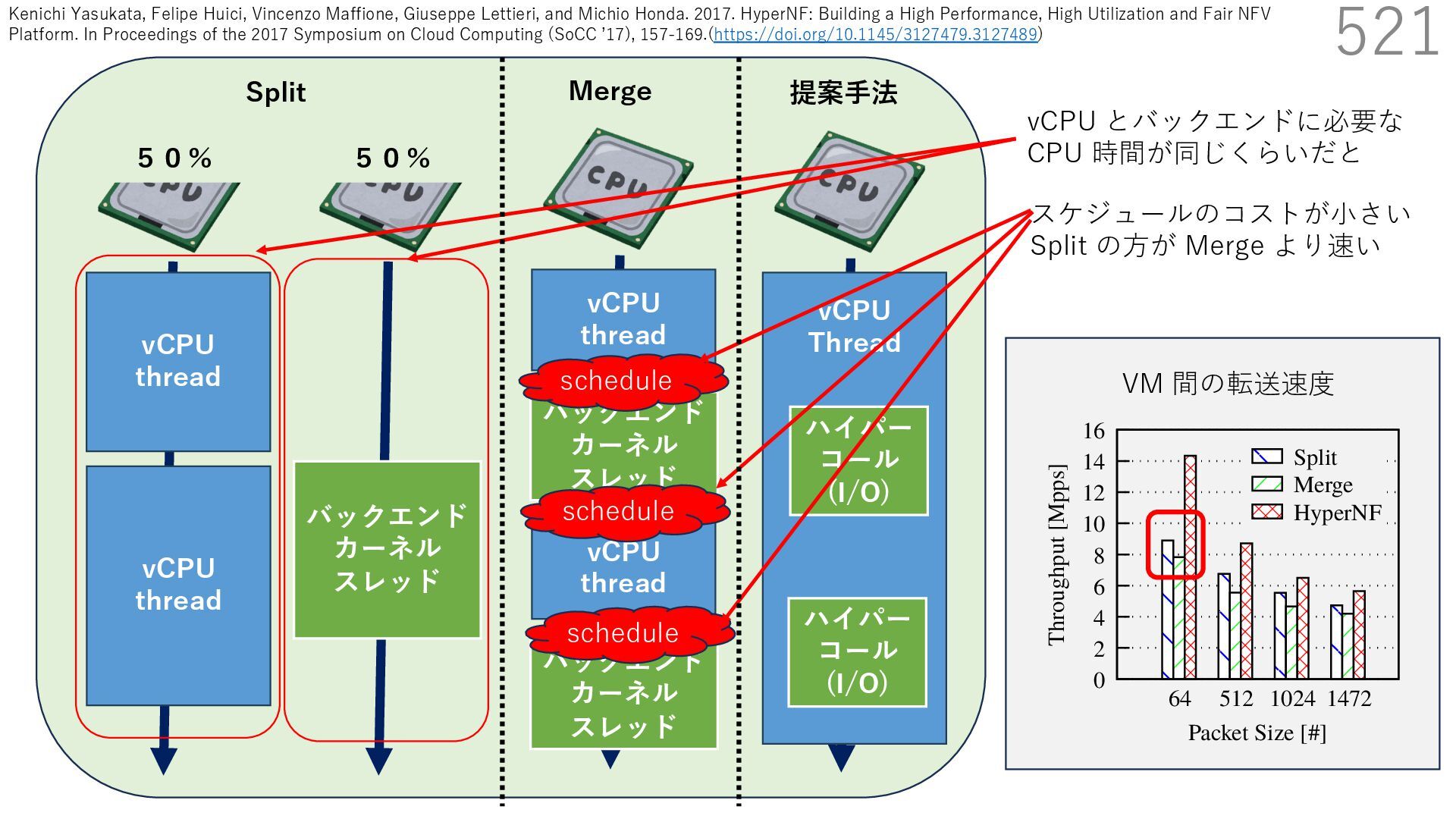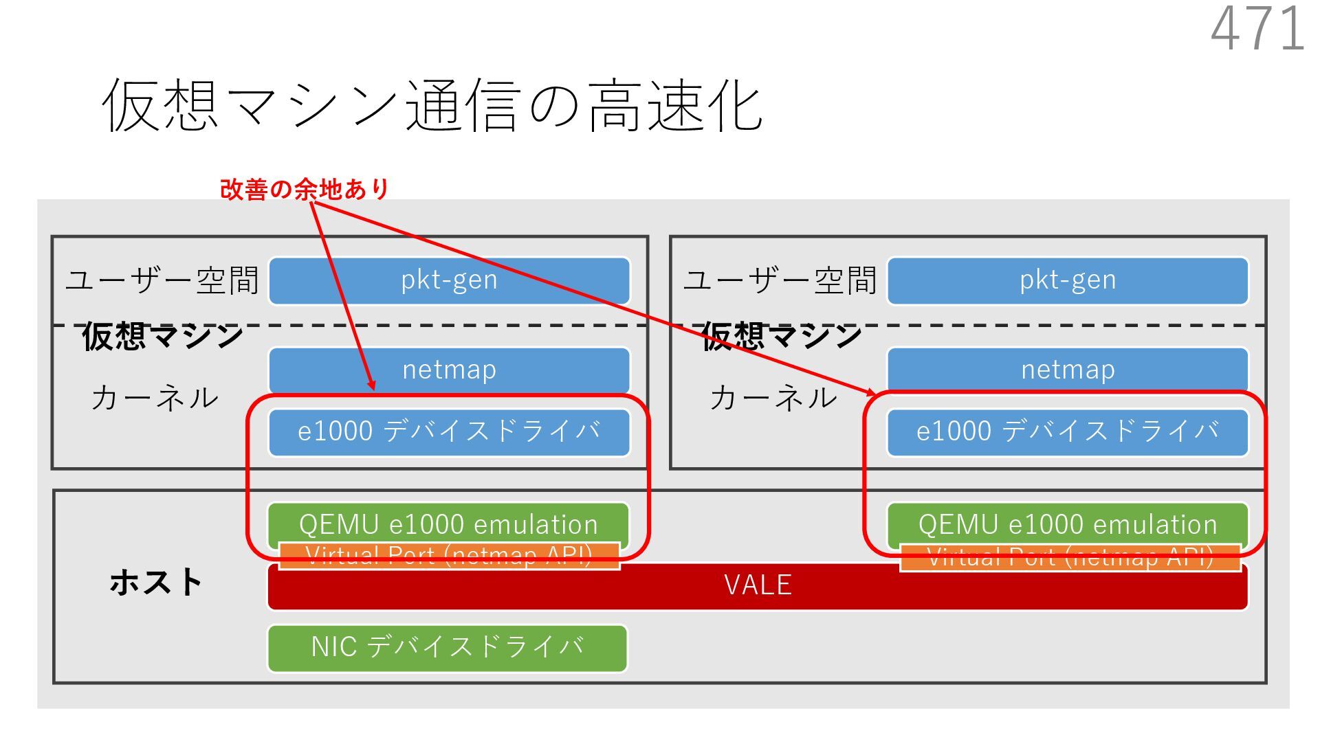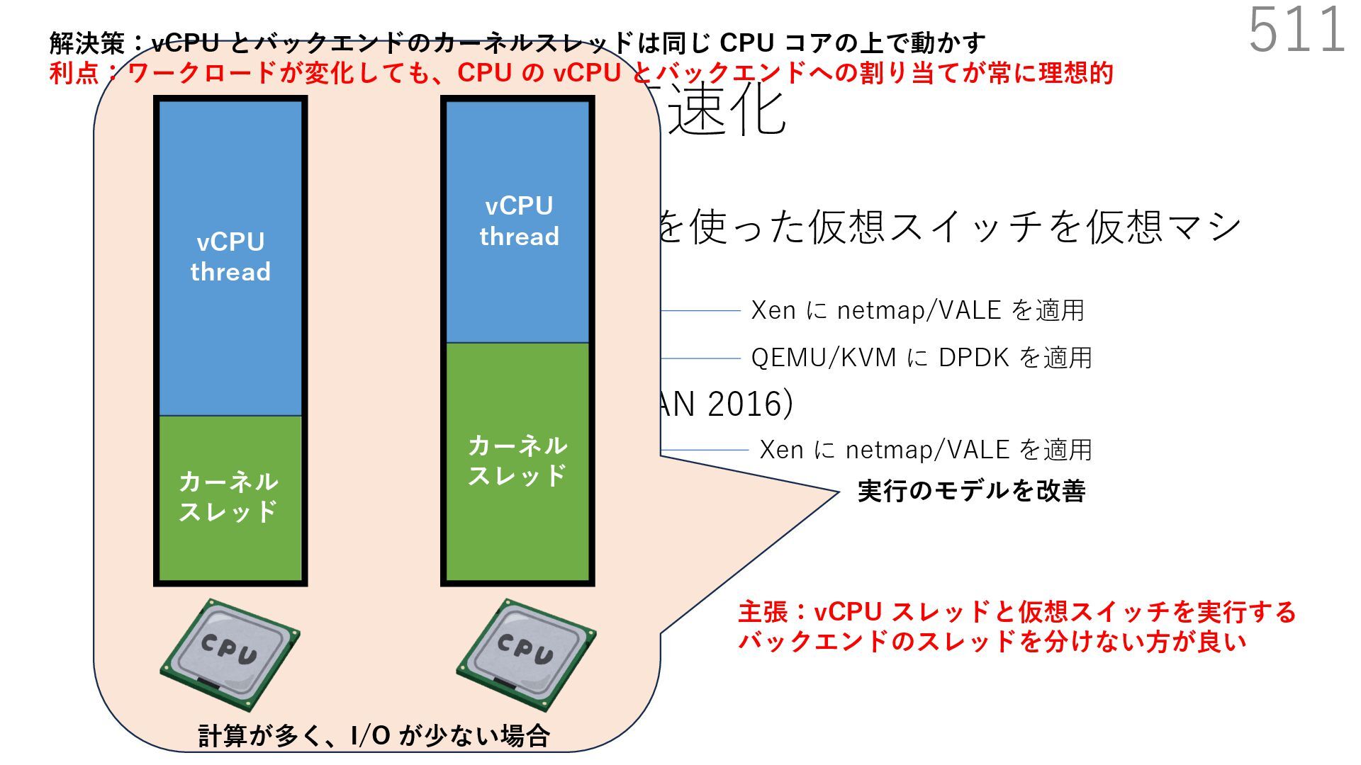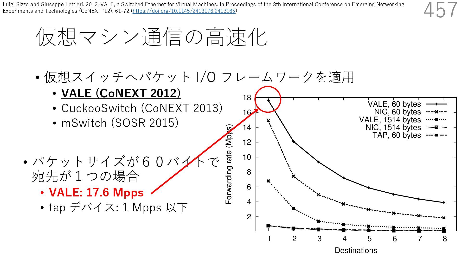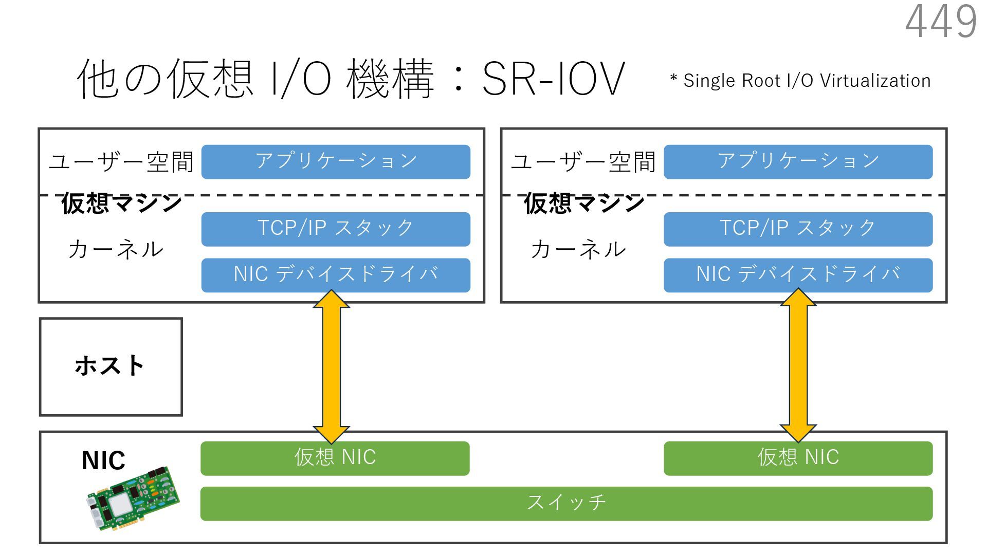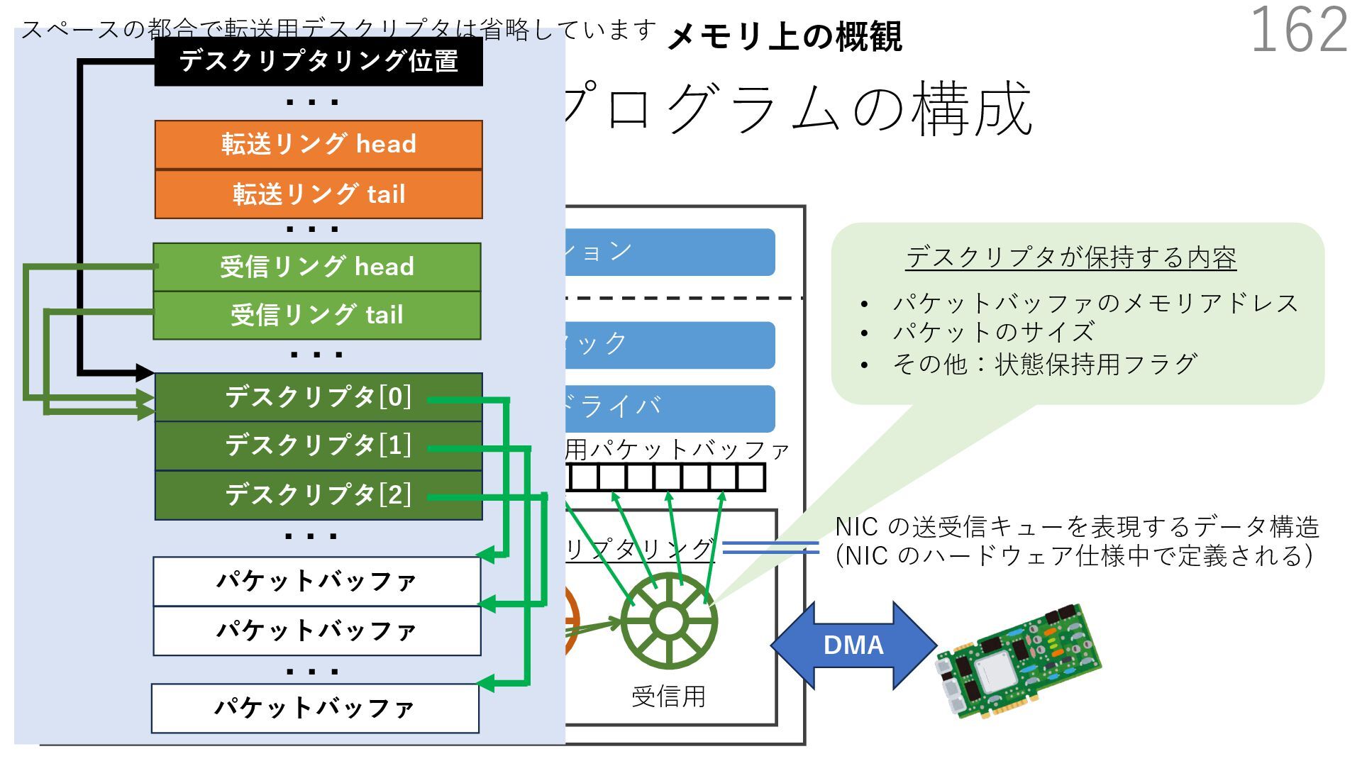 (SIGCOMM 2014) • mTCP (NSDI 2014) • Arrakis (OSDI 2014) • IX (OSDI 2014) • StackMap (USENIX ATC 2016) • Atlas (SIGCOMM 2017) • ZygOS (SOSP 2017) • Shenango (NSDI 2019) • Shinjuku (NSDI 2019) • TAS (EuroSys 2019) • Caladan (OSDI 2020) • Demikernel (SOSP 2021) 427 into a single library for both devices (e.g., RDMAxSPDK). We implemented the bulk of our library OS code in Rust. We initially prototyped several libOSes in C++; however, we found that Rust performs competitively with C++ and achieves ns-scale latencies while offering additional benefits. First, Rust enforces memory safety through language fea- tures and its compiler. Though our libOSes use unsafe code to bind to C/C++ kernel-bypass libraries and applications, User-space Software Kernel-space Software I/O Hardware I/O Device ??? libFuture ??? DPDK User I/O Buf. Mgmt libRDMA RDMA User I/O Buf. Mgmt Net. Trans. OS Kernel Control Path Demikernel Datapath Architecture App libPOSIX libDPDK SPDK User I/O Buf. Mgmt libSPDK Future Demikernel PDPIX Datapath API Figure 3. Demikernel kernel-bypass architecture. Demikernel ac- commodates heterogenous kernel-bypass devices, including poten- tial future hardware, with a flexible library OS-based datapath ar- chitecture.We include a libOS that goes through the OS kernel for 提案:異なるタイプのデバイスへ 共通のインターフェースからアクセス可能にする Irene Zhang, Amanda Raybuck, Pratyush Patel, Kirk Olynyk, Jacob Nelson, Omar S. Navarro Leija, Ashlie Martinez, Jing Liu, Anna Kornfeld Simpson, Sujay Jayakar, Pedro Henrique Penna, Max Demoulin, Piali Choudhury, and Anirudh Badam. 2021. The Demikernel Datapath OS Architecture for Microsecond-Scale Datacenter Systems. In Proceedings of the ACM Sigops 28th Symposium on Operating Systems Principles (SOSP ʼ21), 195-211.(https://doi.org/10.1145/3477132.3483569)