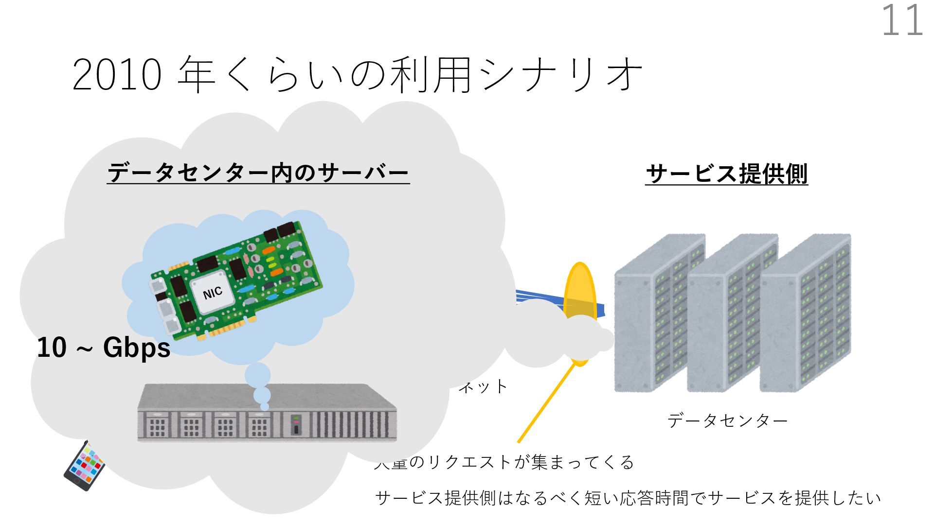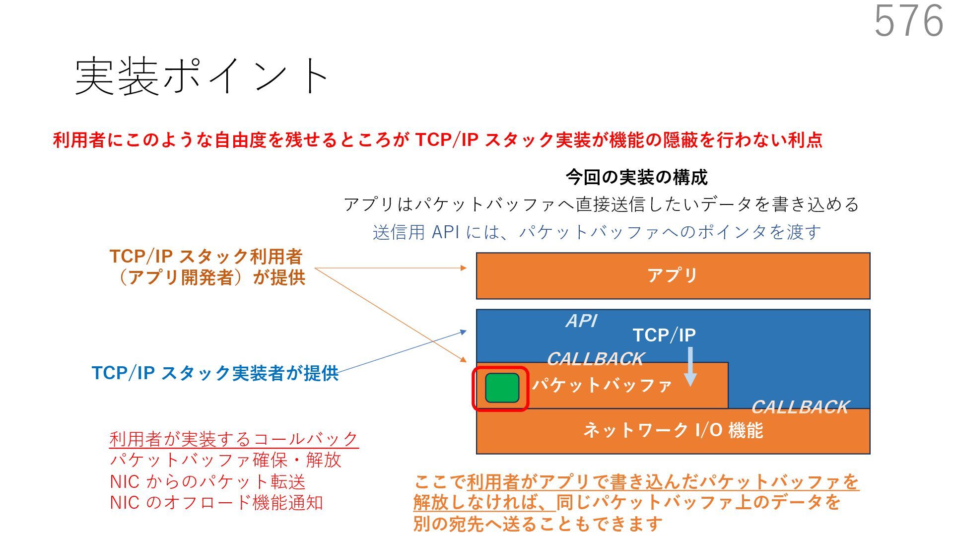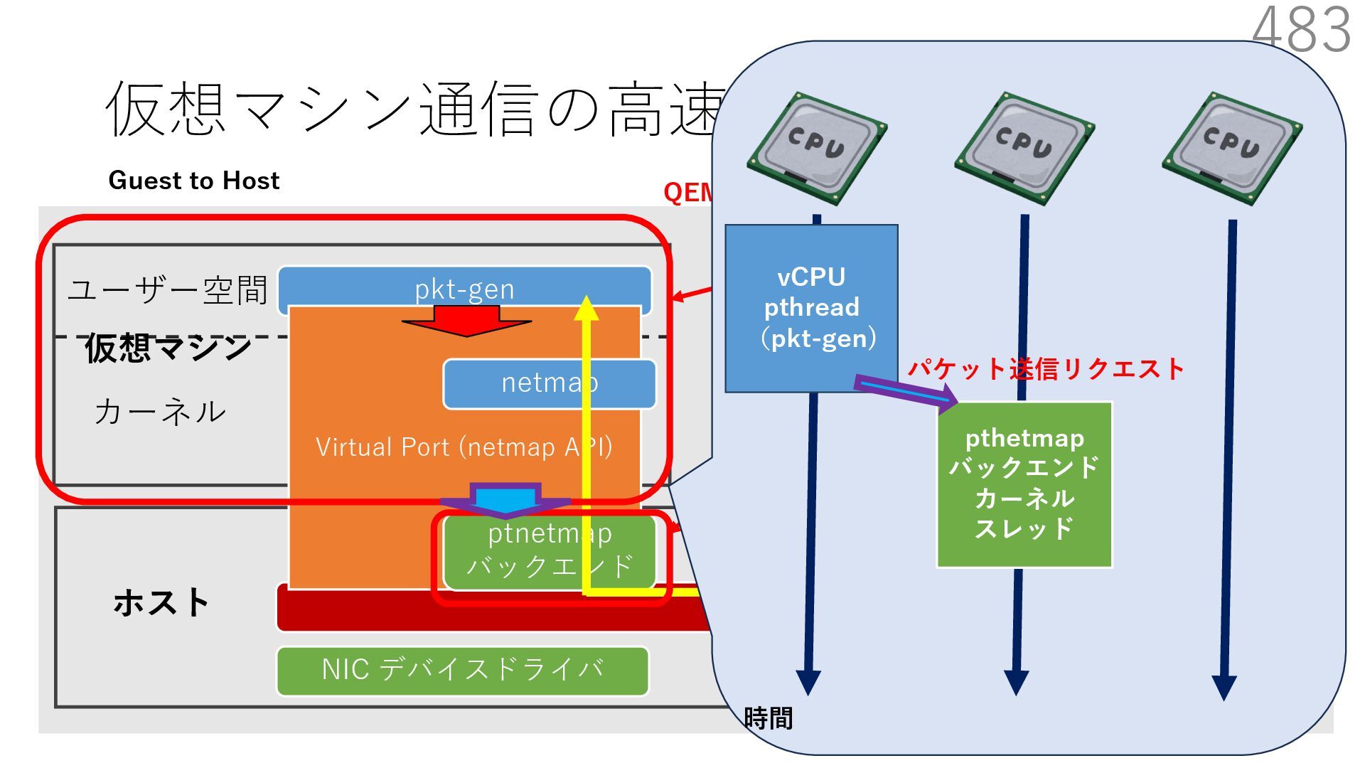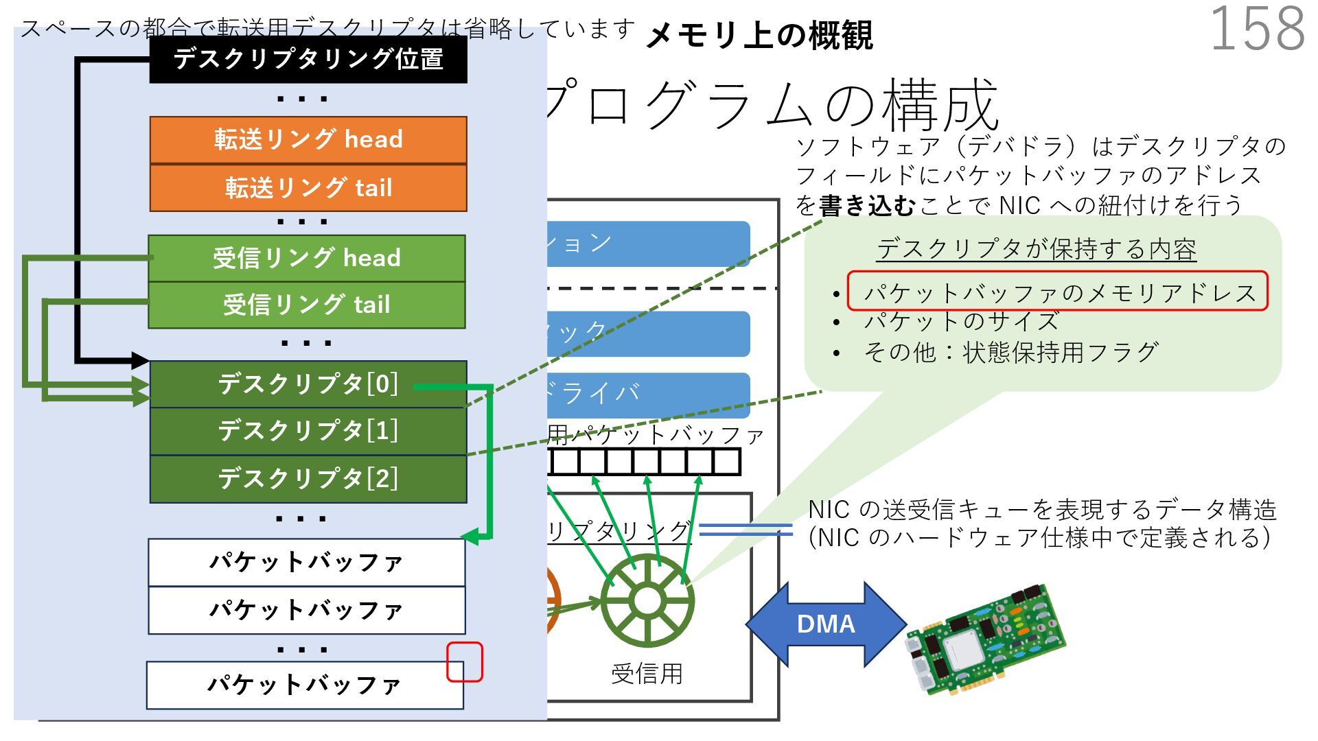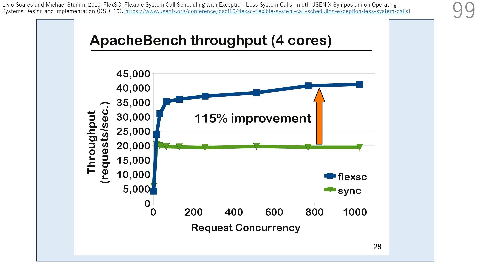 (SIGCOMM 2014) • mTCP (NSDI 2014) • Arrakis (OSDI 2014) • IX (OSDI 2014) • StackMap (USENIX ATC 2016) • Atlas (SIGCOMM 2017) • ZygOS (SOSP 2017) • Shenango (NSDI 2019) • Shinjuku (NSDI 2019) • TAS (EuroSys 2019) • Caladan (OSDI 2020) • Demikernel (SOSP 2021) 427 into a single library for both devices (e.g., RDMAxSPDK). We implemented the bulk of our library OS code in Rust. We initially prototyped several libOSes in C++; however, we found that Rust performs competitively with C++ and achieves ns-scale latencies while offering additional benefits. First, Rust enforces memory safety through language fea- tures and its compiler. Though our libOSes use unsafe code to bind to C/C++ kernel-bypass libraries and applications, User-space Software Kernel-space Software I/O Hardware I/O Device ??? libFuture ??? DPDK User I/O Buf. Mgmt libRDMA RDMA User I/O Buf. Mgmt Net. Trans. OS Kernel Control Path Demikernel Datapath Architecture App libPOSIX libDPDK SPDK User I/O Buf. Mgmt libSPDK Future Demikernel PDPIX Datapath API Figure 3. Demikernel kernel-bypass architecture. Demikernel ac- commodates heterogenous kernel-bypass devices, including poten- tial future hardware, with a flexible library OS-based datapath ar- chitecture.We include a libOS that goes through the OS kernel for 提案:異なるタイプのデバイスへ 共通のインターフェースからアクセス可能にする Irene Zhang, Amanda Raybuck, Pratyush Patel, Kirk Olynyk, Jacob Nelson, Omar S. Navarro Leija, Ashlie Martinez, Jing Liu, Anna Kornfeld Simpson, Sujay Jayakar, Pedro Henrique Penna, Max Demoulin, Piali Choudhury, and Anirudh Badam. 2021. The Demikernel Datapath OS Architecture for Microsecond-Scale Datacenter Systems. In Proceedings of the ACM Sigops 28th Symposium on Operating Systems Principles (SOSP ʼ21), 195-211.(https://doi.org/10.1145/3477132.3483569)