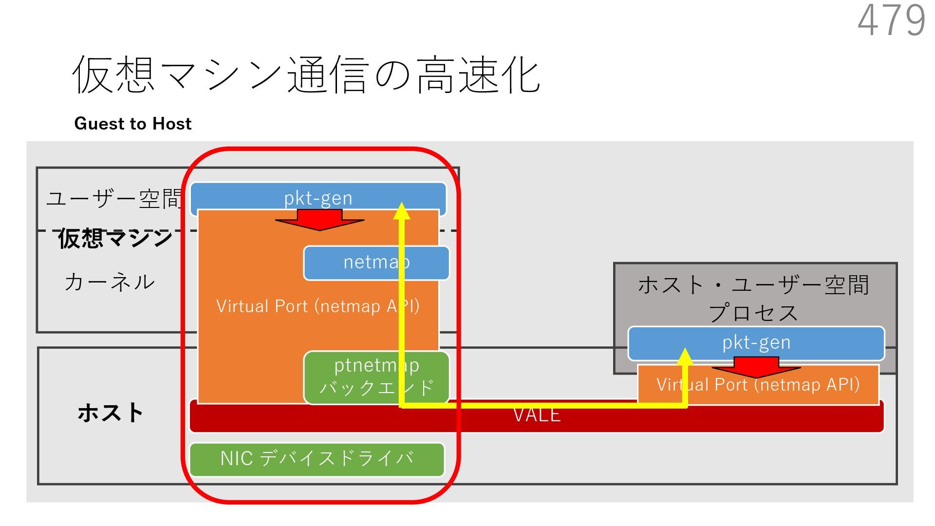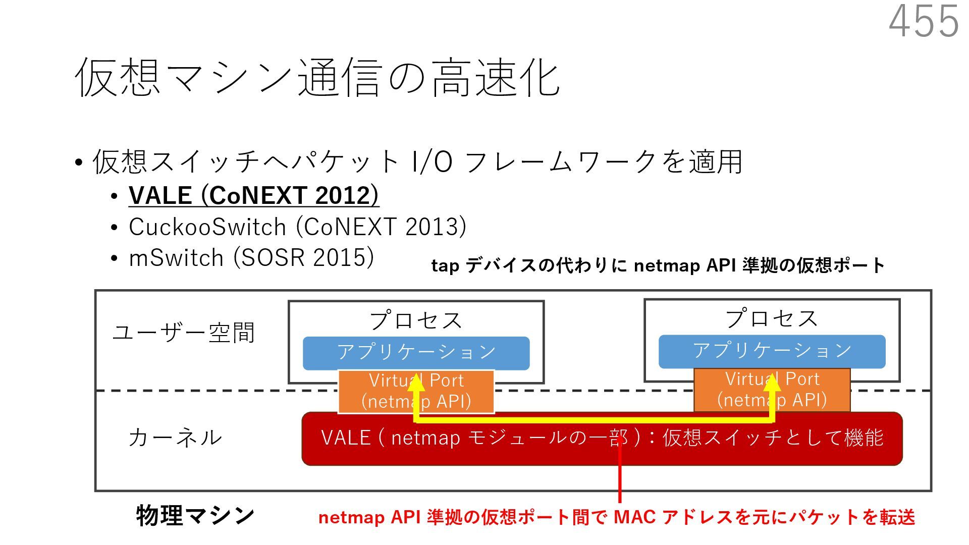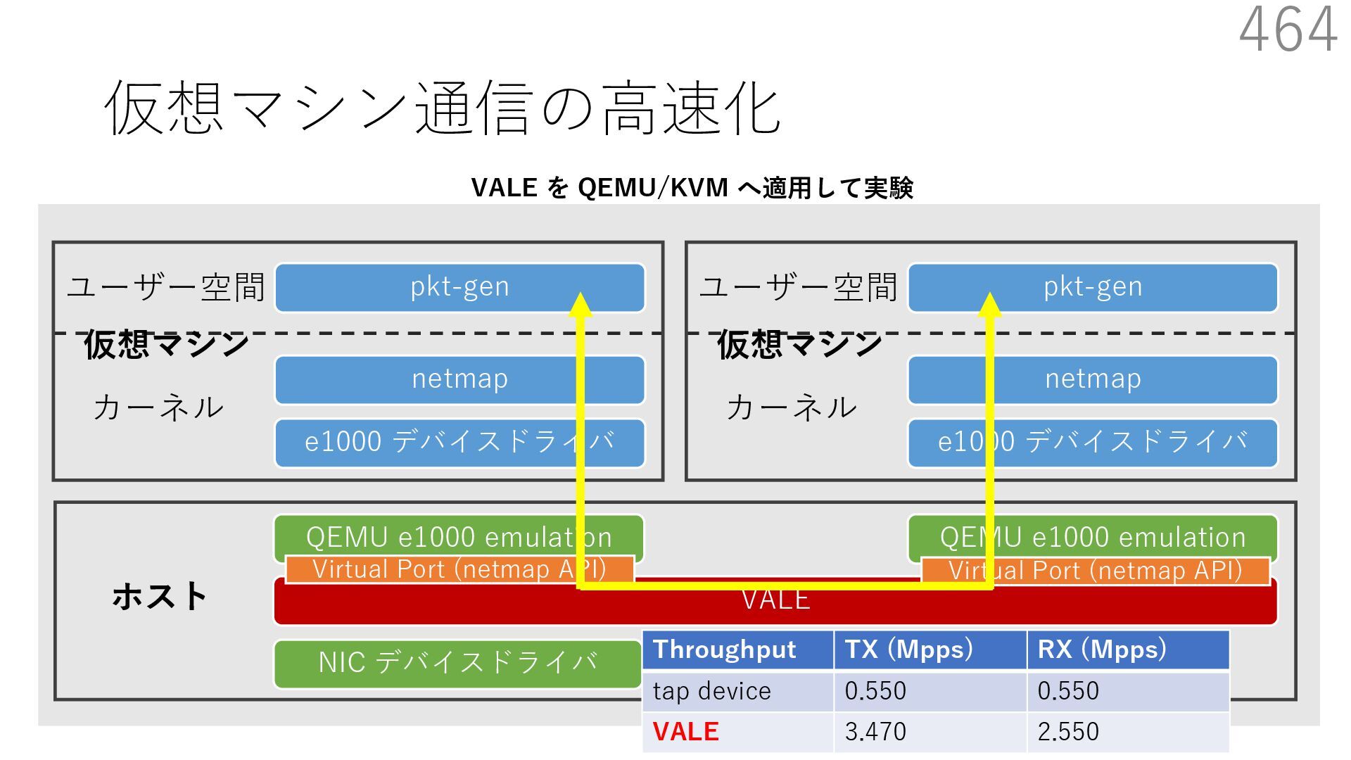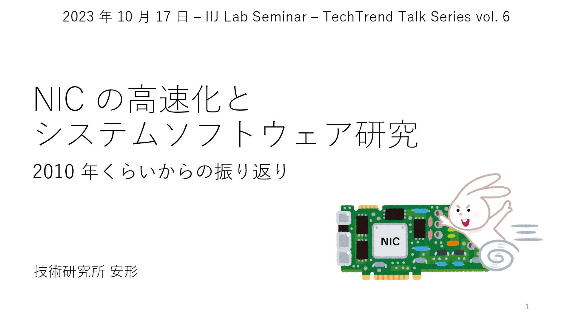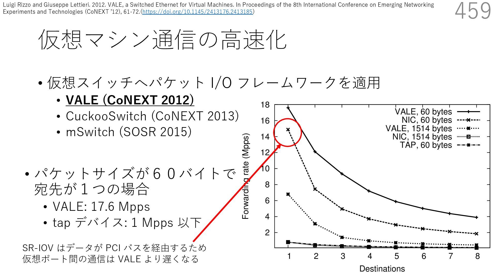 (SIGCOMM 2014) • mTCP (NSDI 2014) • Arrakis (OSDI 2014) • IX (OSDI 2014) • StackMap (USENIX ATC 2016) • Atlas (SIGCOMM 2017) • ZygOS (SOSP 2017) • Shenango (NSDI 2019) • Shinjuku (NSDI 2019) • TAS (EuroSys 2019) • Caladan (OSDI 2020) • Demikernel (SOSP 2021) 427 into a single library for both devices (e.g., RDMAxSPDK). We implemented the bulk of our library OS code in Rust. We initially prototyped several libOSes in C++; however, we found that Rust performs competitively with C++ and achieves ns-scale latencies while offering additional benefits. First, Rust enforces memory safety through language fea- tures and its compiler. Though our libOSes use unsafe code to bind to C/C++ kernel-bypass libraries and applications, User-space Software Kernel-space Software I/O Hardware I/O Device ??? libFuture ??? DPDK User I/O Buf. Mgmt libRDMA RDMA User I/O Buf. Mgmt Net. Trans. OS Kernel Control Path Demikernel Datapath Architecture App libPOSIX libDPDK SPDK User I/O Buf. Mgmt libSPDK Future Demikernel PDPIX Datapath API Figure 3. Demikernel kernel-bypass architecture. Demikernel ac- commodates heterogenous kernel-bypass devices, including poten- tial future hardware, with a flexible library OS-based datapath ar- chitecture.We include a libOS that goes through the OS kernel for 提案:異なるタイプのデバイスへ 共通のインターフェースからアクセス可能にする Irene Zhang, Amanda Raybuck, Pratyush Patel, Kirk Olynyk, Jacob Nelson, Omar S. Navarro Leija, Ashlie Martinez, Jing Liu, Anna Kornfeld Simpson, Sujay Jayakar, Pedro Henrique Penna, Max Demoulin, Piali Choudhury, and Anirudh Badam. 2021. The Demikernel Datapath OS Architecture for Microsecond-Scale Datacenter Systems. In Proceedings of the ACM Sigops 28th Symposium on Operating Systems Principles (SOSP ʼ21), 195-211.(https://doi.org/10.1145/3477132.3483569)