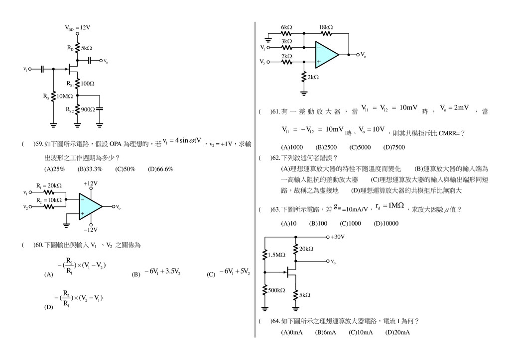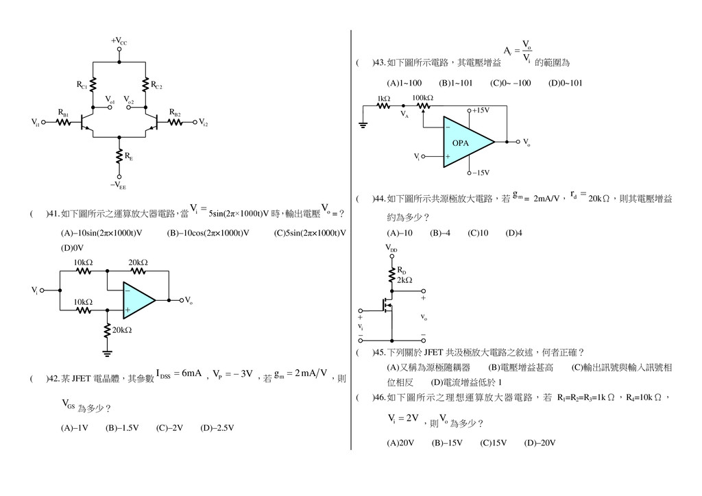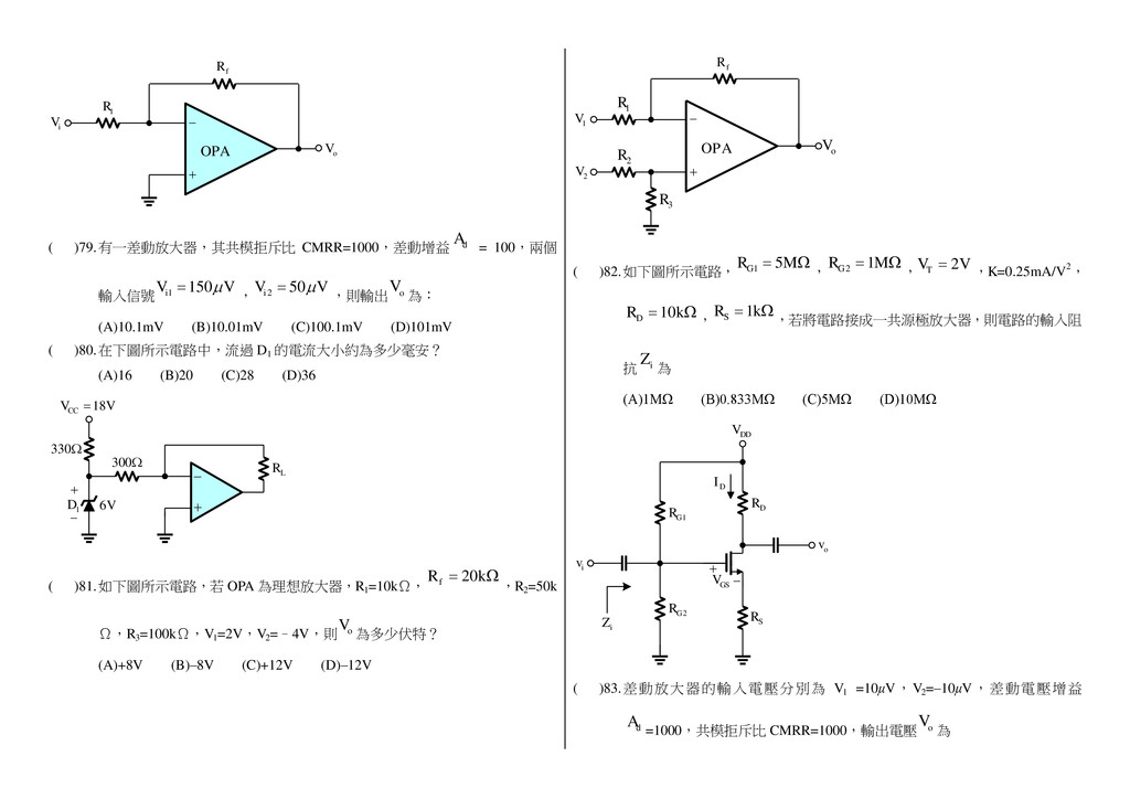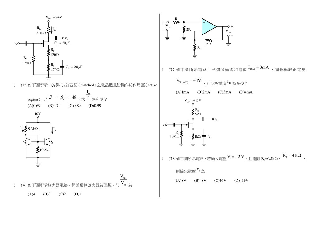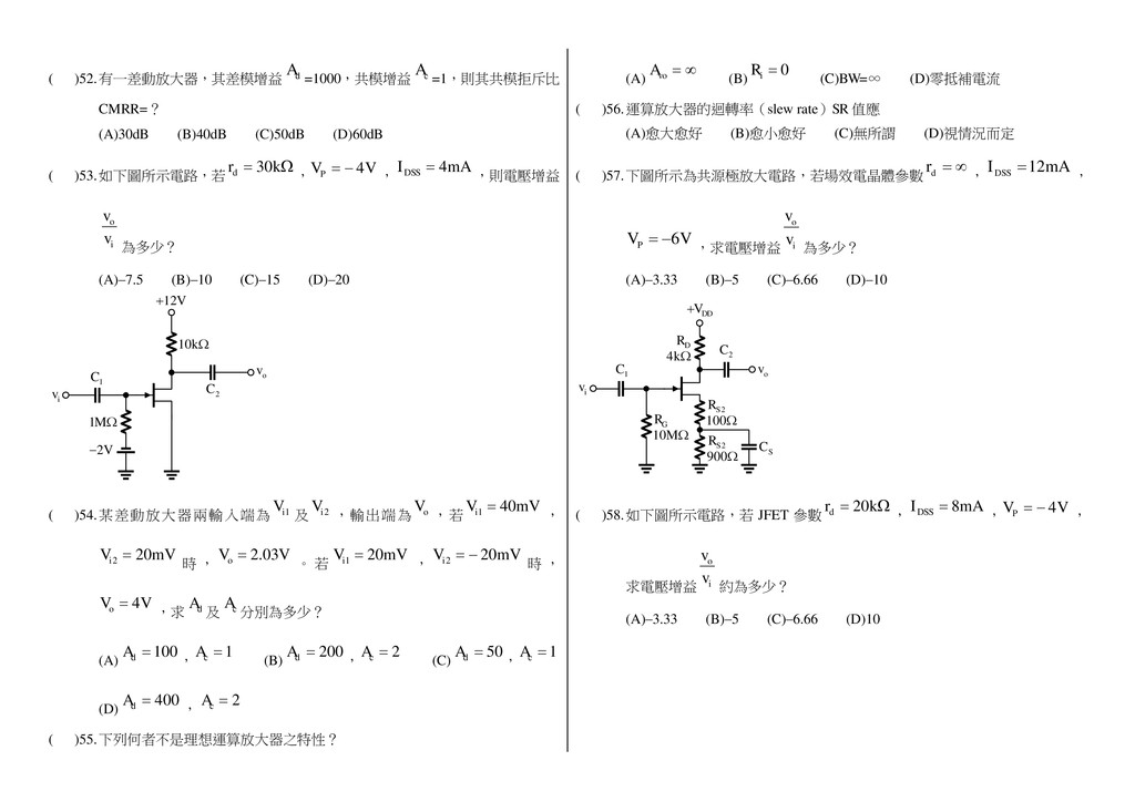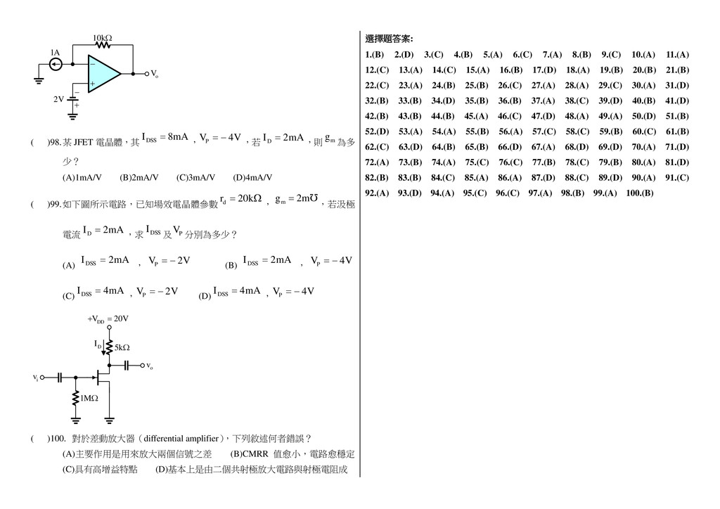 V 2 ( )98. 某 JFET 電晶體,其 mA 8 DSS I , V 4 P V ,若 mA 2 D I ,則 m g 為多 少? (A)1mA/V (B)2mA/V (C)3mA/V (D)4mA/V ( )99. 如下圖所示電路,已知場效電晶體參數 k 20 d r , m 2 m g ,若汲極 電流 mA 2 D I ,求 DSS I 及 P V 分別為多少? (A) mA 2 DSS I , V 2 P V (B) mA 2 DSS I , V 4 P V (C) mA 4 DSS I , V 2 P V (D) mA 4 DSS I , V 4 P V M 1 V 20 DD V o v i v k 5 D I ( )100. 對於差動放大器(differential amplifier) ,下列敘述何者錯誤? (A)主要作用是用來放大兩個信號之差 (B)CMRR 值愈小,電路愈穩定 (C)具有高增益特點 (D)基本上是由二個共射極放大電路與射極電阻成 選擇題答案: 1.(B) 2.(D) 3.(C) 4.(B) 5.(A) 6.(C) 7.(A) 8.(B) 9.(C) 10.(A) 11.(A) 12.(C) 13.(A) 14.(C) 15.(A) 16.(B) 17.(D) 18.(A) 19.(B) 20.(B) 21.(B) 22.(C) 23.(A) 24.(B) 25.(B) 26.(C) 27.(A) 28.(A) 29.(C) 30.(A) 31.(D) 32.(B) 33.(B) 34.(D) 35.(B) 36.(B) 37.(A) 38.(C) 39.(D) 40.(B) 41.(D) 42.(B) 43.(B) 44.(B) 45.(A) 46.(C) 47.(D) 48.(A) 49.(A) 50.(D) 51.(B) 52.(D) 53.(A) 54.(A) 55.(B) 56.(A) 57.(C) 58.(C) 59.(B) 60.(C) 61.(B) 62.(C) 63.(D) 64.(B) 65.(B) 66.(D) 67.(A) 68.(D) 69.(D) 70.(A) 71.(D) 72.(A) 73.(B) 74.(A) 75.(C) 76.(C) 77.(B) 78.(C) 79.(B) 80.(A) 81.(D) 82.(B) 83.(B) 84.(C) 85.(A) 86.(A) 87.(D) 88.(C) 89.(D) 90.(A) 91.(C) 92.(A) 93.(D) 94.(A) 95.(C) 96.(C) 97.(A) 98.(B) 99.(A) 100.(B)