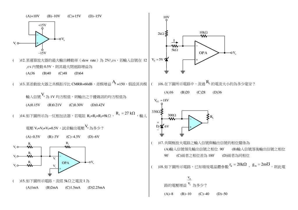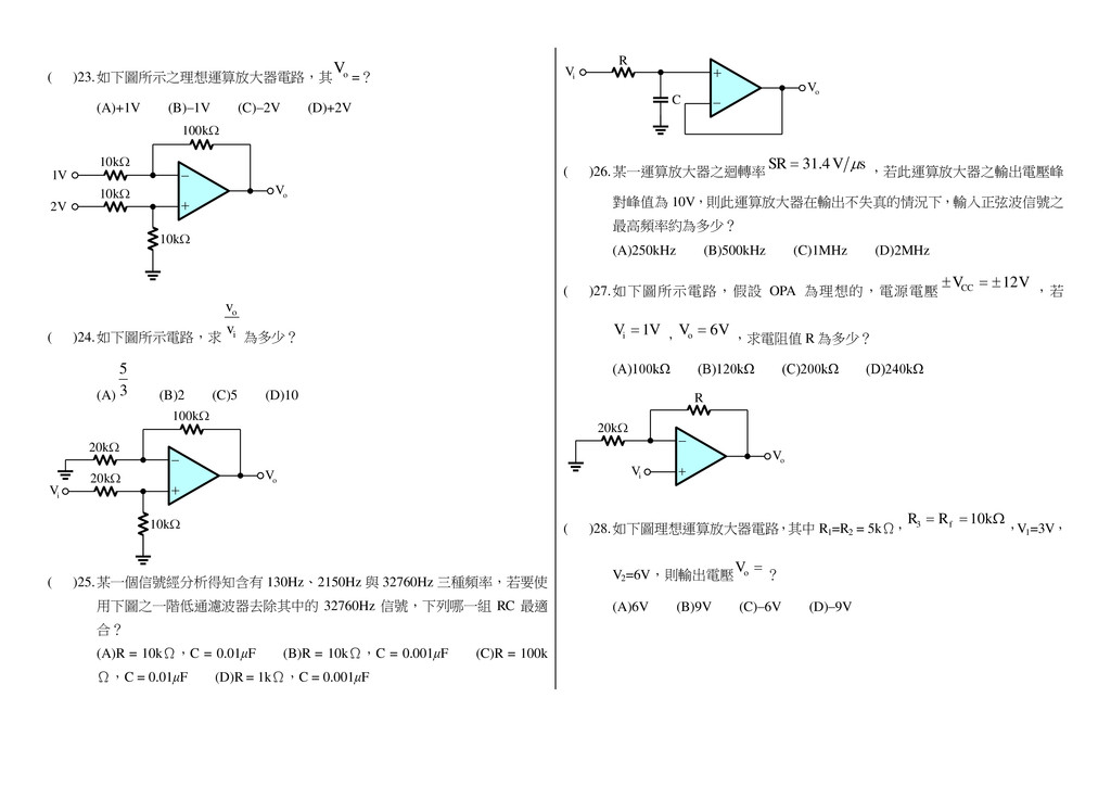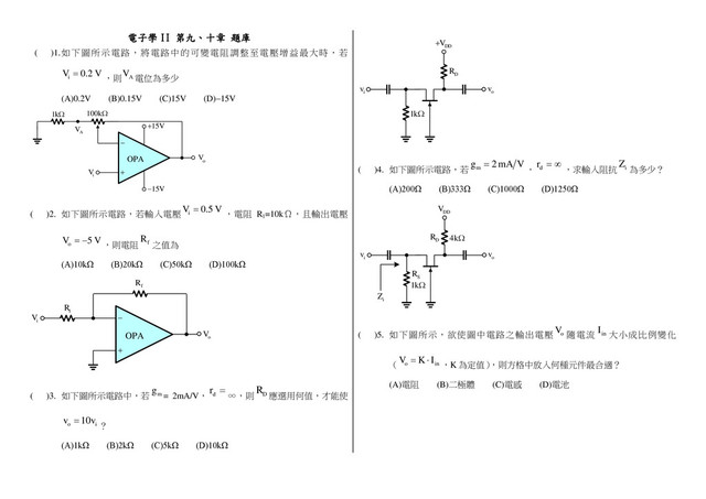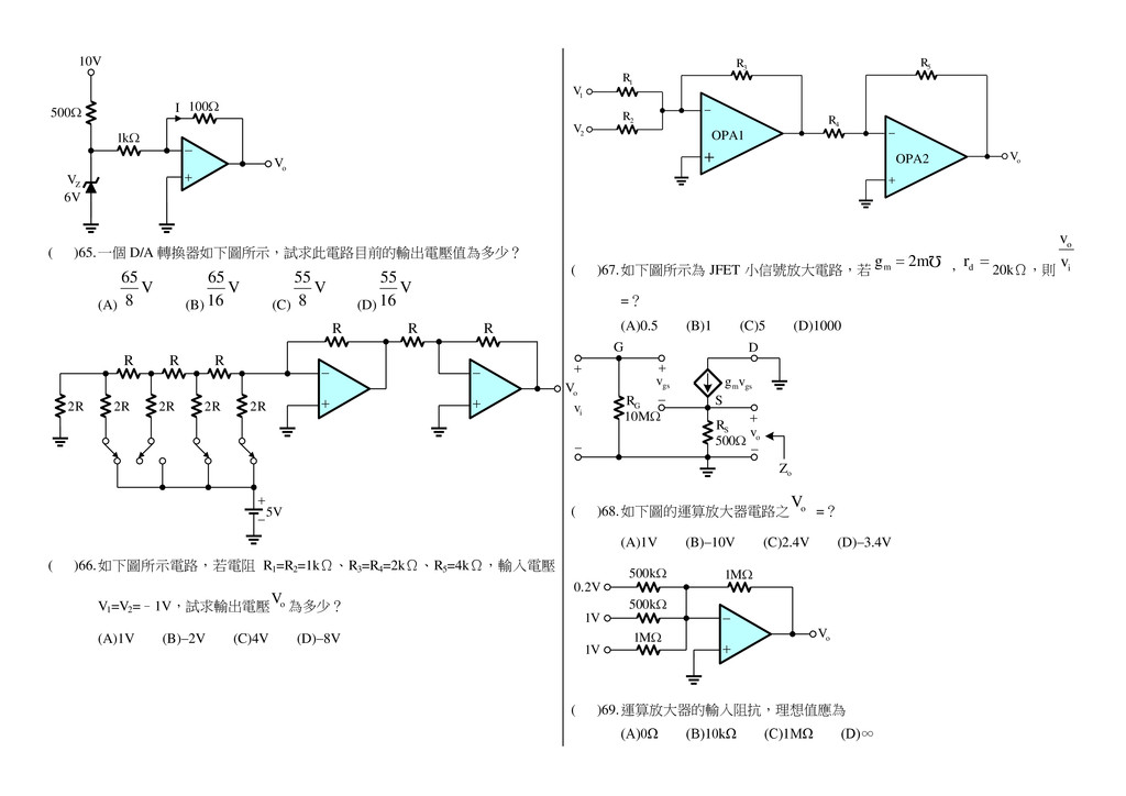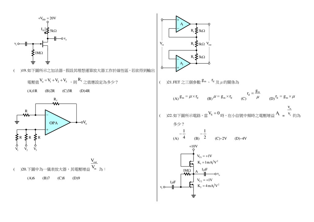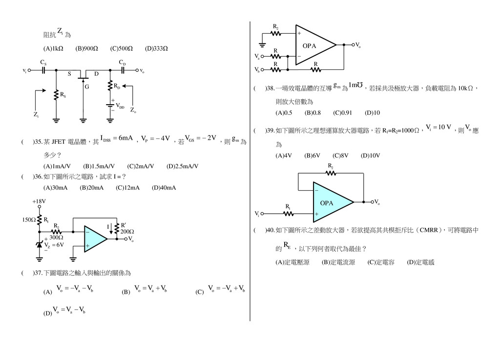 V 2 ( )98. 某 JFET 電晶體,其 mA 8 DSS I , V 4 P V ,若 mA 2 D I ,則 m g 為多 少? (A)1mA/V (B)2mA/V (C)3mA/V (D)4mA/V ( )99. 如下圖所示電路,已知場效電晶體參數 k 20 d r , m 2 m g ,若汲極 電流 mA 2 D I ,求 DSS I 及 P V 分別為多少? (A) mA 2 DSS I , V 2 P V (B) mA 2 DSS I , V 4 P V (C) mA 4 DSS I , V 2 P V (D) mA 4 DSS I , V 4 P V M 1 V 20 DD V o v i v k 5 D I ( )100. 對於差動放大器(differential amplifier) ,下列敘述何者錯誤? (A)主要作用是用來放大兩個信號之差 (B)CMRR 值愈小,電路愈穩定 (C)具有高增益特點 (D)基本上是由二個共射極放大電路與射極電阻成 選擇題答案: 1.(B) 2.(D) 3.(C) 4.(B) 5.(A) 6.(C) 7.(A) 8.(B) 9.(C) 10.(A) 11.(A) 12.(C) 13.(A) 14.(C) 15.(A) 16.(B) 17.(D) 18.(A) 19.(B) 20.(B) 21.(B) 22.(C) 23.(A) 24.(B) 25.(B) 26.(C) 27.(A) 28.(A) 29.(C) 30.(A) 31.(D) 32.(B) 33.(B) 34.(D) 35.(B) 36.(B) 37.(A) 38.(C) 39.(D) 40.(B) 41.(D) 42.(B) 43.(B) 44.(B) 45.(A) 46.(C) 47.(D) 48.(A) 49.(A) 50.(D) 51.(B) 52.(D) 53.(A) 54.(A) 55.(B) 56.(A) 57.(C) 58.(C) 59.(B) 60.(C) 61.(B) 62.(C) 63.(D) 64.(B) 65.(B) 66.(D) 67.(A) 68.(D) 69.(D) 70.(A) 71.(D) 72.(A) 73.(B) 74.(A) 75.(C) 76.(C) 77.(B) 78.(C) 79.(B) 80.(A) 81.(D) 82.(B) 83.(B) 84.(C) 85.(A) 86.(A) 87.(D) 88.(C) 89.(D) 90.(A) 91.(C) 92.(A) 93.(D) 94.(A) 95.(C) 96.(C) 97.(A) 98.(B) 99.(A) 100.(B)
