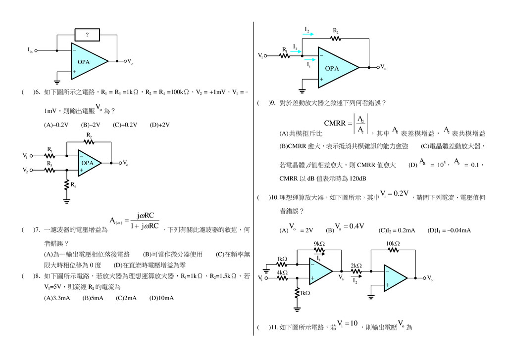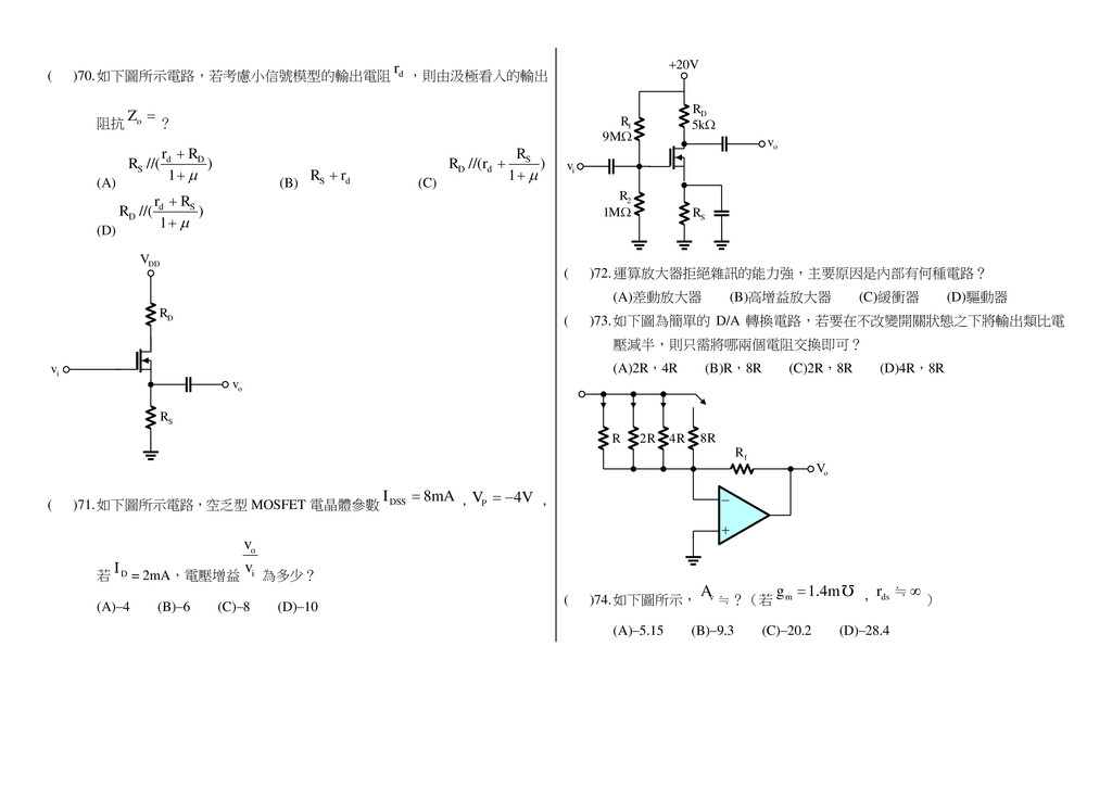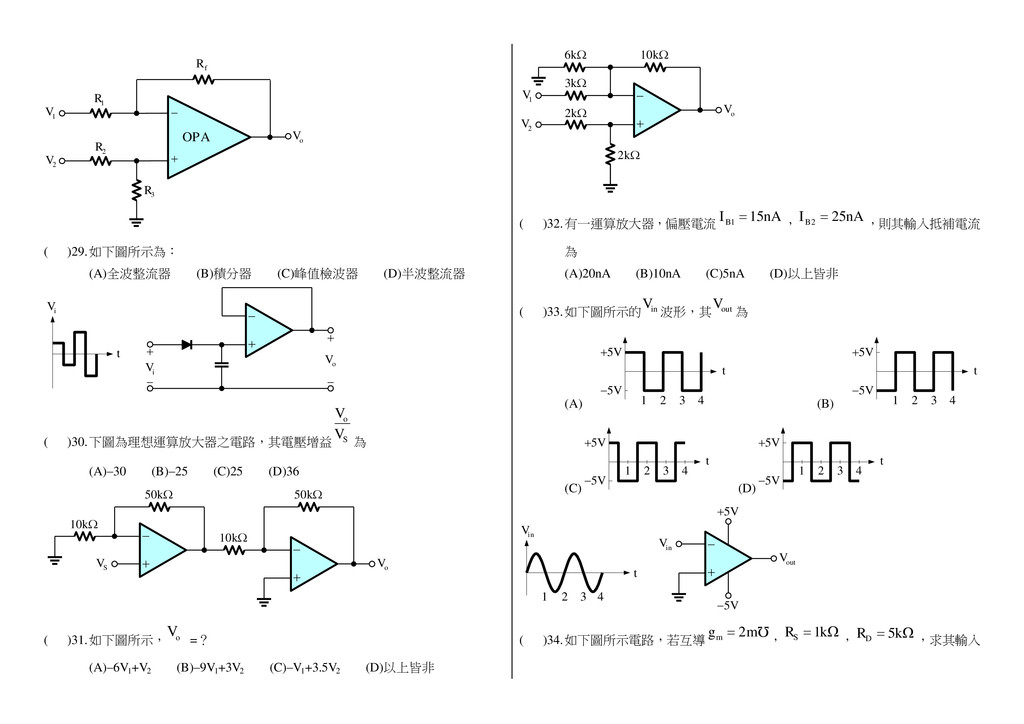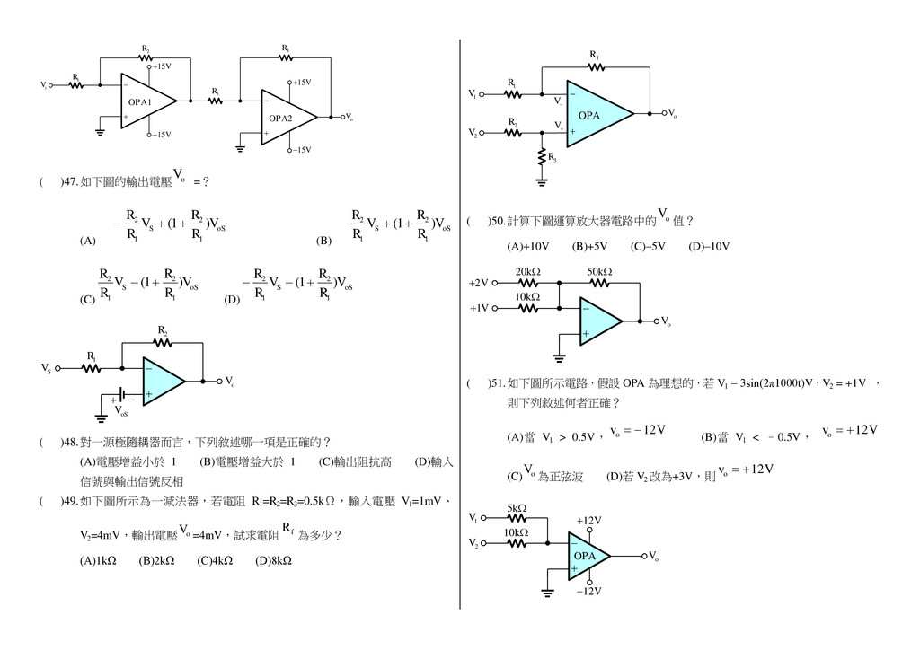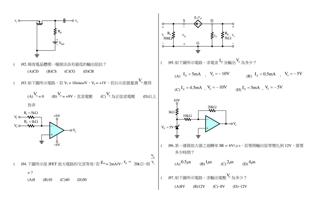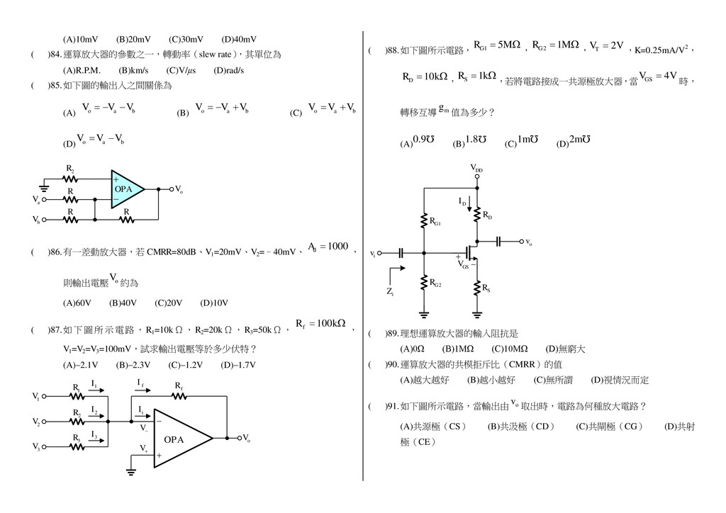 V 2 ( )98. 某 JFET 電晶體,其 mA 8 DSS I , V 4 P V ,若 mA 2 D I ,則 m g 為多 少? (A)1mA/V (B)2mA/V (C)3mA/V (D)4mA/V ( )99. 如下圖所示電路,已知場效電晶體參數 k 20 d r , m 2 m g ,若汲極 電流 mA 2 D I ,求 DSS I 及 P V 分別為多少? (A) mA 2 DSS I , V 2 P V (B) mA 2 DSS I , V 4 P V (C) mA 4 DSS I , V 2 P V (D) mA 4 DSS I , V 4 P V M 1 V 20 DD V o v i v k 5 D I ( )100. 對於差動放大器(differential amplifier) ,下列敘述何者錯誤? (A)主要作用是用來放大兩個信號之差 (B)CMRR 值愈小,電路愈穩定 (C)具有高增益特點 (D)基本上是由二個共射極放大電路與射極電阻成 選擇題答案: 1.(B) 2.(D) 3.(C) 4.(B) 5.(A) 6.(C) 7.(A) 8.(B) 9.(C) 10.(A) 11.(A) 12.(C) 13.(A) 14.(C) 15.(A) 16.(B) 17.(D) 18.(A) 19.(B) 20.(B) 21.(B) 22.(C) 23.(A) 24.(B) 25.(B) 26.(C) 27.(A) 28.(A) 29.(C) 30.(A) 31.(D) 32.(B) 33.(B) 34.(D) 35.(B) 36.(B) 37.(A) 38.(C) 39.(D) 40.(B) 41.(D) 42.(B) 43.(B) 44.(B) 45.(A) 46.(C) 47.(D) 48.(A) 49.(A) 50.(D) 51.(B) 52.(D) 53.(A) 54.(A) 55.(B) 56.(A) 57.(C) 58.(C) 59.(B) 60.(C) 61.(B) 62.(C) 63.(D) 64.(B) 65.(B) 66.(D) 67.(A) 68.(D) 69.(D) 70.(A) 71.(D) 72.(A) 73.(B) 74.(A) 75.(C) 76.(C) 77.(B) 78.(C) 79.(B) 80.(A) 81.(D) 82.(B) 83.(B) 84.(C) 85.(A) 86.(A) 87.(D) 88.(C) 89.(D) 90.(A) 91.(C) 92.(A) 93.(D) 94.(A) 95.(C) 96.(C) 97.(A) 98.(B) 99.(A) 100.(B)
