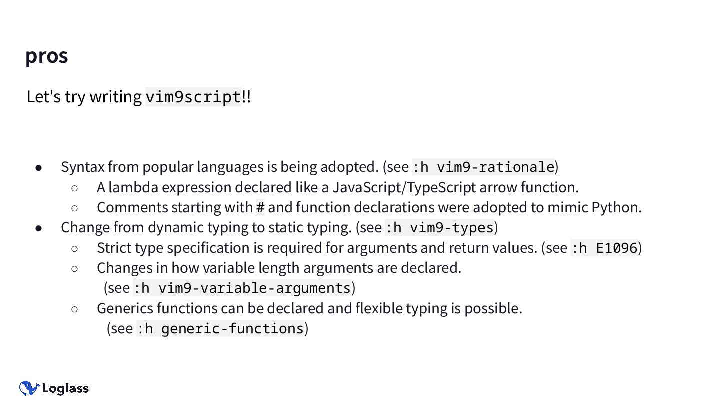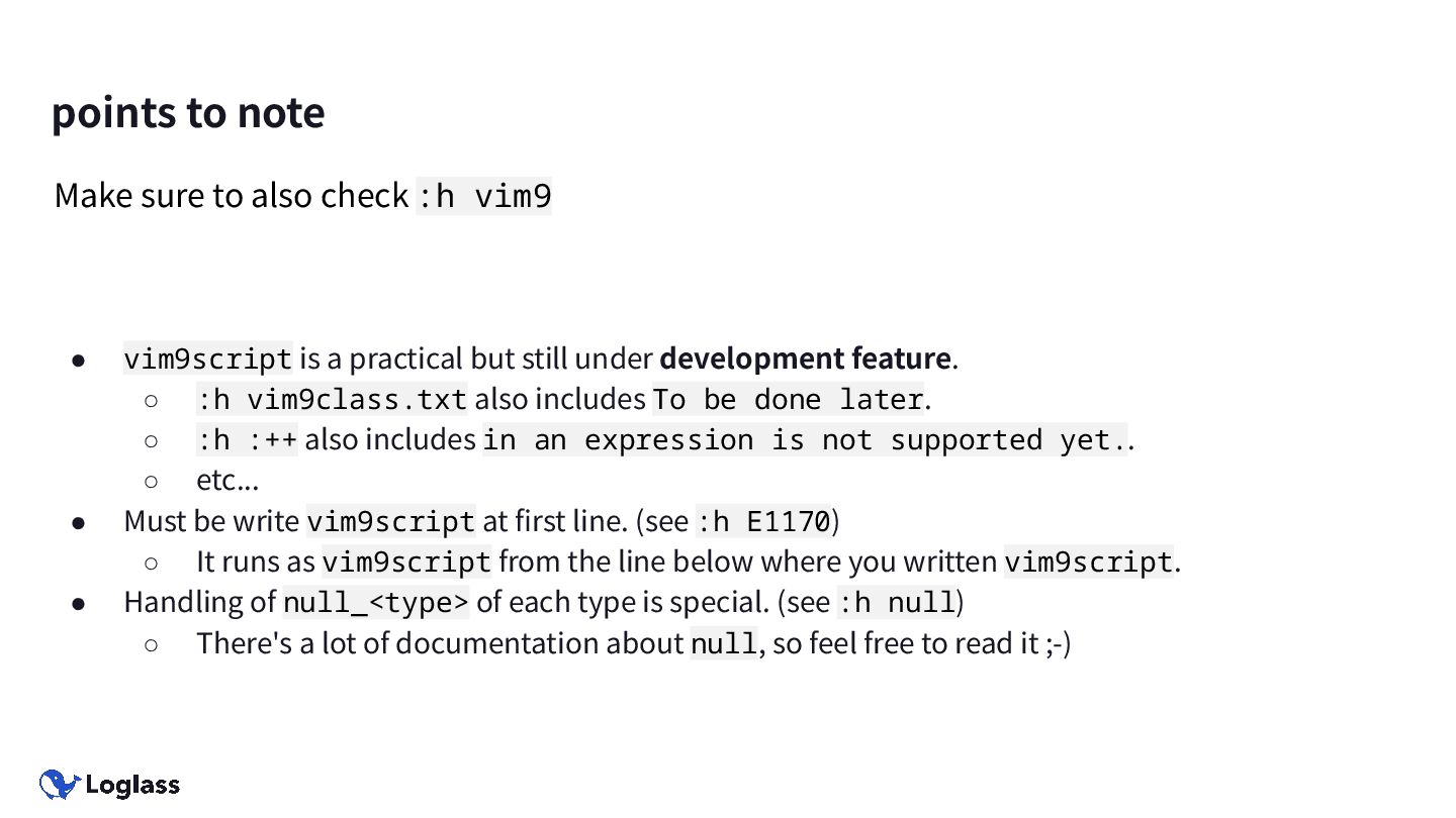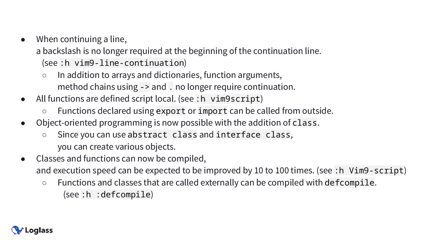 required at the beginning of the continuation line. (see :h vim9-line-continuation) ◦ In addition to arrays and dictionaries, function arguments, method chains using -> and . no longer require continuation. • All functions are defined script local. (see :h vim9script) ◦ Functions declared using export or import can be called from outside. • Object-oriented programming is now possible with the addition of class. ◦ Since you can use abstract class and interface class, you can create various objects. • Classes and functions can now be compiled, and execution speed can be expected to be improved by 10 to 100 times. (see :h Vim9-script) ◦ Functions and classes that are called externally can be compiled with defcompile. (see :h :defcompile)