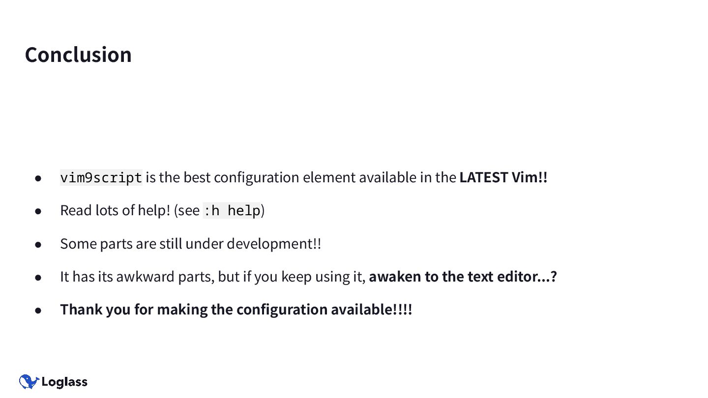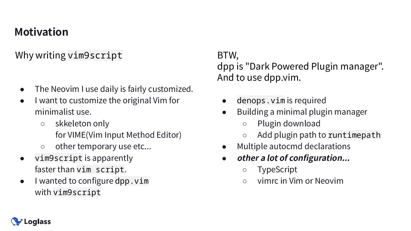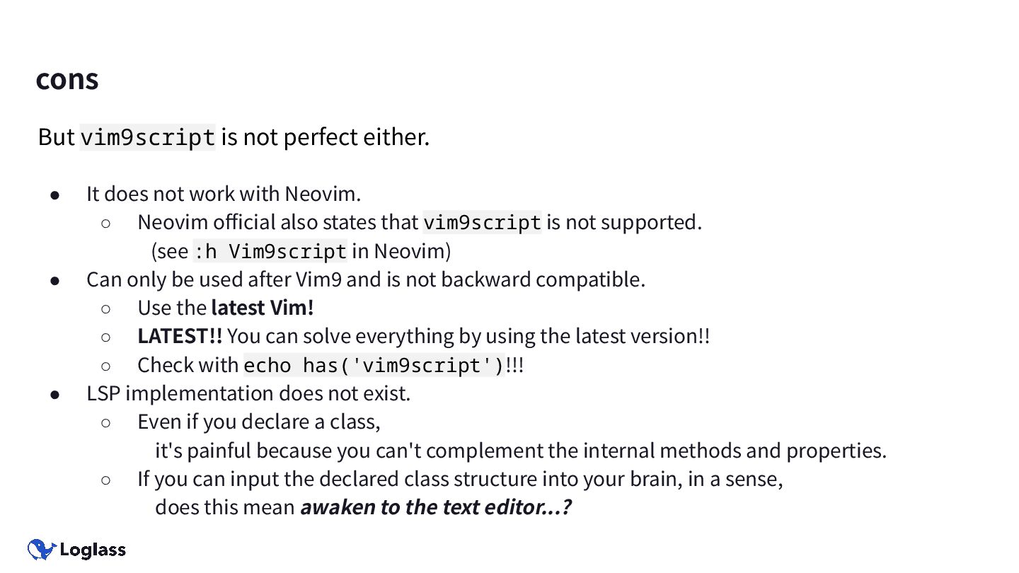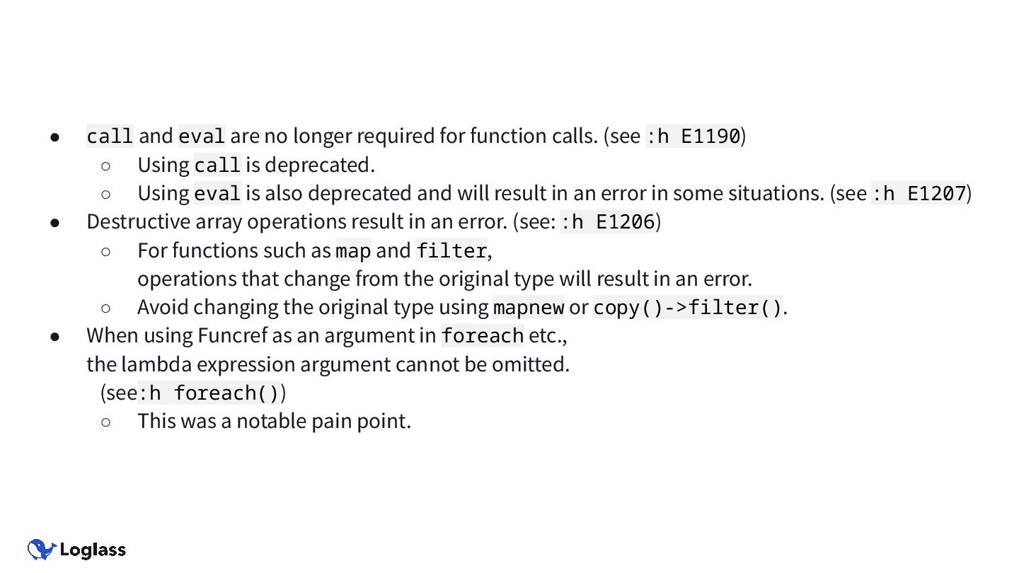 required at the beginning of the continuation line. (see :h vim9-line-continuation) ◦ In addition to arrays and dictionaries, function arguments, method chains using -> and . no longer require continuation. • All functions are defined script local. (see :h vim9script) ◦ Functions declared using export or import can be called from outside. • Object-oriented programming is now possible with the addition of class. ◦ Since you can use abstract class and interface class, you can create various objects. • Classes and functions can now be compiled, and execution speed can be expected to be improved by 10 to 100 times. (see :h Vim9-script) ◦ Functions and classes that are called externally can be compiled with defcompile. (see :h :defcompile)