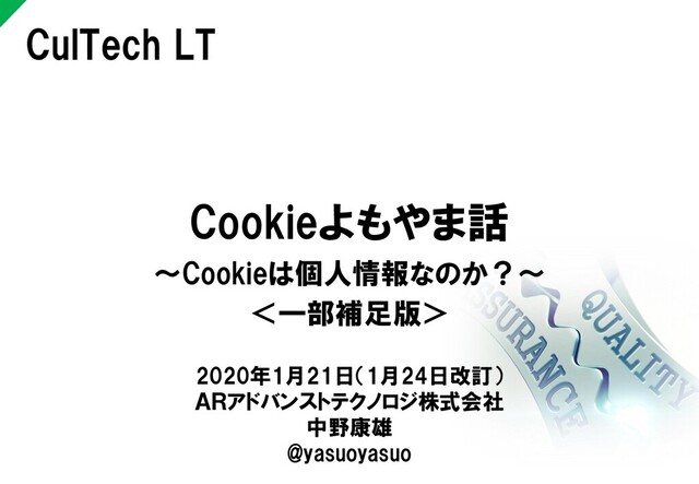 2020年1月21日にARI社内で行われたLT大会での発表資料です。 2019年大きな問題となった内定辞退率データ販売問題やプライバシー規制の流れ、Cookieの扱いについて調べた内容をお話しました。オチはありませんw 内容に誤りなどがあれば@yasuoyasuoまでご指摘いただければ大変ありがたいです。