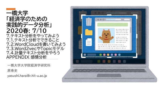 一橋大学「#経済学のための実践的データ分析」 2020春: 7/10回 7.テキスト分析をやってみよう 7.1.テキスト分析でできること 7.2.WordCloudを書いてみよう 7.3.Word2vecやTopicモデル 7.4.計量テキスト分析をやろ APPENDIX. 感情分析