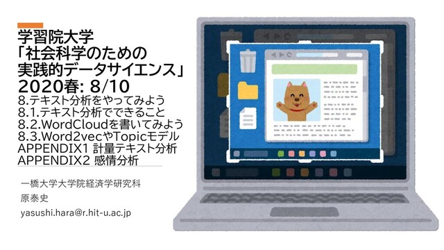 学習院大学 #社会科学のための実践的データサイエンス 2020春: 8/11 8.テキスト分析をやってみよう 8.1.テキスト分析でできること 8.2.WordCloudを書いてみよう 8.3.Word2vecやTopicモデル APPENDIX1 計量テキスト分析 APPENDIX2 感情分析