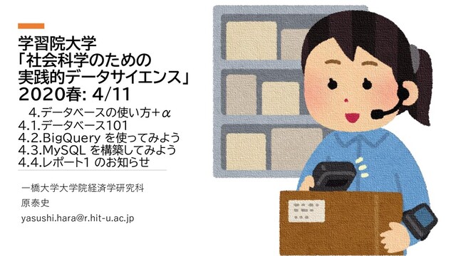 and/or Mac) に構築するため, MySQL Server と MySQL Workbench を導入する 2. Manaba からデータをダウンロードし, MySQL 上にデプロイ する 3. 展開したデータを MySQL Workbench を使って, 初期的な解 析を行う 4. JupyterNotebook からデータを読み込み初期的な解析をする
