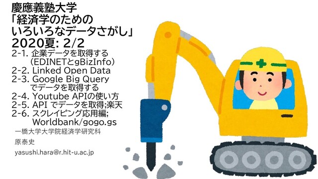 Open Data 2-3. Google Big Query でデータを取得する 2-4. Youtube APIの使い方 2-5. API でデータを取得;楽天 2-6. スクレイピング応用編; Worldbank/gogo.gs 一橋大学大学院経済学研究科 原泰史 [email protected]