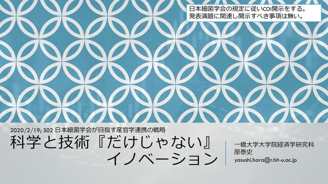Science, Technology and Innovation Policy Program” – “Research on Scientific Sources of Innovations and Economic Impacts of Science” directed by Prof. Sadao Nagaoka, Professor, Tokyo Keizai University ,and Pfizer Health Research Foundation grant, and a SECOM Science and Technology Foundation research grant. 31 2020/2/16