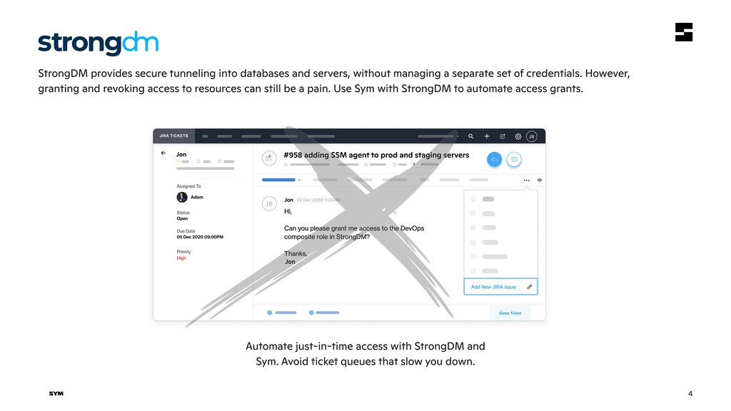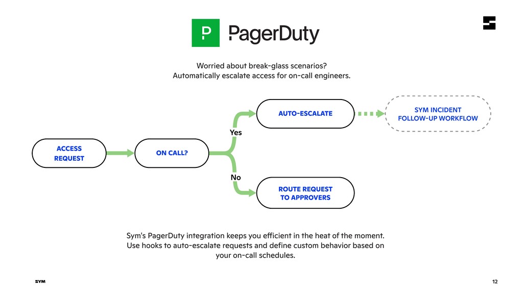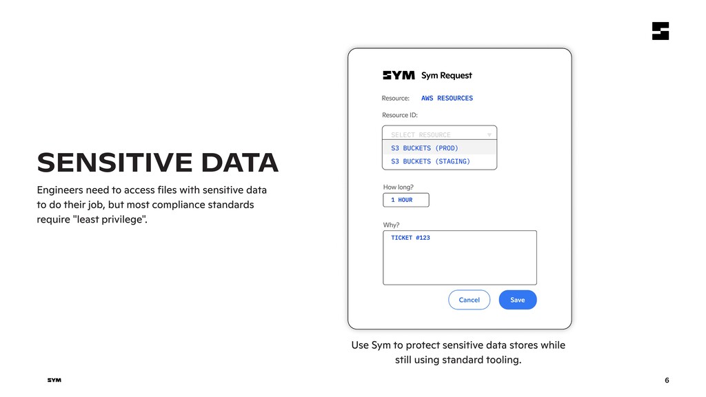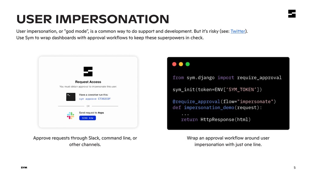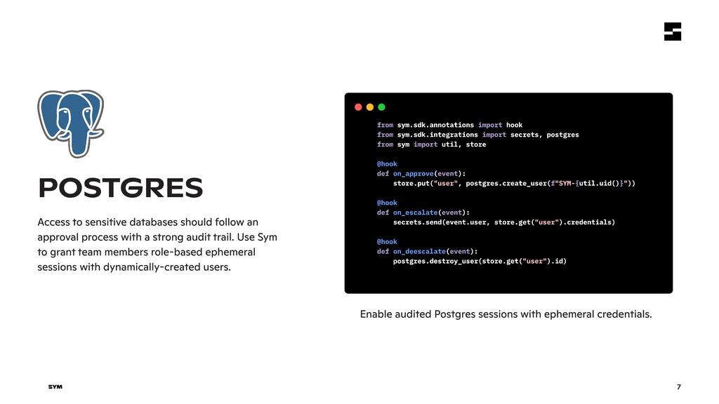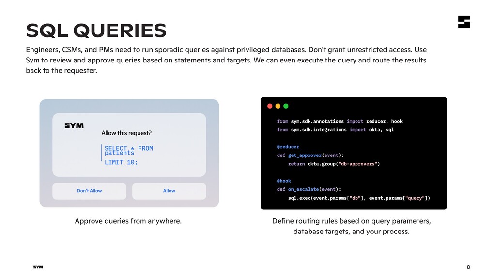 sporadic queries against privileged databases. Don't grant unrestricted access. Use Sym to review and approve queries based on statements and targets. We can even execute the query and route the results back to the requester. Define routing rules based on query parameters, database targets, and your process. Approve queries from anywhere. Allow this request? SELECT * FROM patients LIMIT 10; Allow Don’t Allow from import from import def event return def event sym.sdk.annotations reducer, hook sym.sdk.integrations okta, sql ( ): okta.group( ) ( ): sql.exec(event.params[ ], event.params[ ]) @reducer get_approver @hook on_escalate "db-approvers" "db" "query"