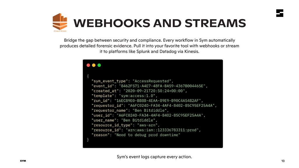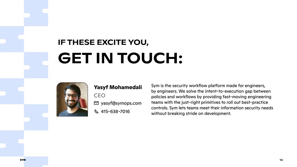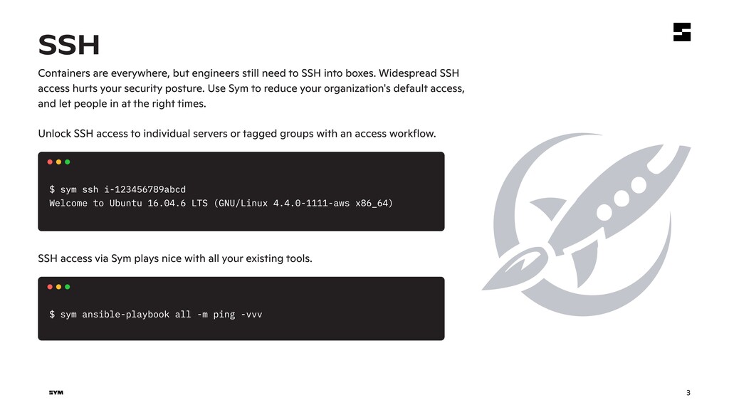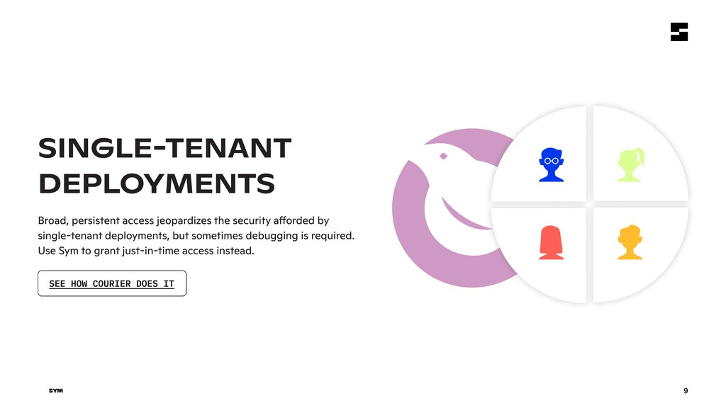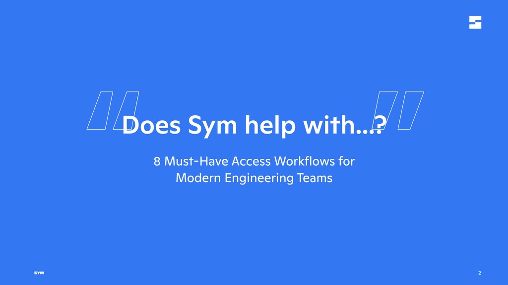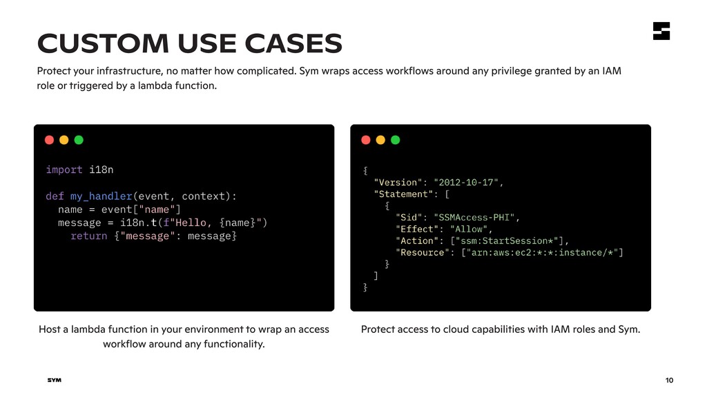 sporadic queries against privileged databases. Don't grant unrestricted access. Use Sym to review and approve queries based on statements and targets. We can even execute the query and route the results back to the requester. Define routing rules based on query parameters, database targets, and your process. Approve queries from anywhere. Allow this request? SELECT * FROM patients LIMIT 10; Allow Don’t Allow from import from import def event return def event sym.sdk.annotations reducer, hook sym.sdk.integrations okta, sql ( ): okta.group( ) ( ): sql.exec(event.params[ ], event.params[ ]) @reducer get_approver @hook on_escalate "db-approvers" "db" "query"
