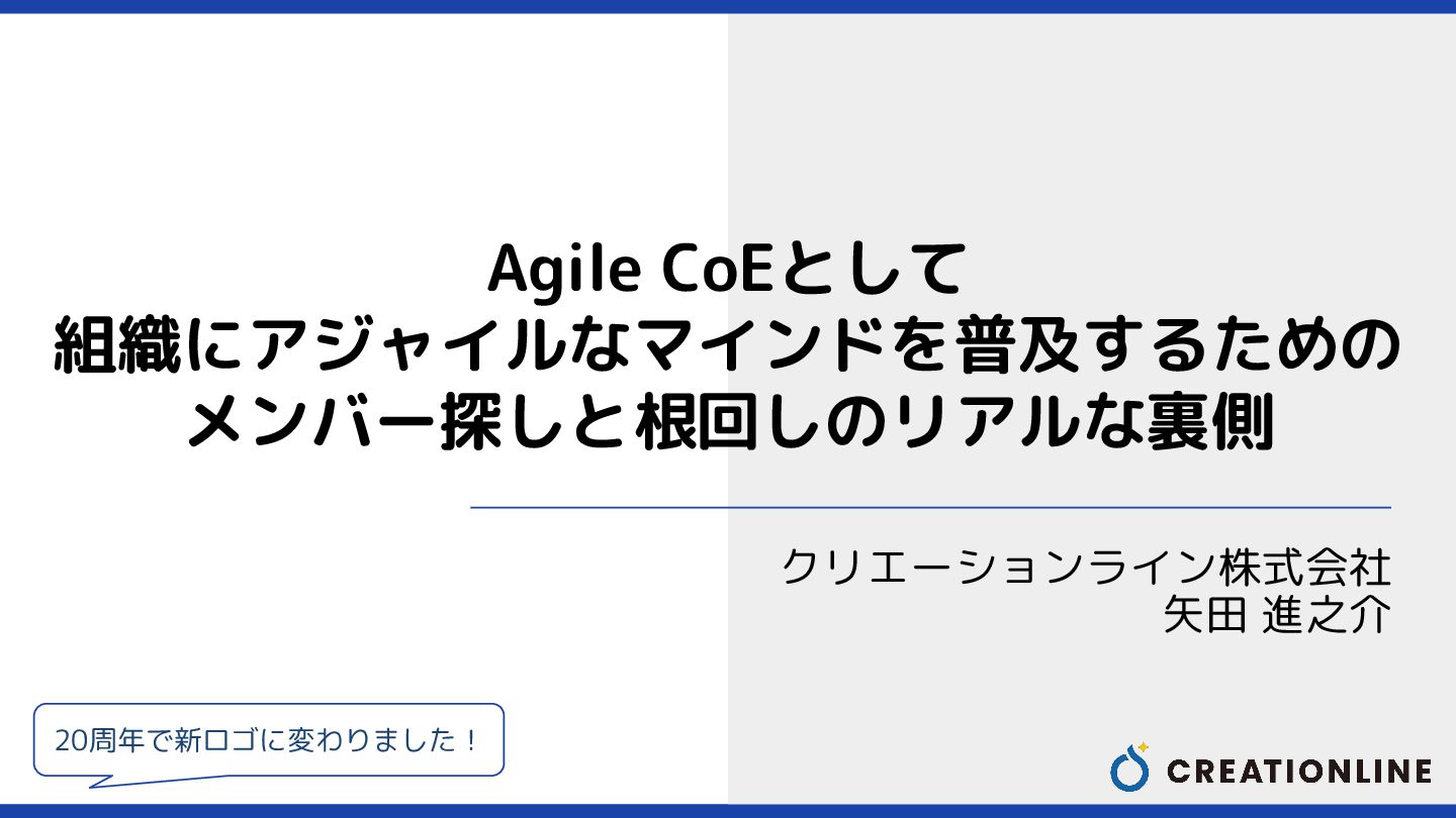 Agile CoEとして 組織にアジャイルなマインドを普及するための メンバー探しと根回しのリアルな裏側 クリエーションライン株式会社 矢田 進之介 20周年で新ロゴに変わりました!