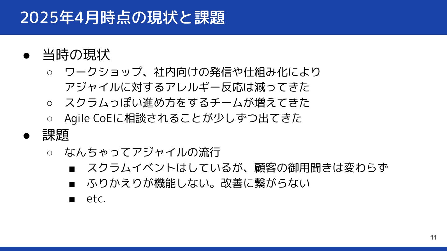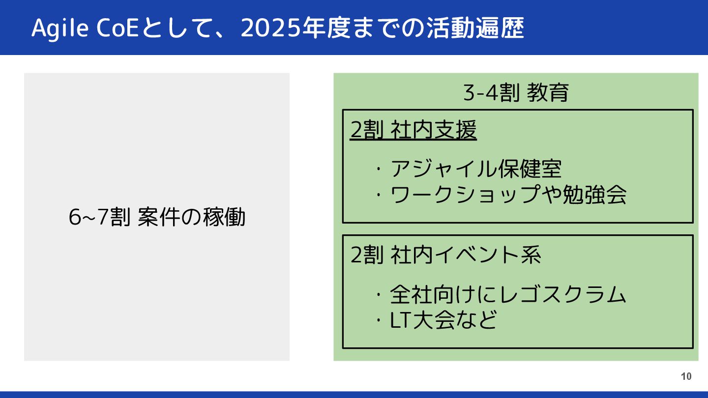 3-4割 教育 Agile CoEとして、2025年度までの活動遍歴 10 6~7割 案件の稼働 2割 社内支援 2割