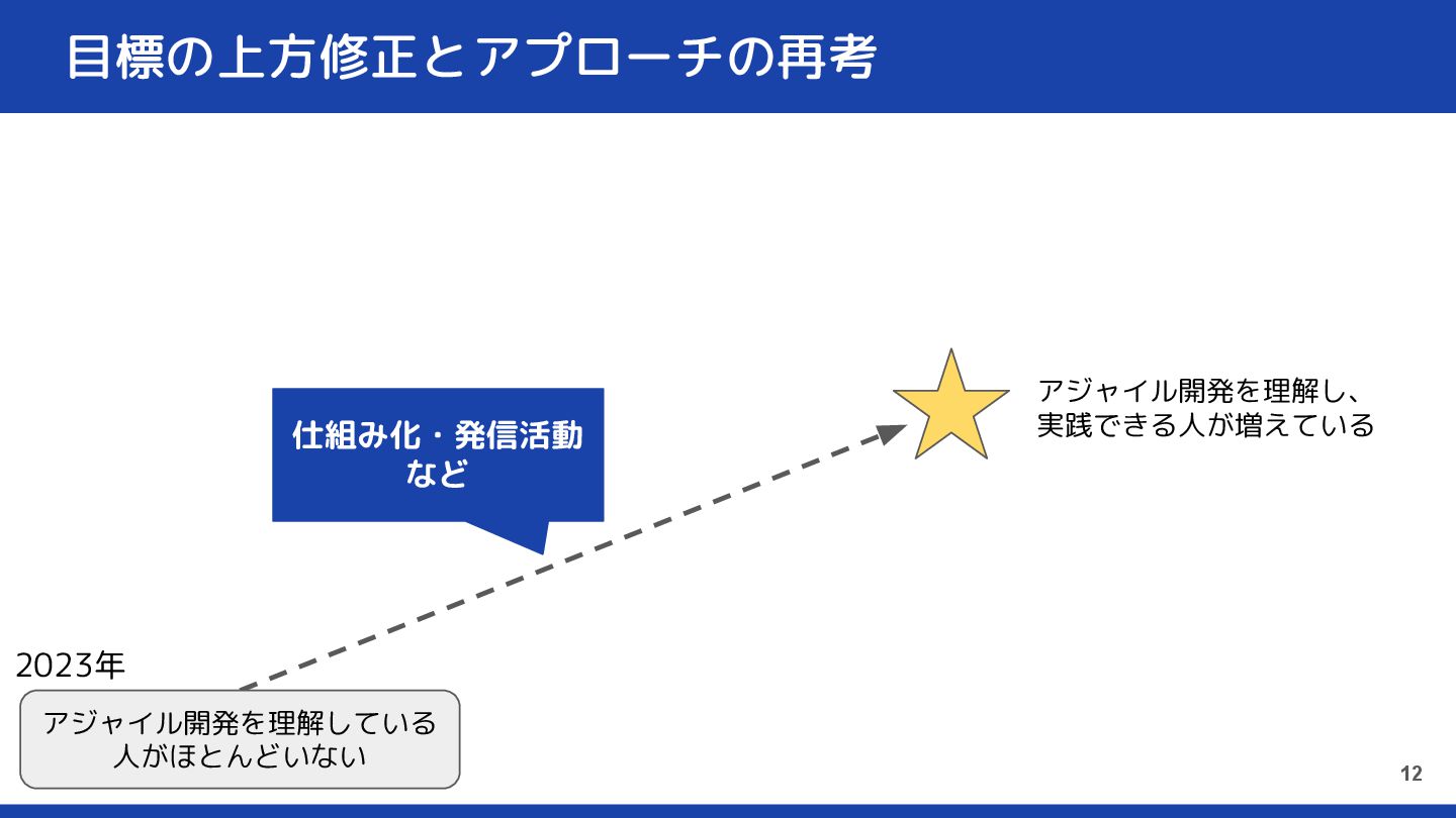 目標の上方修正とアプローチの再考 12 アジャイル開発を理解し、 実践できる人が増えている アジャイル開発を理解している 人がほとんどいない 仕組み化・発信活動 など 2023年