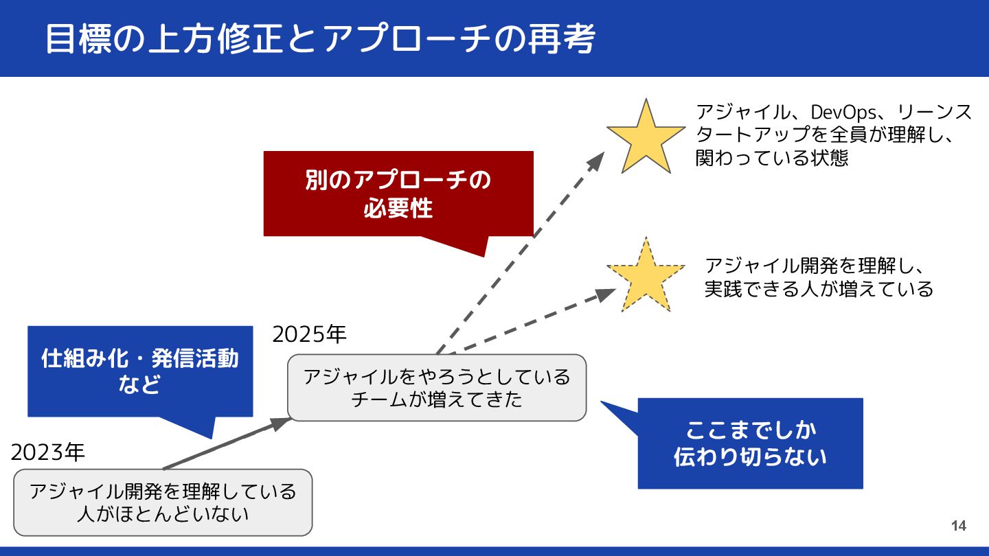 目標の上方修正とアプローチの再考 13 アジャイル開発を理解し、 実践できる人が増えている アジャイル開発を理解している 人がほとんどいない アジャイルをやろうとしている チームが増えてきた 仕組み化・発信活動 など
