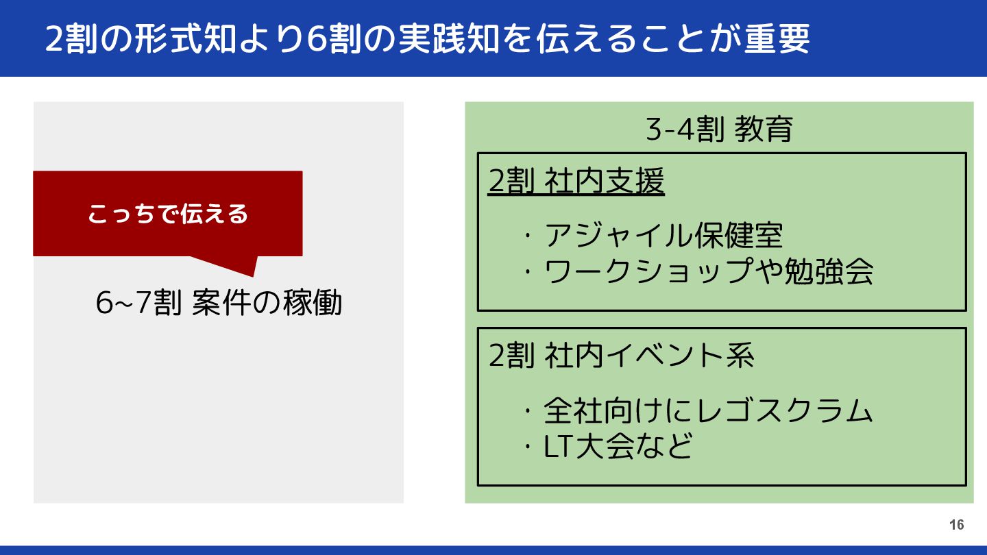 3-4割 教育 2割の形式知より6割の実践知を伝えることが重要 15 6~7割 案件の稼働 2割 社内支援 2割 社内イベント系