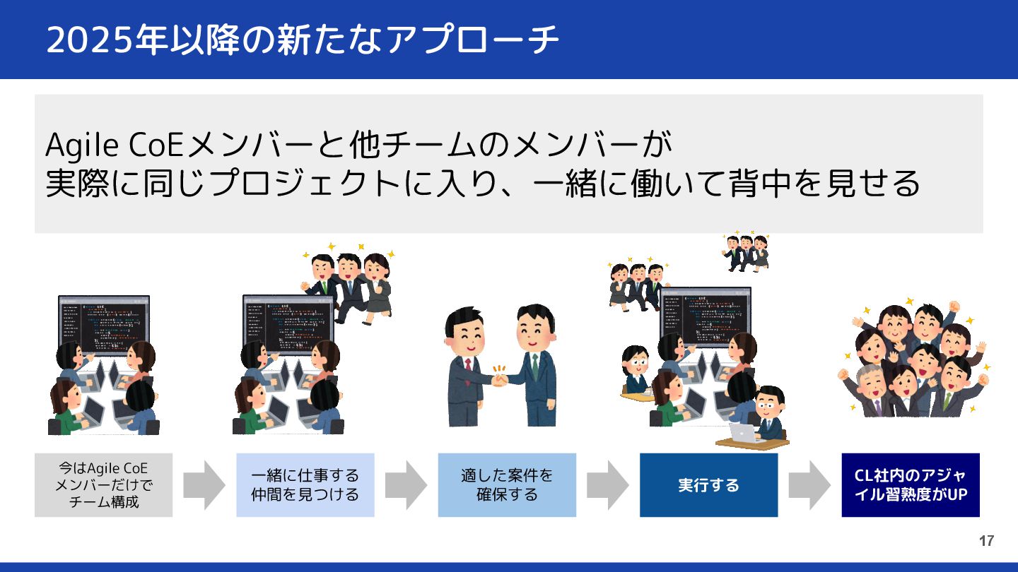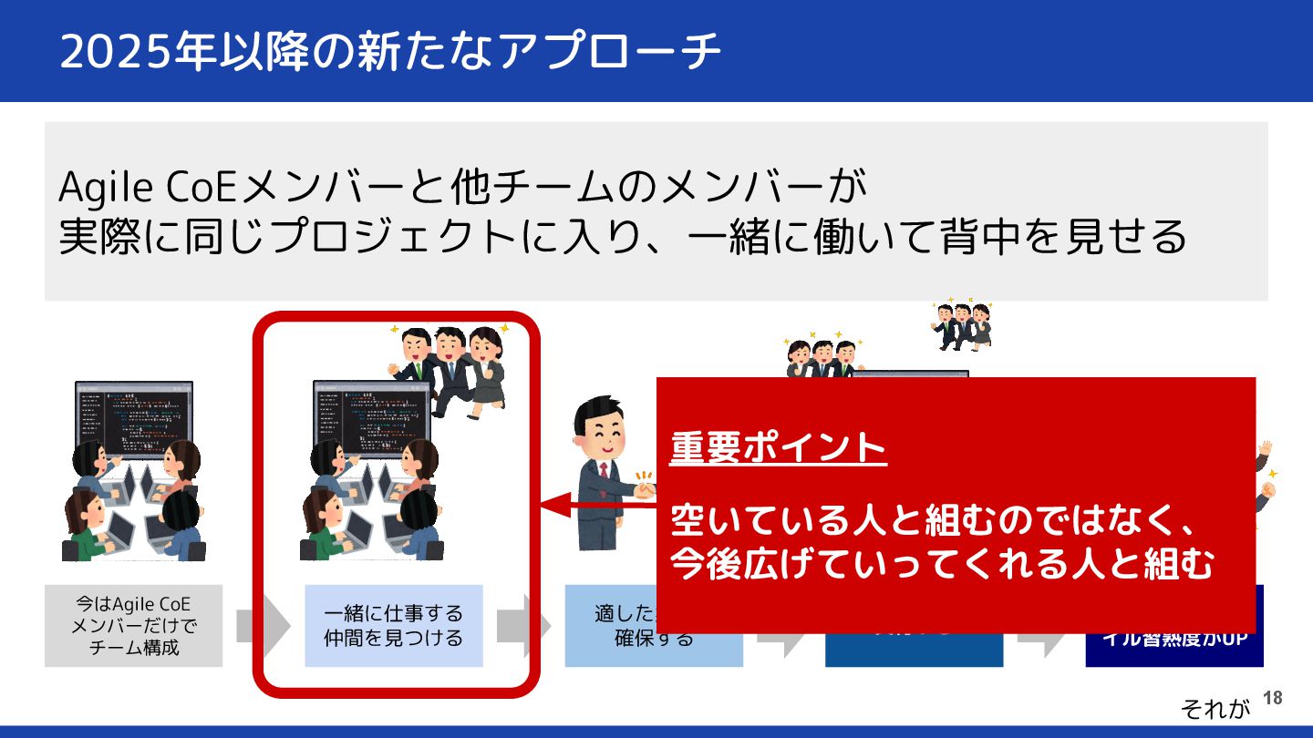 2025年以降の新たなアプローチ 17 Agile CoEメンバーと他チームのメンバーが 実際に同じプロジェクトに入り、一緒に働いて背中を見せる 今はAgile CoE メンバーだけで チーム構成 一緒に仕事する