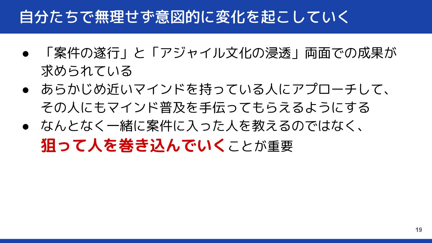 自分たちで無理せず意図的に変化を起こしていく • 「案件の遂行」と「アジャイル文化の浸透」両面での成果が 求められている • あらかじめ近いマインドを持っている人にアプローチして、 その人にもマインド普及を手伝ってもらえるようにする • なんとなく一緒に案件に入った人を教えるのではなく、 狙って人を巻き込んでいくことが重要