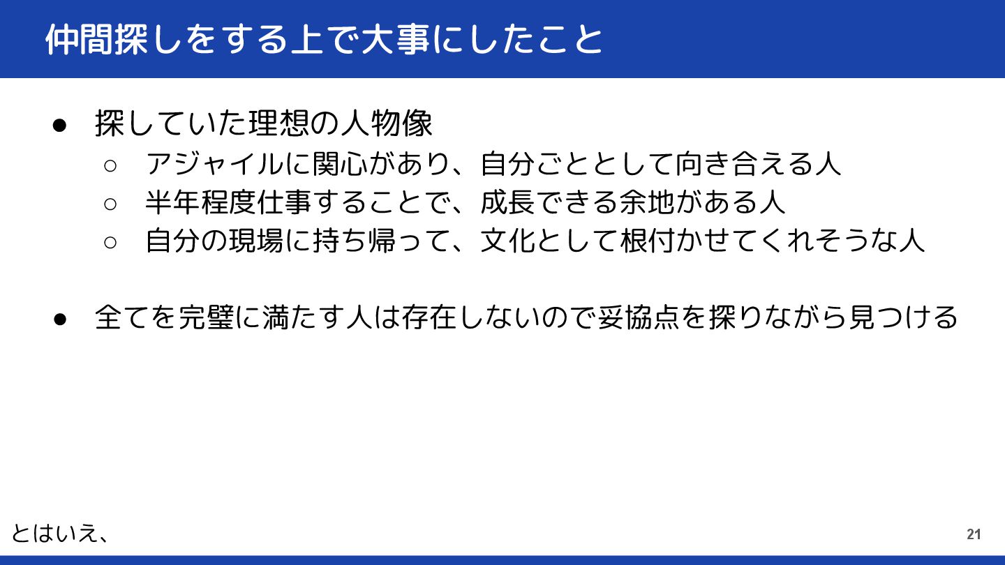 仲間探しをする上で大事にしたこと • 探していた理想の人物像 ◦ アジャイルに関心があり、自分ごととして向き合える人 ◦ 半年程度仕事することで、成長できる余地がある人 ◦ 自分の現場に持ち帰って、文化として根付かせてくれそうな人 •