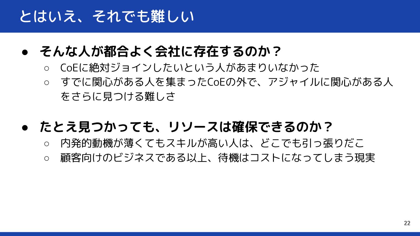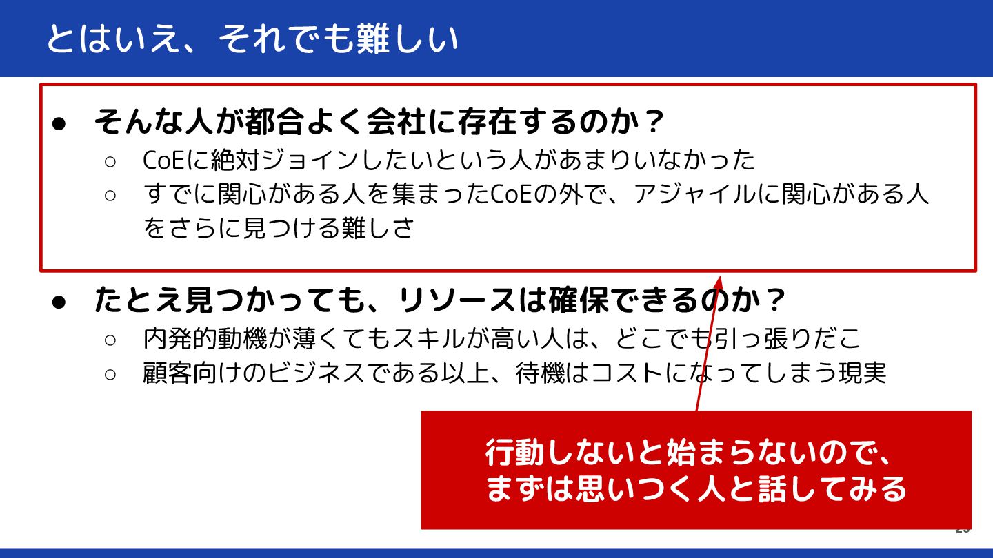 とはいえ、それでも難しい • そんな人が都合よく会社に存在するのか? ◦ CoEに絶対ジョインしたいという人があまりいなかった ◦ すでに関心がある人を集まったCoEの外で、アジャイルに関心がある人 をさらに見つける難しさ • たとえ見つかっても、リソースは確保できるのか?